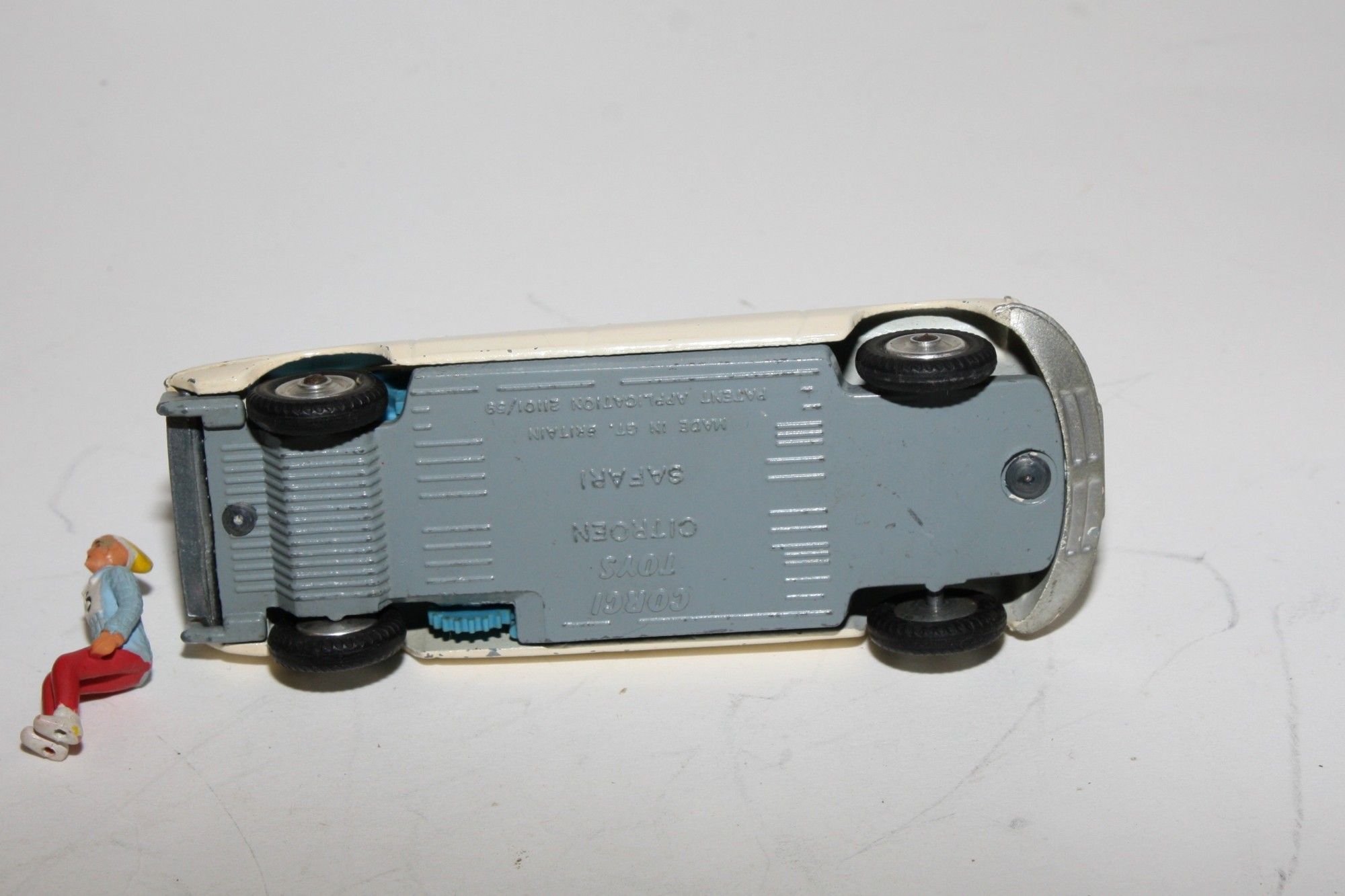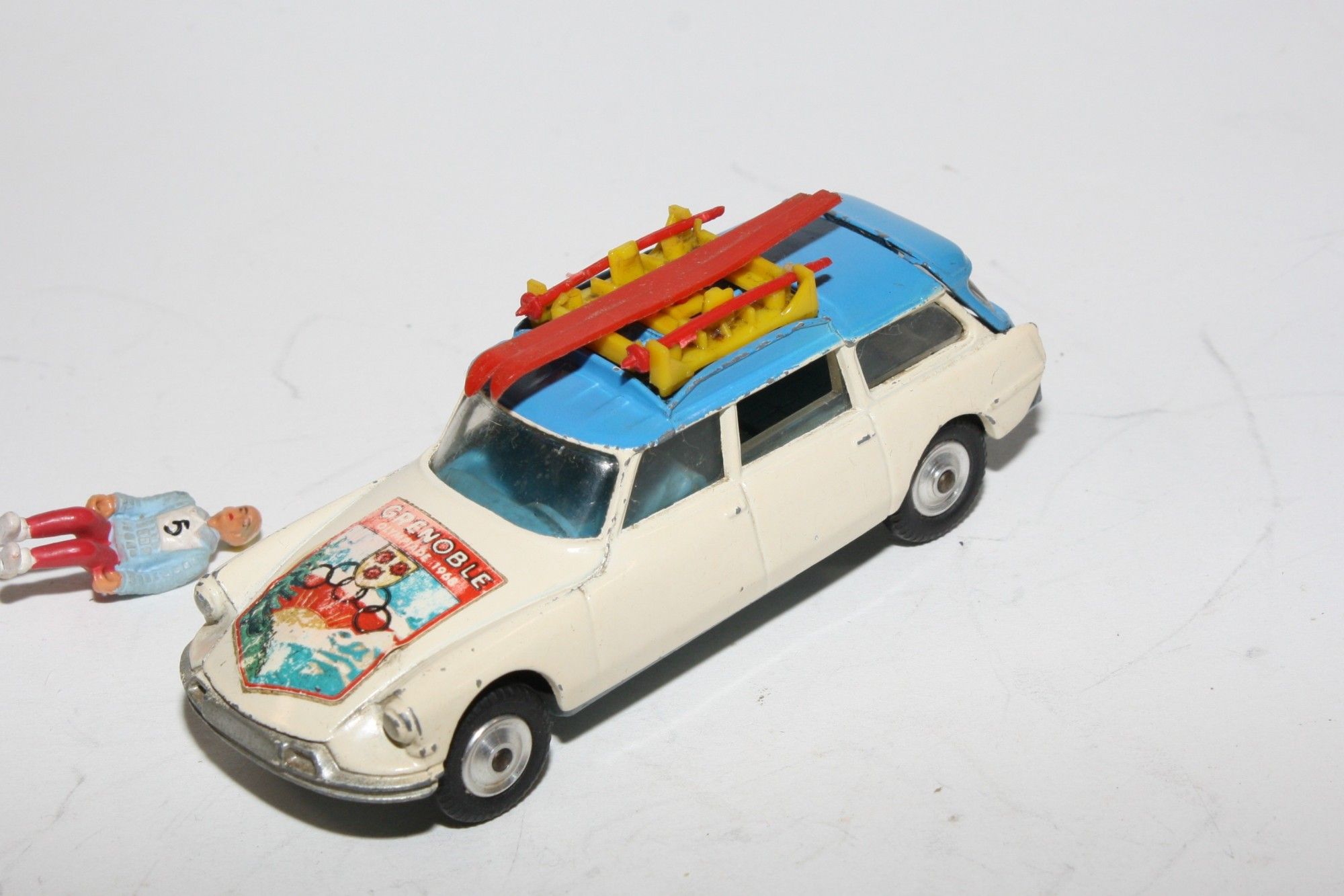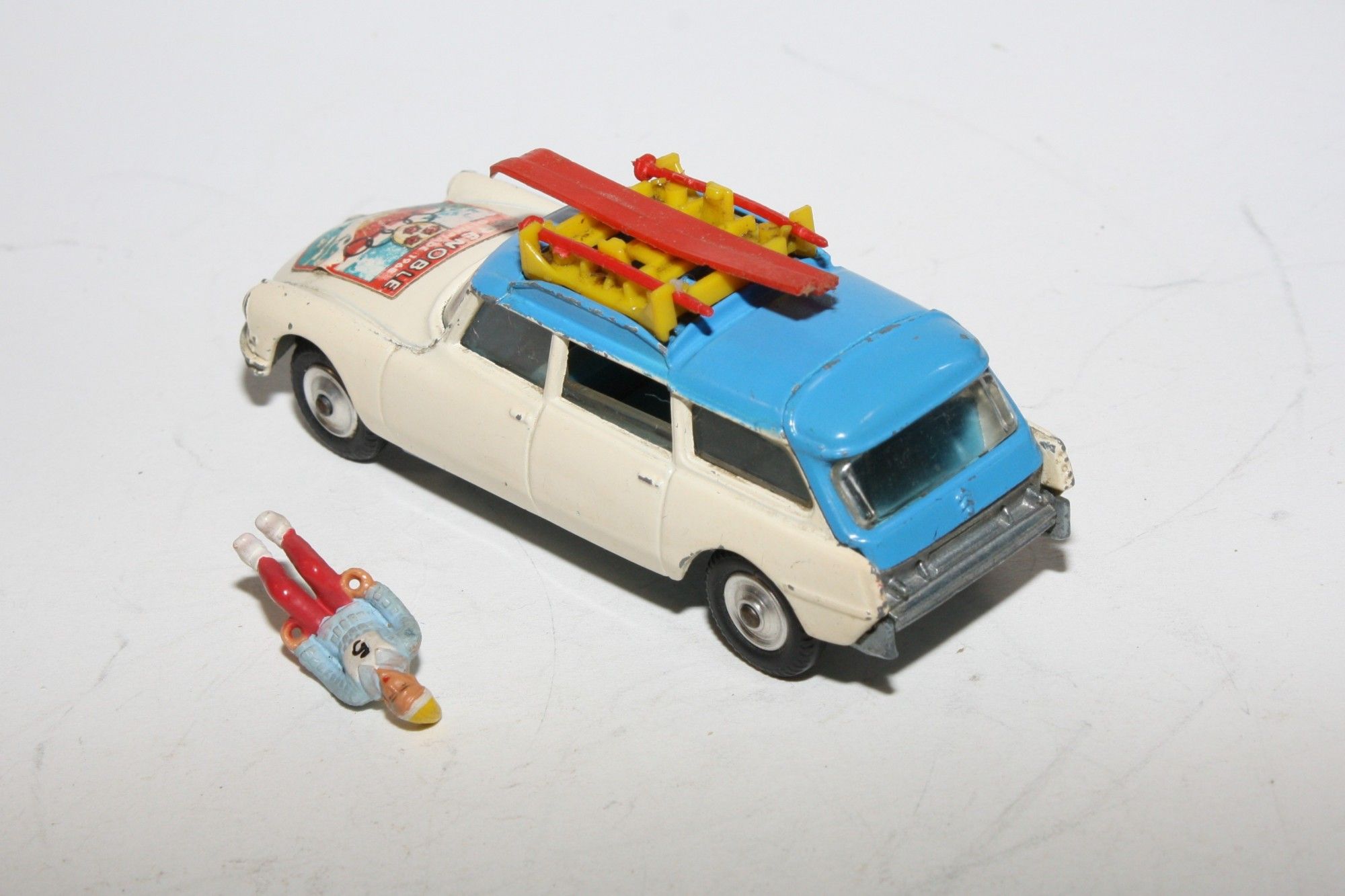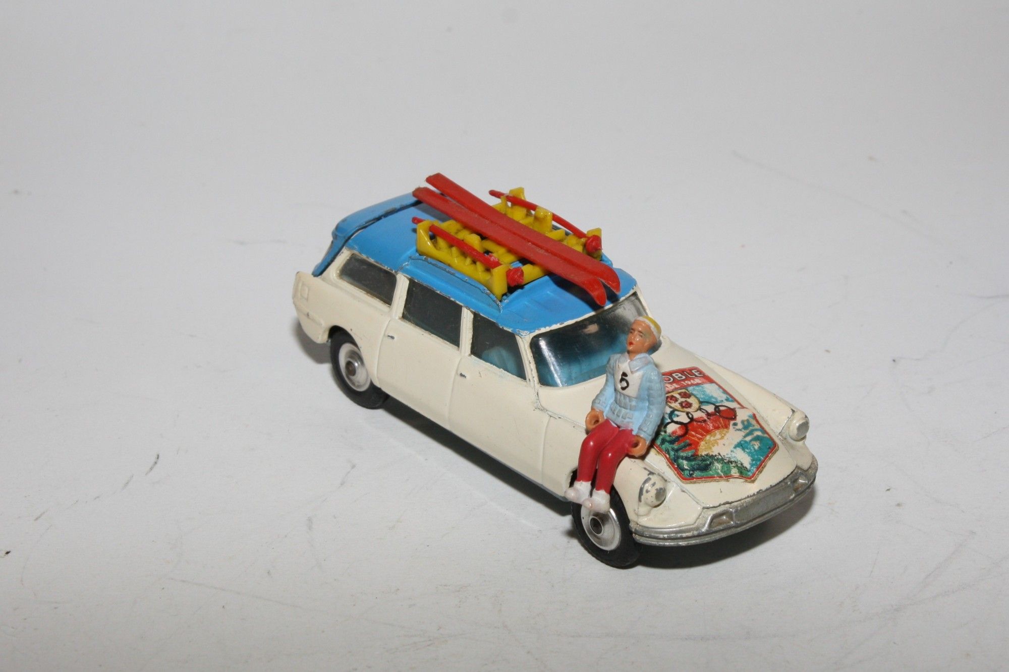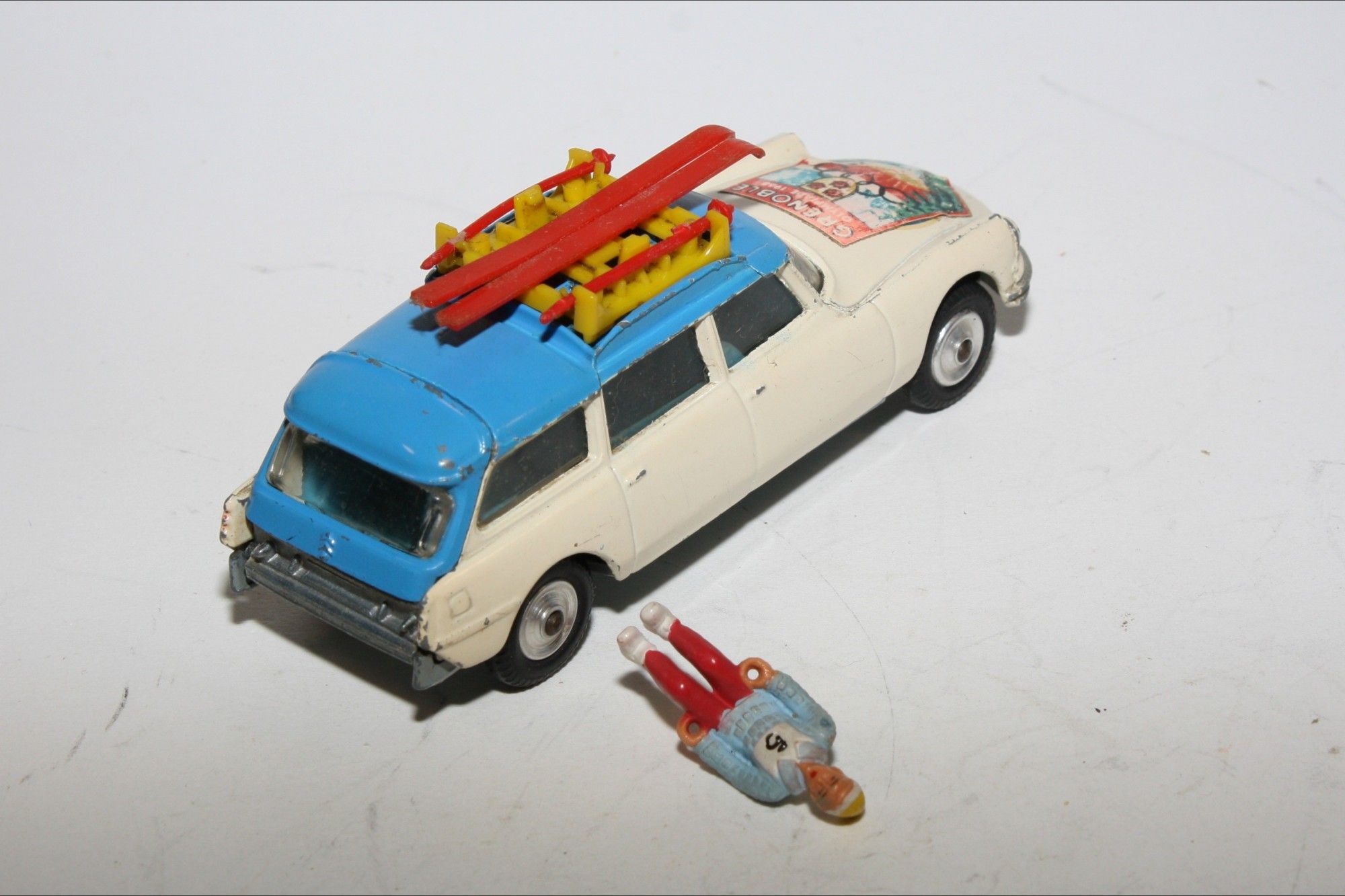 A good example of this scarce 1960's Corgi model. Original blue/white original paintwork is excellent with a few small rub & nicks, please study the photos for exact condition. Original tyres on spun hubs, crystal clear windows, original bonnet decal (a little faded), blue interior with working seat mechanism, complete with original skis & poles on yellow roof rack with original ski figure figures. Excellent grey underside.
