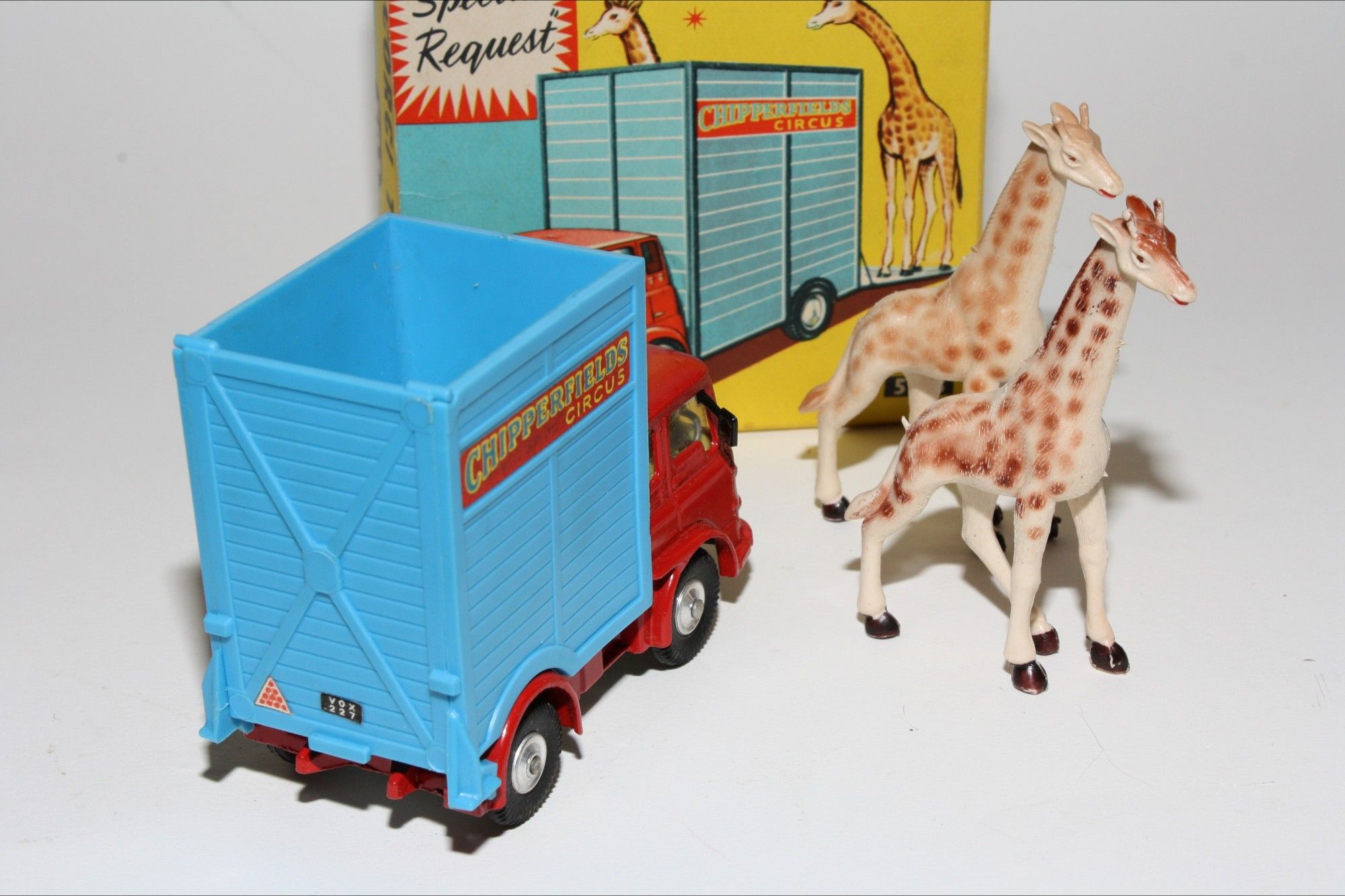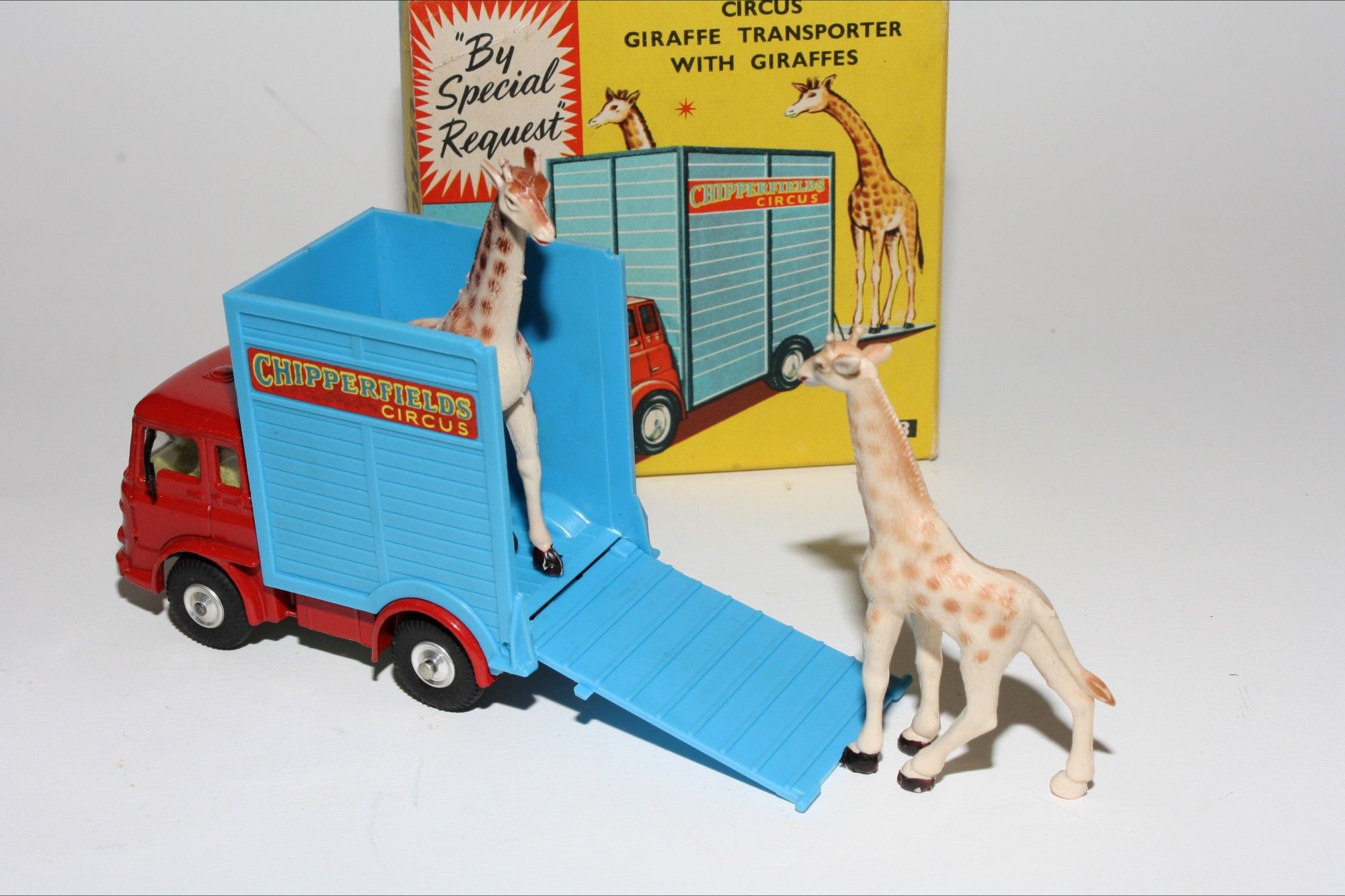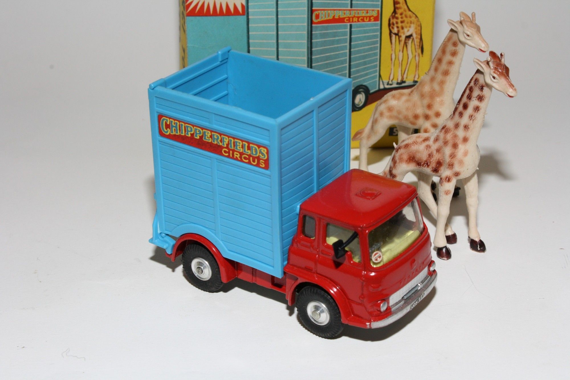 A superb example of this nice Corgi Chipperfields Circus model from the early 1960's. Gleaming original paintwork is mint, please study the photos for exact condition. Perfect spun hubs with original tyres, perfect suspension, crystal clear windows, lemon interior, perfect plastic rear section with good tailgate/ramp perfect Chipperfields stickers and 2 original giraffe figures. Grey underside is mint.