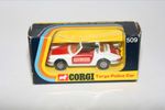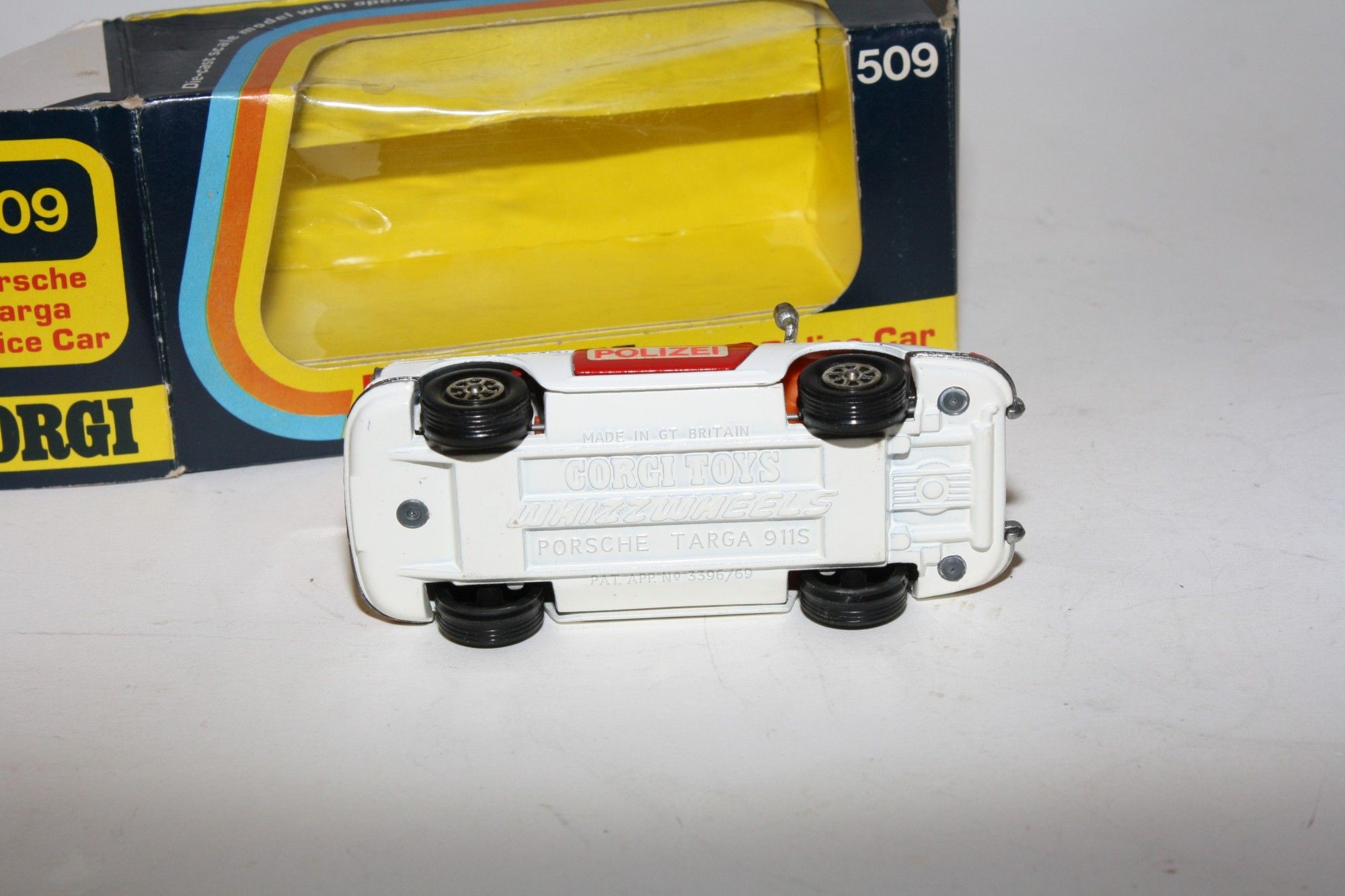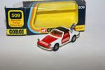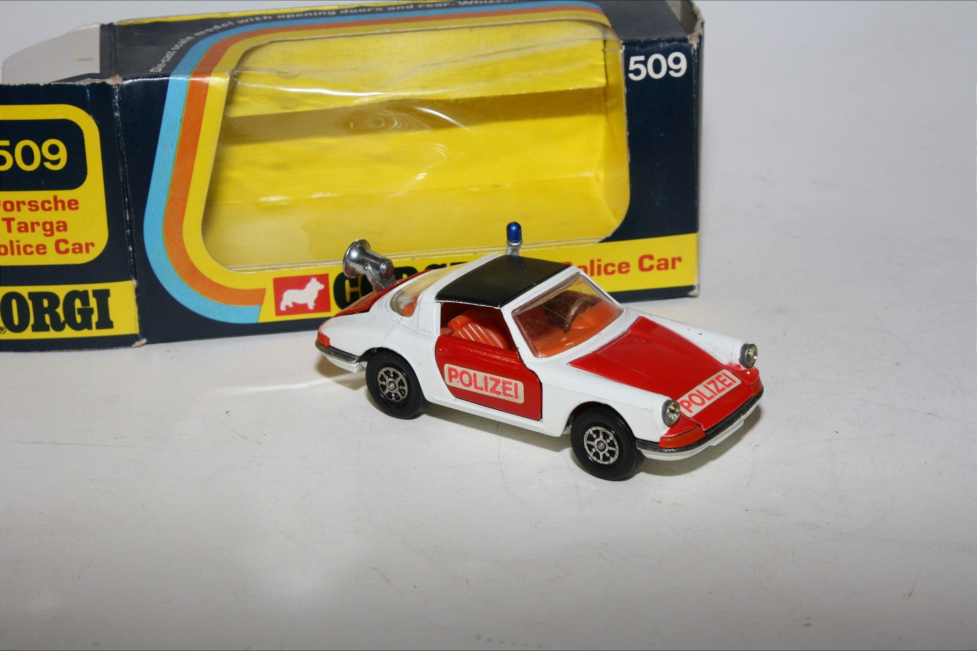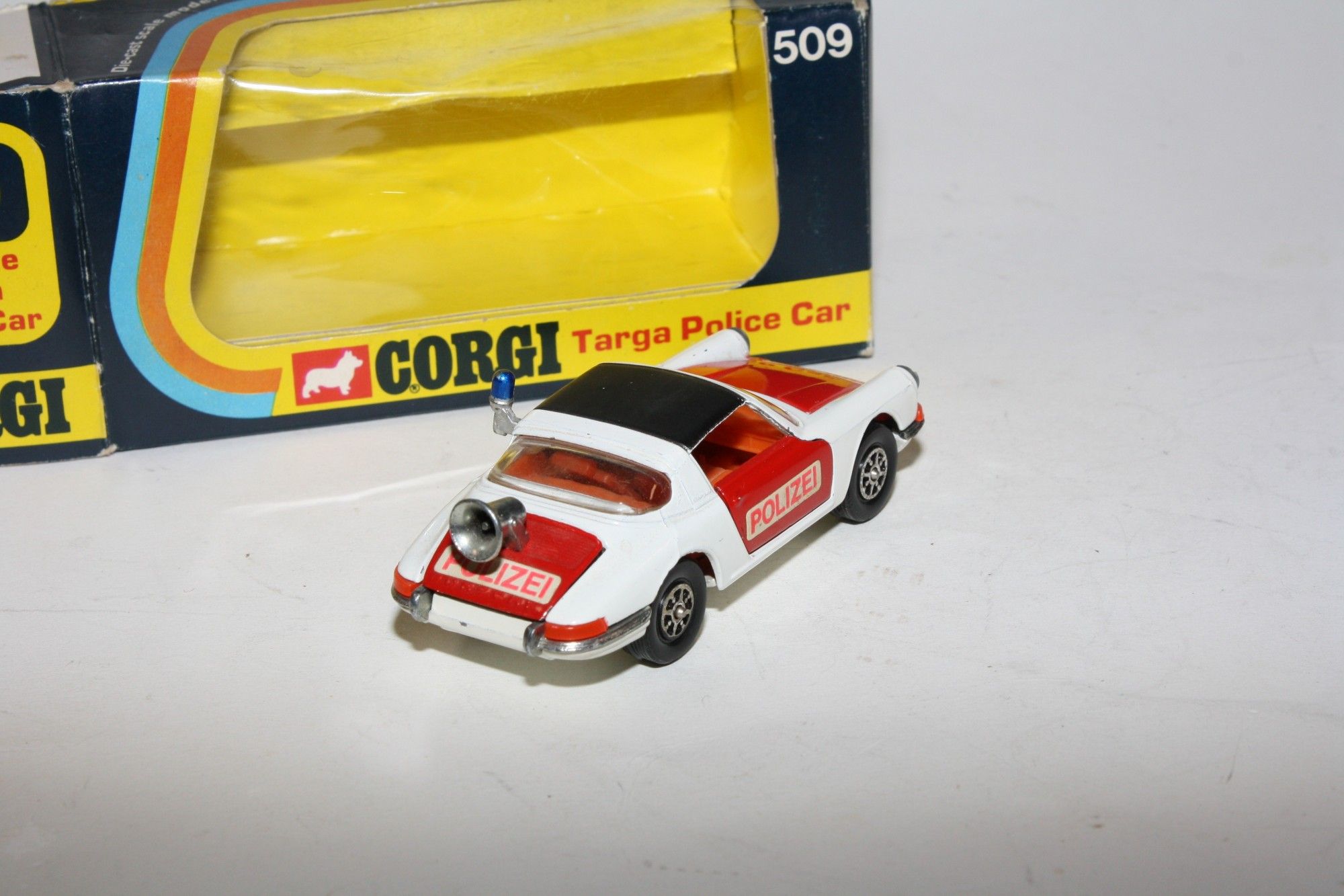 A nice later issue example of this beautiful Corgi model. Gleaming original paintwork is very near mint, just a couple of flea bite nicks, please study the photos for exact condition. All perfect Whizzwheels, strong suspension, crystal clear windows, red interior with gold steering wheel, boot mounted siren, blue beacon, jewelled headlights, Polizei stickers, mint underside.