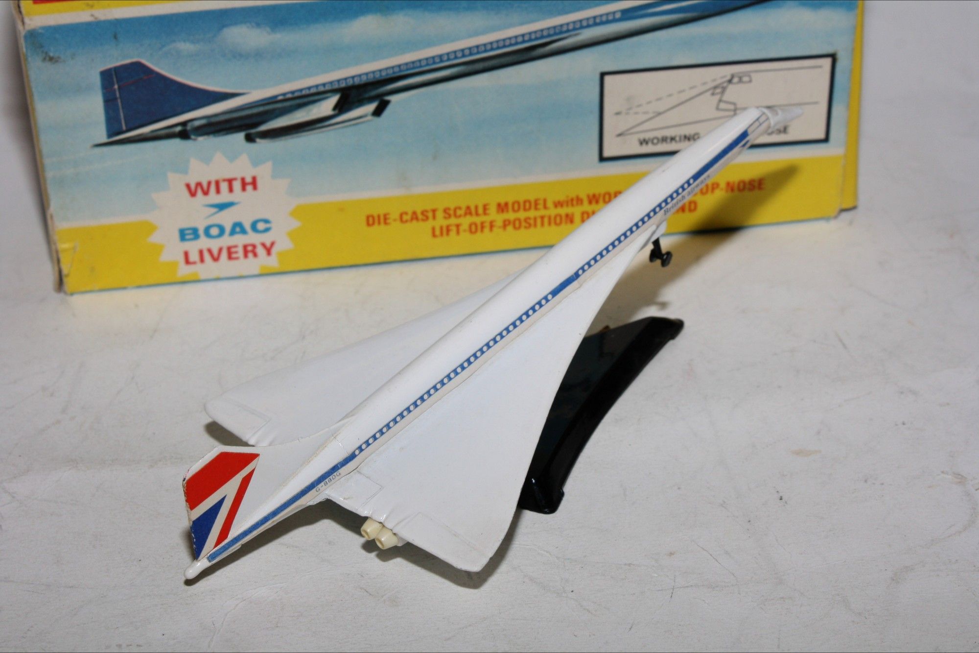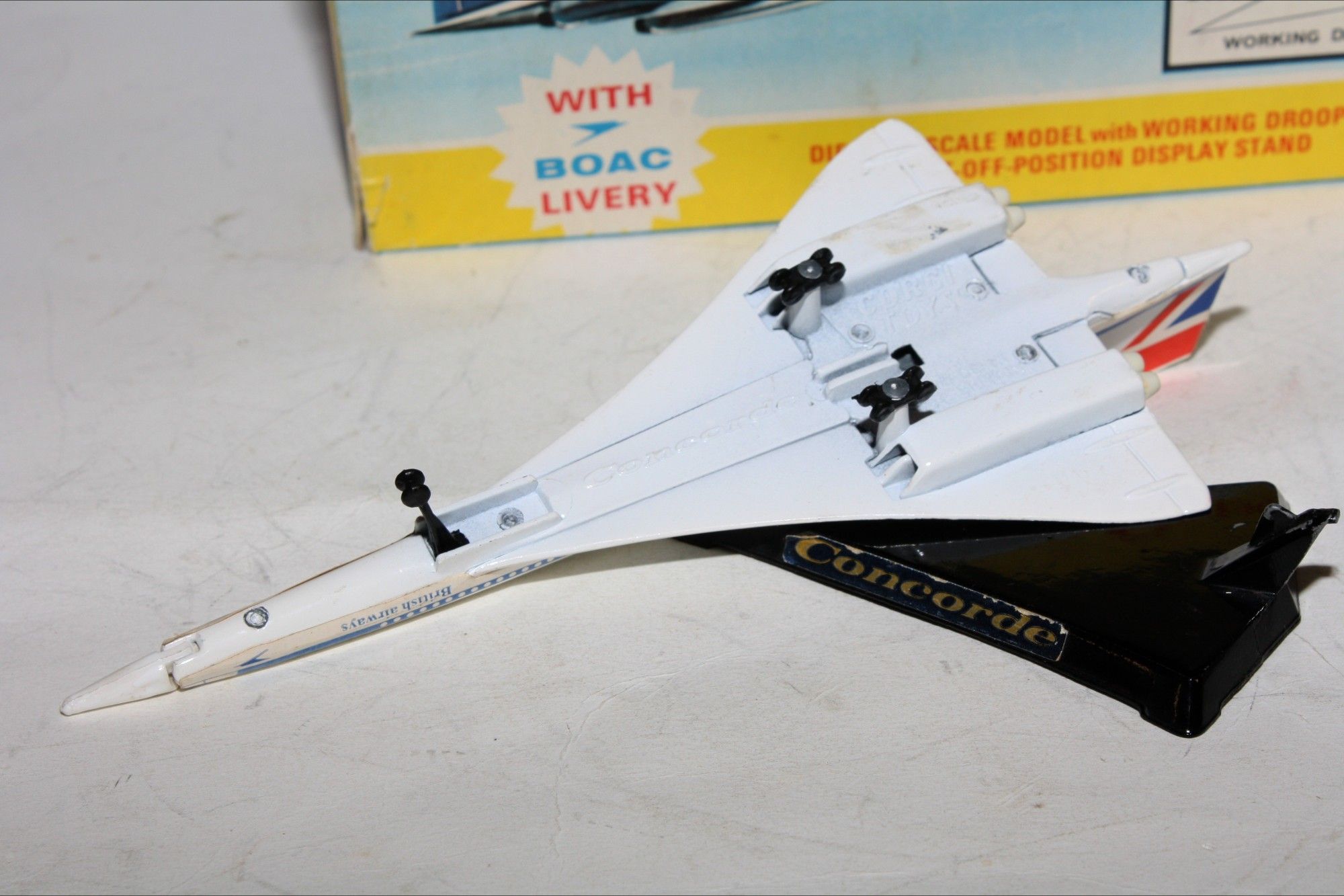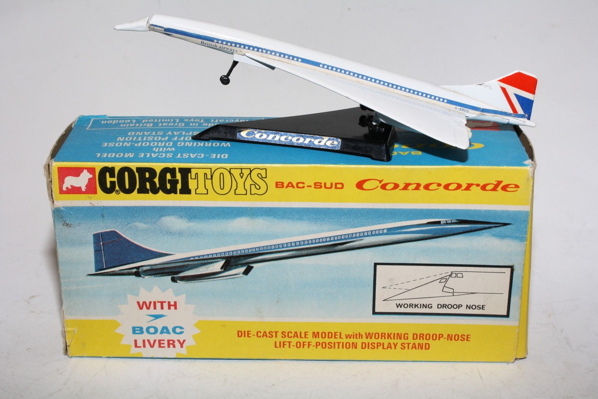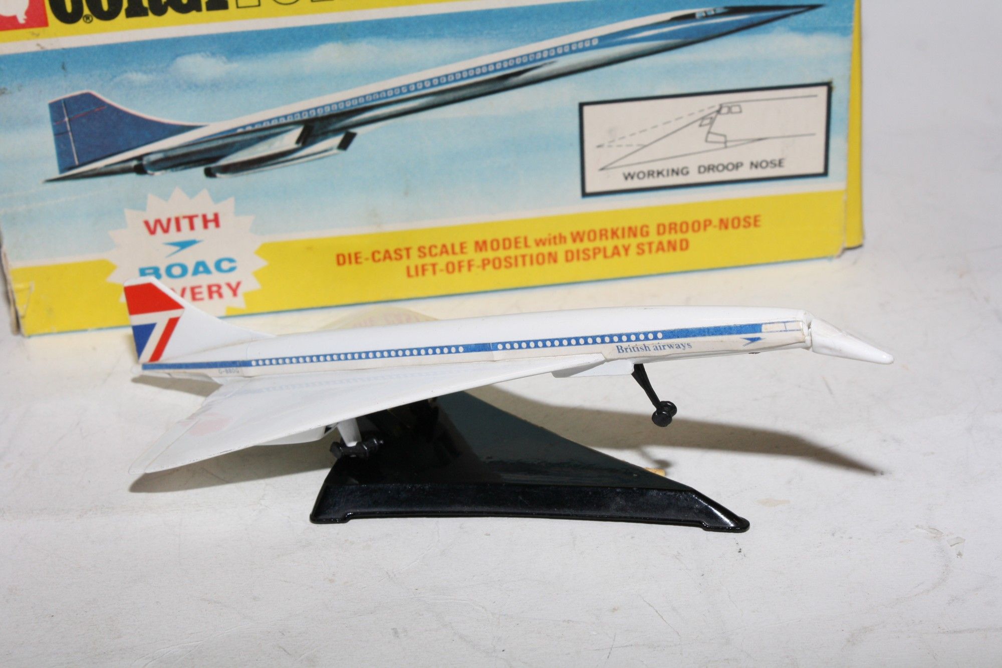 A good example of this 1970's Corgi model of this iconic plane. Gleaming original paintwork is excellent, please study the high resolution photos for exact condition. All undercarriage intact and present as is nose cone (rare to find). Original livery stickers intact and original stand present. Underside excellent.
