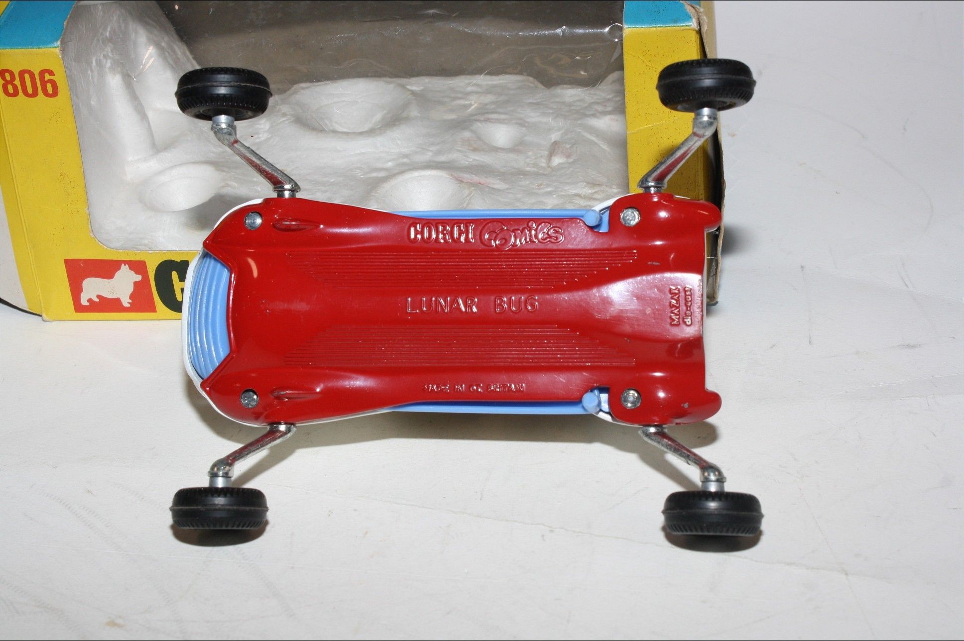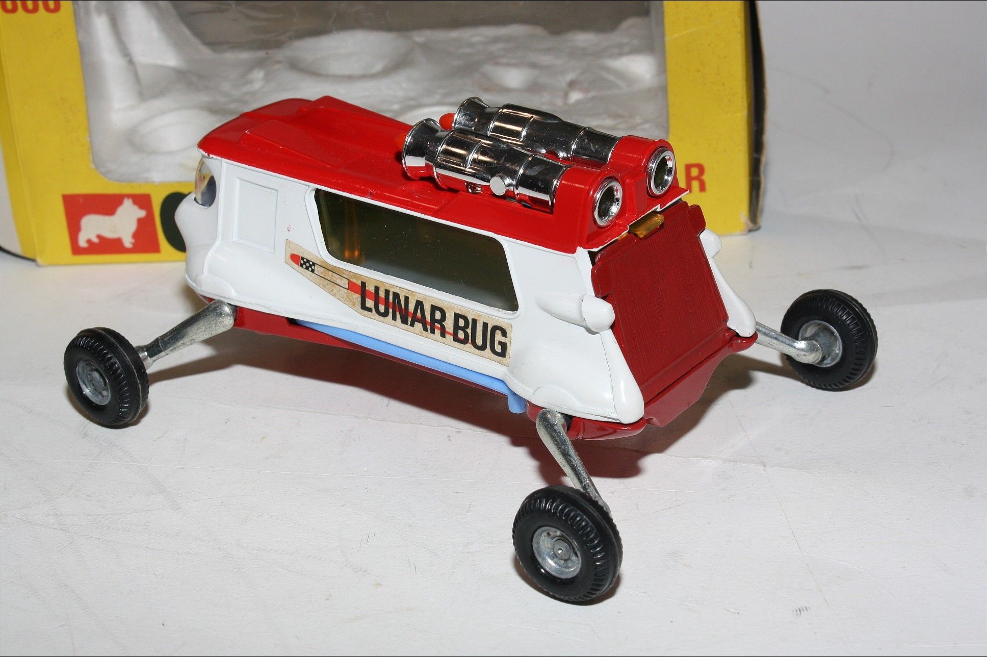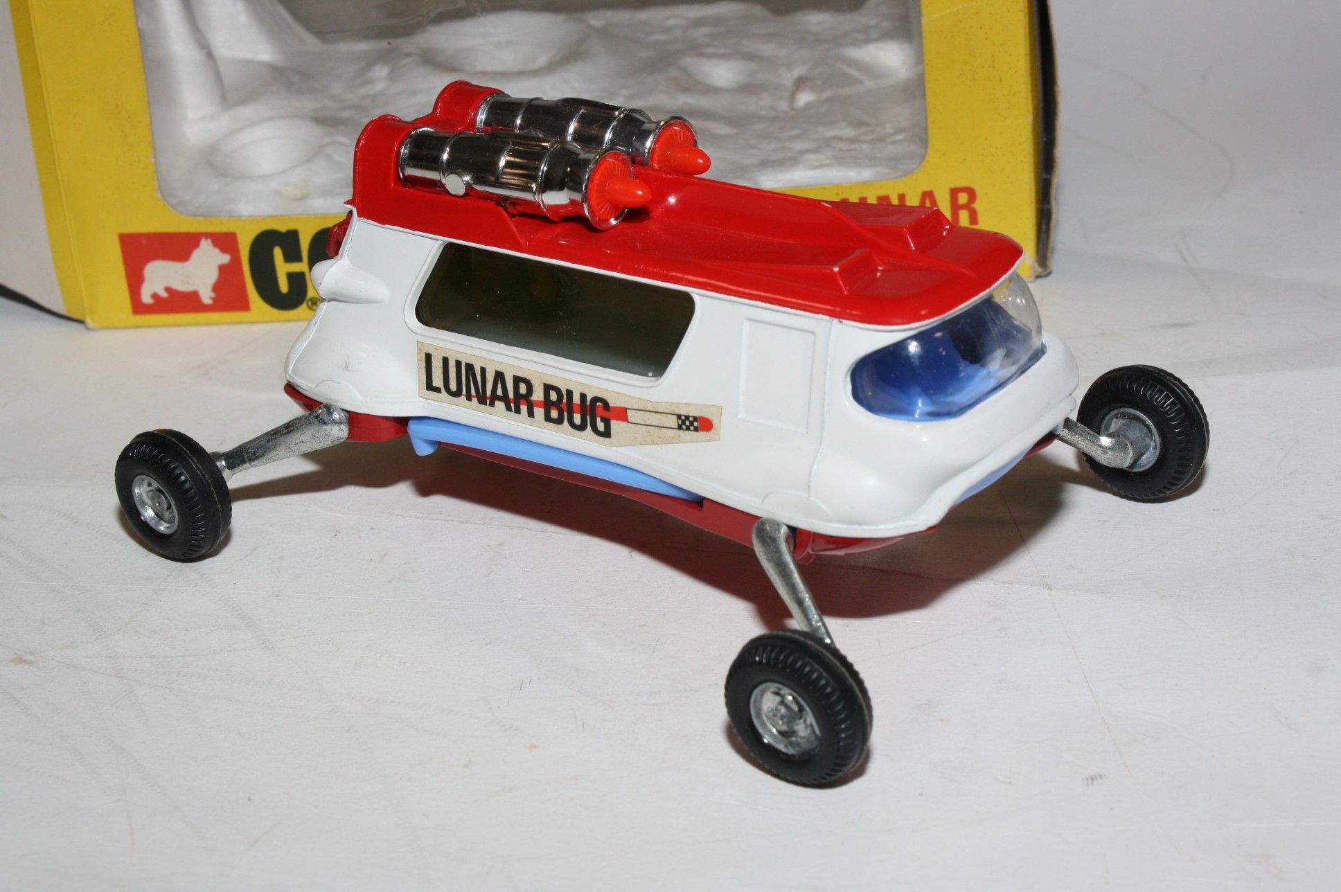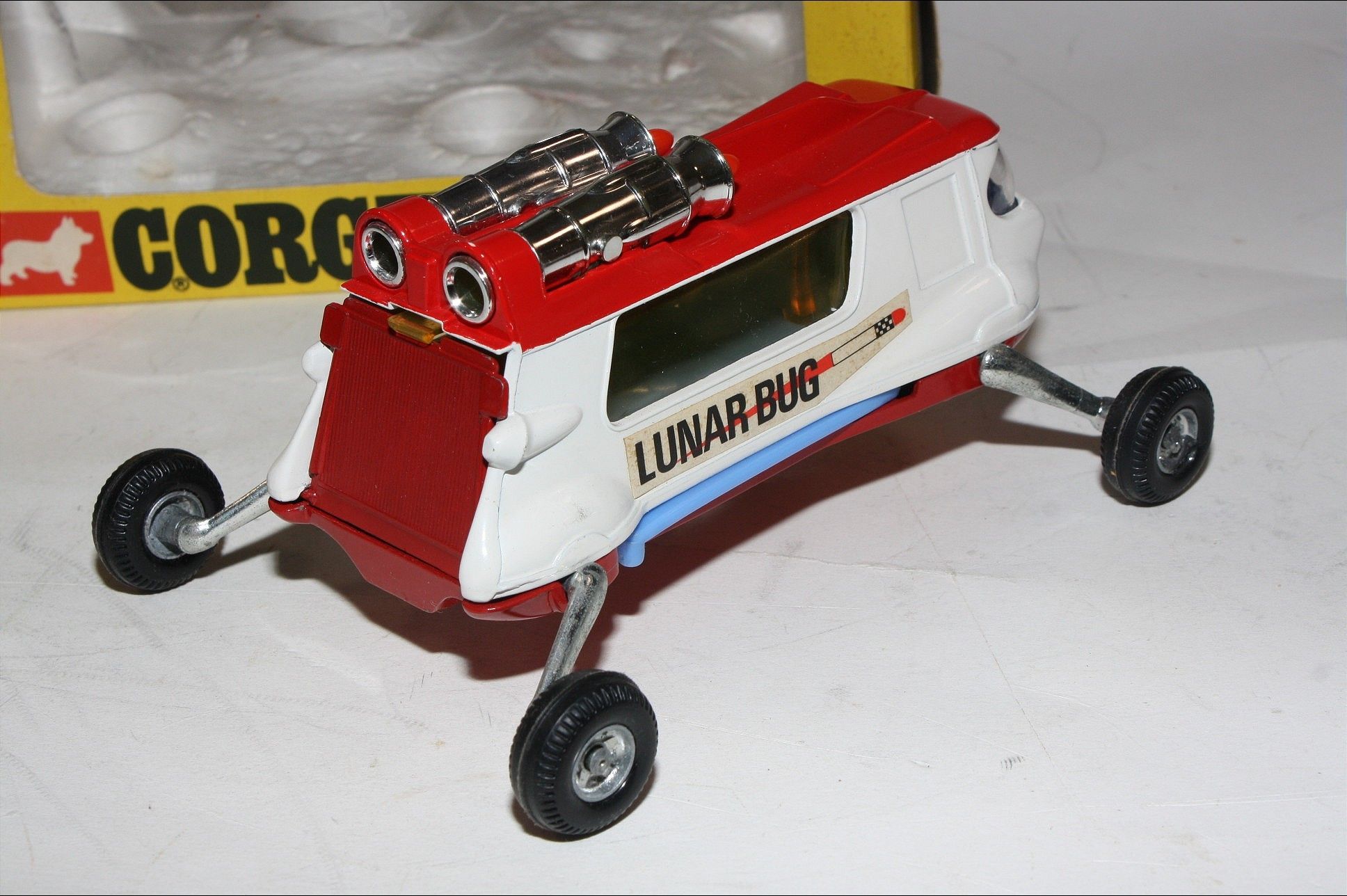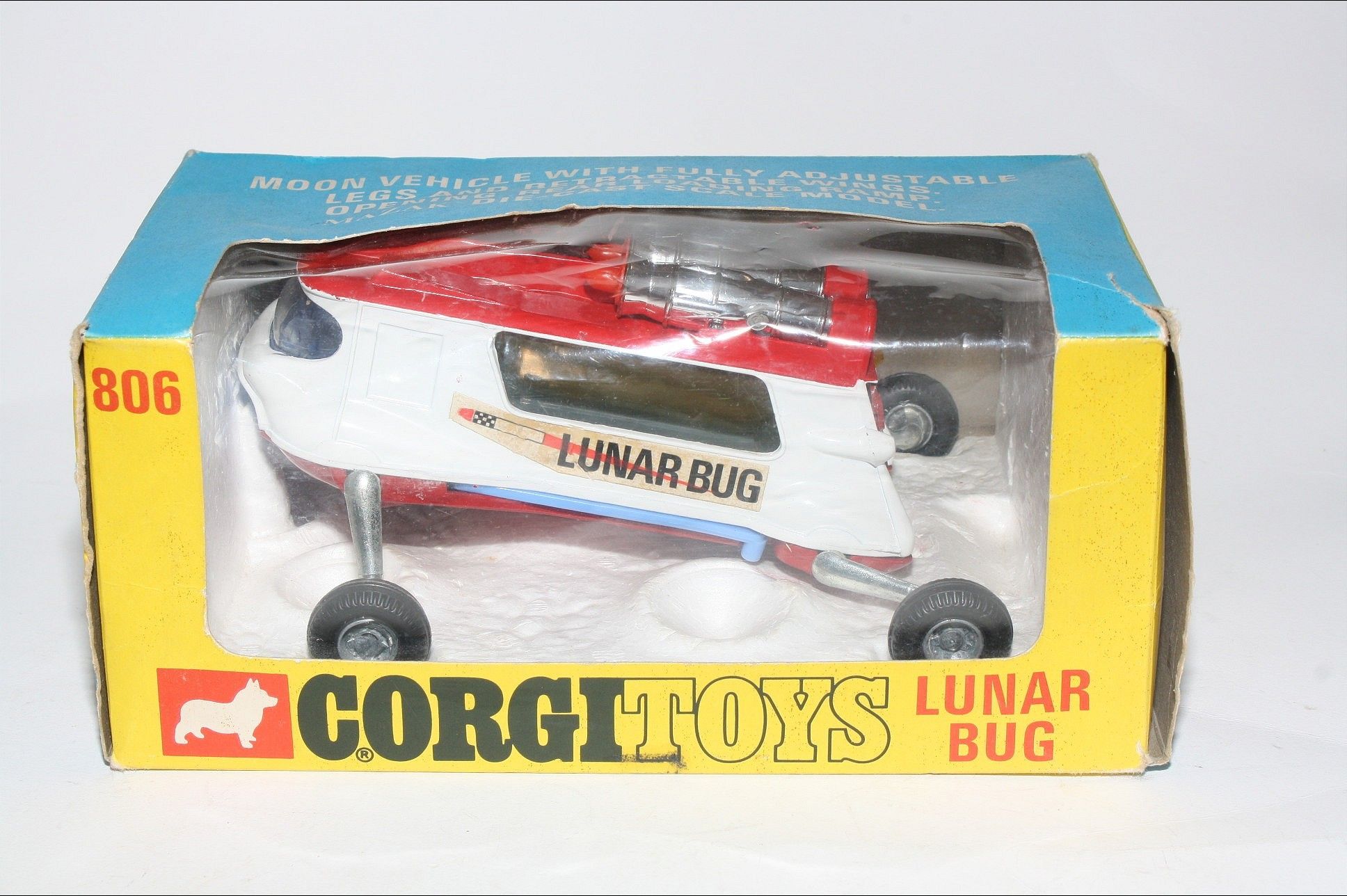 A superb example of this beautiful Corgi model. Gleaming original red/white paintwork is near mint, just a couple of rubs to roof, please study the photos for exact condition. Original tyres on metal hubs, adjustable legs all working fine, crystal clear windows, rear tailgate, good decals, adjustable blue wings present and gleaming chrome thrusters, underside mint.