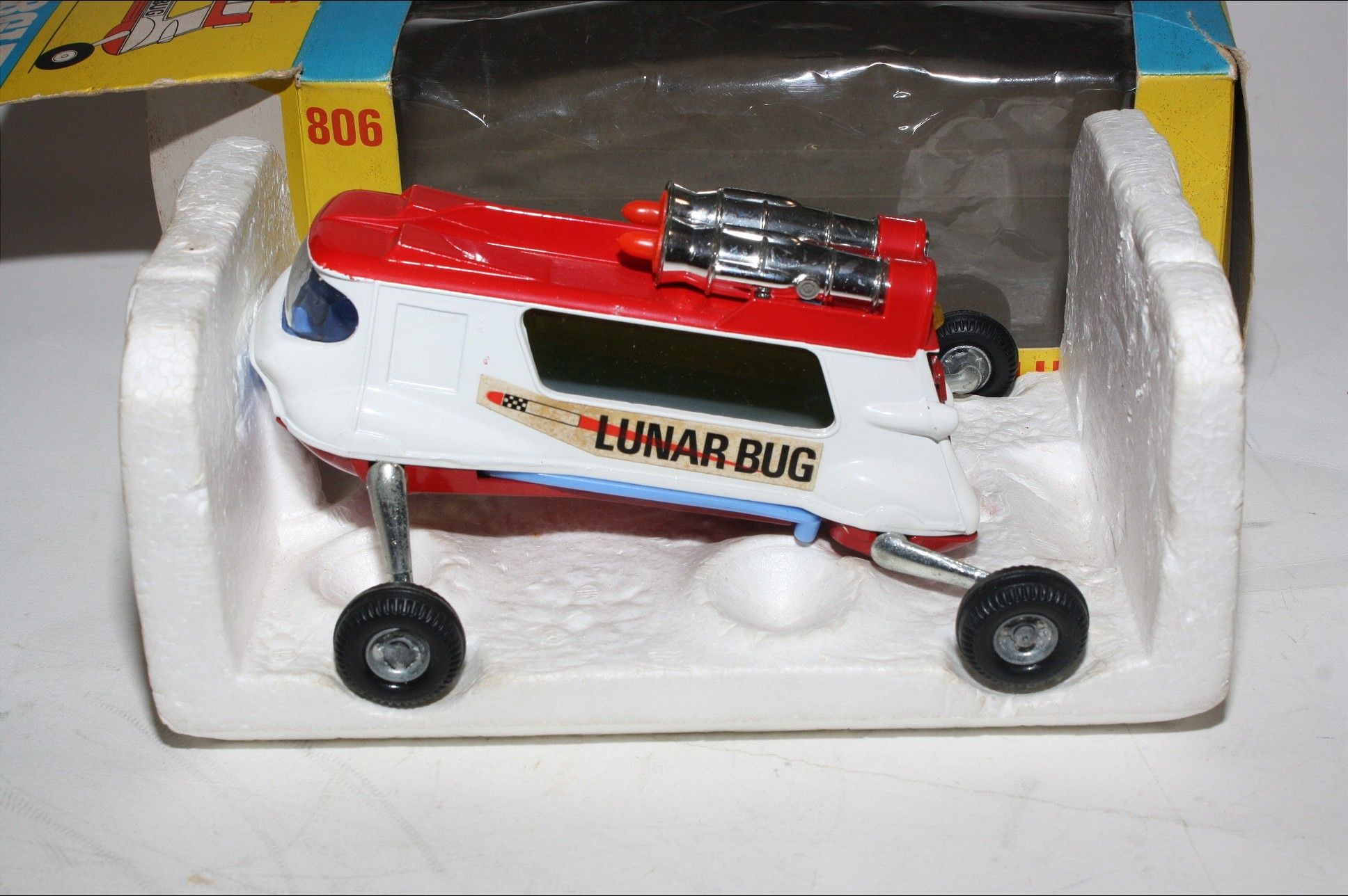 Comes with its original all yellow and blue card box which is complete and in good condition all complete with all flaps attached, some light wear to edges and a small repaired tear to top right corner. Original " moon surface" polystyrene inner is intact and good, original acetate window is intact with some creasing, original price label to one end flap*. Please study the photos.