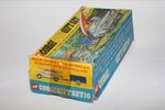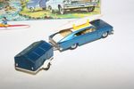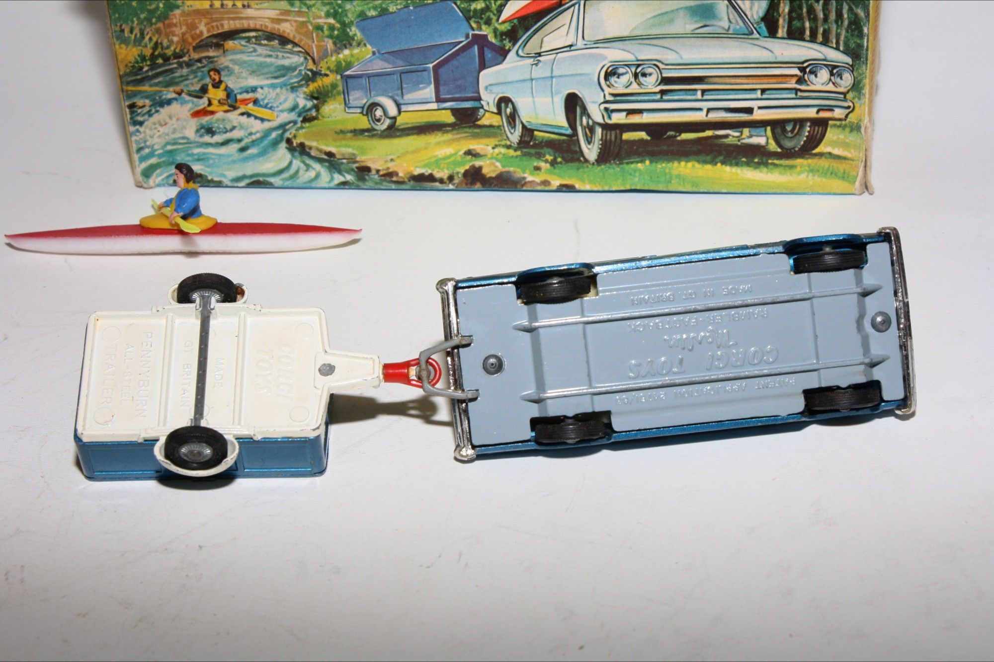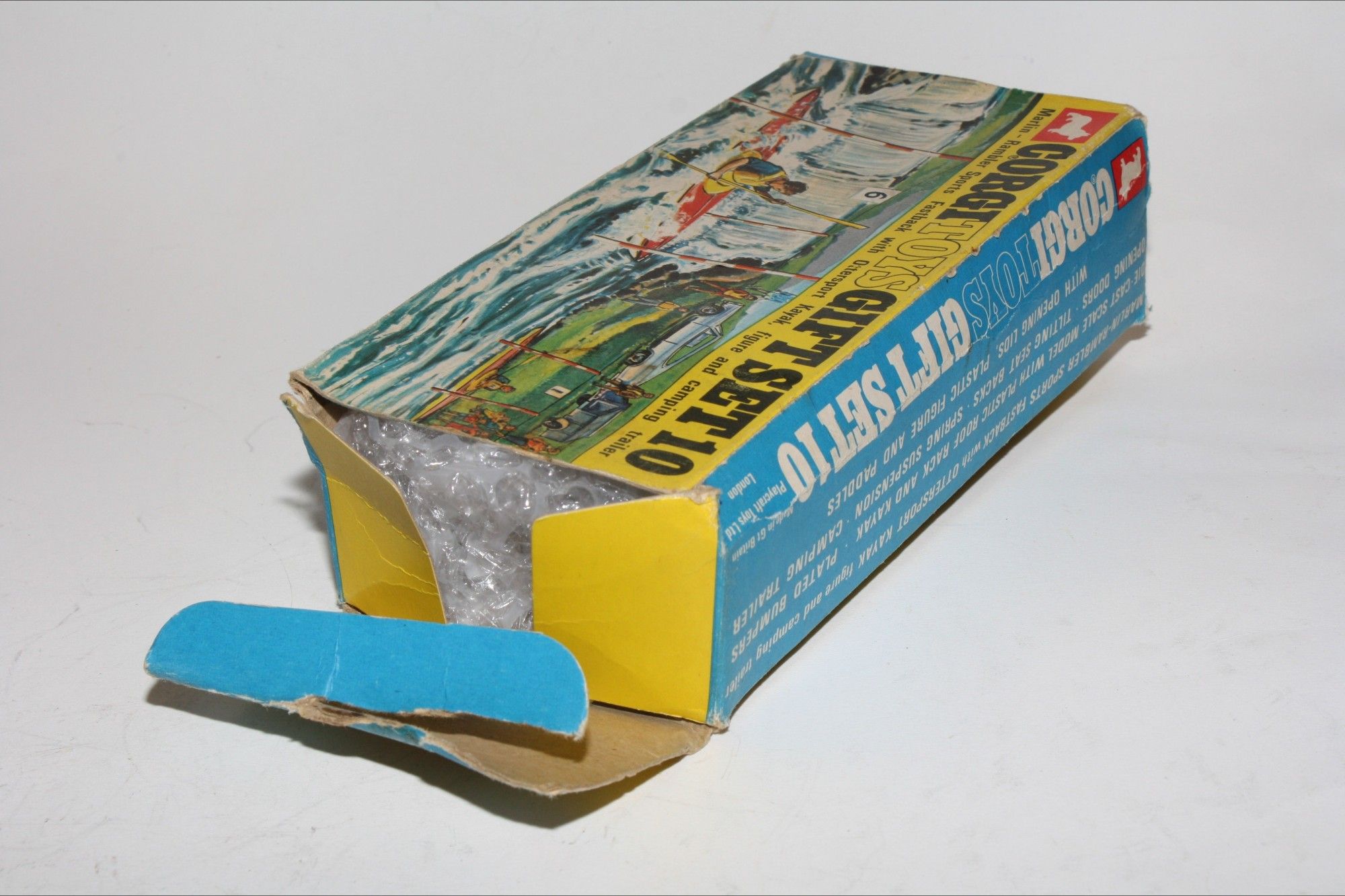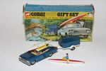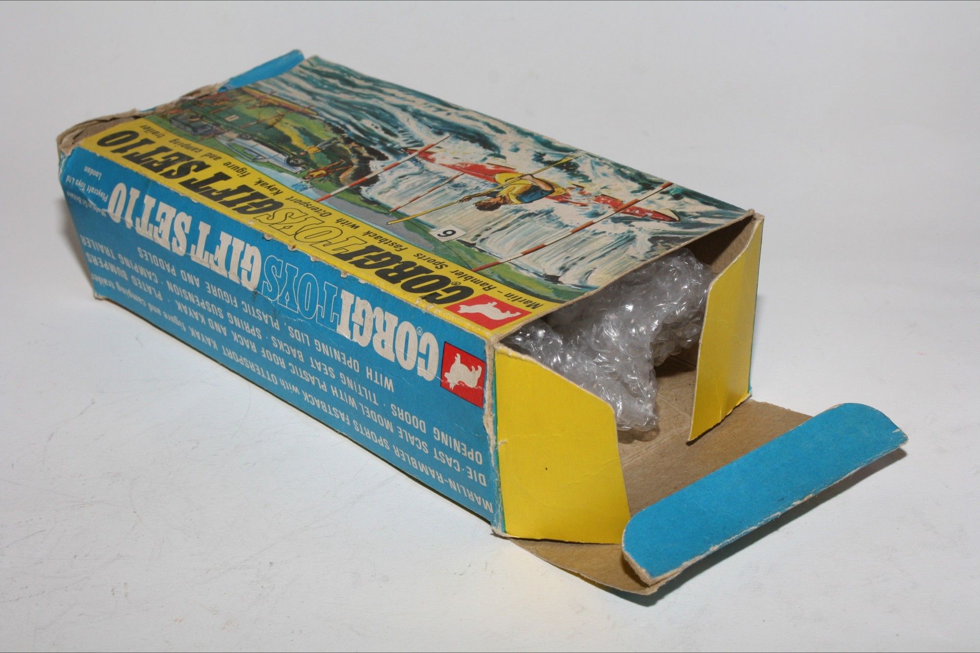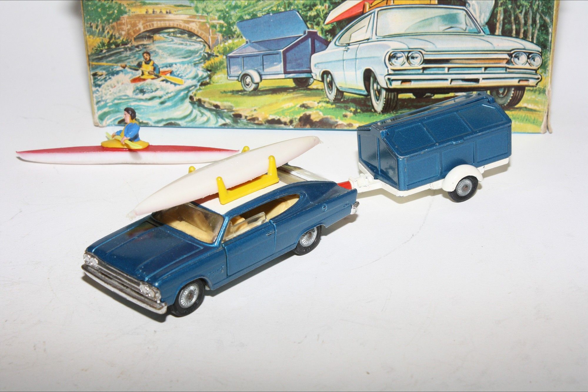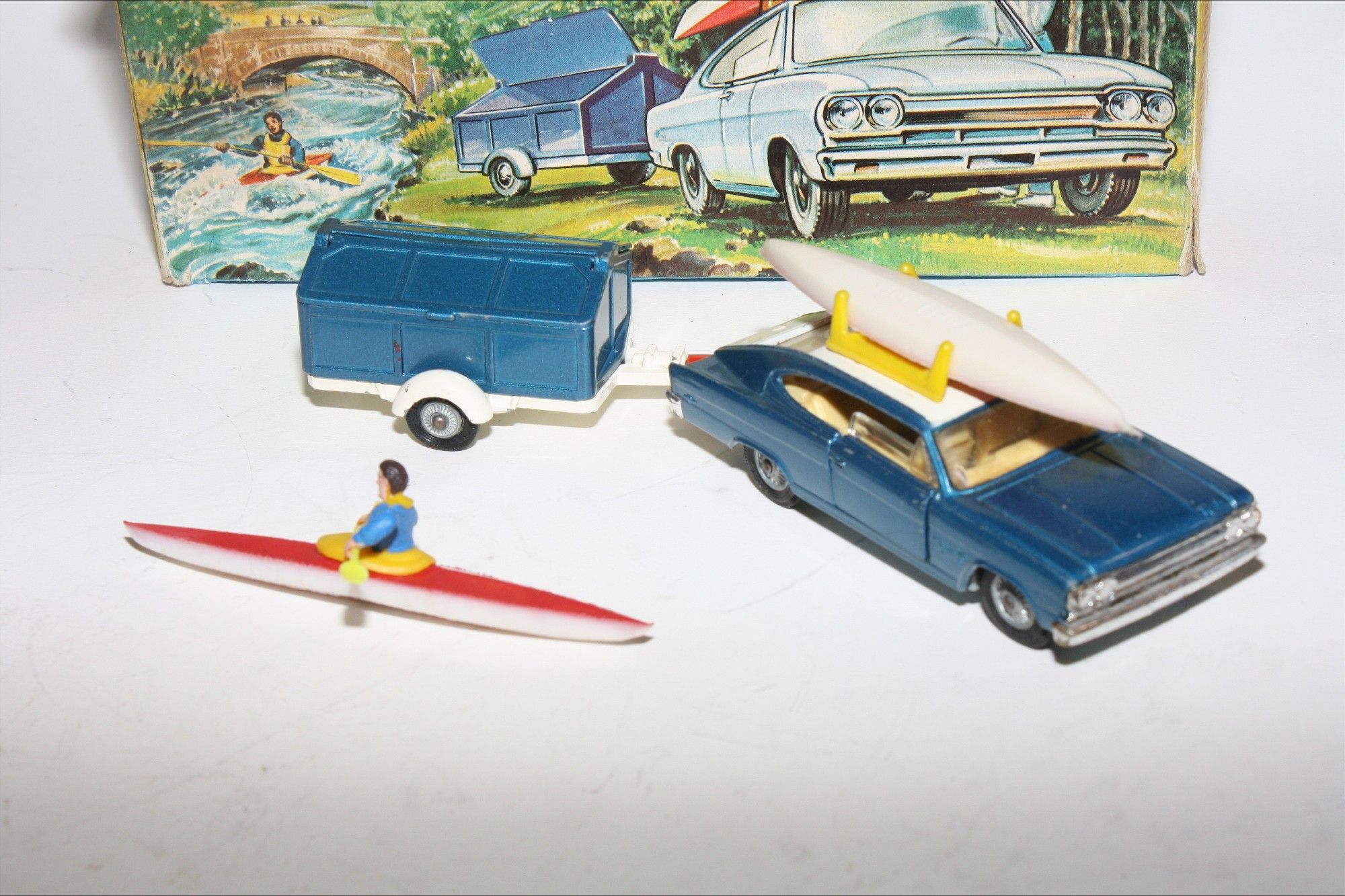 A nice example of this hard to find gift set made for one year only. Original paintwork is near mint on both models, please study the photos for exact condition. Original tyres on cast hubs, perfect suspension, crystal clear windows, white interior, good roof rack and plastic tow bar, all original kayaks and figure, paddle is replacement. Good chrome. All undersides are excellent.