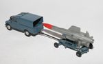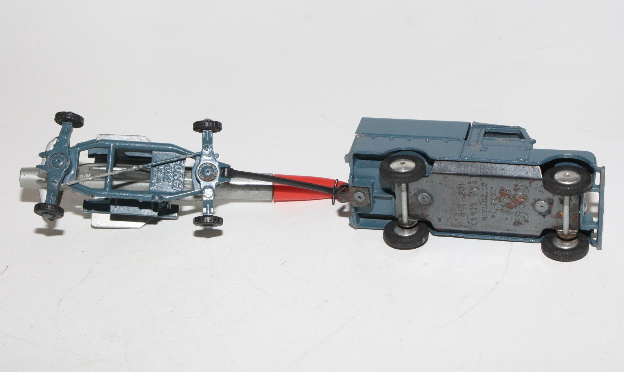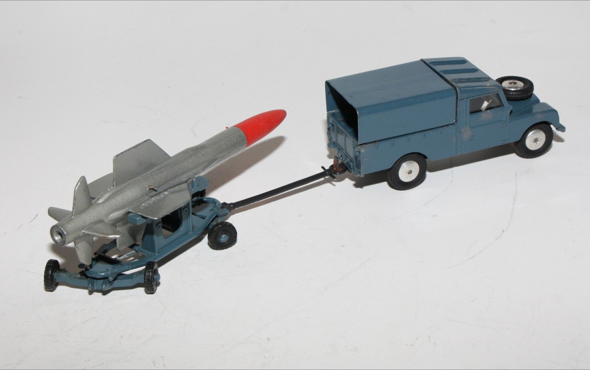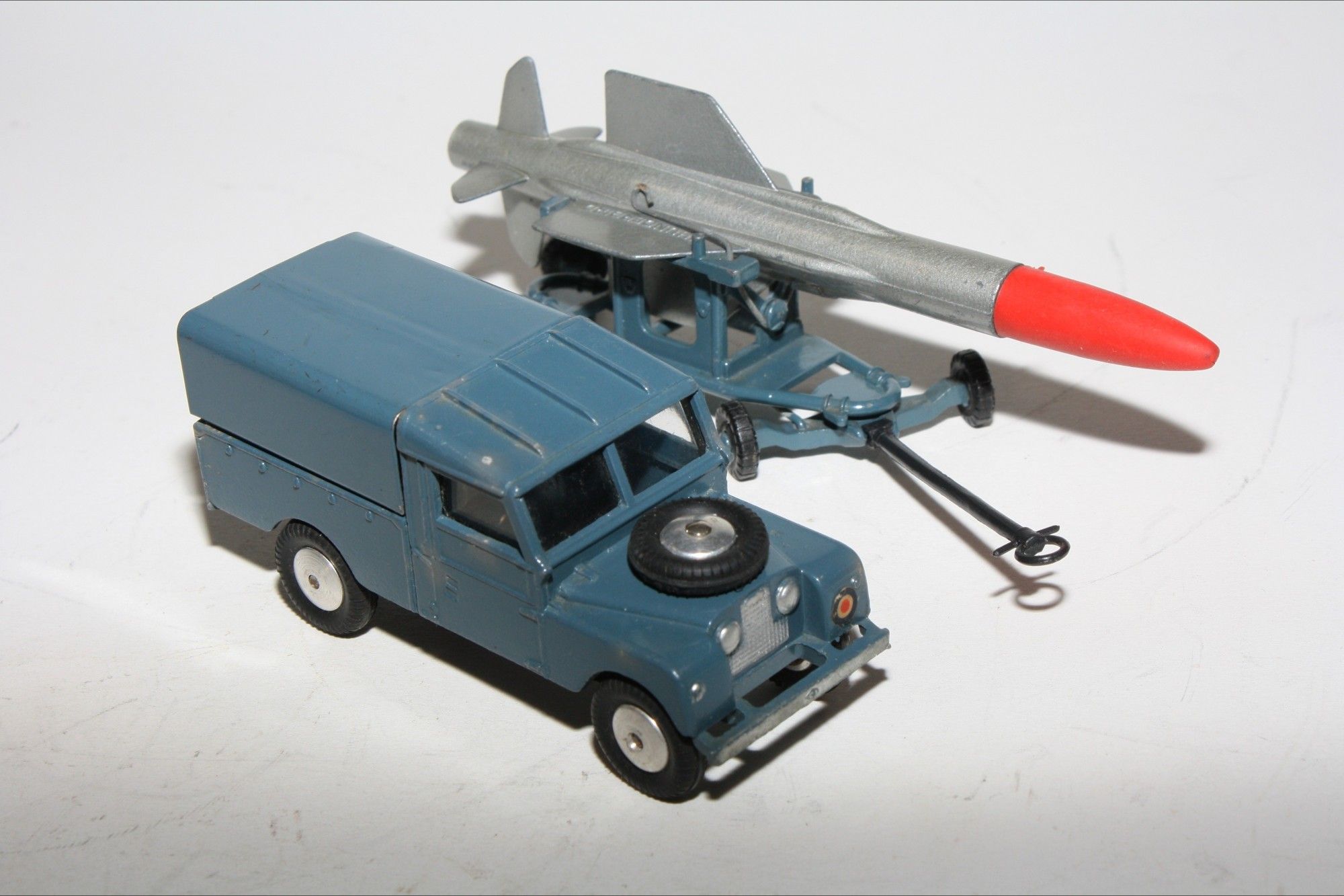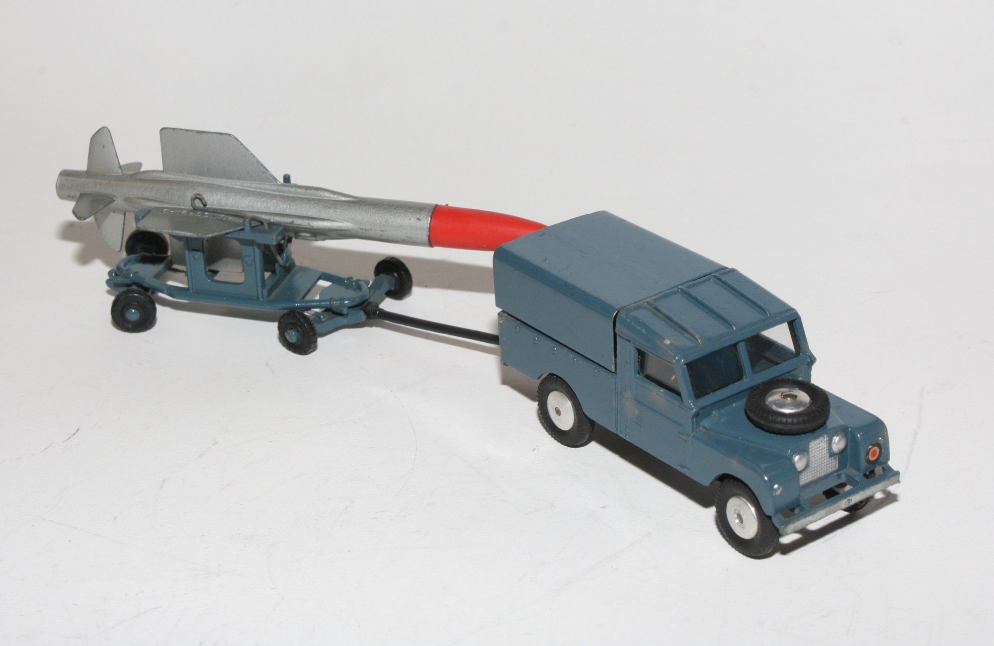 A nice example of this " Rocket Age" Corgi Gift Set 3. Original RAF blue paintwork on Landrover is very good but affected by patches of surface discolouration and minor rubs , please study the high resolution photos for exact condition. Original tyres on smooth hubs, free rolling axles, good clear windows, tow hook, good original tin tilt, original RAF decals. Tin baseplate.
