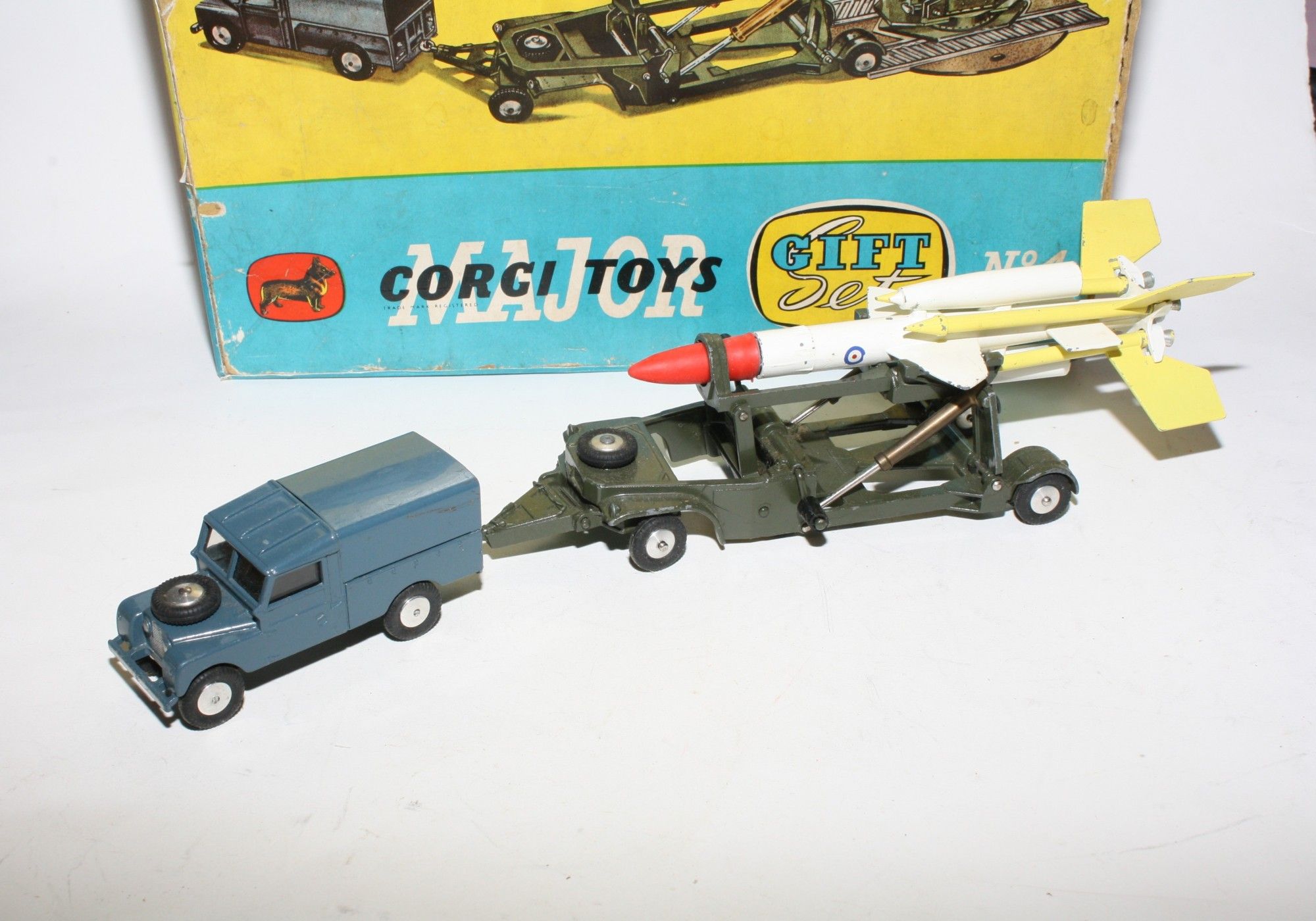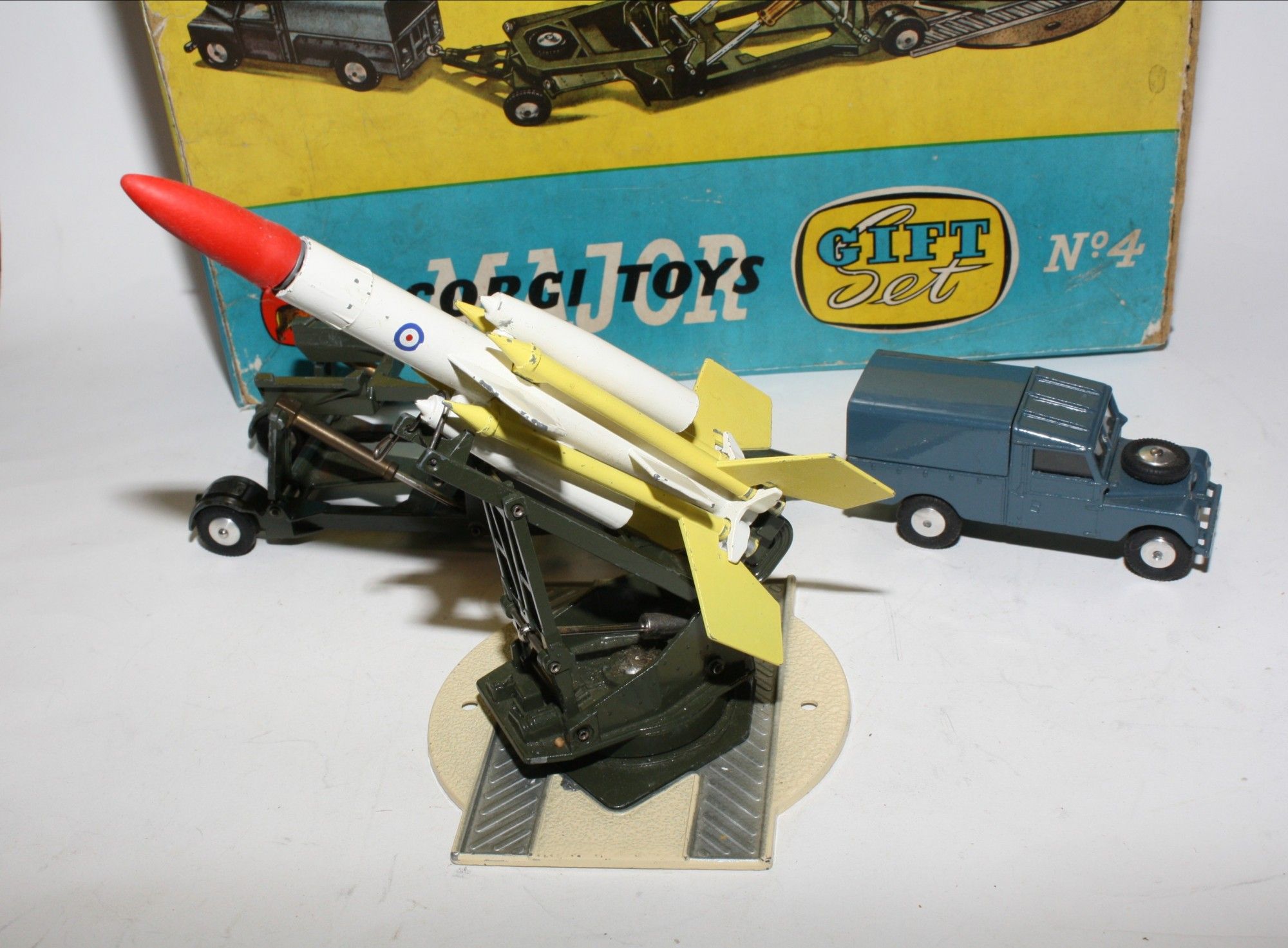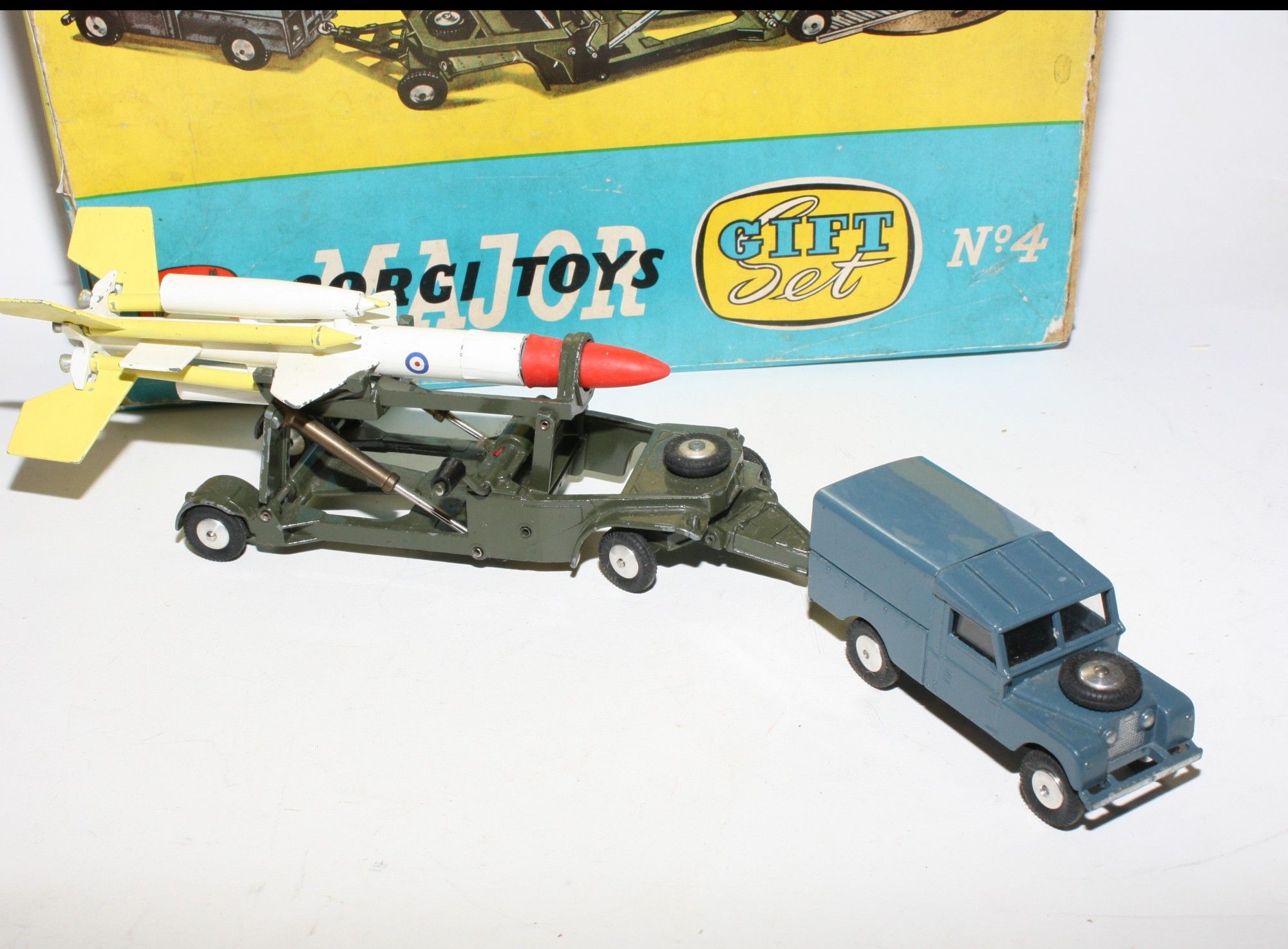 A nice example of this 1950's military Rocket Age Corgi gift set. Original paintwork on models is excellent, just a few small chips, mainly to missile, please study the photos for exact condition. Original tyres on smooth hubs, missile trolley in gloss green with brass ram lifting mechanism working perfectly, good drawbar and pivot, Landrover is excellent with tin tilt and tin baseplate. Missile nose cone is a replacement and has all four thrusters present.