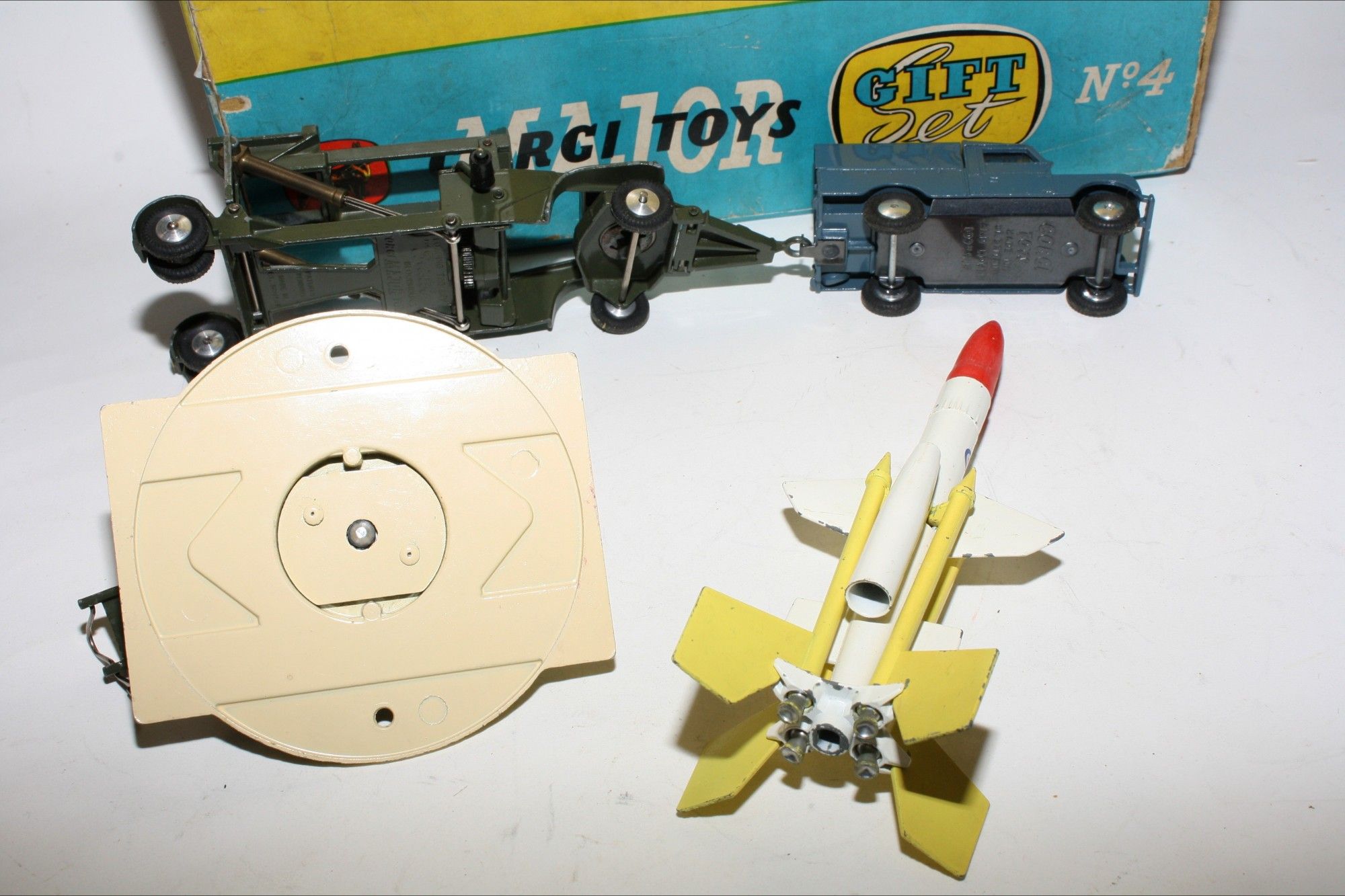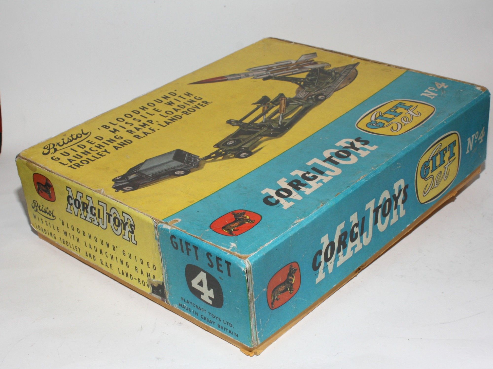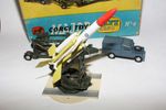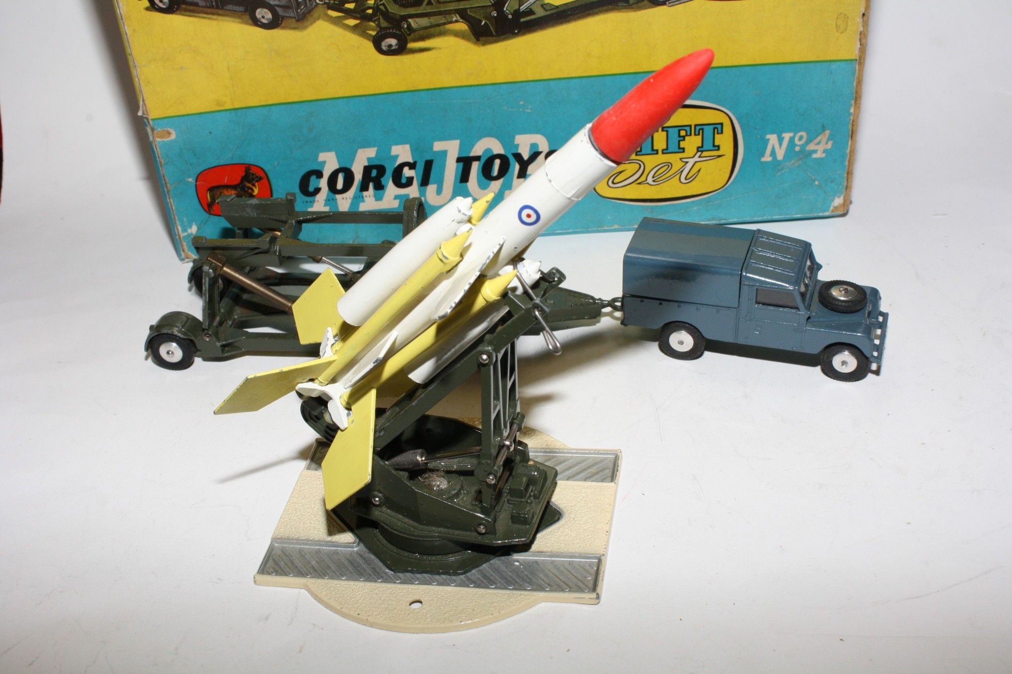 A nice example of this 1950's military Rocket Age Corgi gift set. Original paintwork on models is excellent, just a few small chips, mainly to missile, please study the photos for exact condition. Original tyres on smooth hubs, missile trolley in gloss green with brass ram lifting mechanism working perfectly, good drawbar and pivot, Landrover is excellent with tin tilt and tin baseplate. Missile nose cone is a replacement and has all four thrusters present.