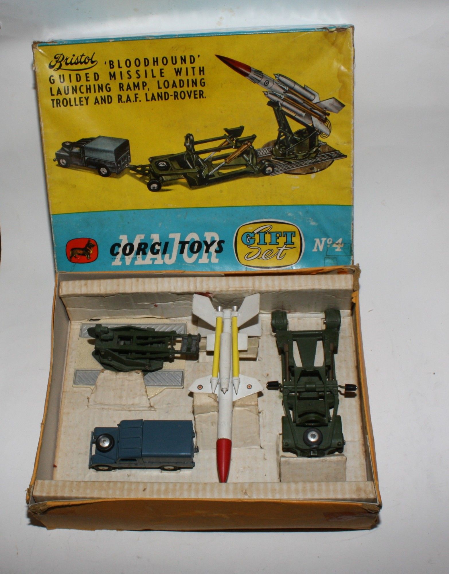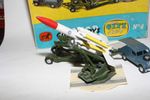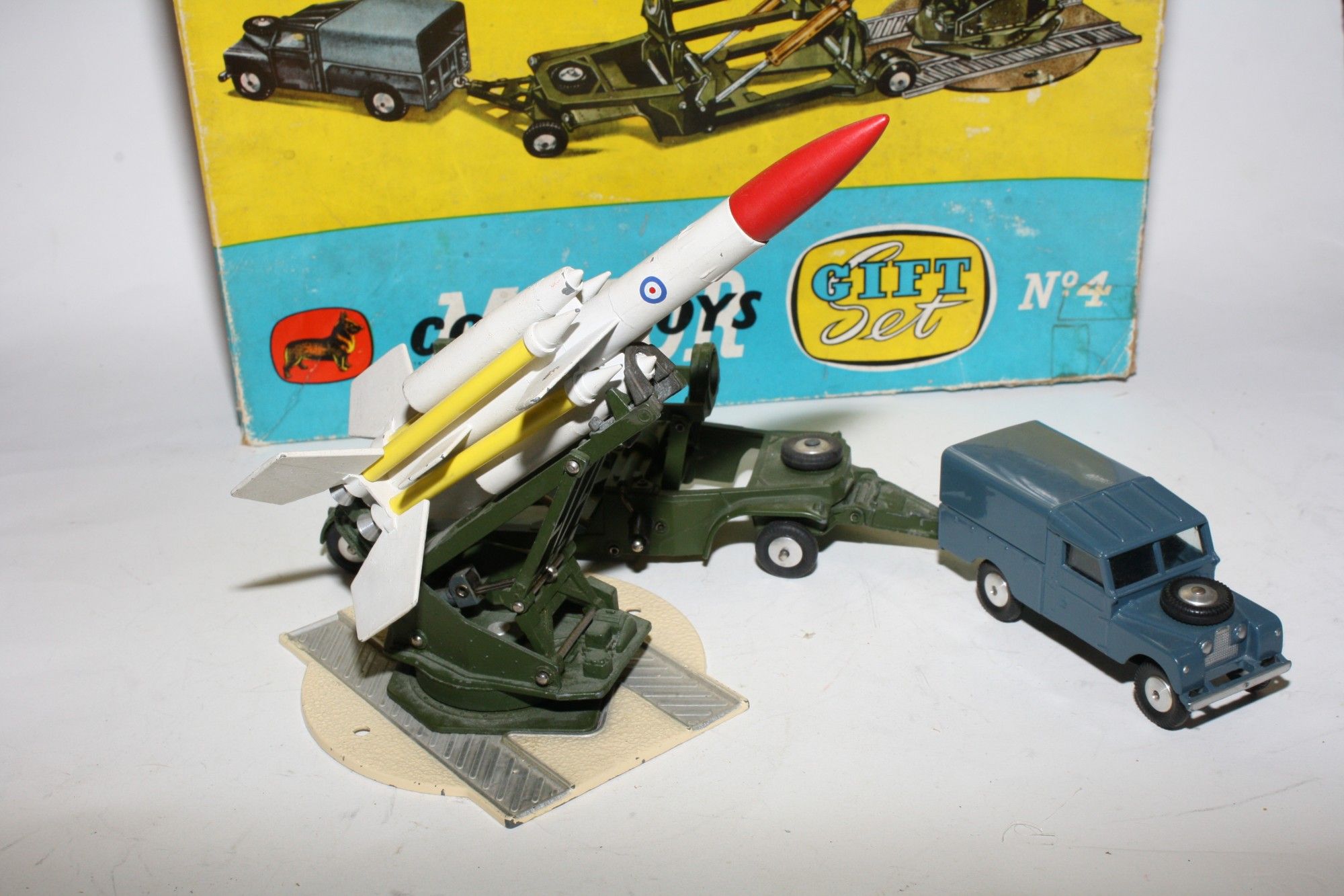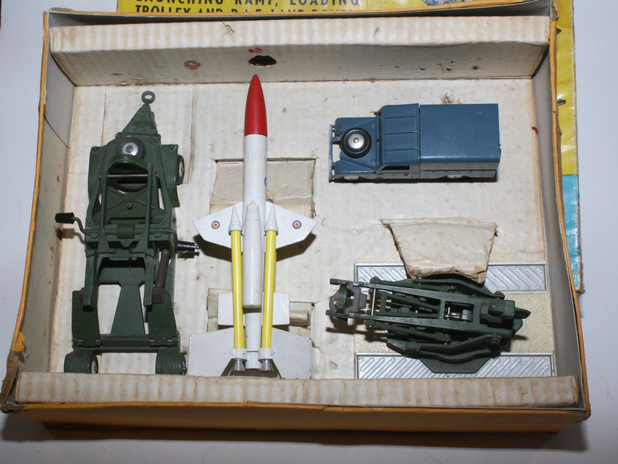 A nice example of this 1950's military Rocket Age Corgi gift set. Original paintwork on models is excellent, just a few small chips, mainly to missile, please study the photos for exact condition. Original tyres on smooth hubs, missile trolley with brass ram lifting mechanism working perfectly, good drawbar and pivot, Landrover is excellent with tin tilt and tin baseplate. Missile nose cone is good and with all four thrusters present.