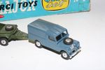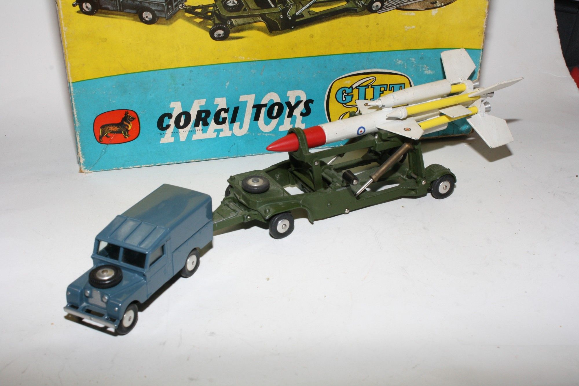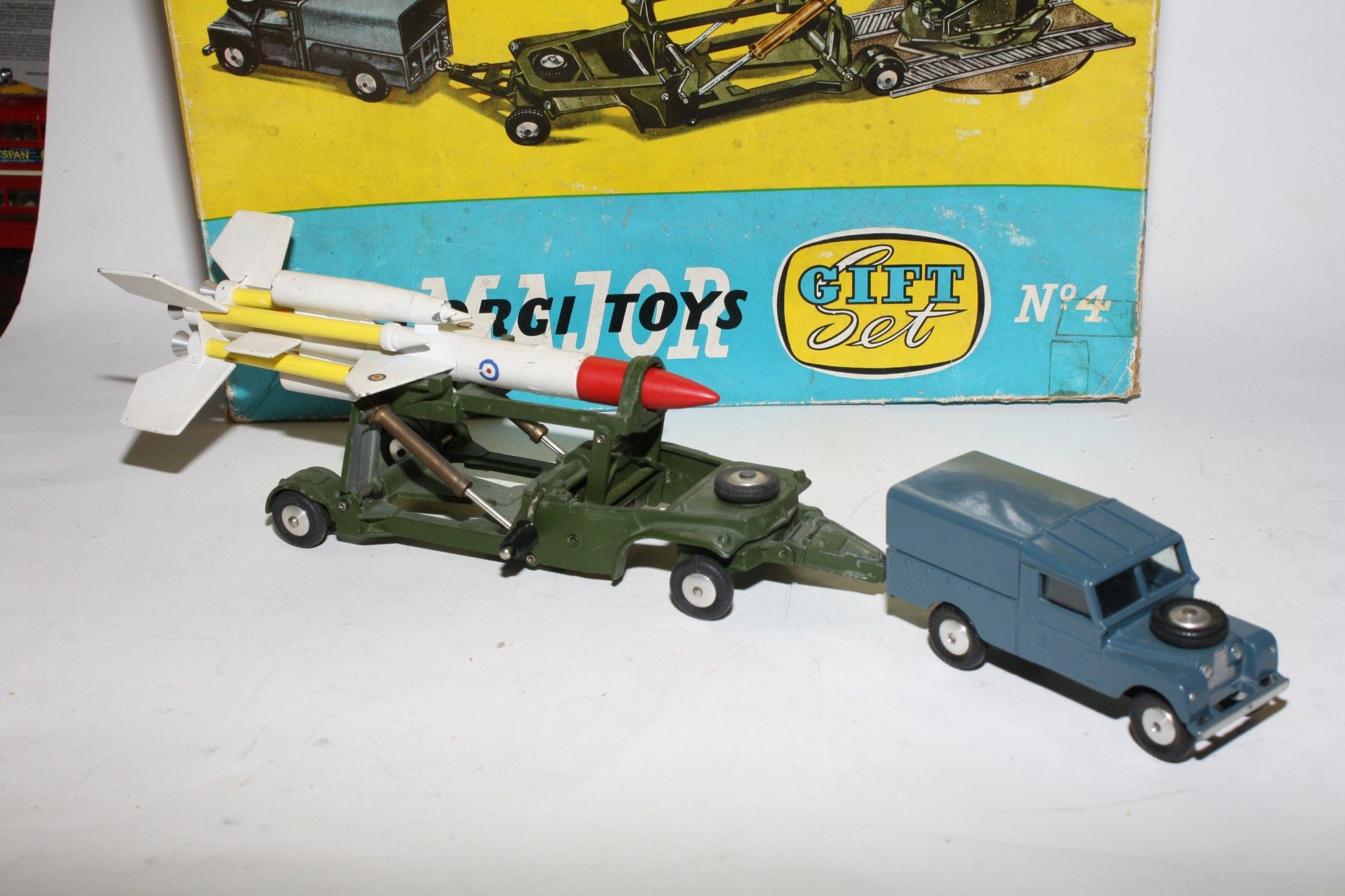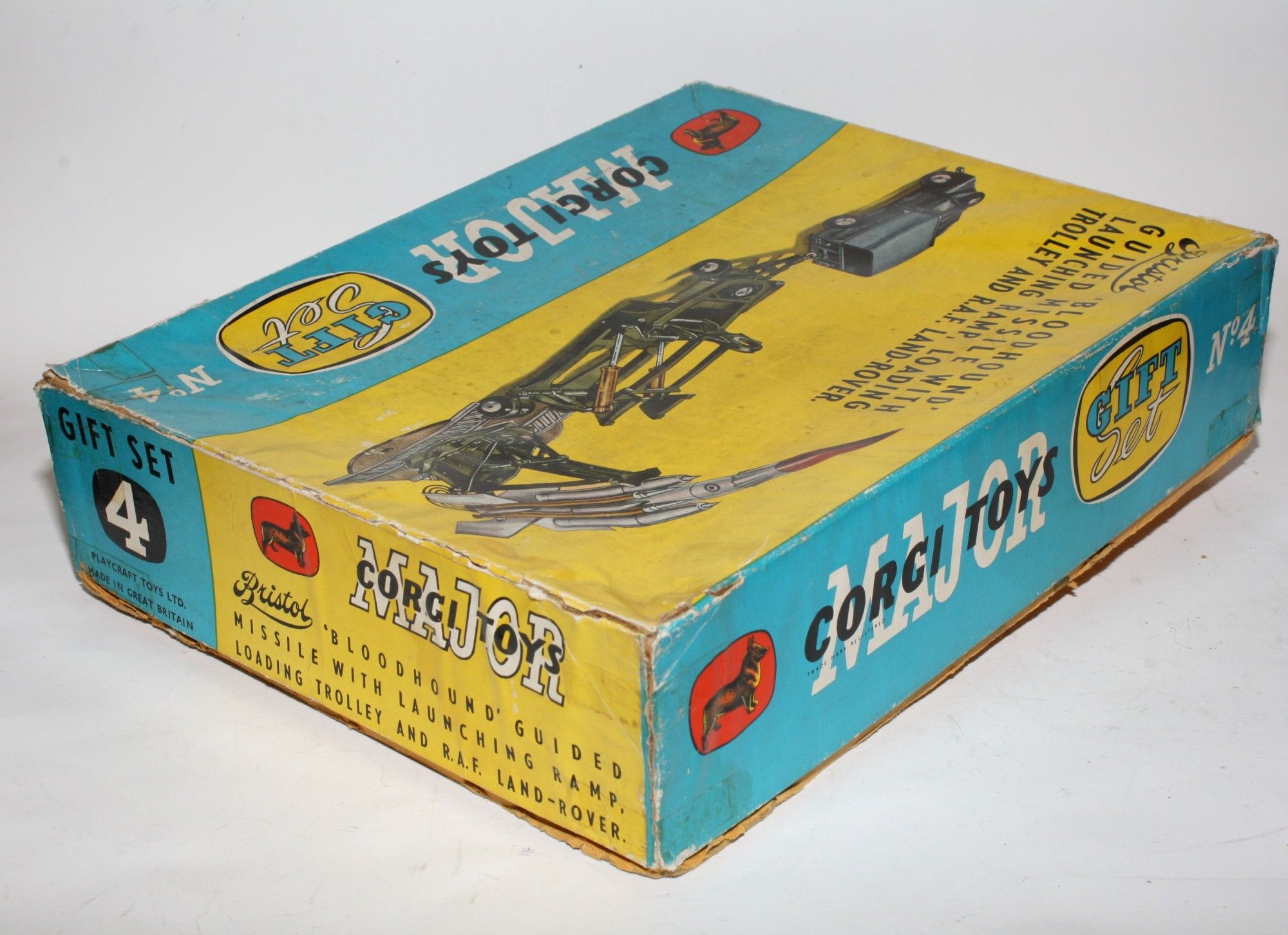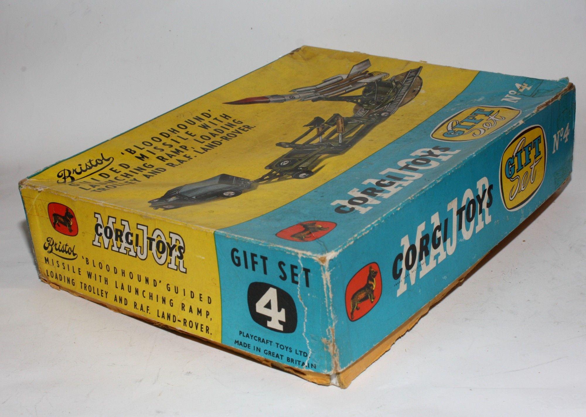 A nice example of this 1950's military Rocket Age Corgi gift set. Original paintwork on models is excellent, just a few small chips, mainly to missile, please study the photos for exact condition. Original tyres on smooth hubs, missile trolley with brass ram lifting mechanism working perfectly, good drawbar and pivot, Landrover is excellent with tin tilt and tin baseplate. Missile nose cone is good and with all four thrusters present.