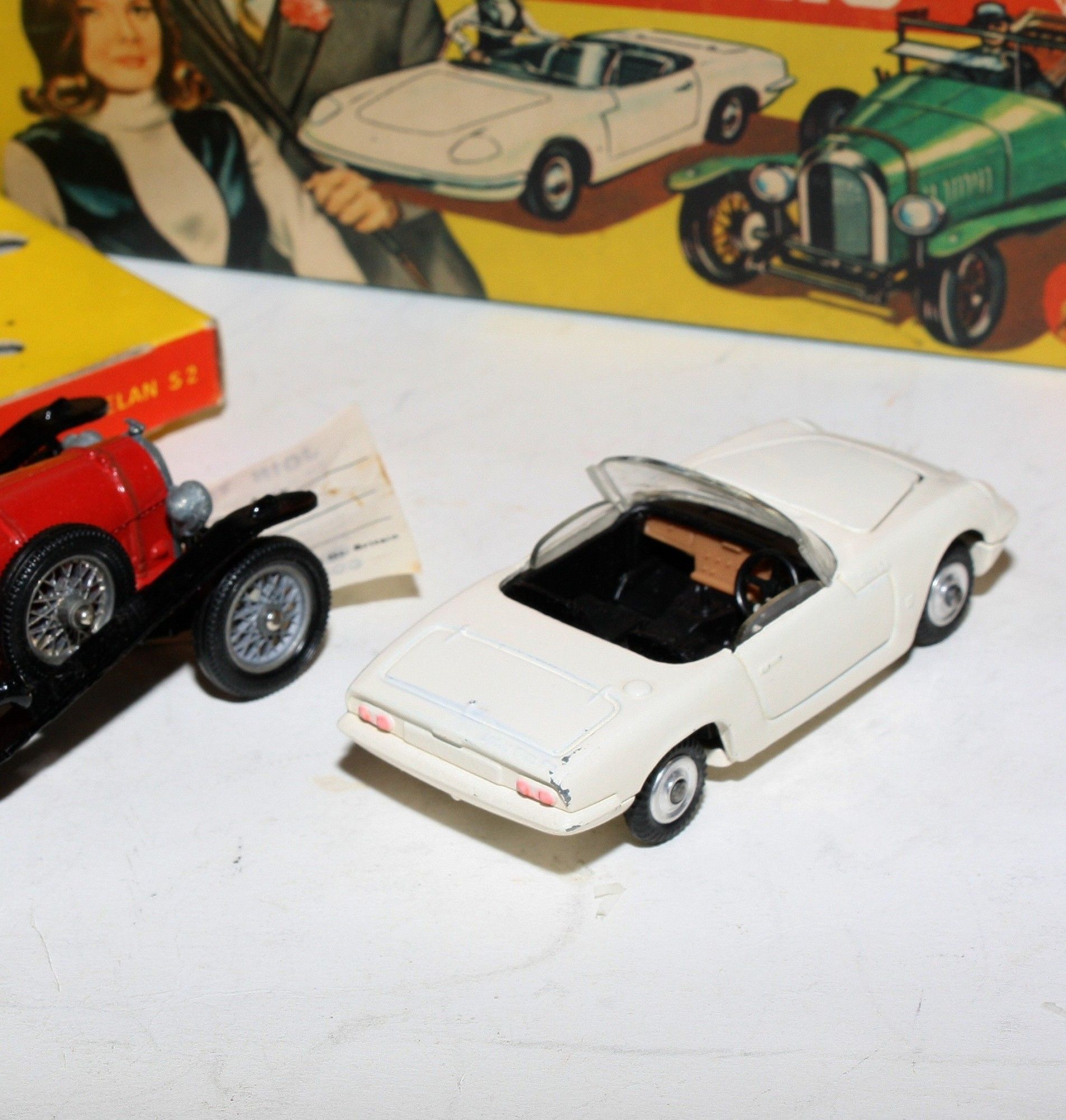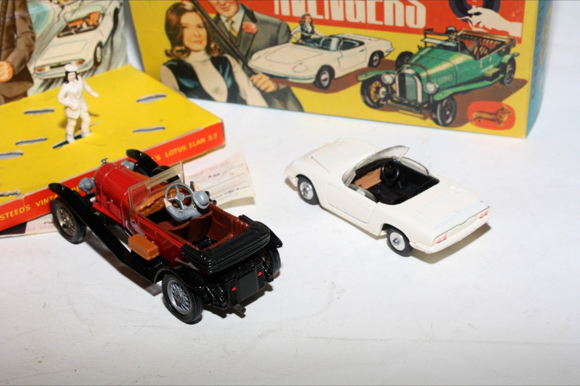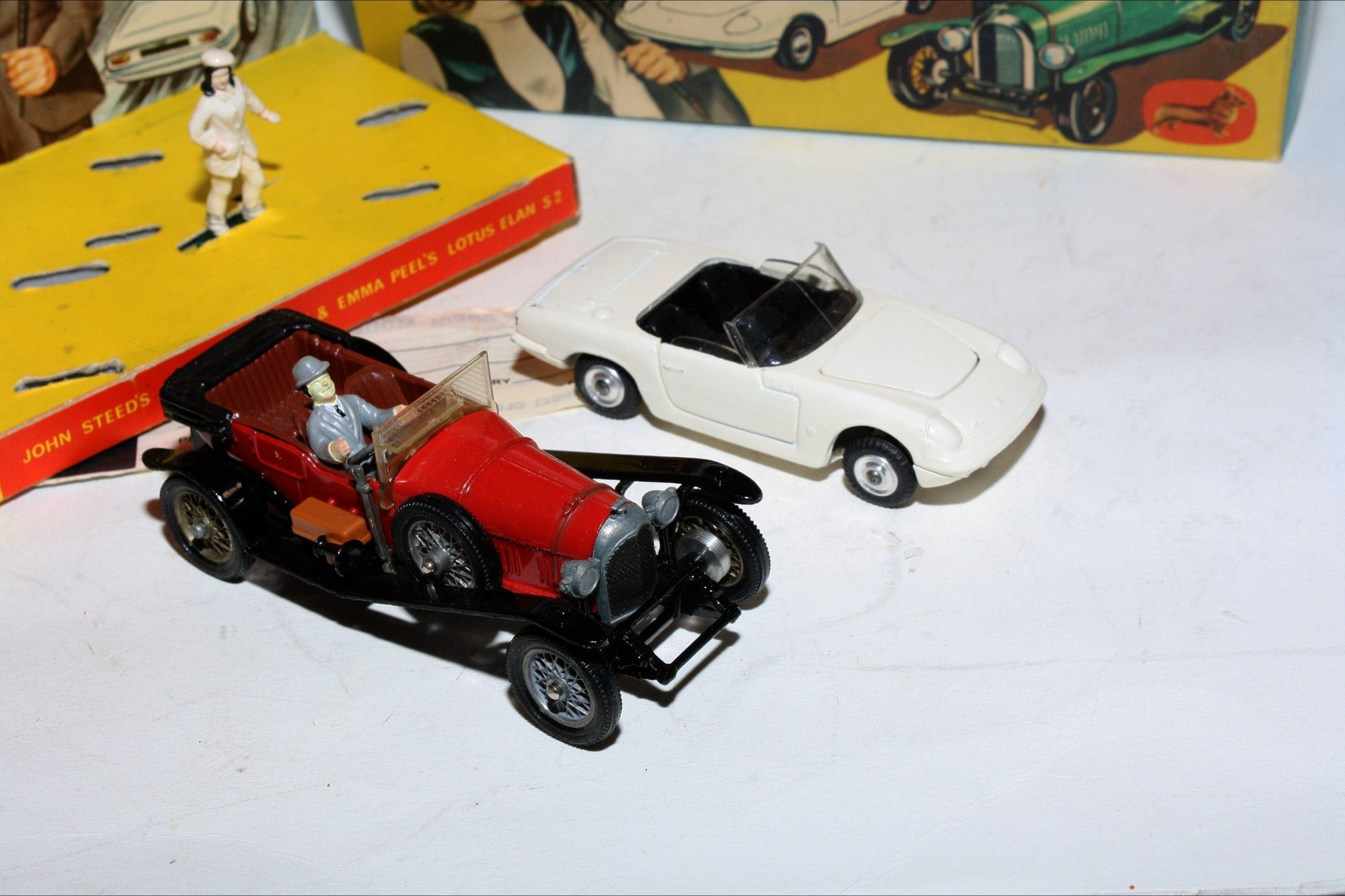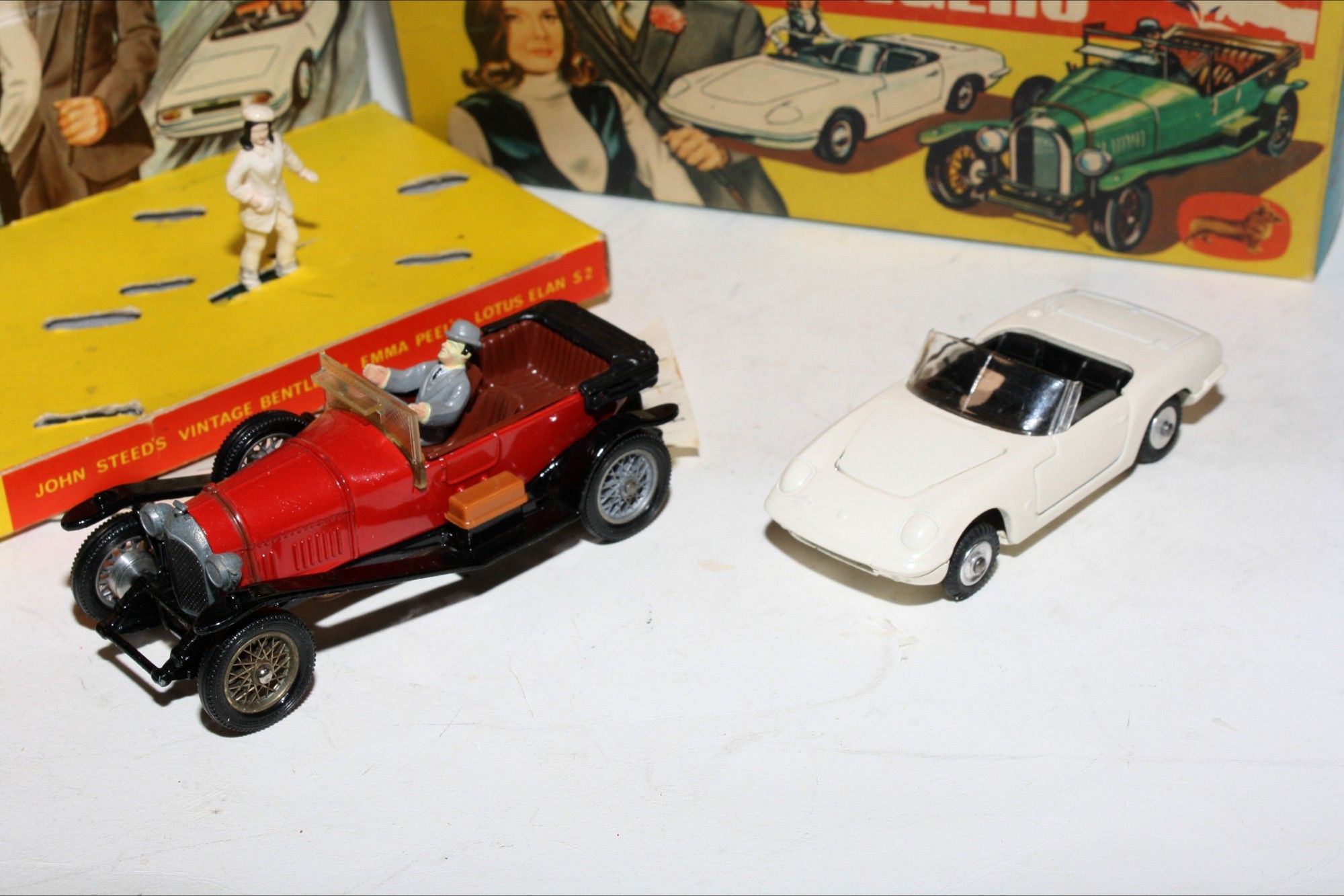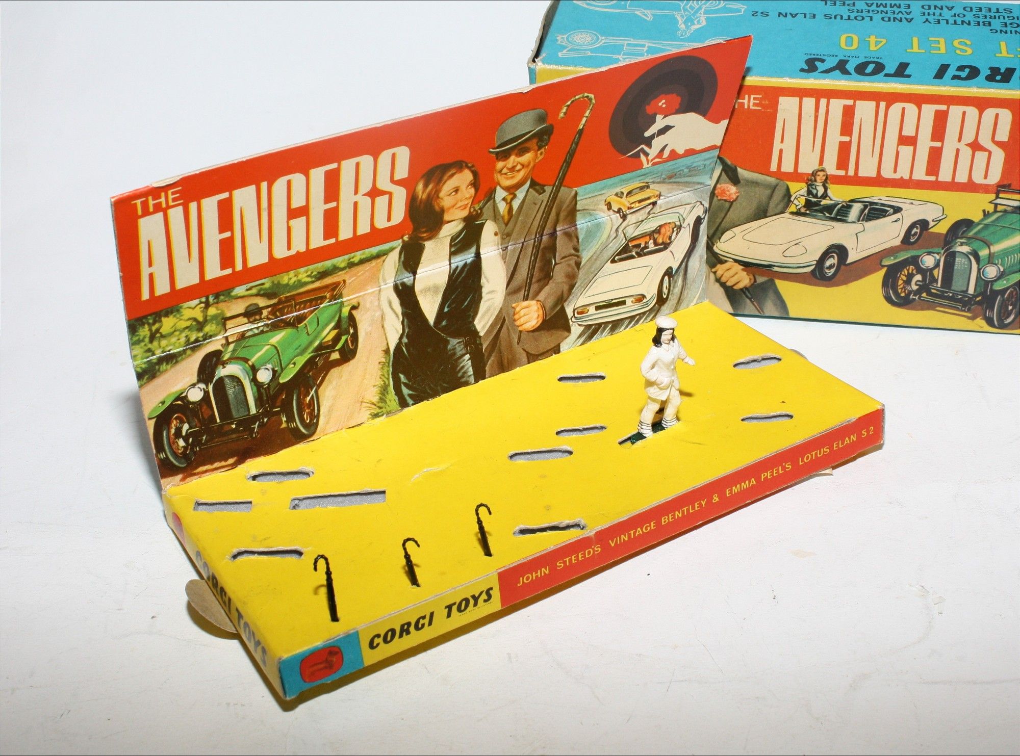 A superb example of this early issue Corgi model set from the 1960's TV series The Avengers. Excellent paintwork on both models, mint on the Bentley and a few tiny nicks on Elan, please study the photos for exact condition. All original tyres on spoked and spun hubs, (rare factory error to one hub) suspension great on Emma Peels Lotus, good windscreen and windows, original figures and perfect interiors, 3 x ORIGINAL umbrellas, baseplates excellent.