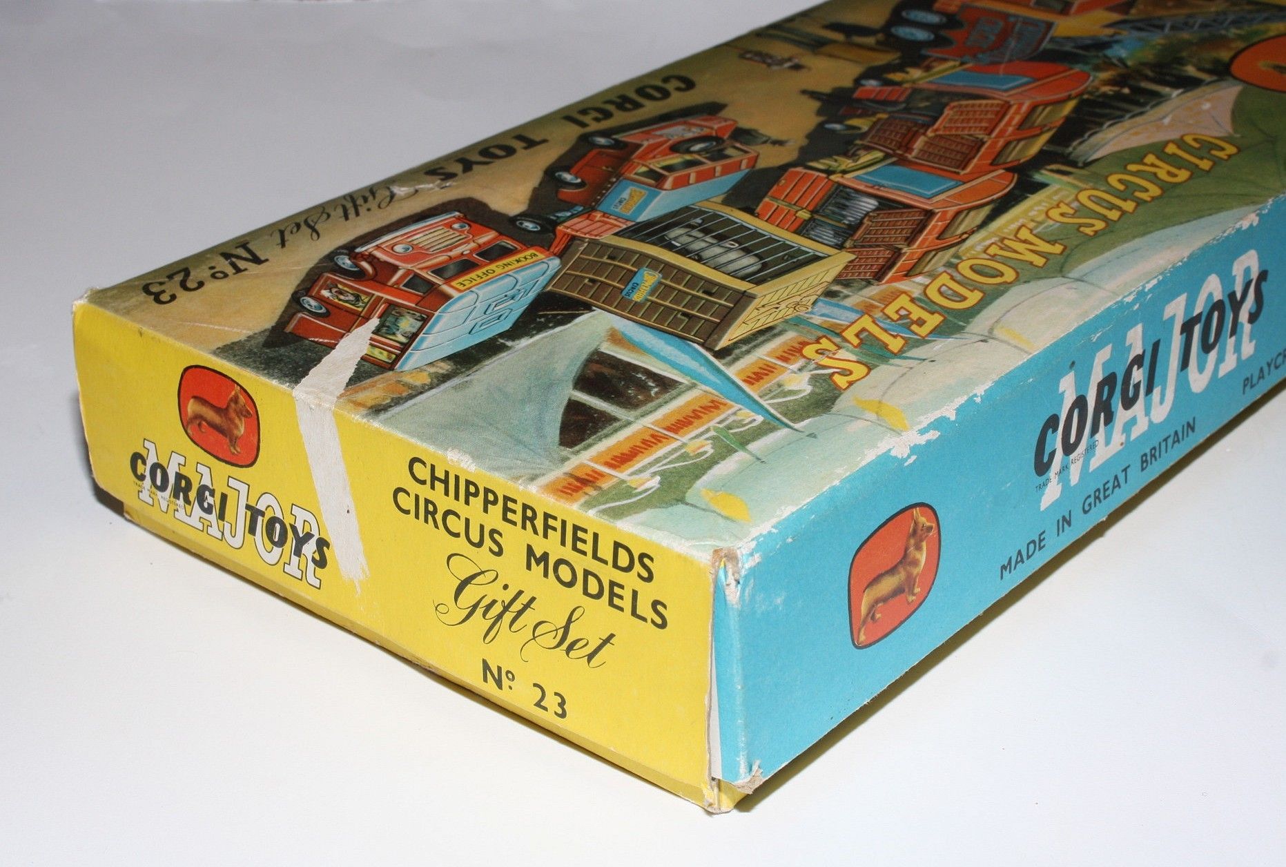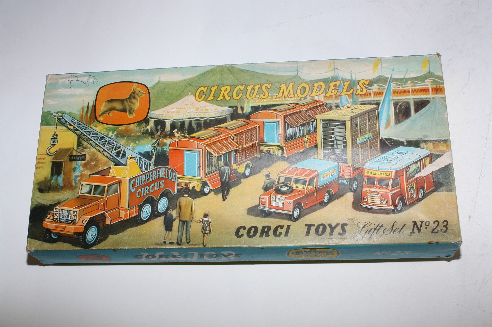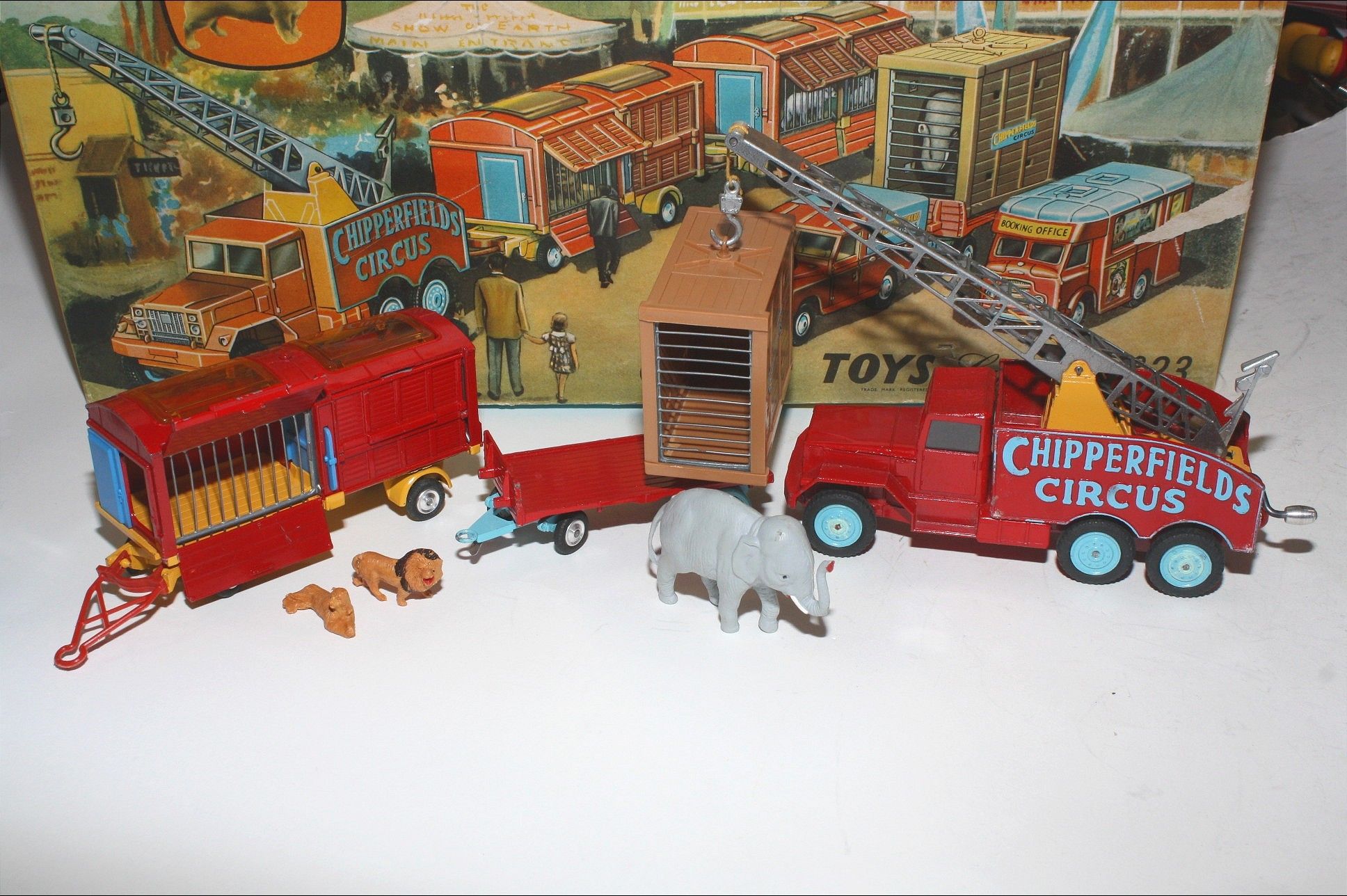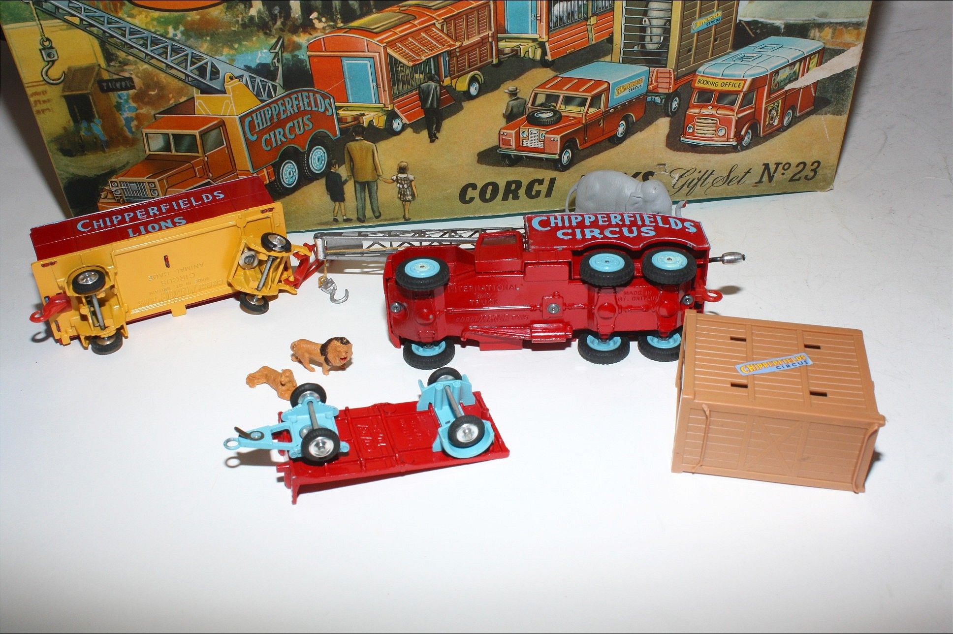 A superb example of this 2nd issue Corgi Chipperfields Circus models gift set from the-mid 1960's. Gleaming original paintwork is excellent on all models, just a few nicks, please study the photos for exact condition. Perfect cast and spun hubs with original tyres, perfect suspension, good windows, Crane in gwo with original cord and hook, ratchet intact, cage all perfect with good draw bar, dolly and dividers, polar bear figures and lion figures present. Giraffe truck all fine with mirrors and perfect plastic back and ramp plus original giraffe's. Land Rover superb with good plastic tilt, Elephant cage perfect with original hook loop (hard to find) with good trailer and elephant. undersides near mint, very hard to find in this condition.
