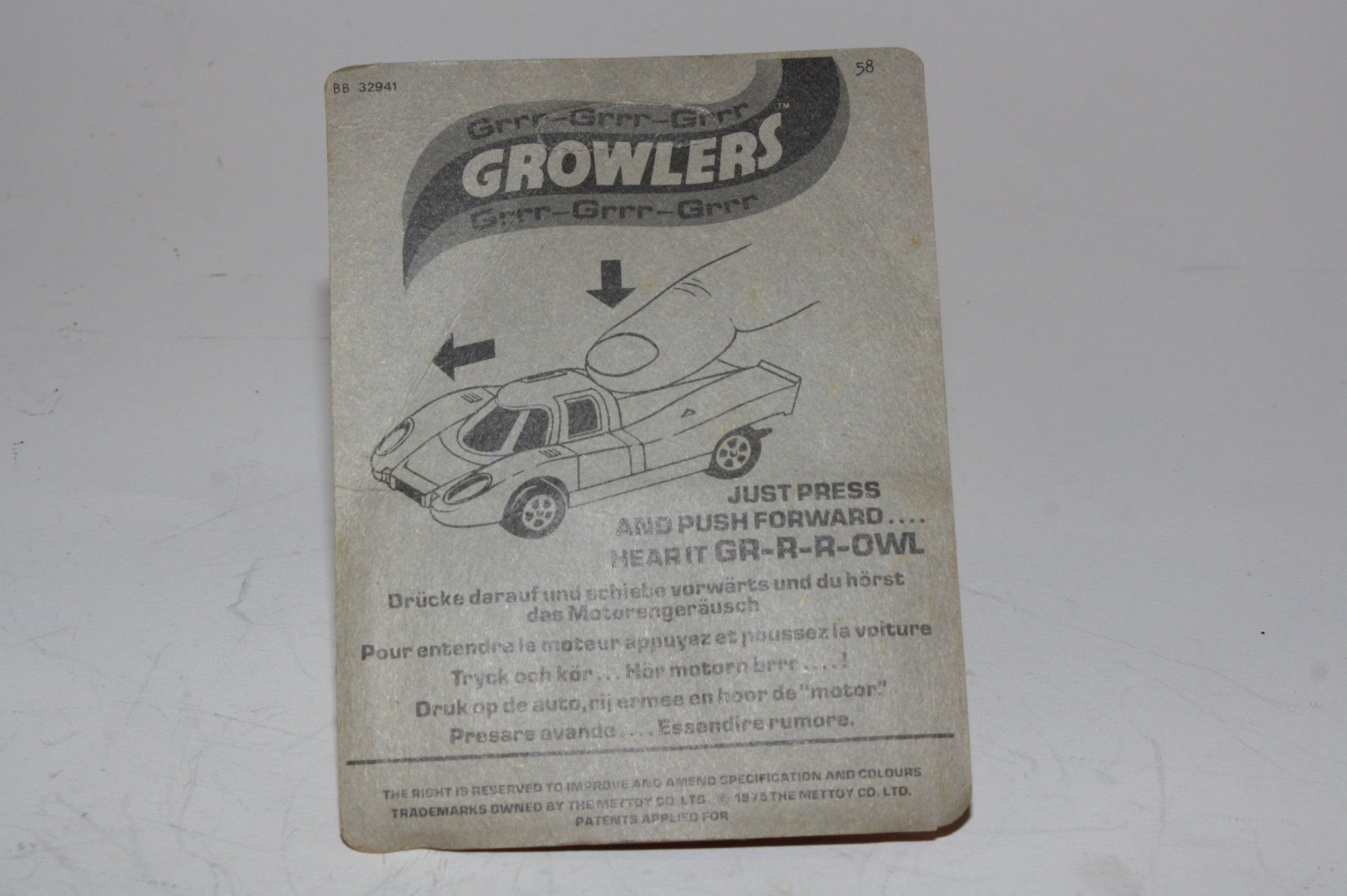 To compete with novelty ranges such as Rola-Matics, Corgi needed to introduce a gimmick that could be incorporated into the Juniors line at no extra cost to the purchaser. And so the Growlers sub-series was released in 1975, numbered amongst the regular Corgi Juniors models. Growlers were billed in adverts as being ‘Corgi Juniors with sound’. Which was true – they did have sound effects – although whether those sounds were convincing is another matter!The way Growlers worked was with a fifth wheel added to the plastic base. This toothed wheel interacted with a plastic prong moulded into the underside which produced a ‘clicking’ sound. It was a very simple gimmick, and was similar to the way young boys used to put a strip of cardboard in their bicycle spokes to make a sound supposedly like a motorbike. The fifth wheel was mounted slightly higher than the other wheels, and the model had to be pushed down on its suspension in order engage the ‘growling’ mechanism. When the vehicle was not pressed downwards, it would roll along normally on its Whizzwheels. The instructions on the packaging read, ‘JUST PRESS AND PUSH FORWARD… HEAR THEM GR-R-R-OWL!’ indicating that the sound was similar to the roar of an engine. In reality, it was more of a ‘clicking’ sound that became more of a ‘buzz’ the faster the vehicle was pushed.