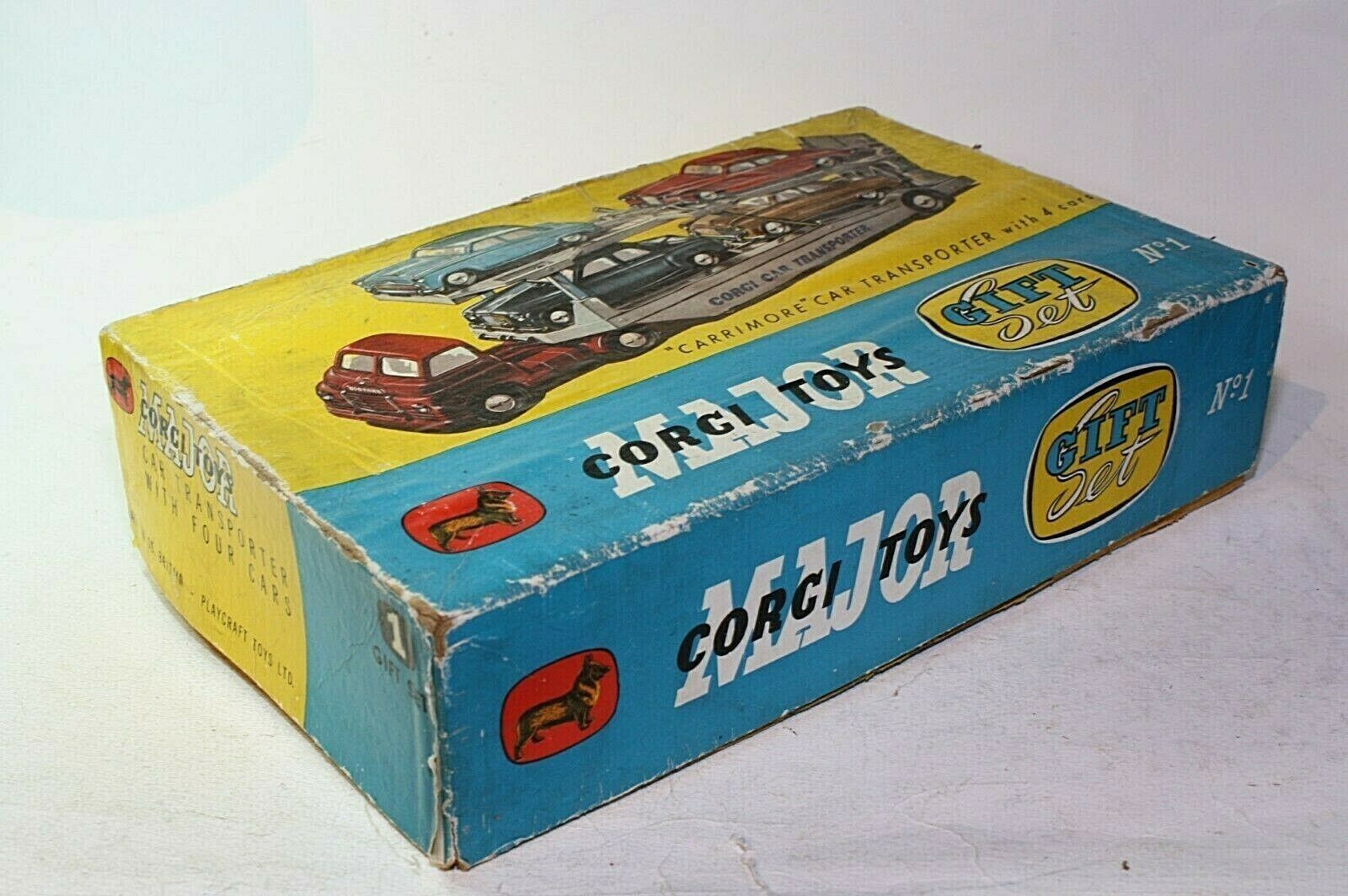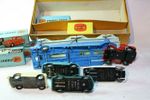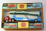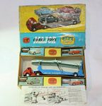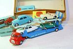 Carrimore Transporter. Original red and blue paintwork is excellent with just a few small chips, please study the photos for exact condition. Perfect original tyres on smooth hubs with free rolling straight axles. Perfect 2 function ramp with tailgate, all original decals in great condition, complete working winch with original cord and plastic hooks. Very good underside