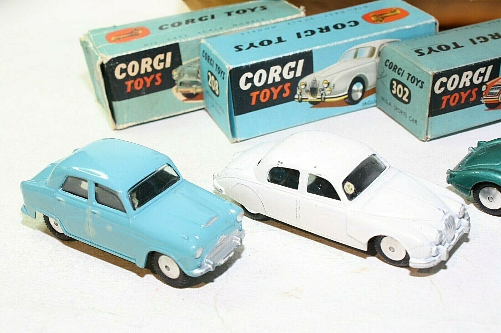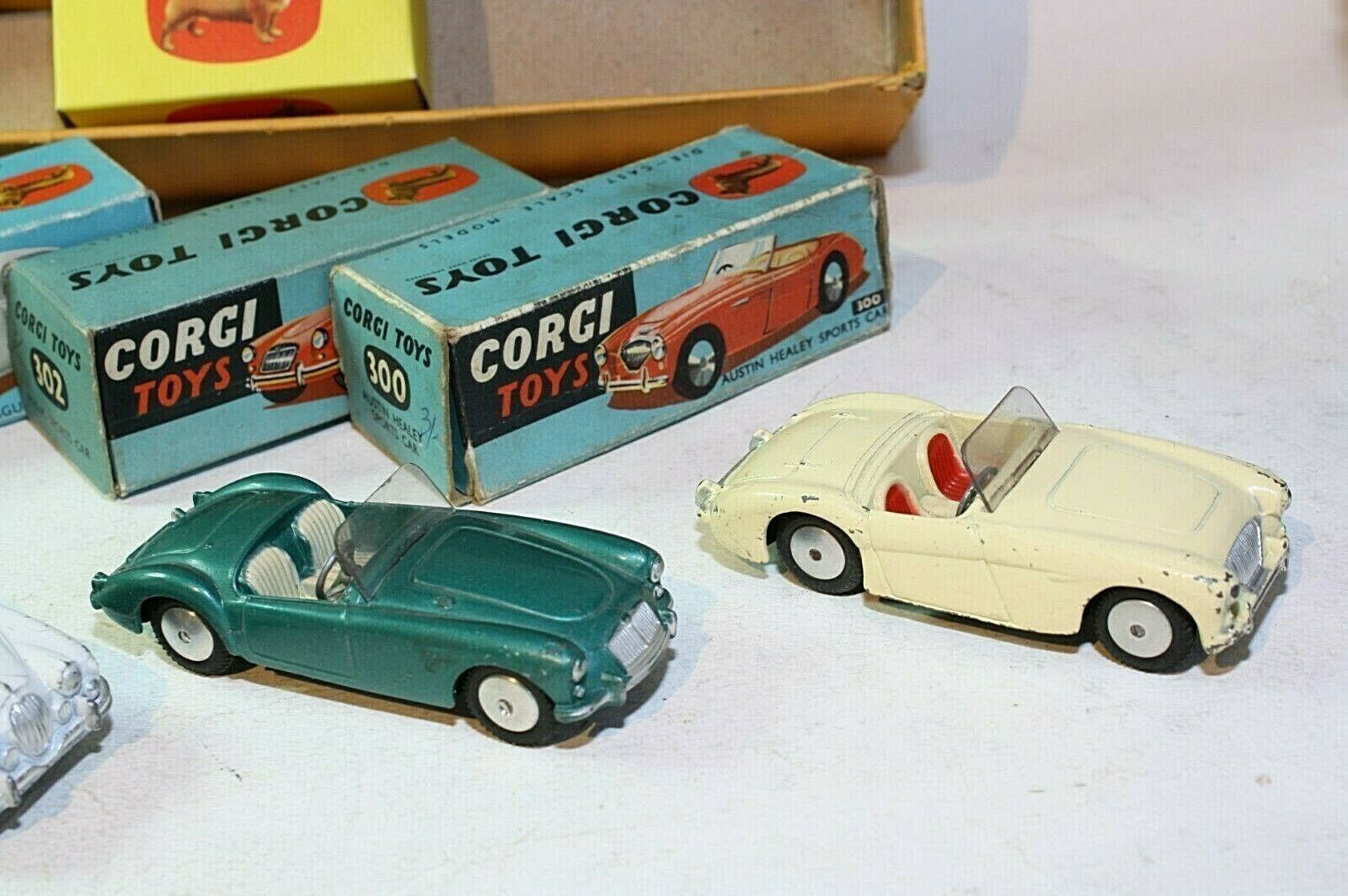302 MGA. Excellent original paintwork with just a couple of small chips, all original tyres on smooth hubs. Perfect original windscreen. Original box is all complete and in very good condition, nice and firm with minor rubs to edges.