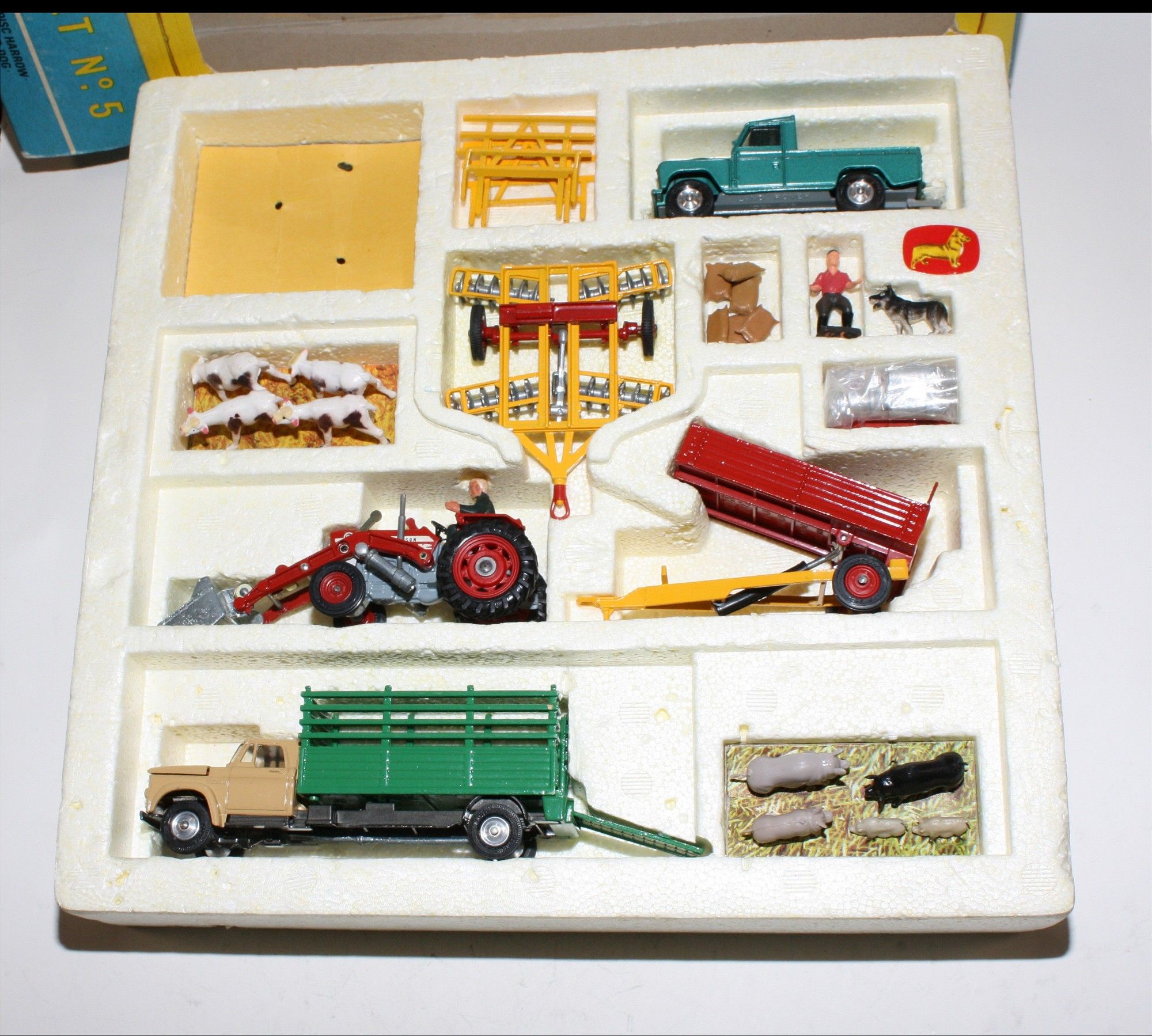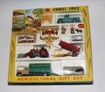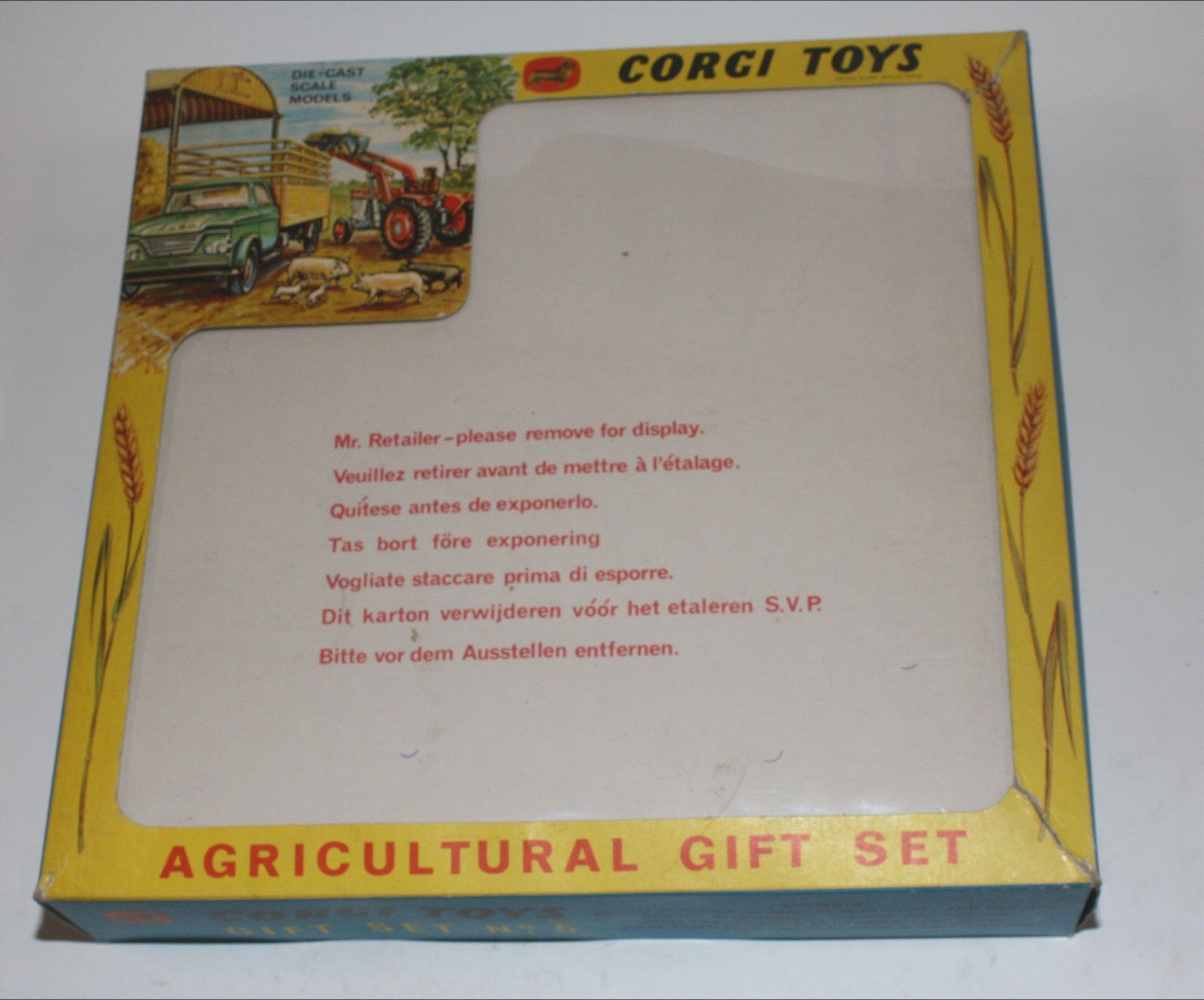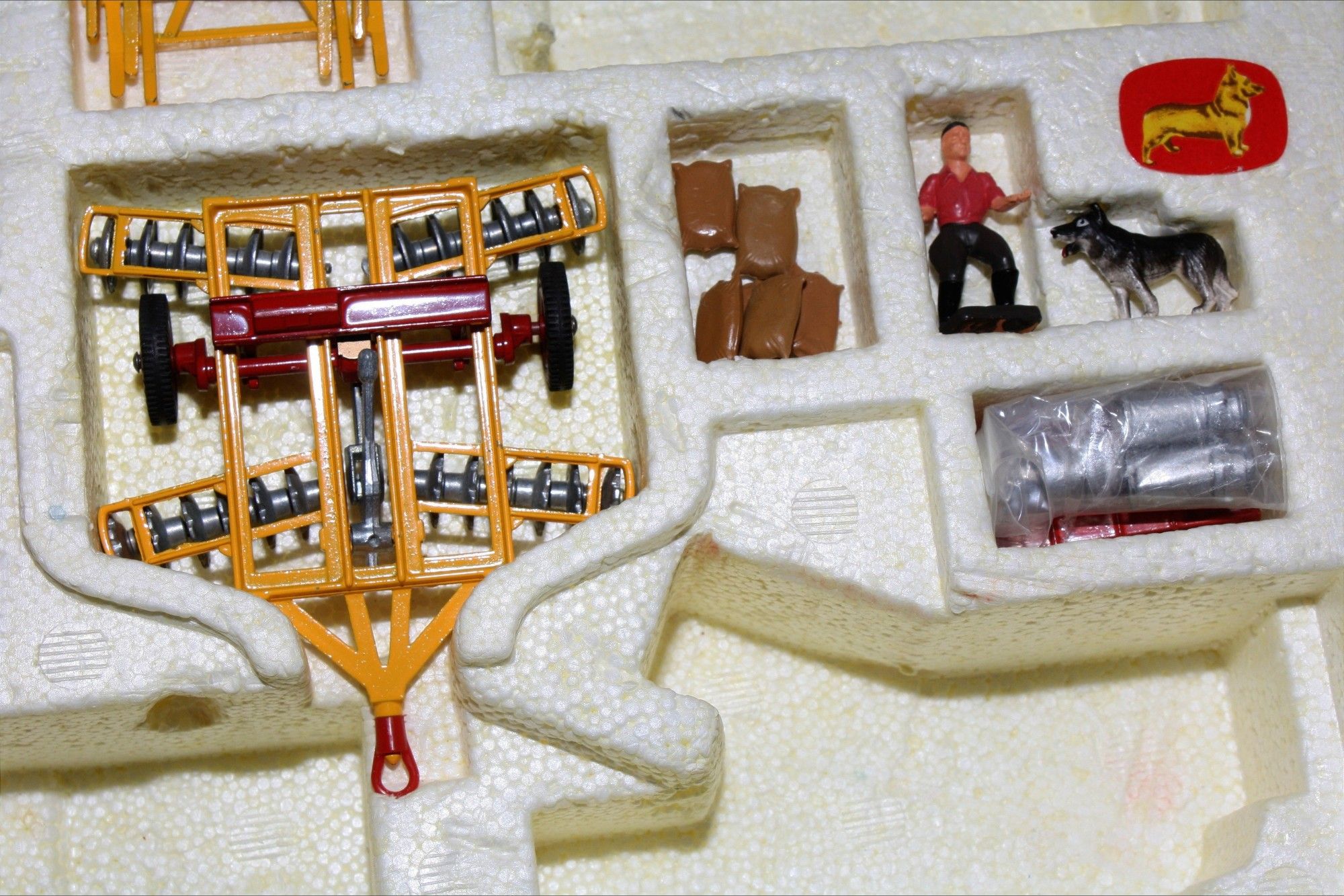 A superb example of this hard to find Corgi "Agricultural" model set. Gleaming original paintwork on all models is virtually mint, please study the photos for exact condition. Comprising of Massey Ferguson 165 tractor,with shoval,Tandem Disc Harrow, Tipping Trailer with raves, Land Rover finished in metallic green, lemon interior and spun hubs, Dodge Truck. Animals all present on card bases, farm hand figure and dog, original sacks and churns, a beautiful and complete set that appears unplayed with.