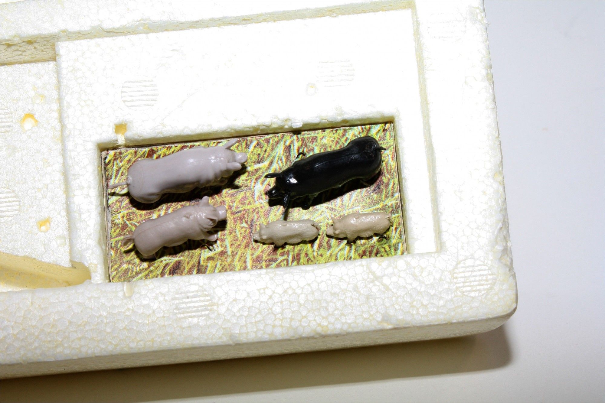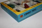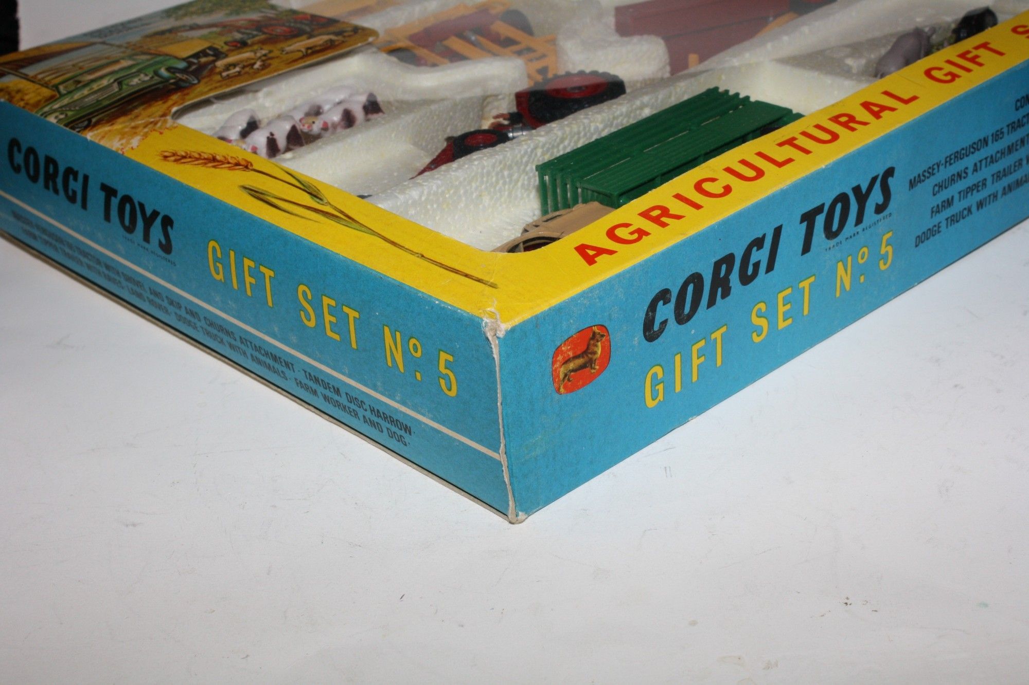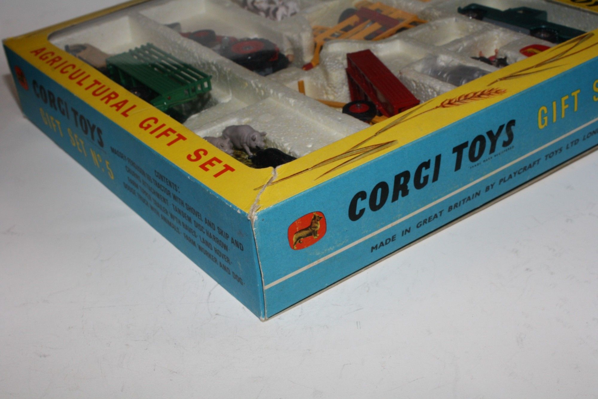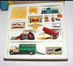 A superb example of this hard to find Corgi "Agricultural" model set. Gleaming original paintwork on all models is virtually mint, please study the photos for exact condition. Comprising of Massey Ferguson 165 tractor,with shoval,Tandem Disc Harrow, Tipping Trailer with raves, Land Rover finished in metallic green, lemon interior and spun hubs, Dodge Truck. Animals all present on card bases, farm hand figure and dog, original sacks and churns, a beautiful and complete set that appears unplayed with.