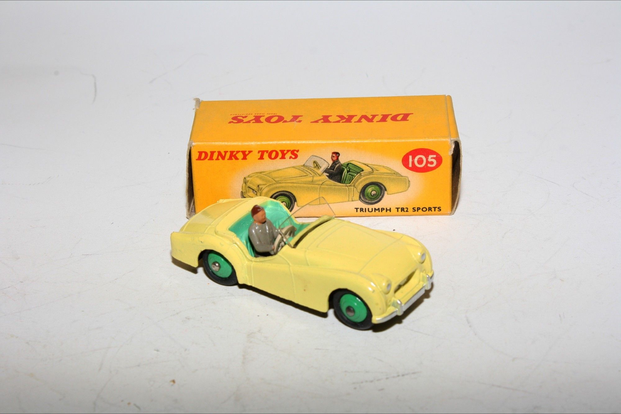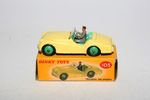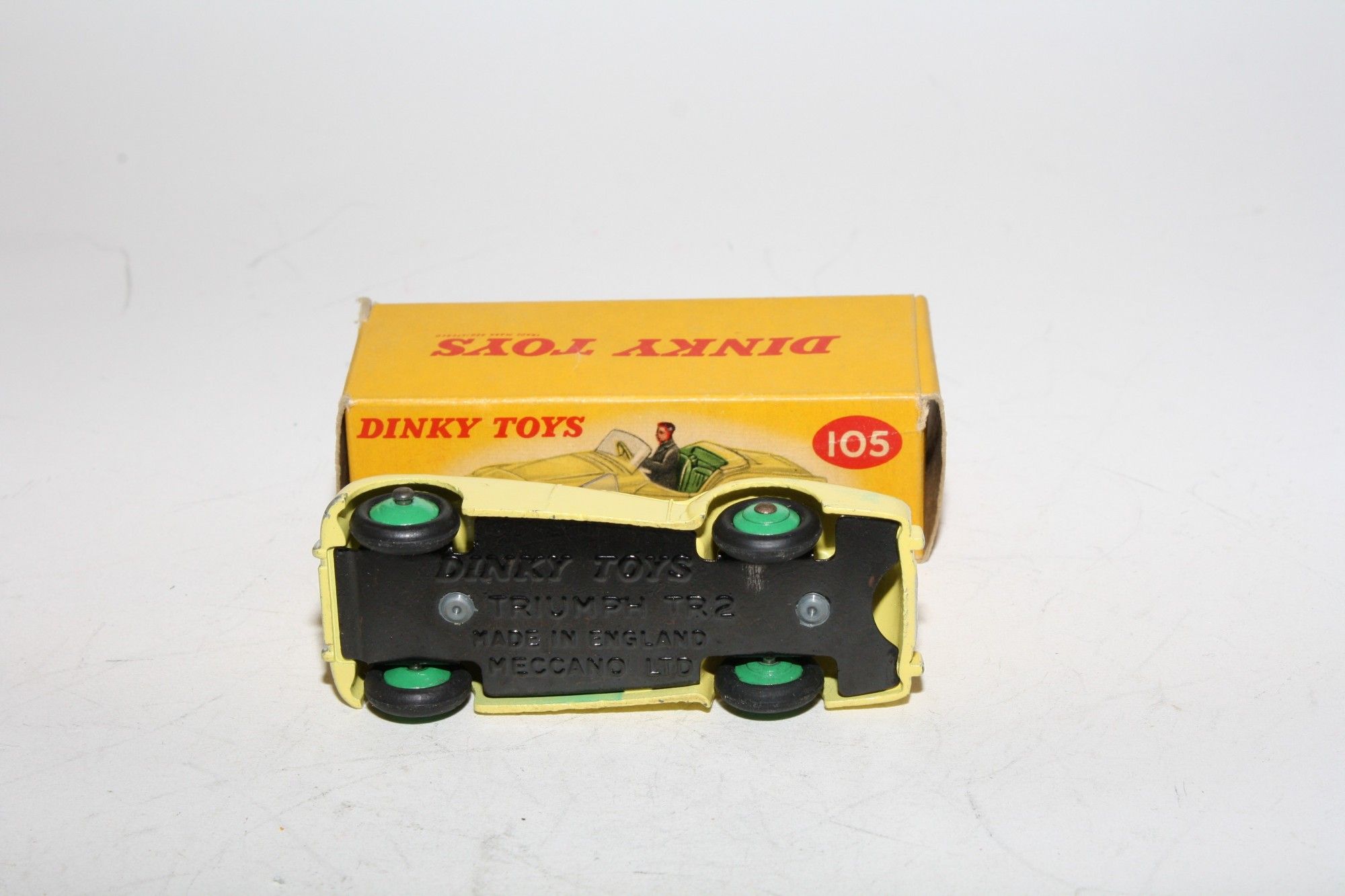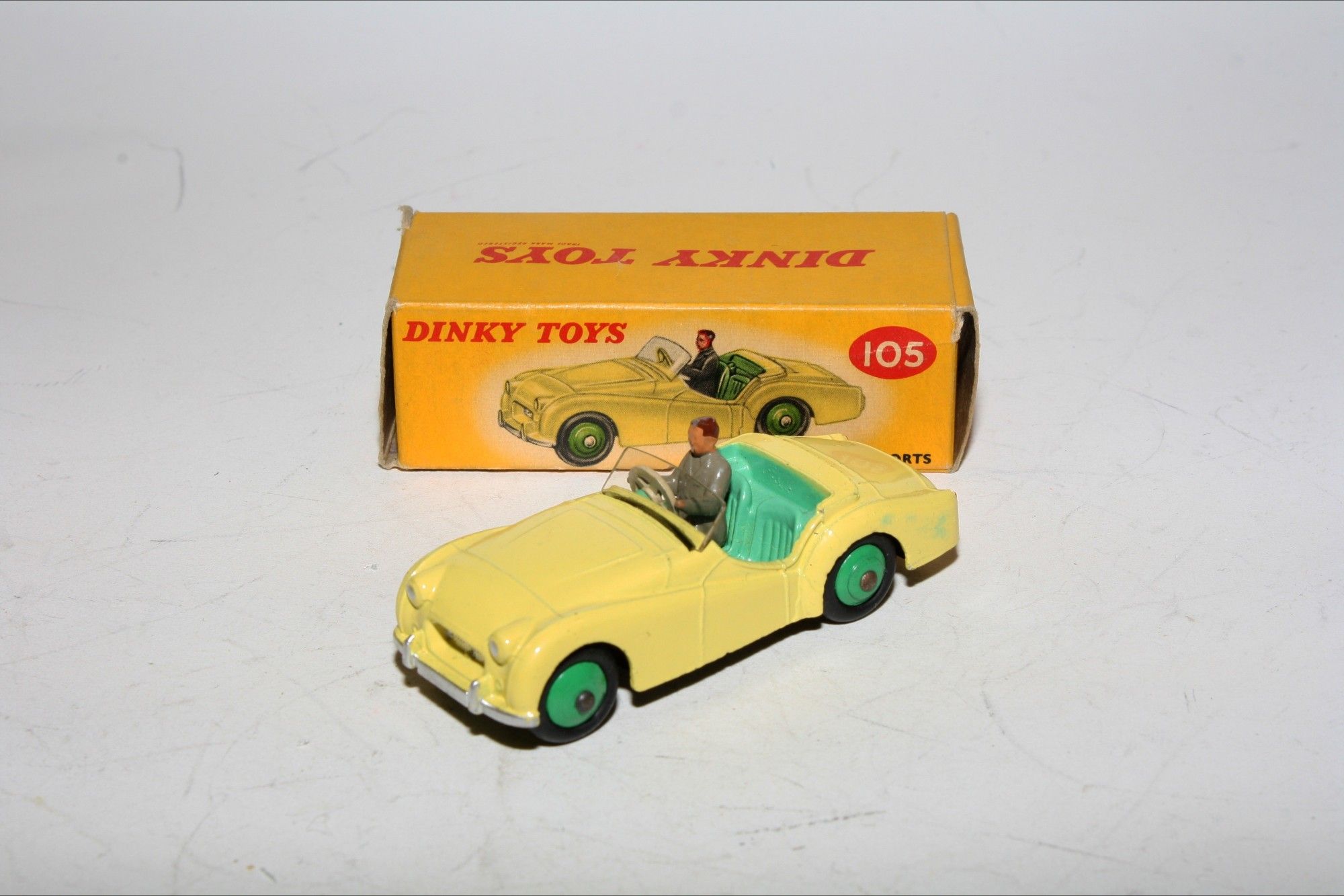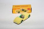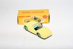 A superb original example of this 1950's Dinky. Part of a wonderful collection recently acquired from a client in Italy. Scarce colour variation. Gleaming original yellow paintwork, pale green interior and mid green hubs is near mint with a few fleabites, please study the photos for exact condition. Perfect original tyres on ridged hubs, straight axles, crystal clear original windscreen, perfect grey driver and ivory steering wheel with mint tin baseplate.