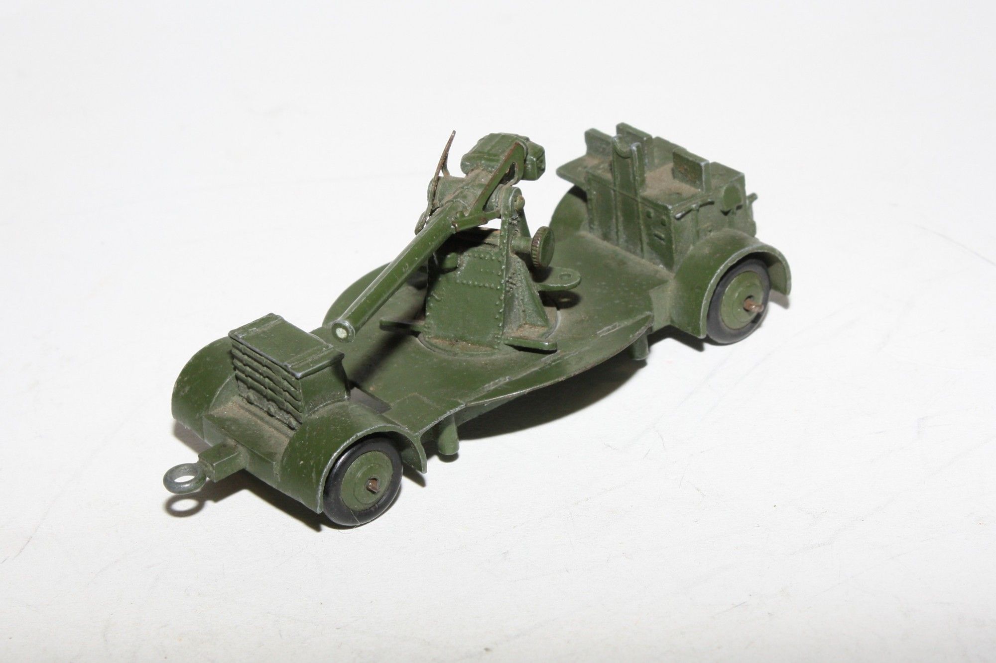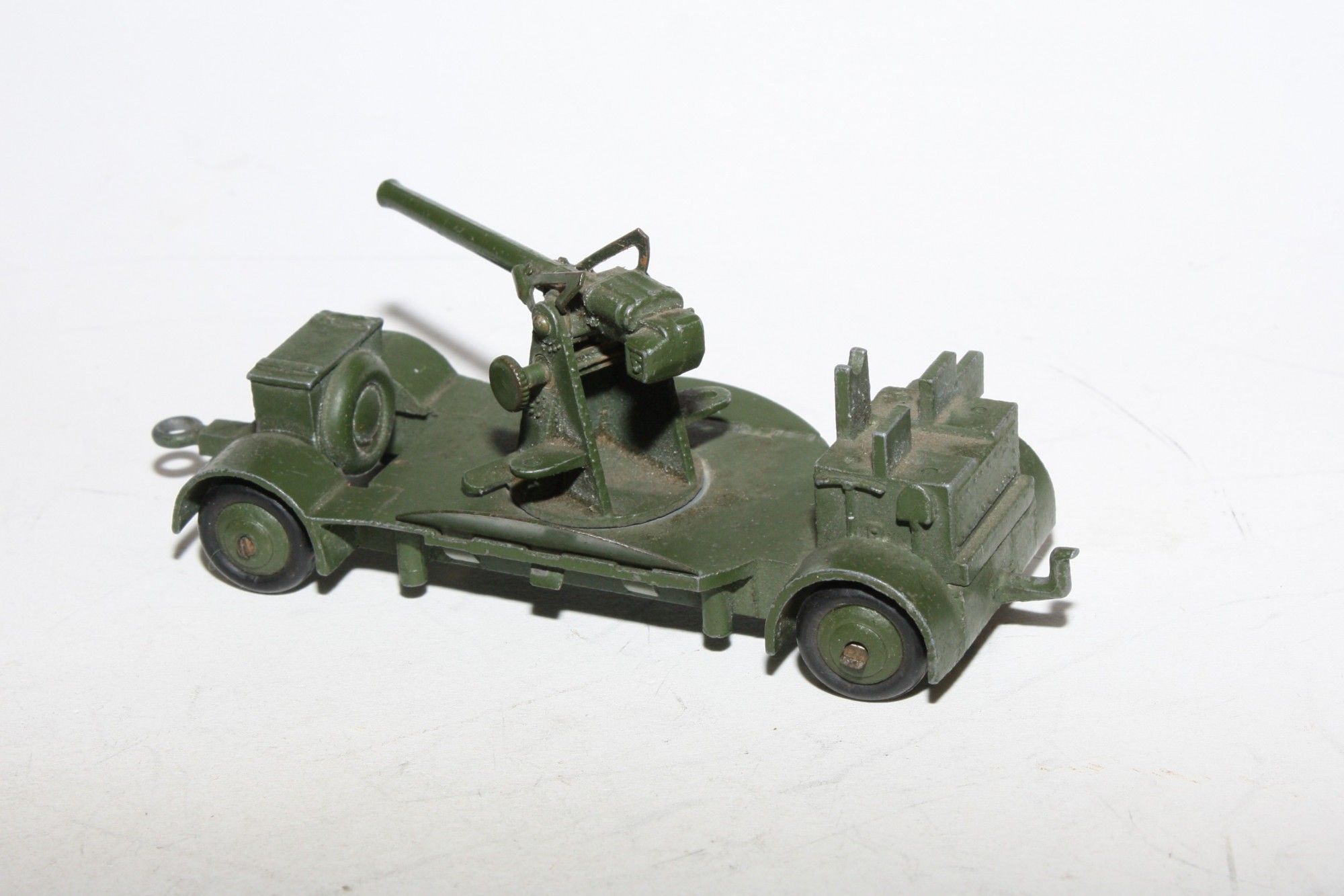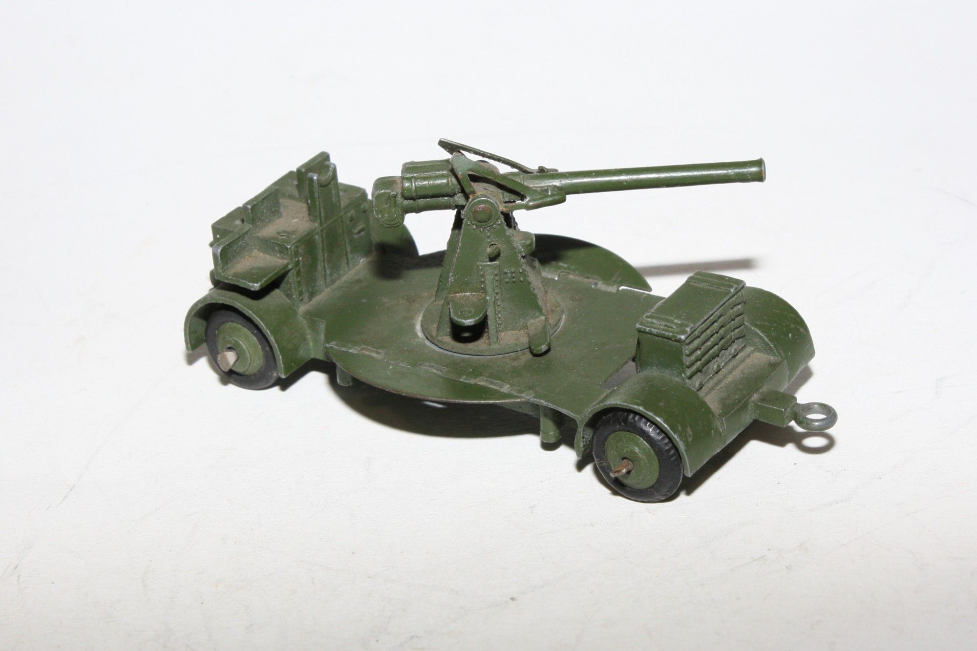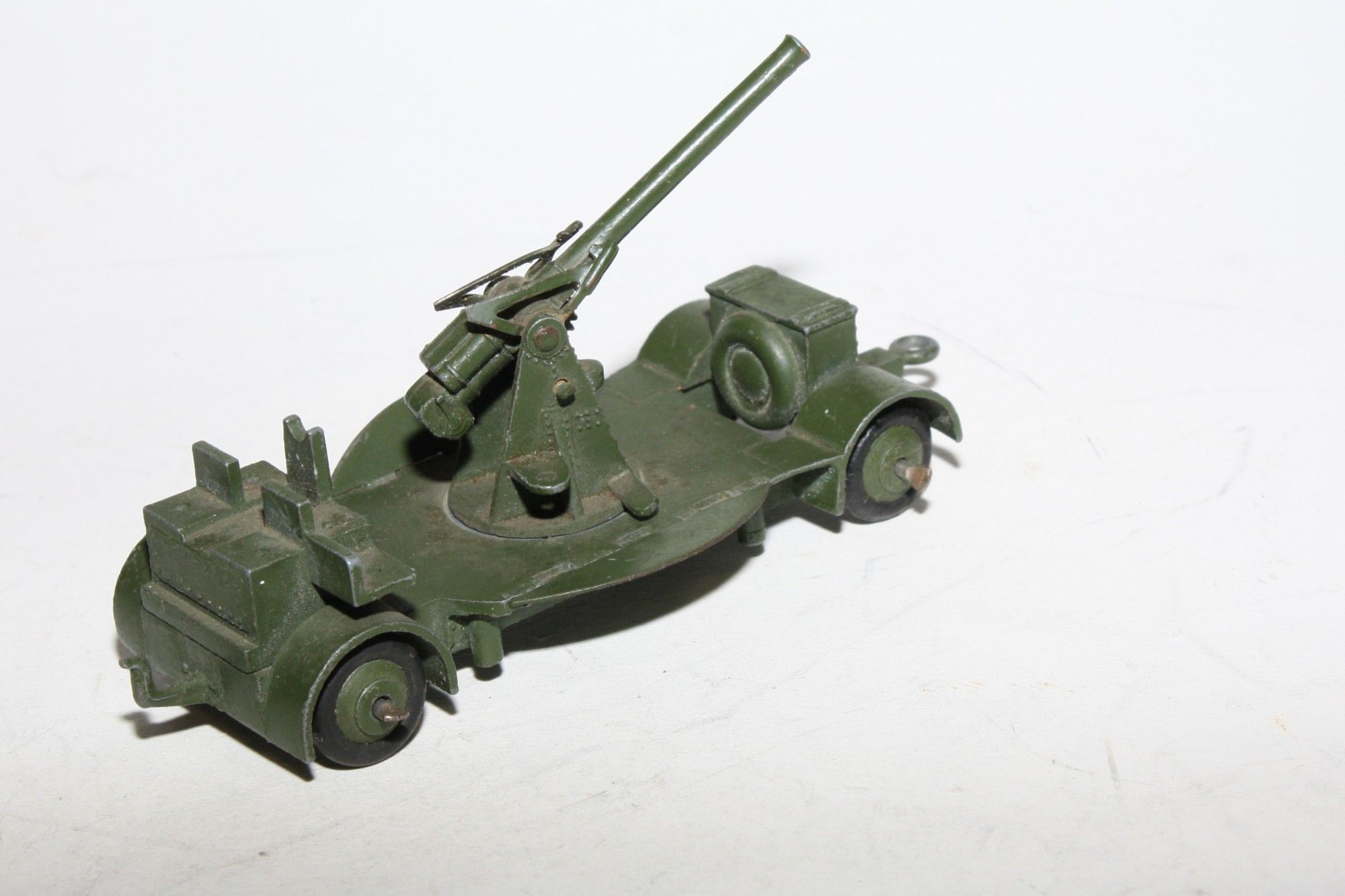 A nice example of this early post war model. Original paint is excellent, would benefit from cleaning, please study the photos for exact condition. Original tyres (hardened) on ridges hubs, free rolling axles, folding foot plats present and good, gun adjuster all ok, tow eye and tow hook both present. Underside very good.