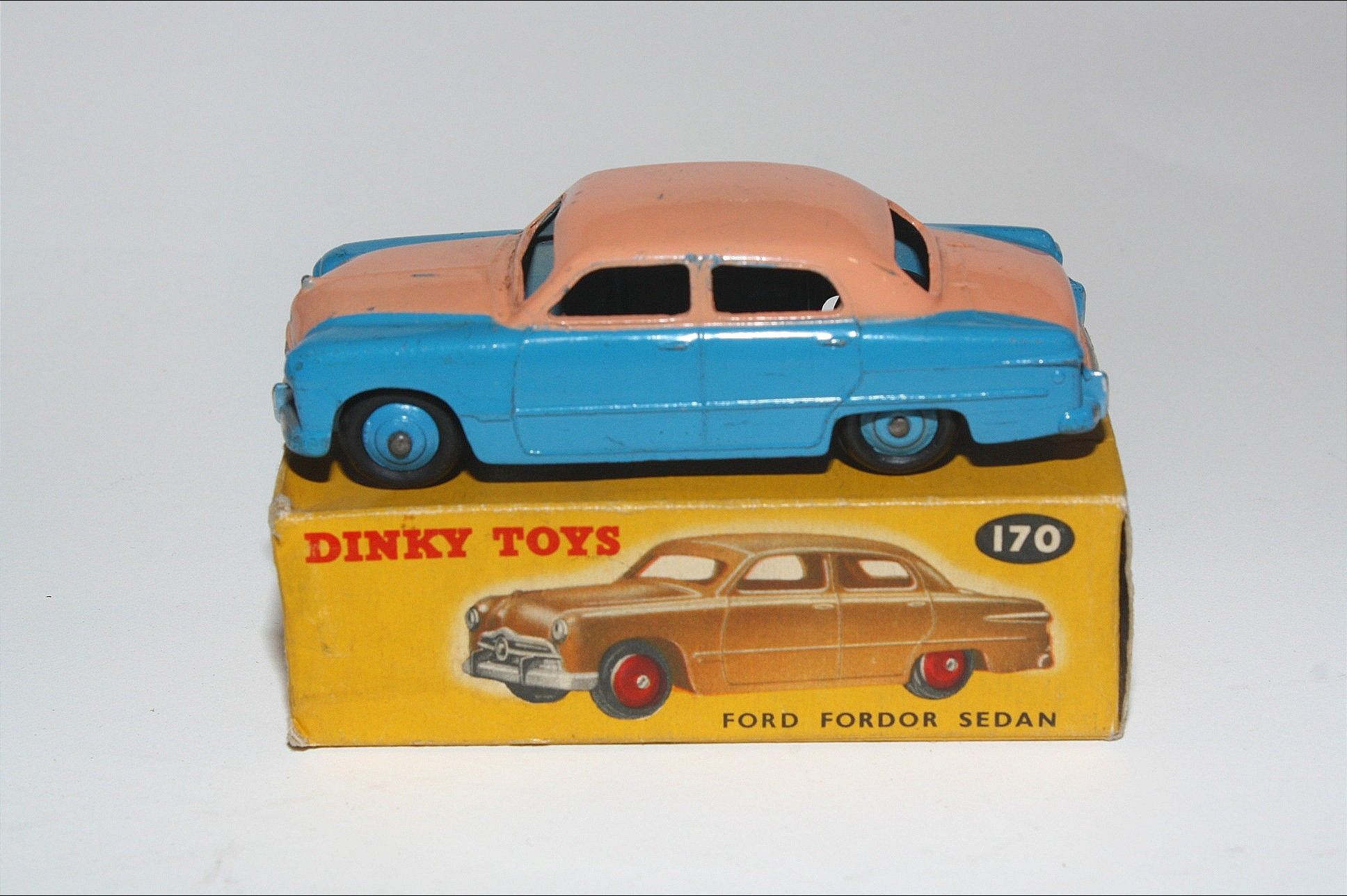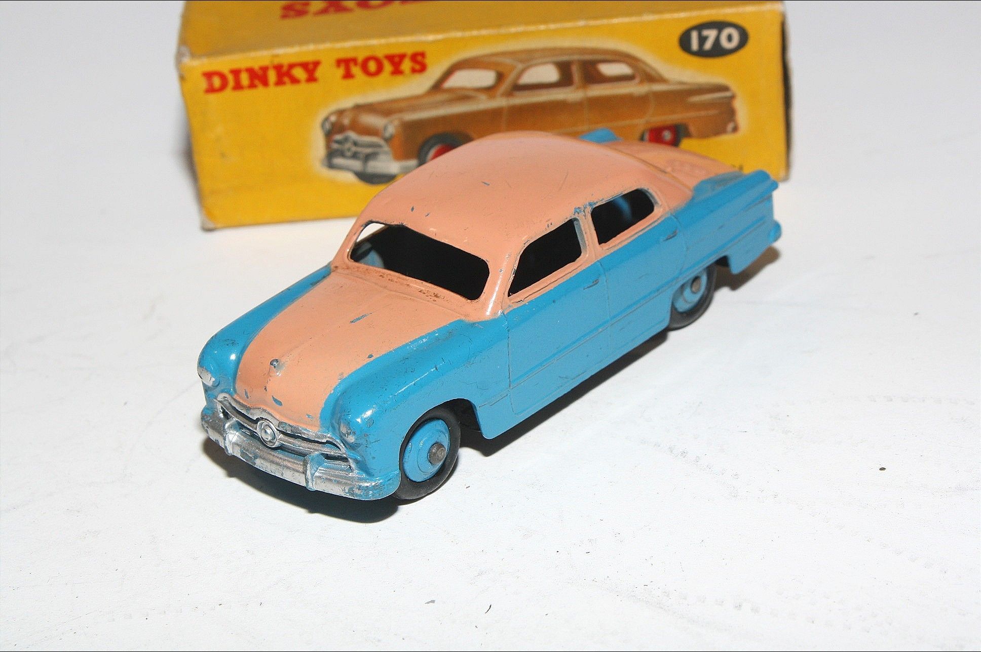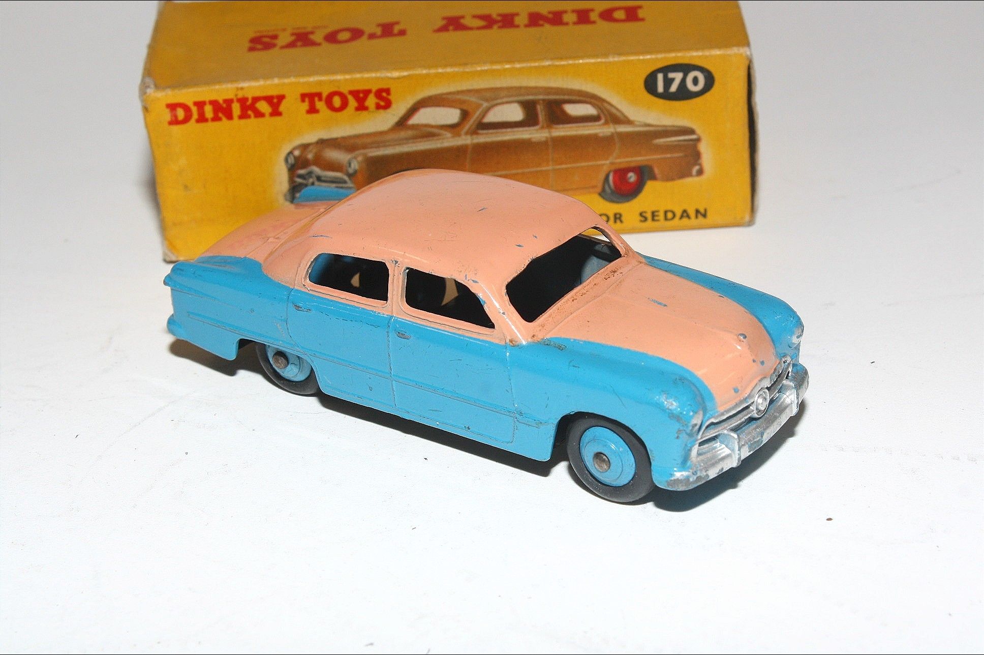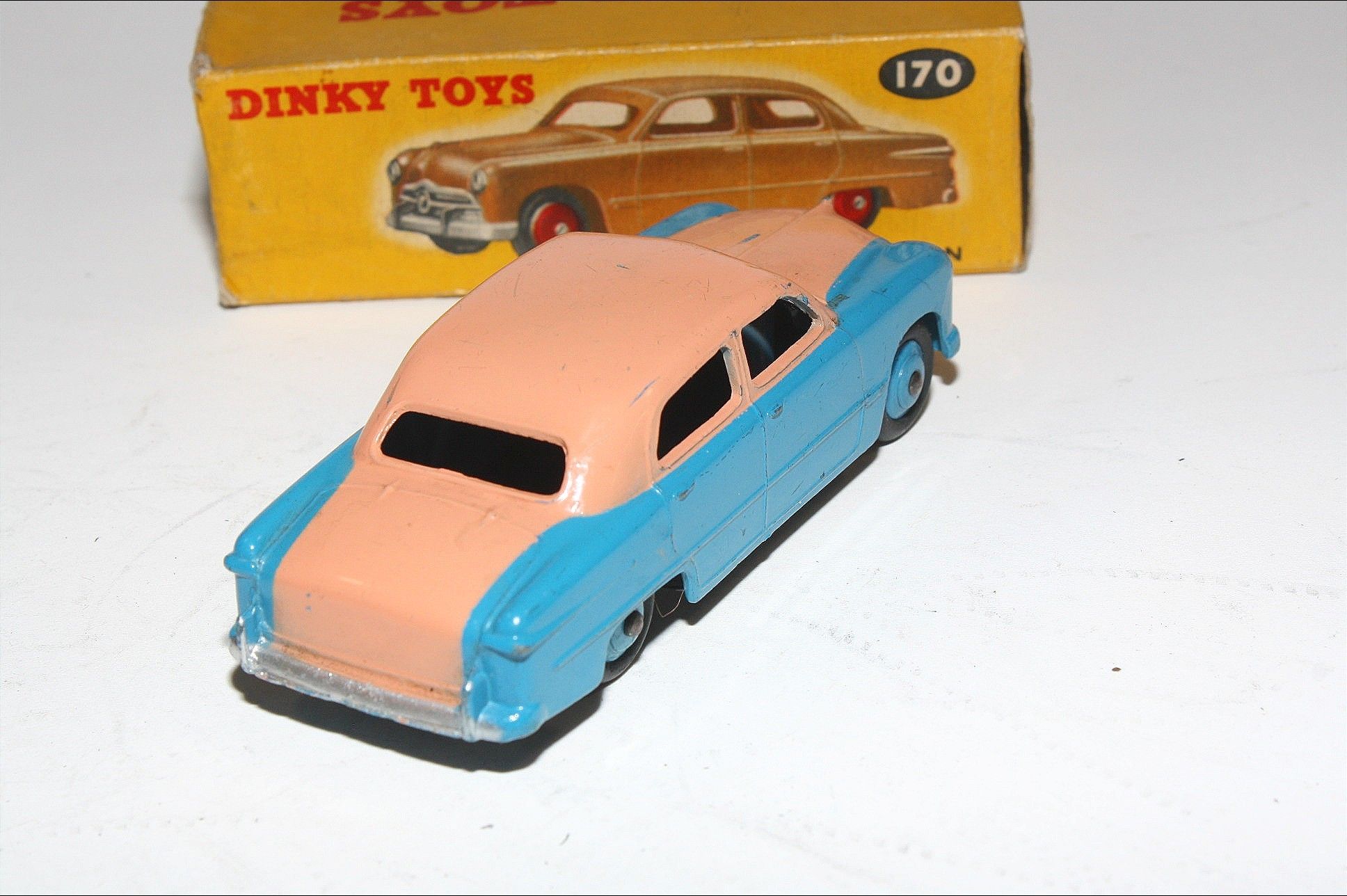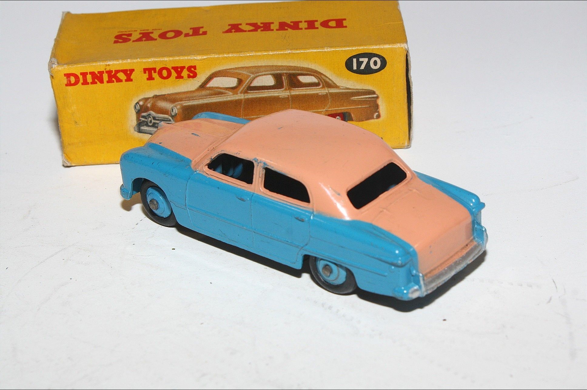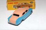 A superb example of this 1950's Dinky model. Gleaming scarce original pink over blue paintwork combo is excellent with just a few very small chips, please study the photos for exact condition. Original tyres all present and good with mid blue ridged hubs with straight axles. Mint underside.