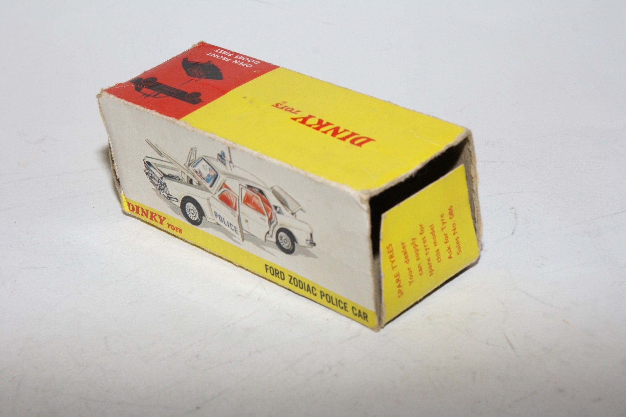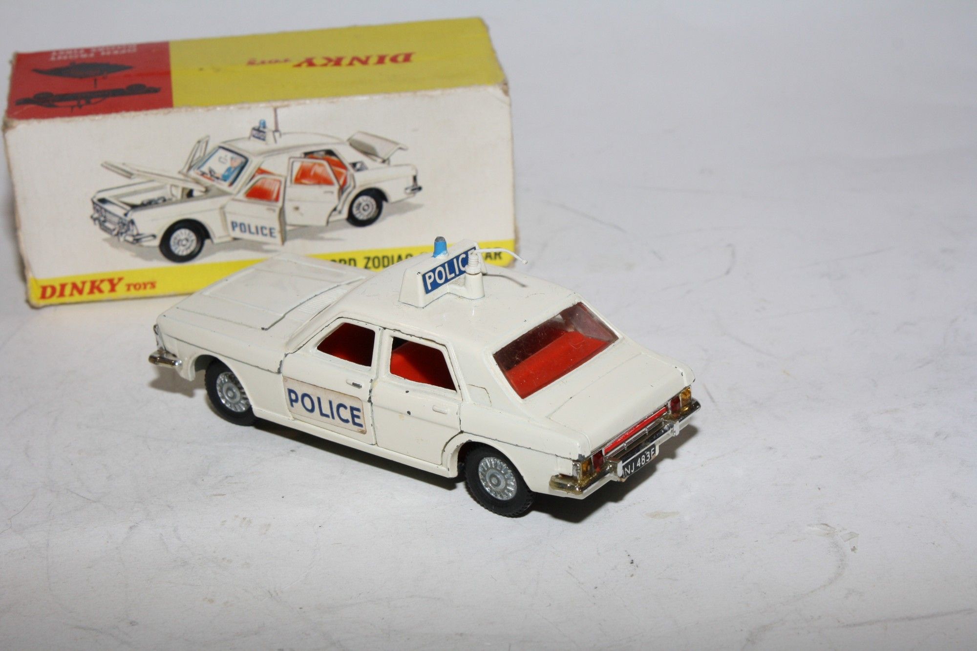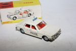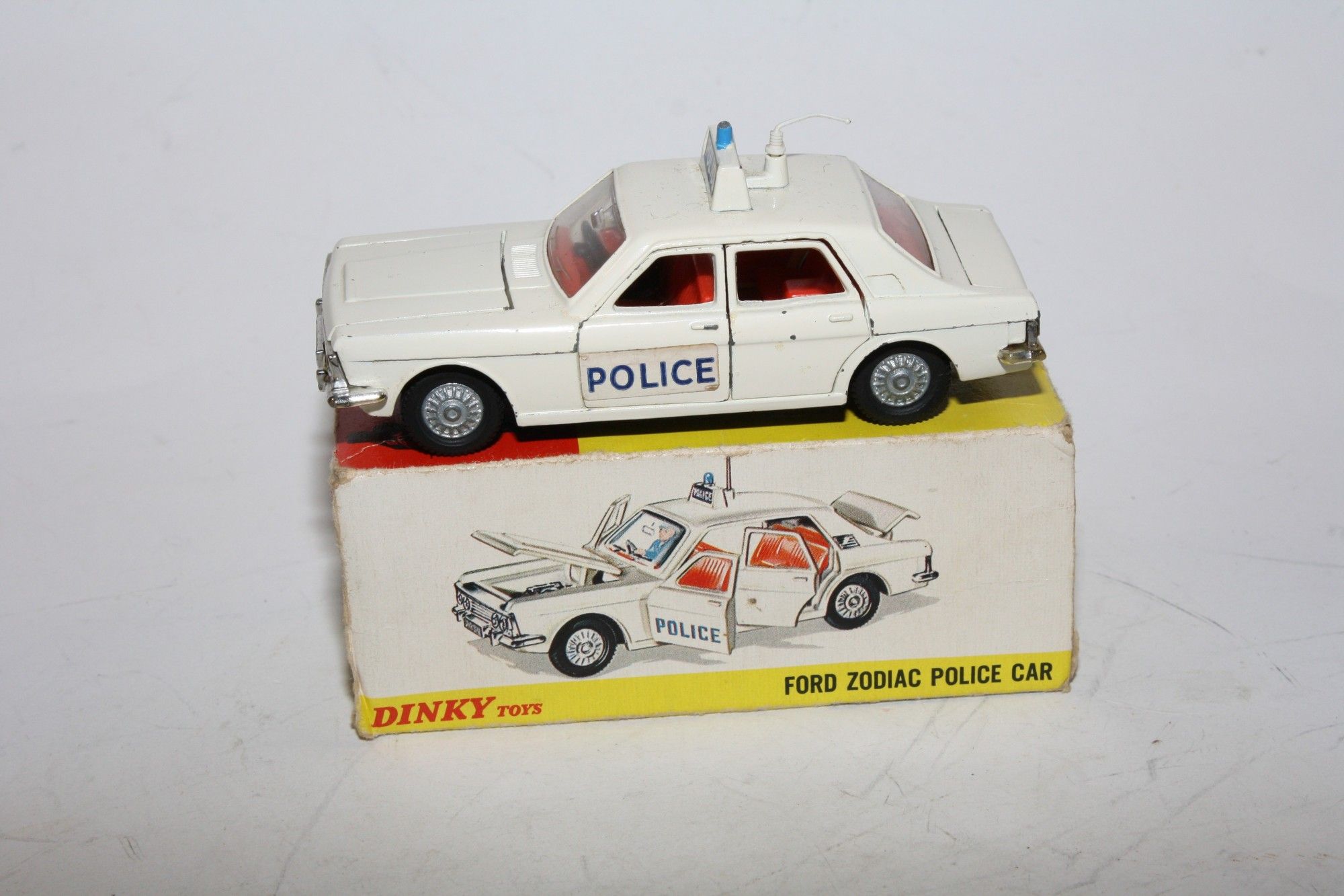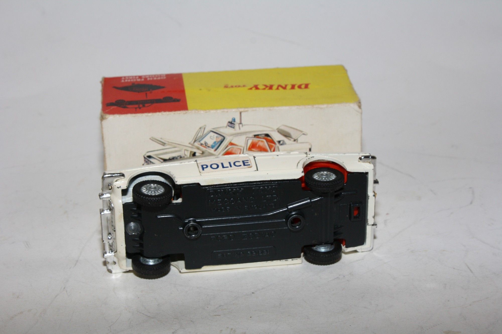 A nice example of this Dinky Police car. White paintwork is very good with just a few tiny chips , please study the photos for exact condition. Original tyres on cast hubs, suspension and steering all fine, crystal clear windows, red interior with police figure present. Roof aerial (original) and sign, all jewelled lights front and rear present with excellent chrome and number plate and Police door stickers. Underside mint