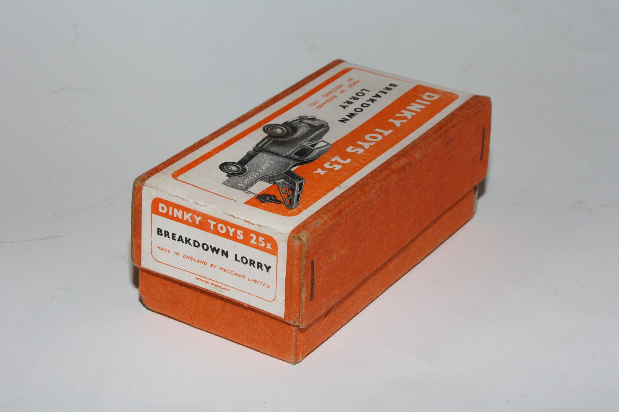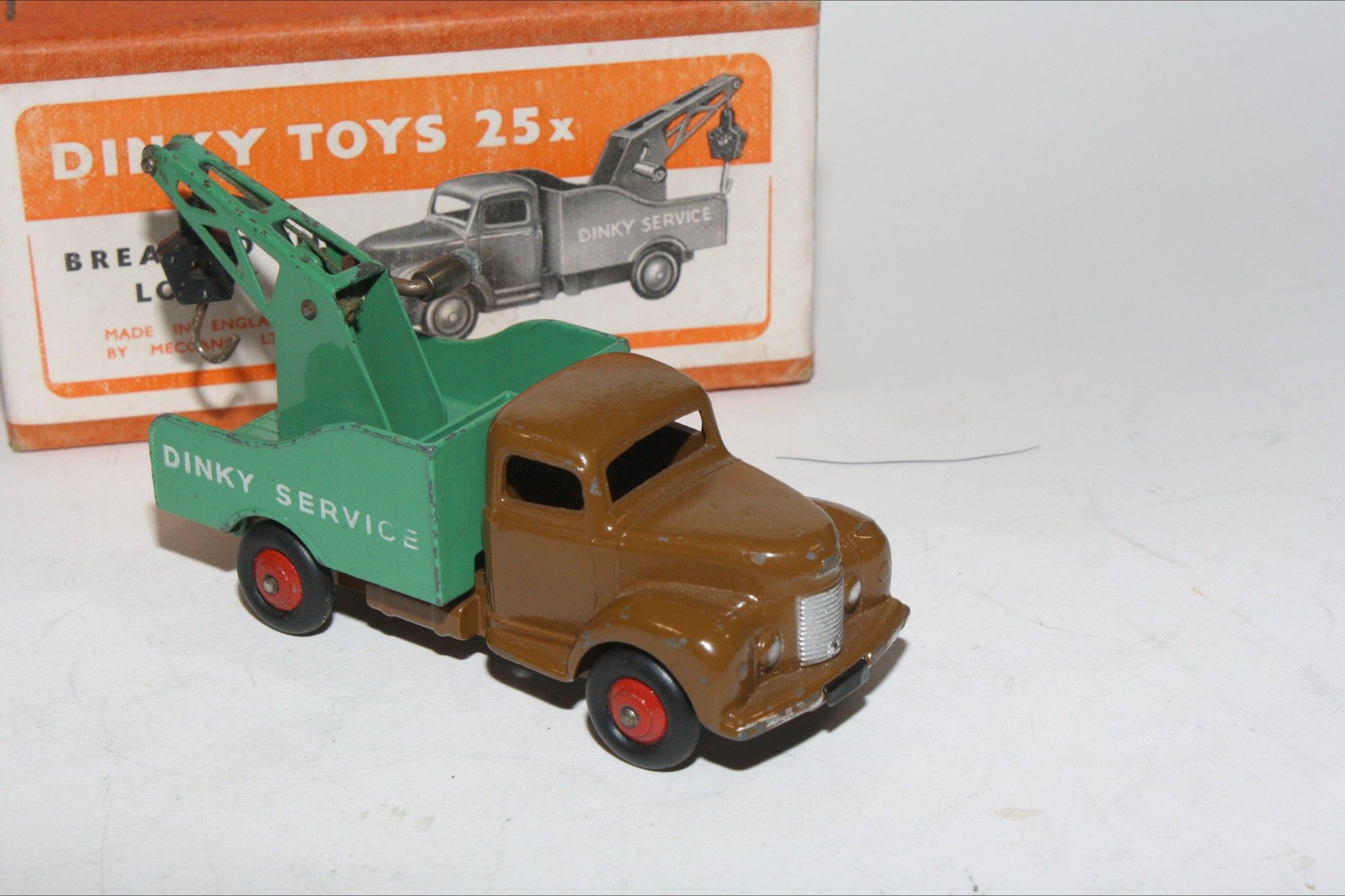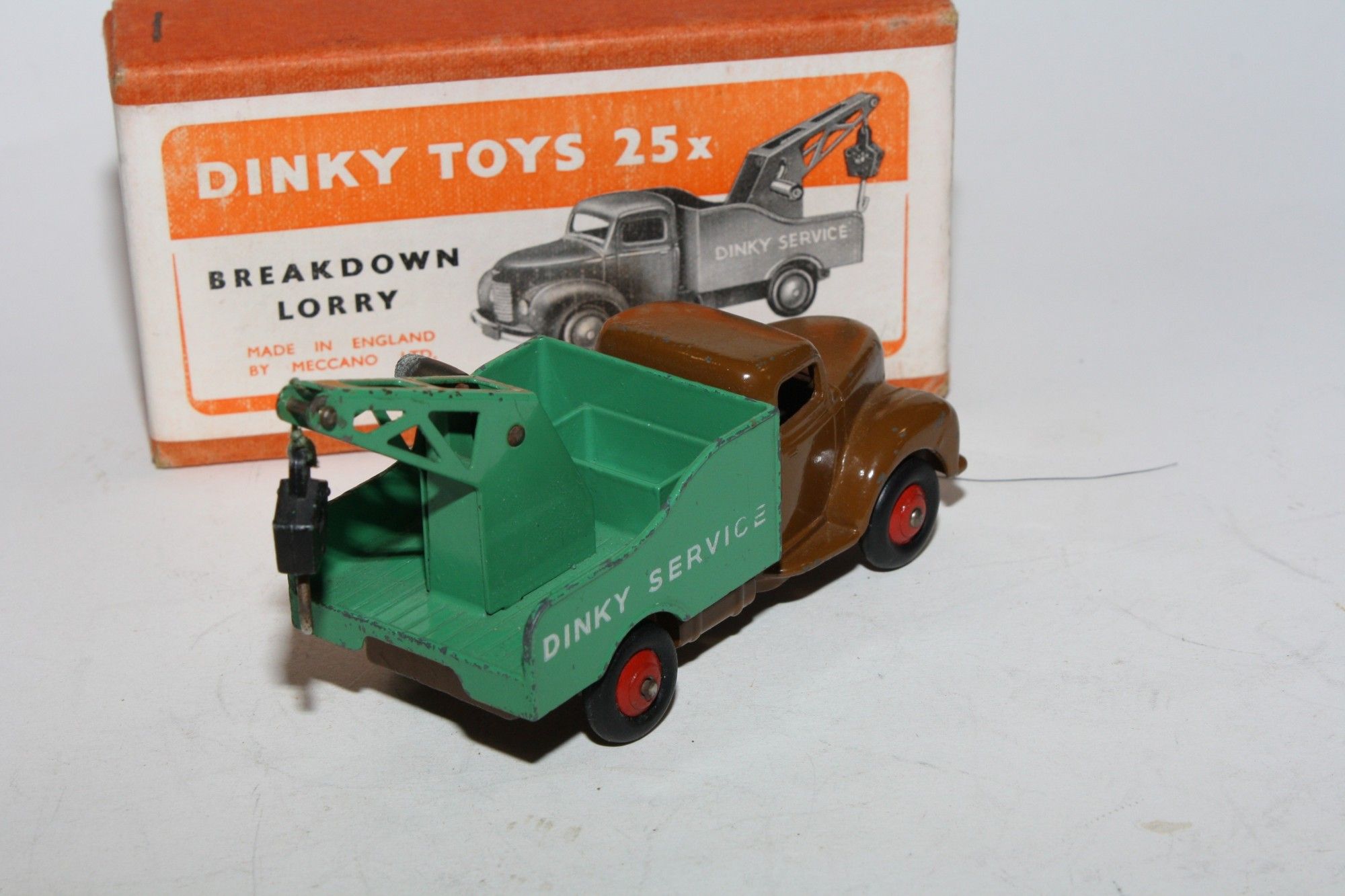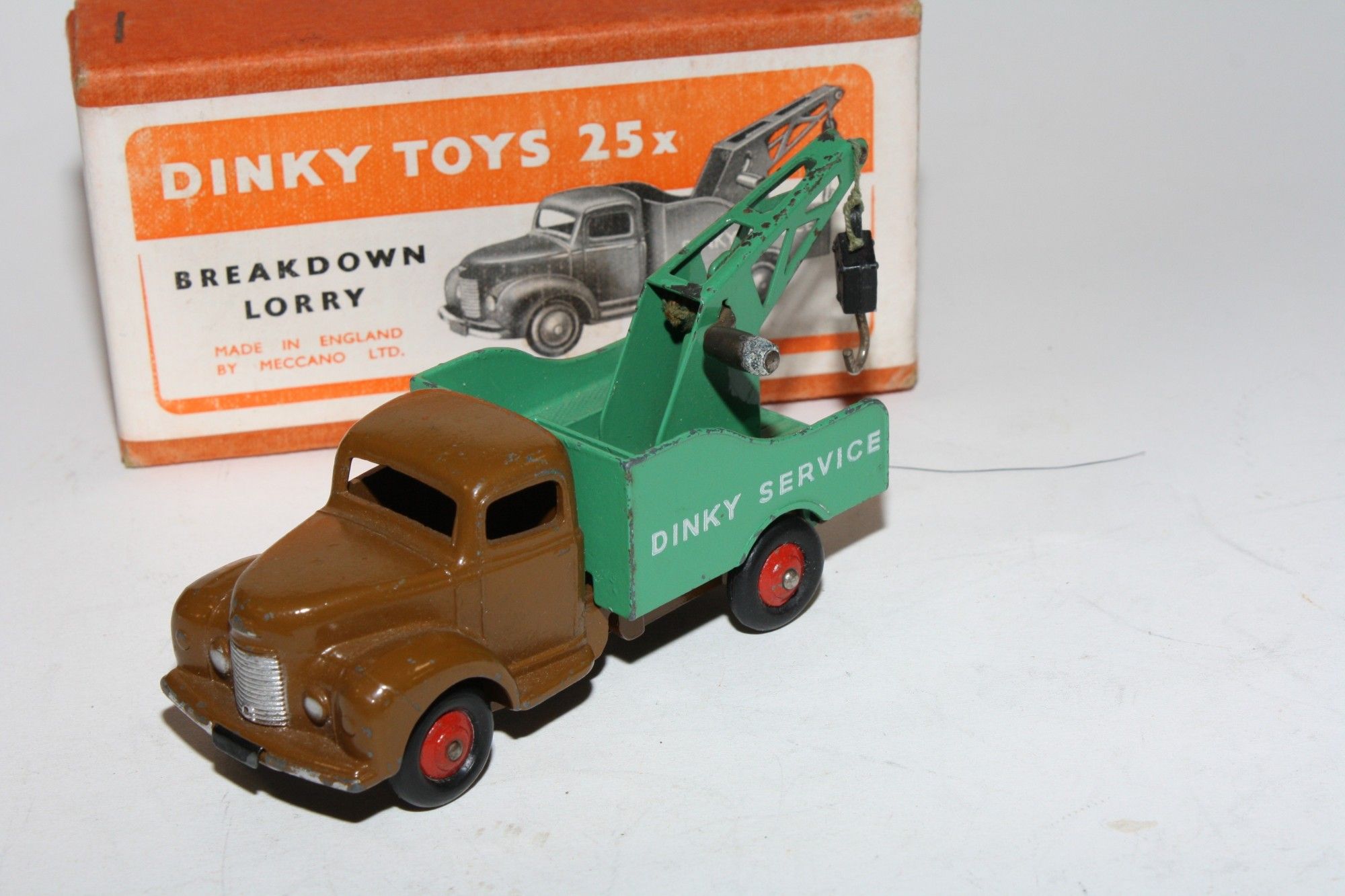 A lovely early example of this 1950's vintage model. Original darker brown cab and green rear is excellent with a couple of nicks and come light wear to some edges, please study the photos for exact condition. Excellent original tyres on red ridged hubs, straight axles, original lettering, original hook and cord. Excellent tin base plate.