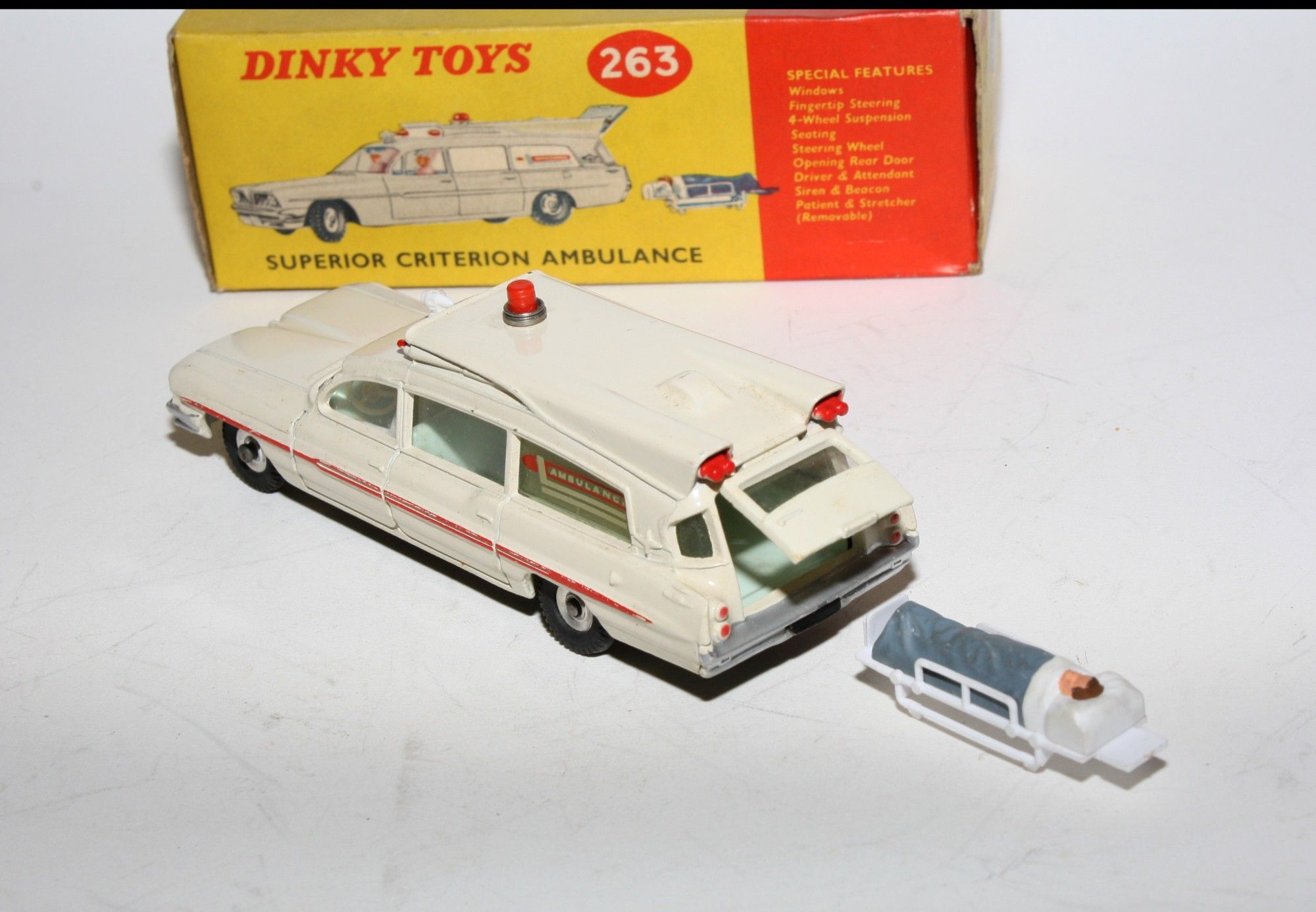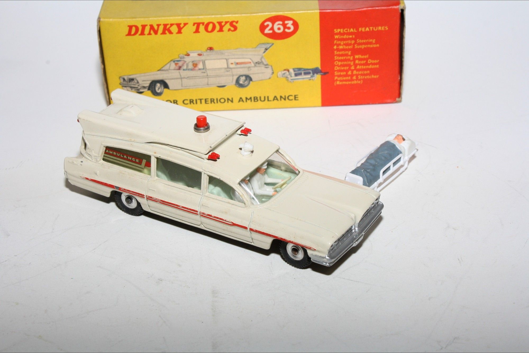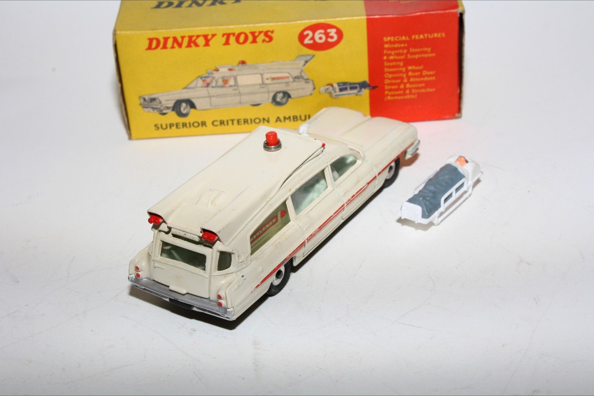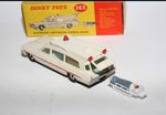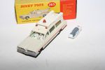 A beautiful example of this 1960's Dinky. Gleaming original paintwork is near mint, just a couple tiny nicks, please study the photos for exact condition. Original tyres on spun hubs, straight free rolling axles, steering smooth, perfect windows, interior and figures in front seats, roof light and siren present, original stretcher and patient. Excellent tin underside.