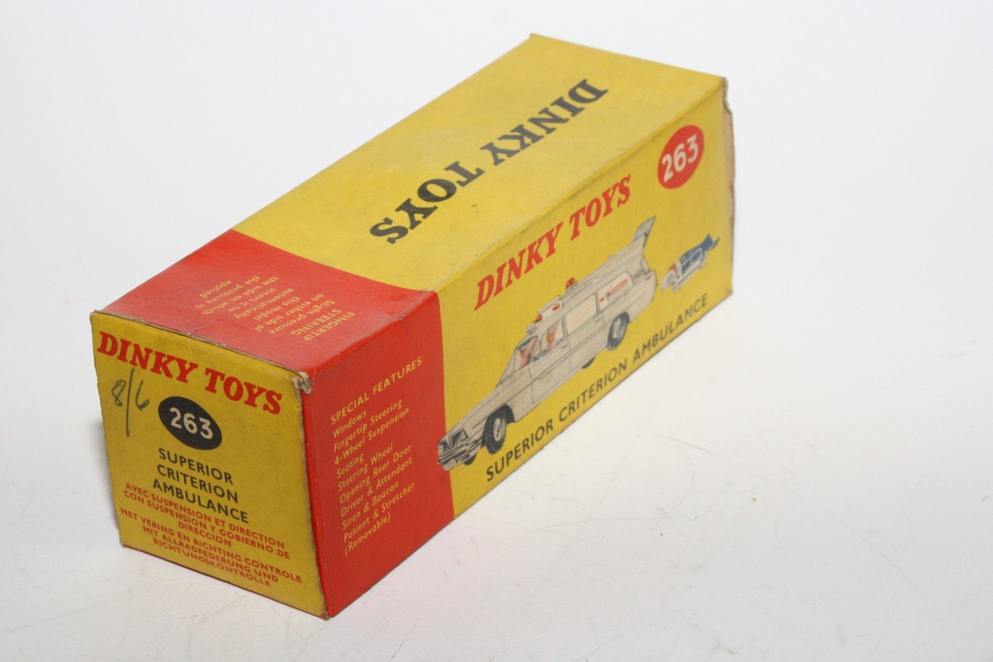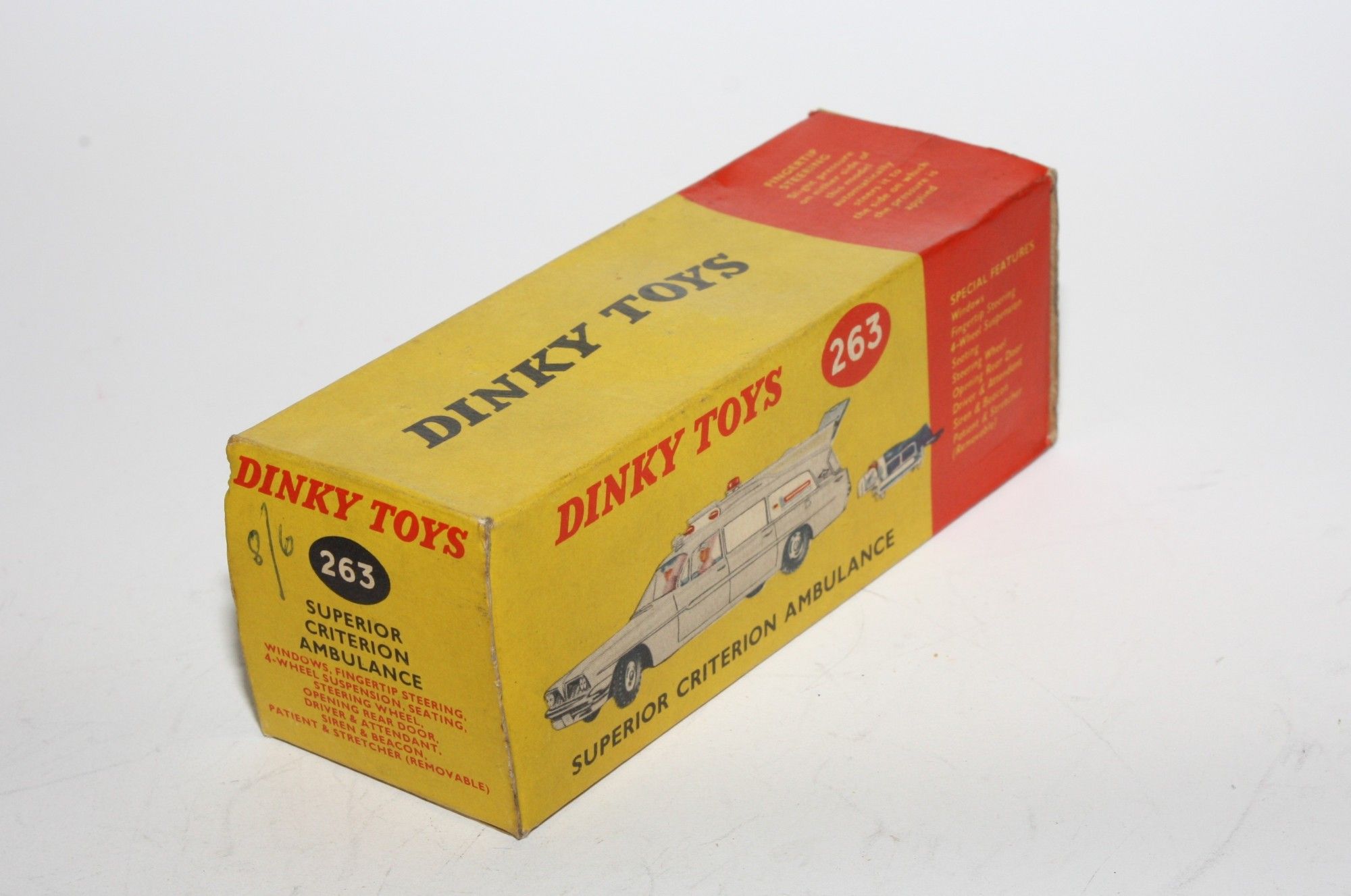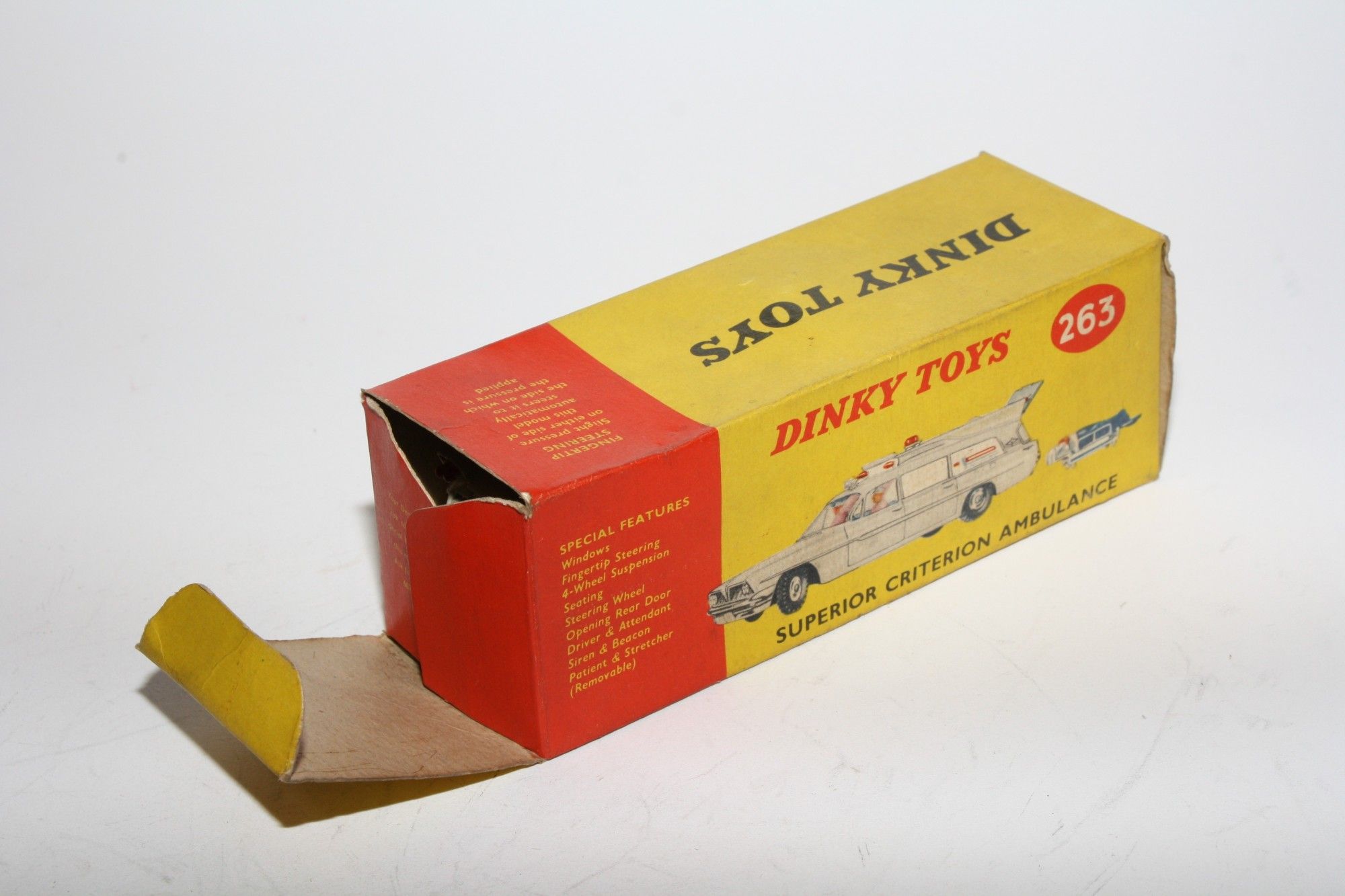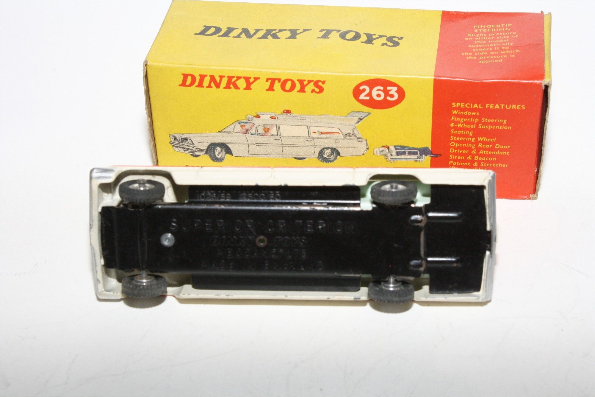 A beautiful example of this 1960's Dinky. Gleaming original paintwork is near mint, just a couple tiny nicks, please study the photos for exact condition. Original tyres on spun hubs, straight free rolling axles, steering smooth, perfect windows, interior and figures in front seats, roof light and siren present, original stretcher and patient. Excellent tin underside.