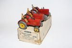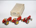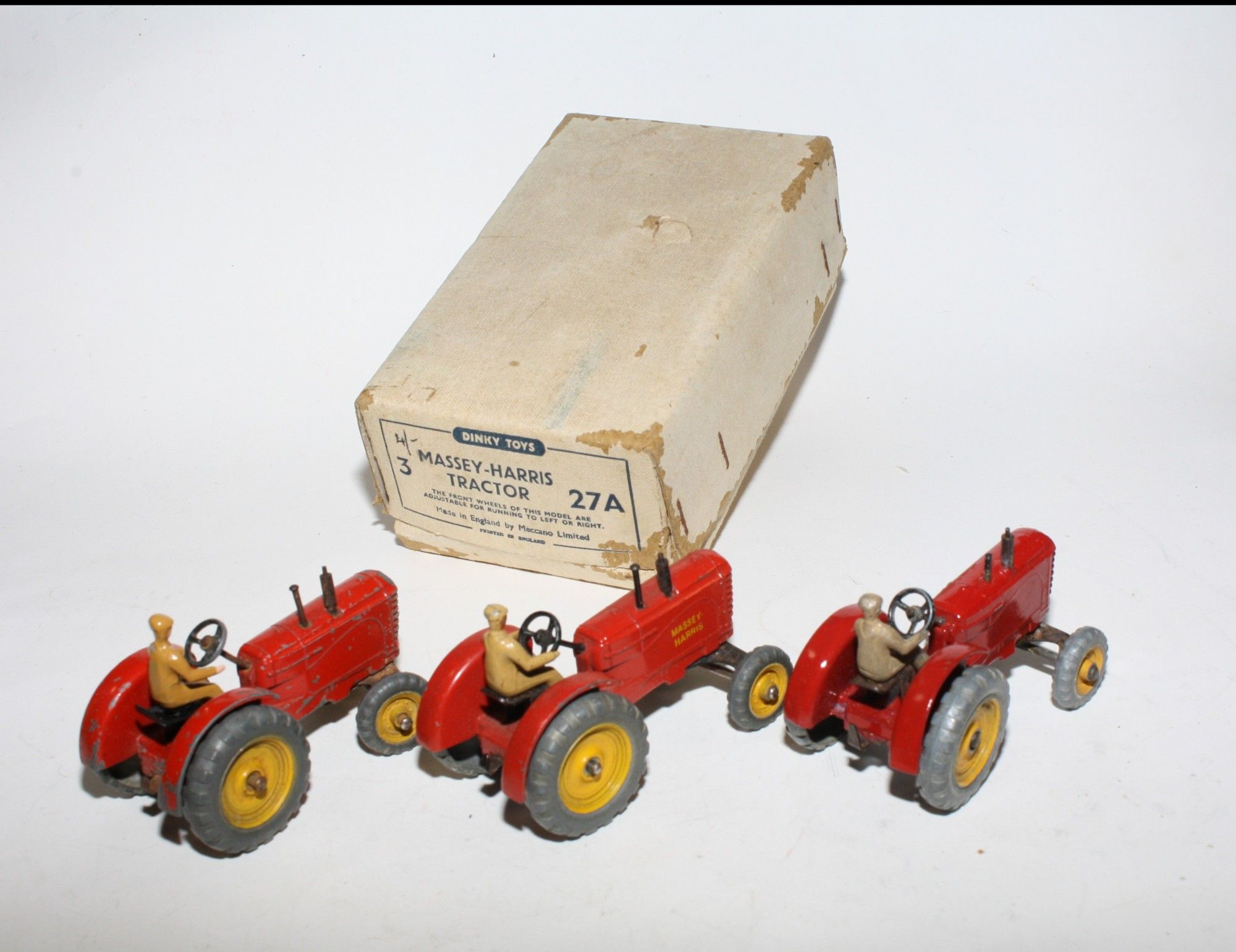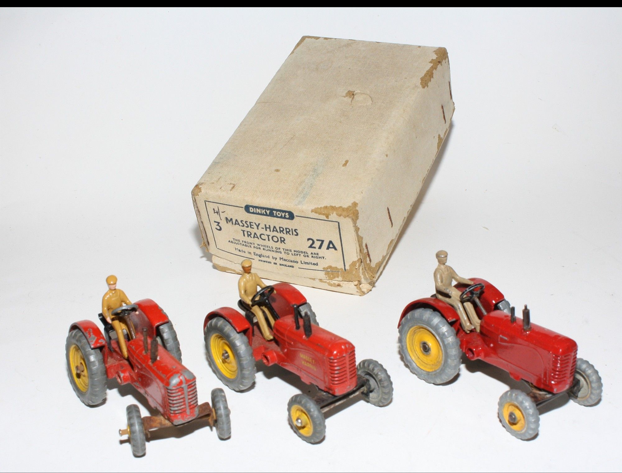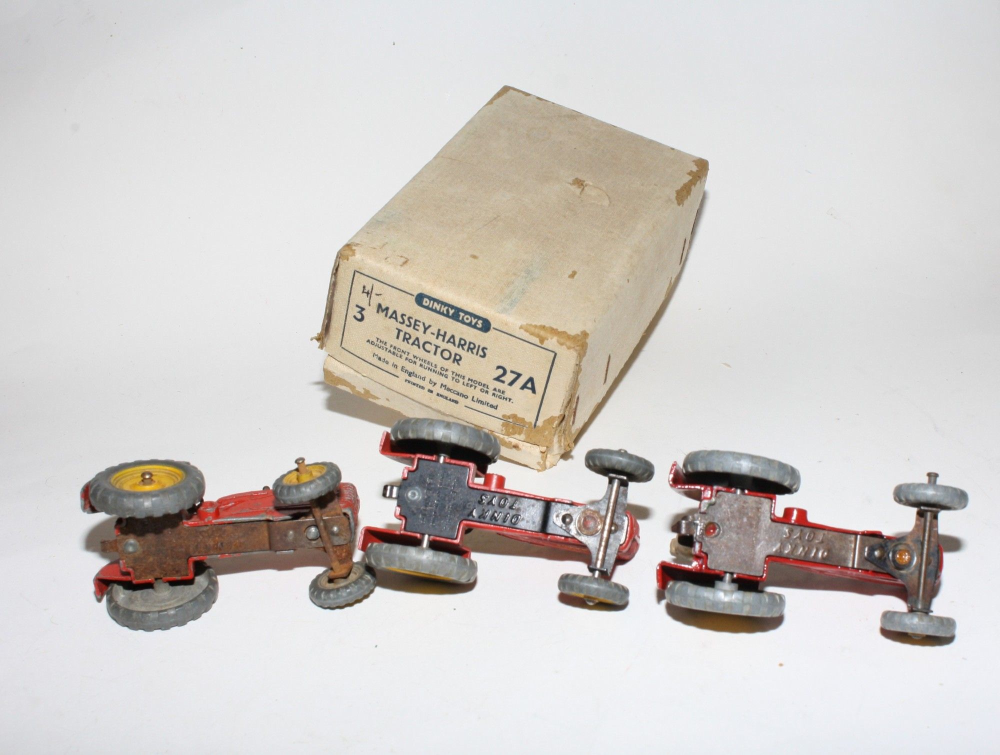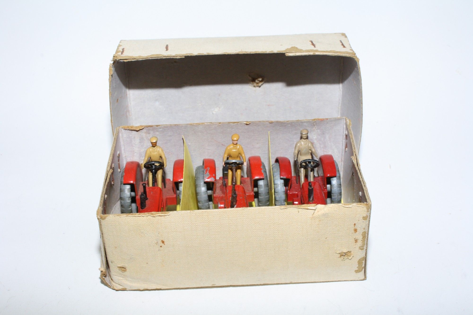 Dinky Toys early issue No. 27A Massey Harris Tractor in original trade box of 3 models in various condition from good to one repaint, yellow metal hubs, one front axle is detached, light tan driver figure, metal tow hook, in the original card trade box with lift-off lid with some wear, not original dividers.