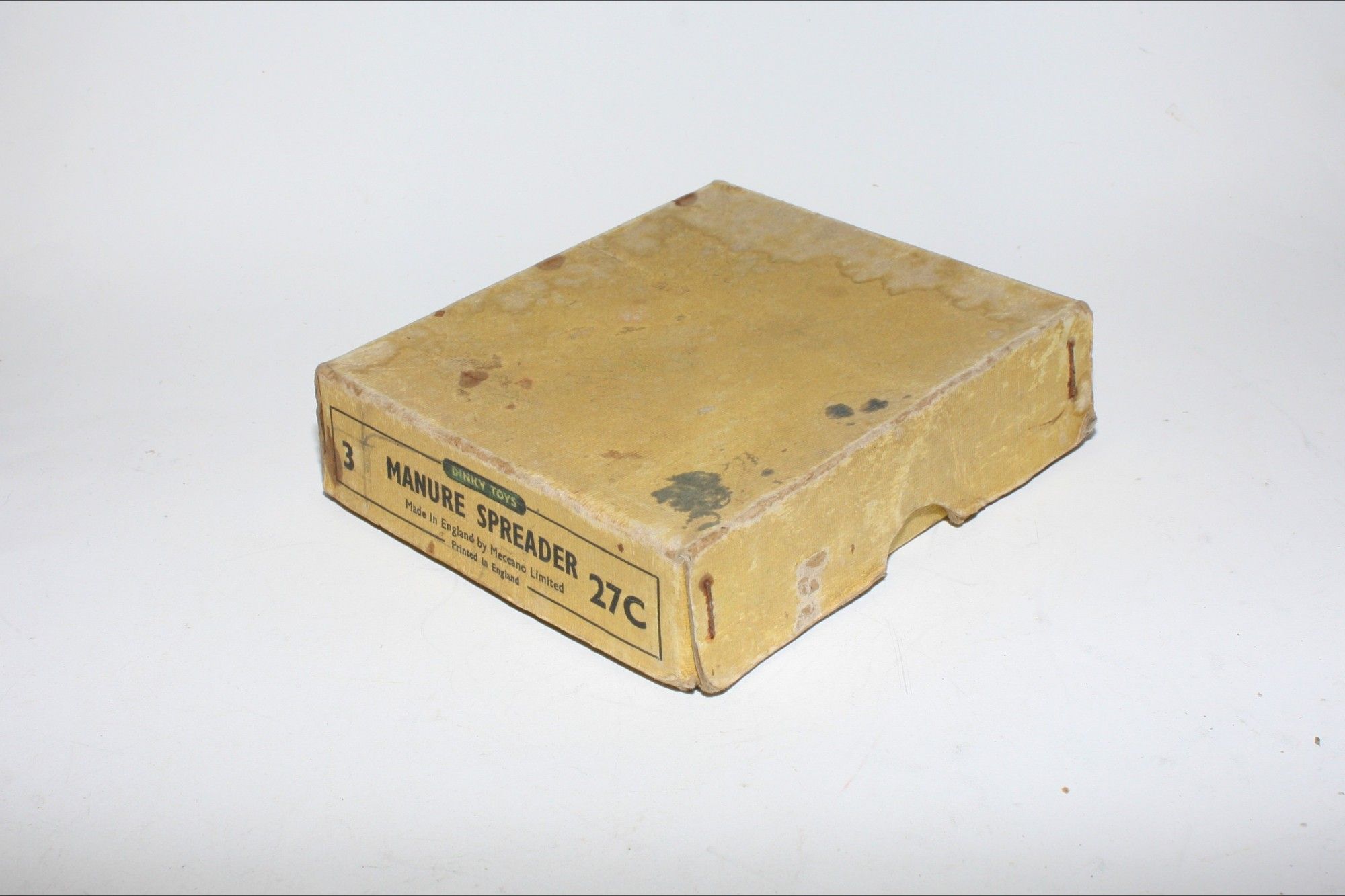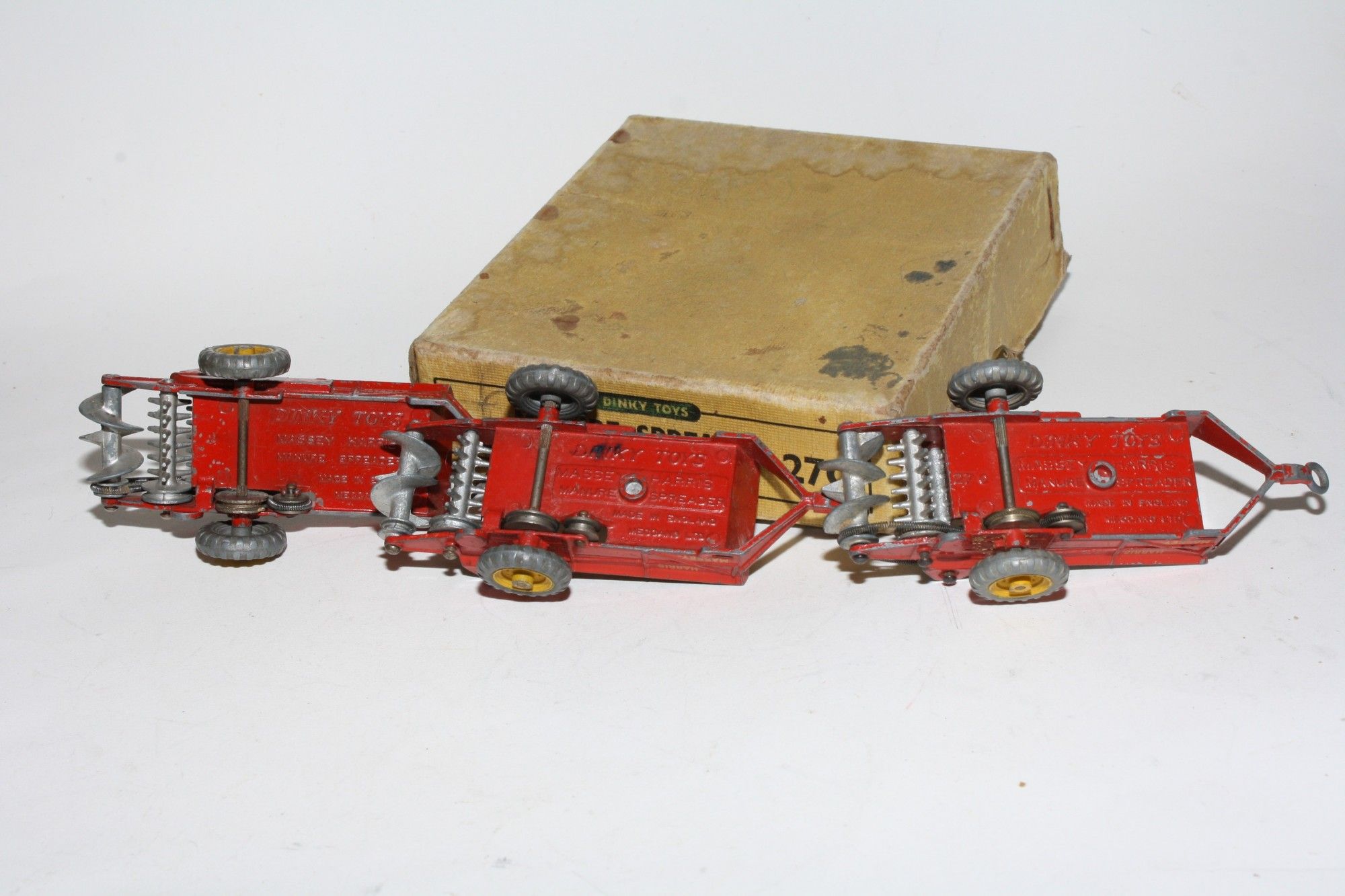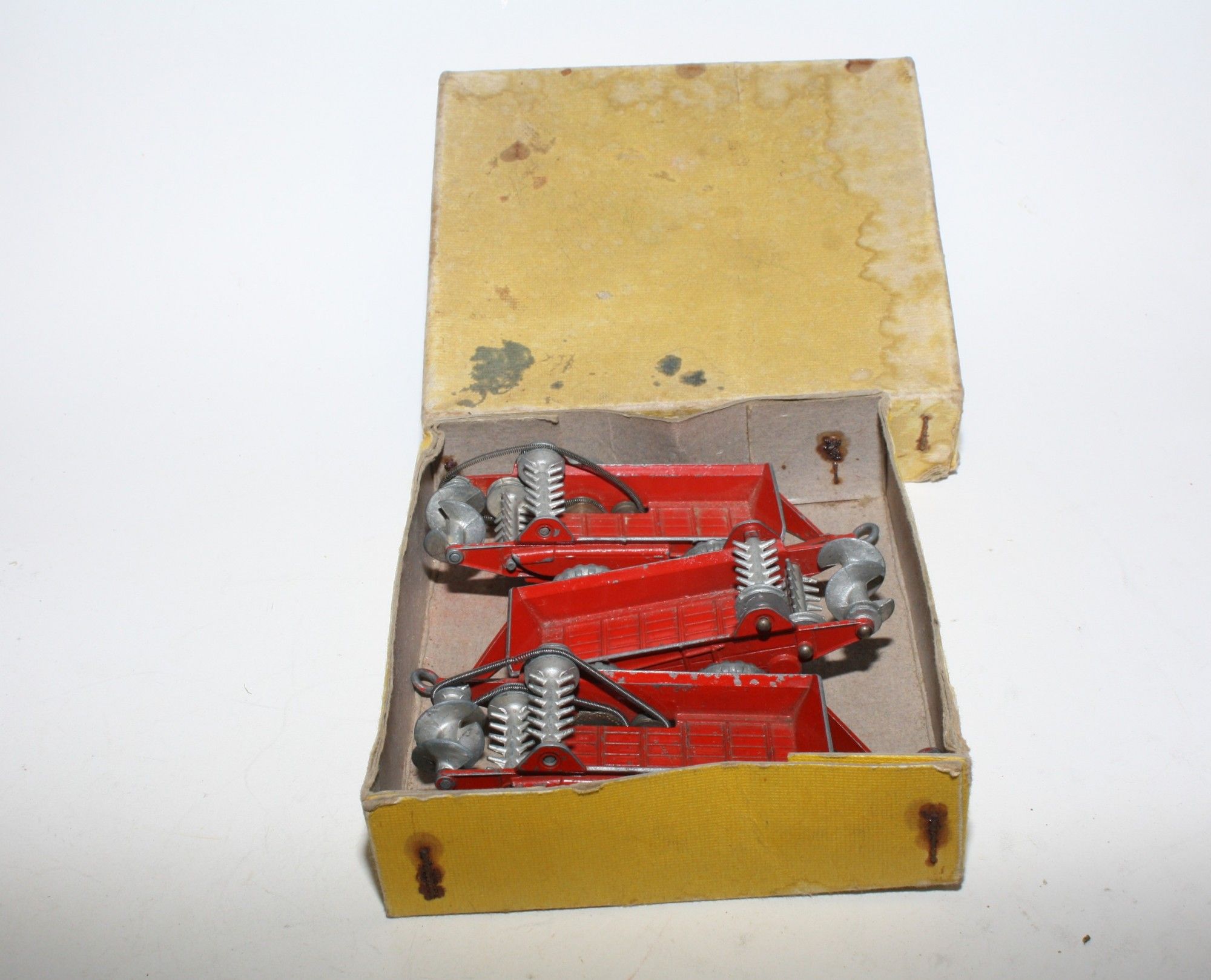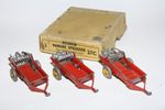 Three playworn examples of these post war models, one spring belt missing, all tow eyes are complete, good wheels on free rolling axles. Supplied in a trade box with some marks and wear, no inner dividers.