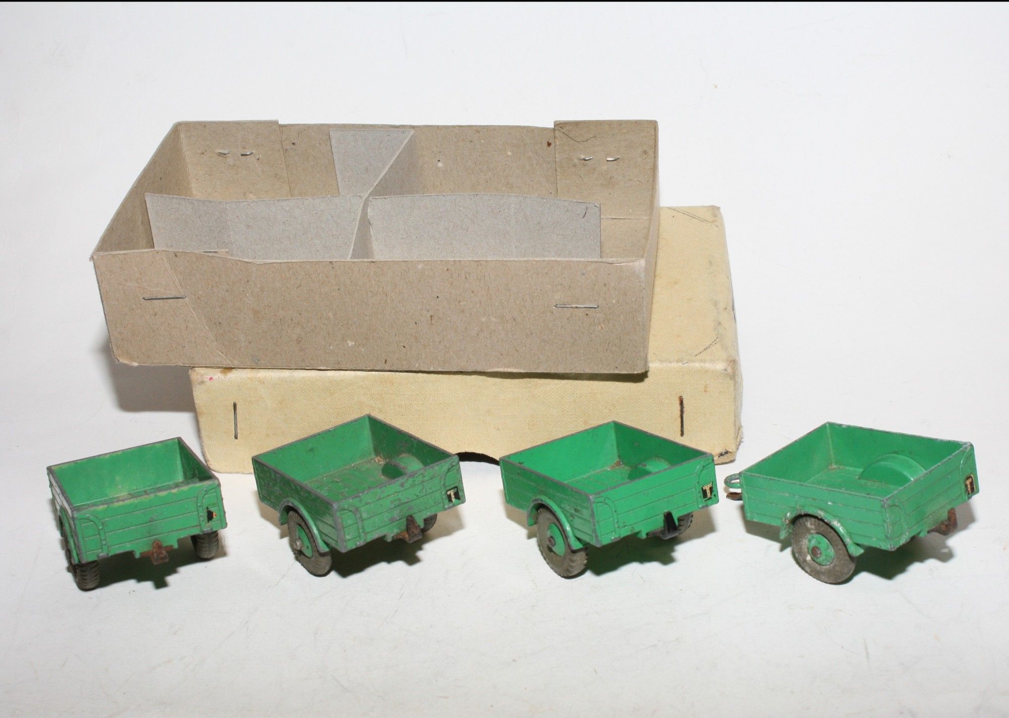 A good trade pack containing 4 Land Rover trailer models in green with green hubs. All are complete with original tyres. Please study the photos for exact condition.