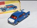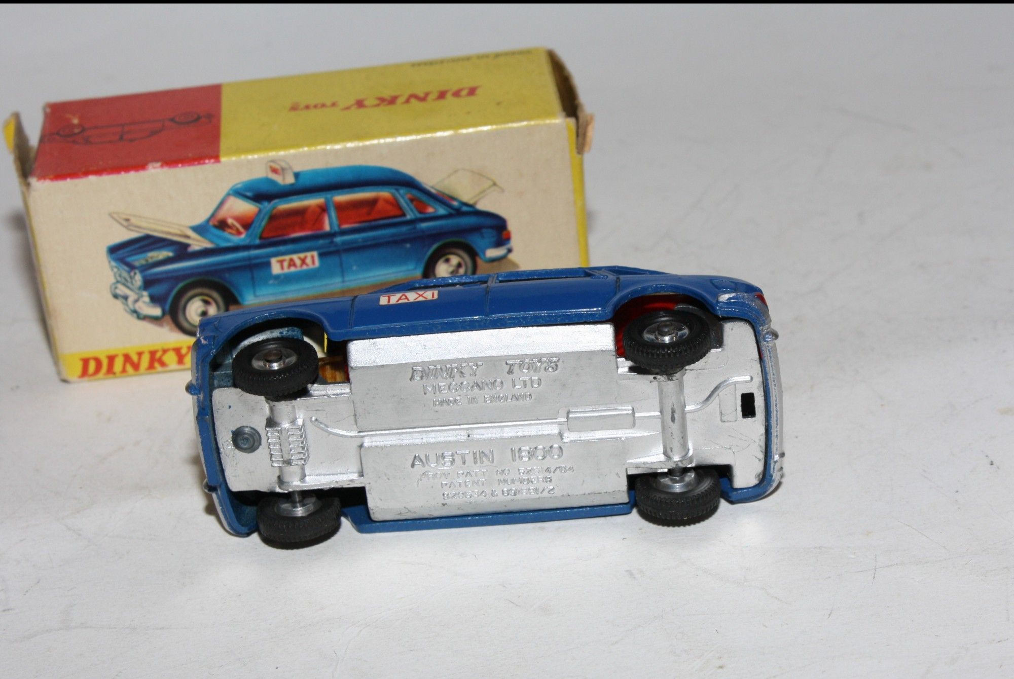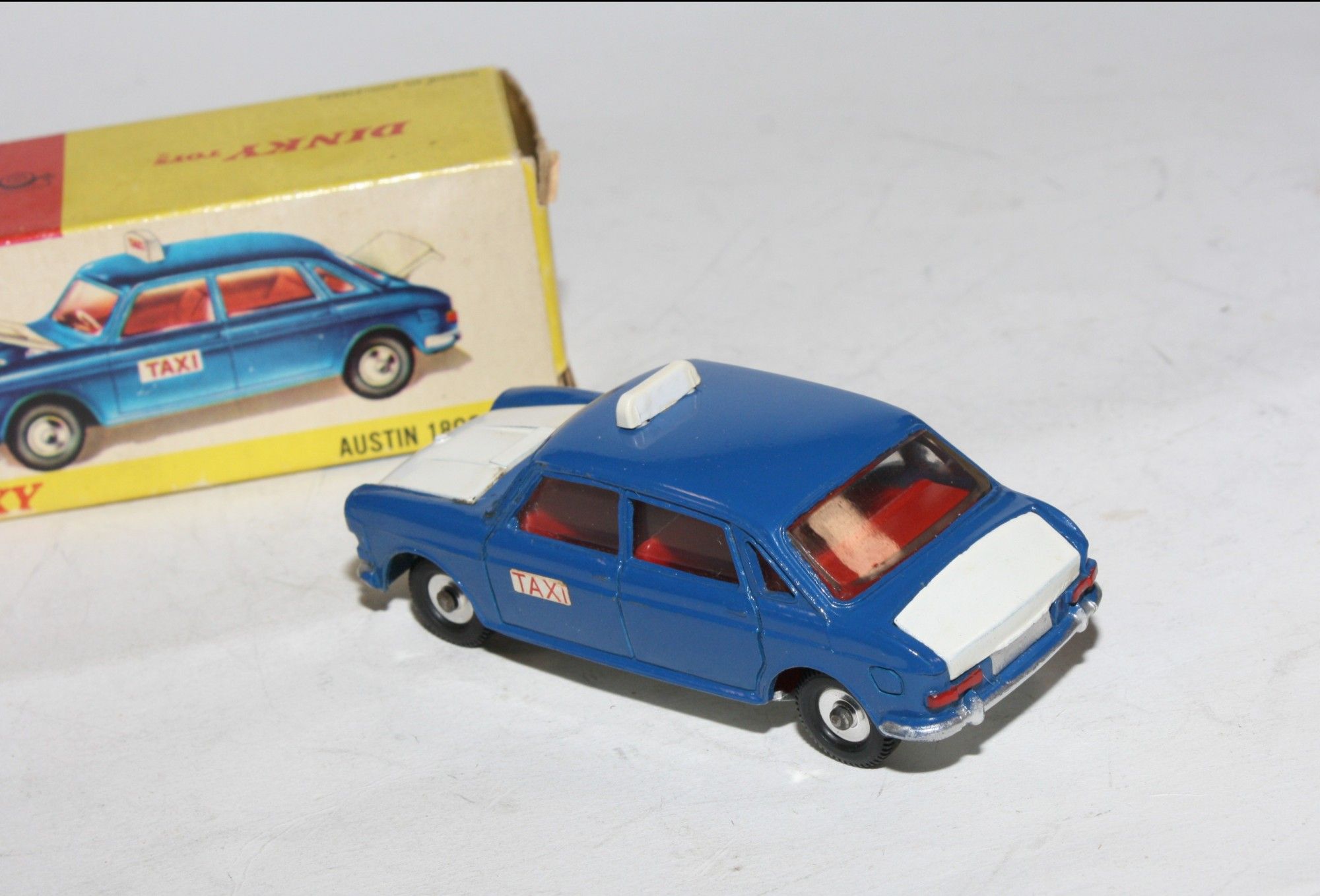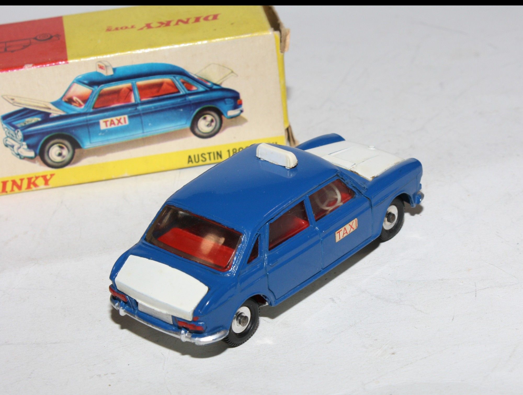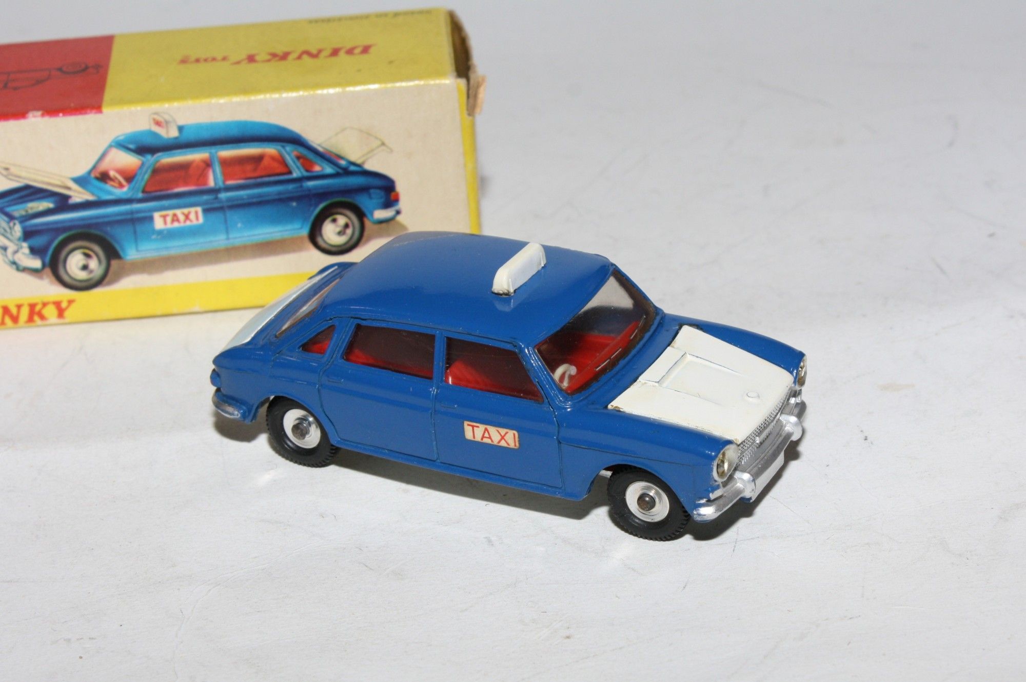 A lovely example of this 1960's Dinky model. Original blue/white paintwork is virtually mint, please study the photos for exact condition. perfect original tyres on spun hubs, strong suspension and steering, crystal clear windows, red interior, jewelled lights, taxi signs, and excellent silver baseplate