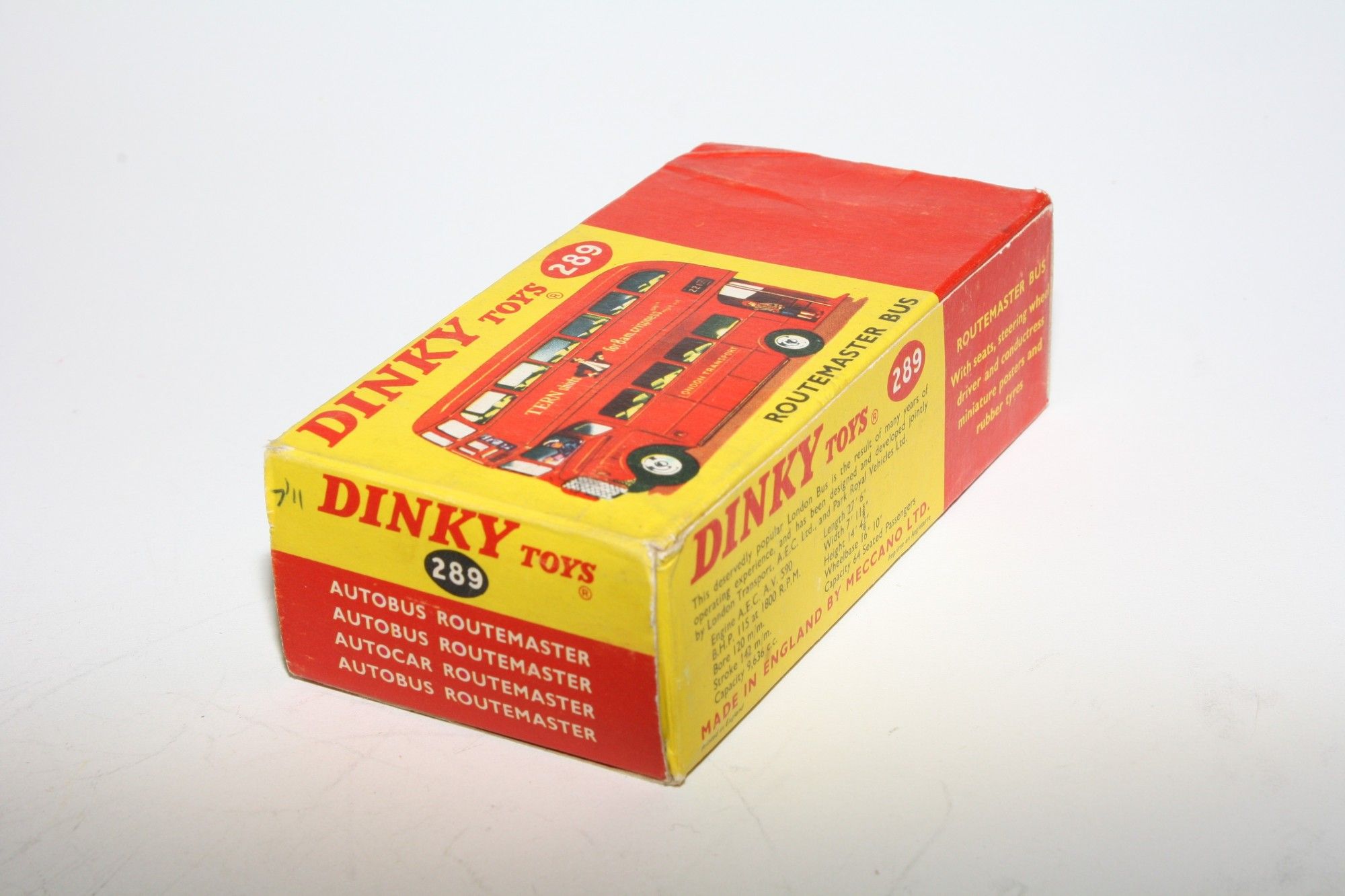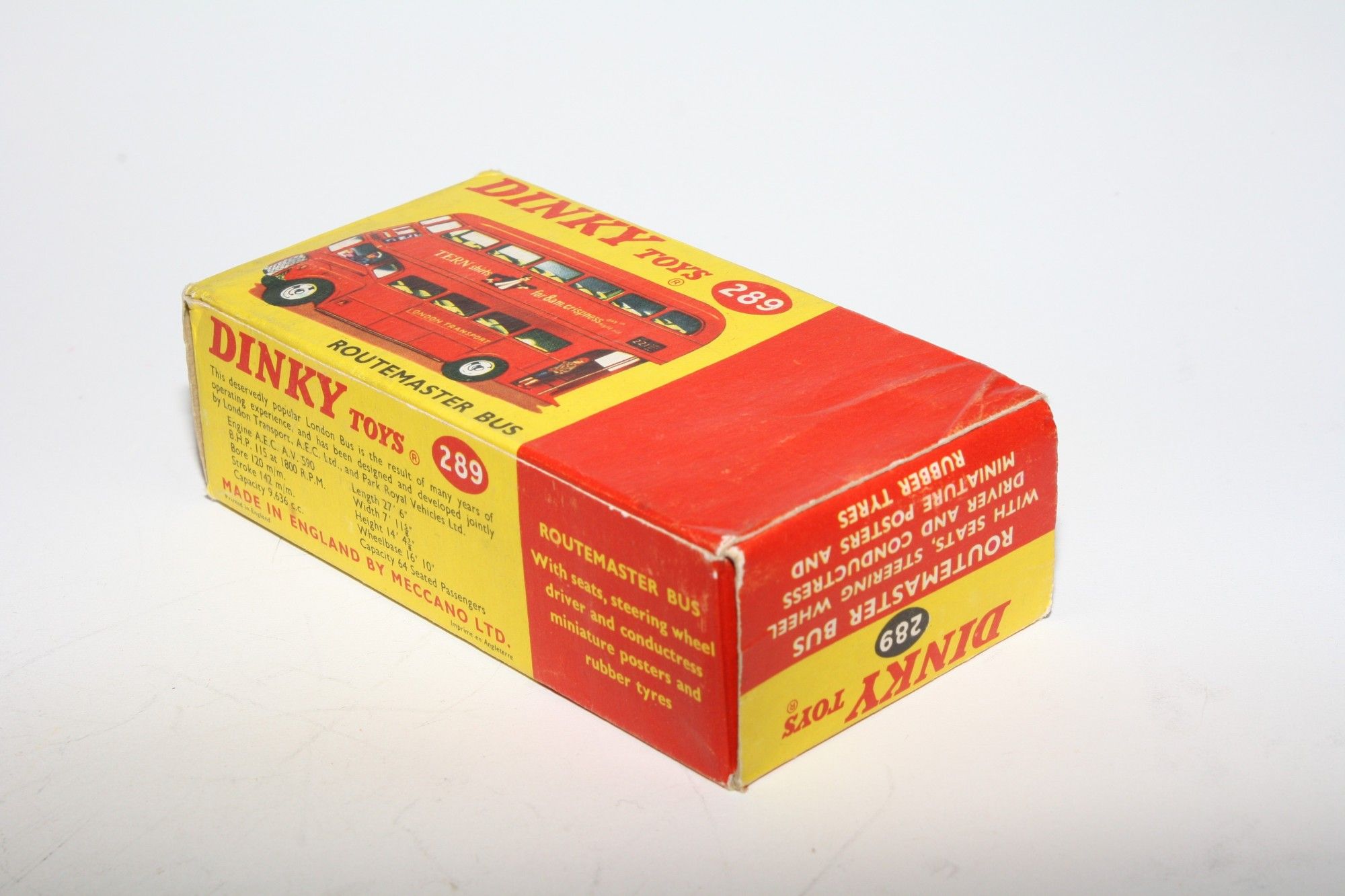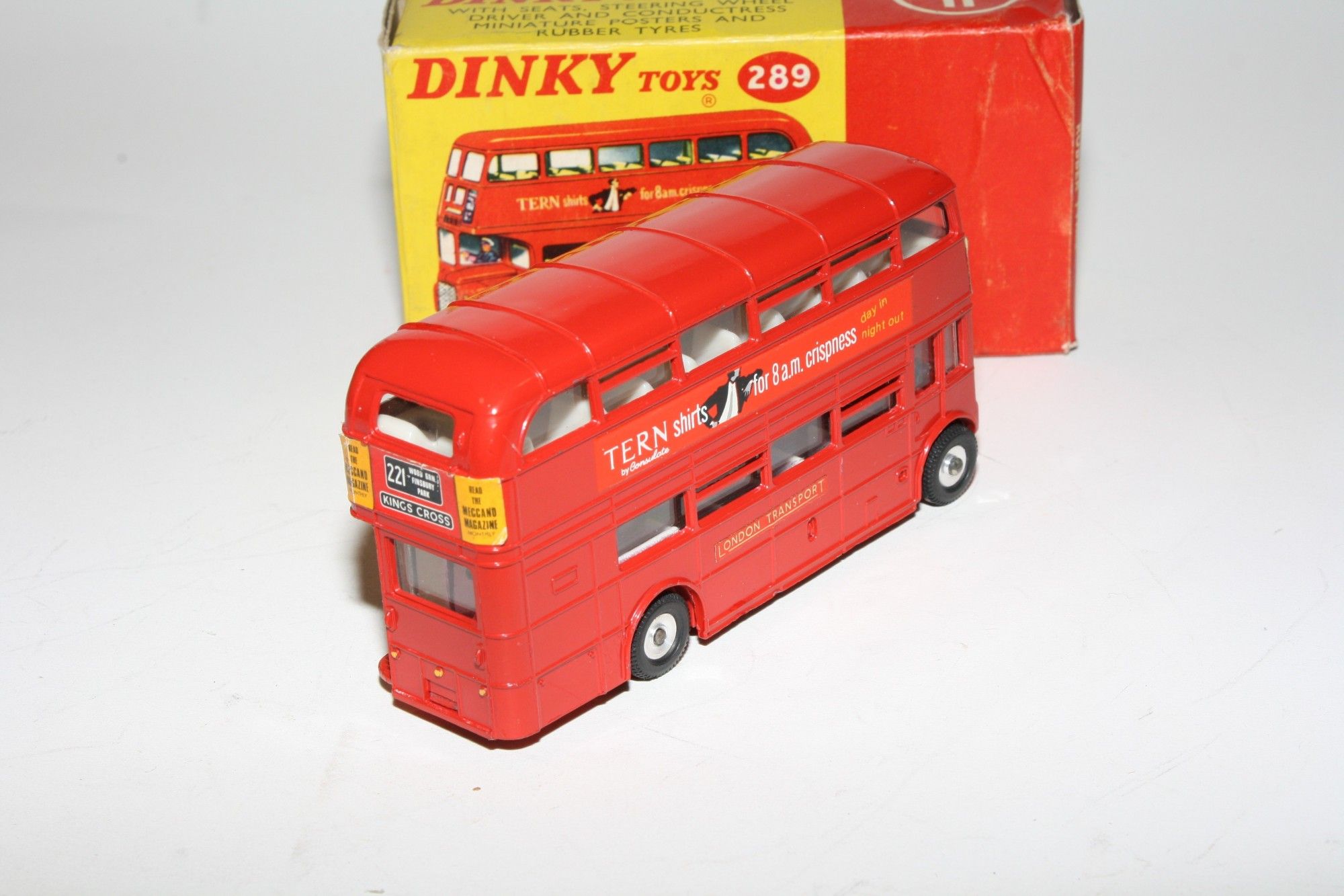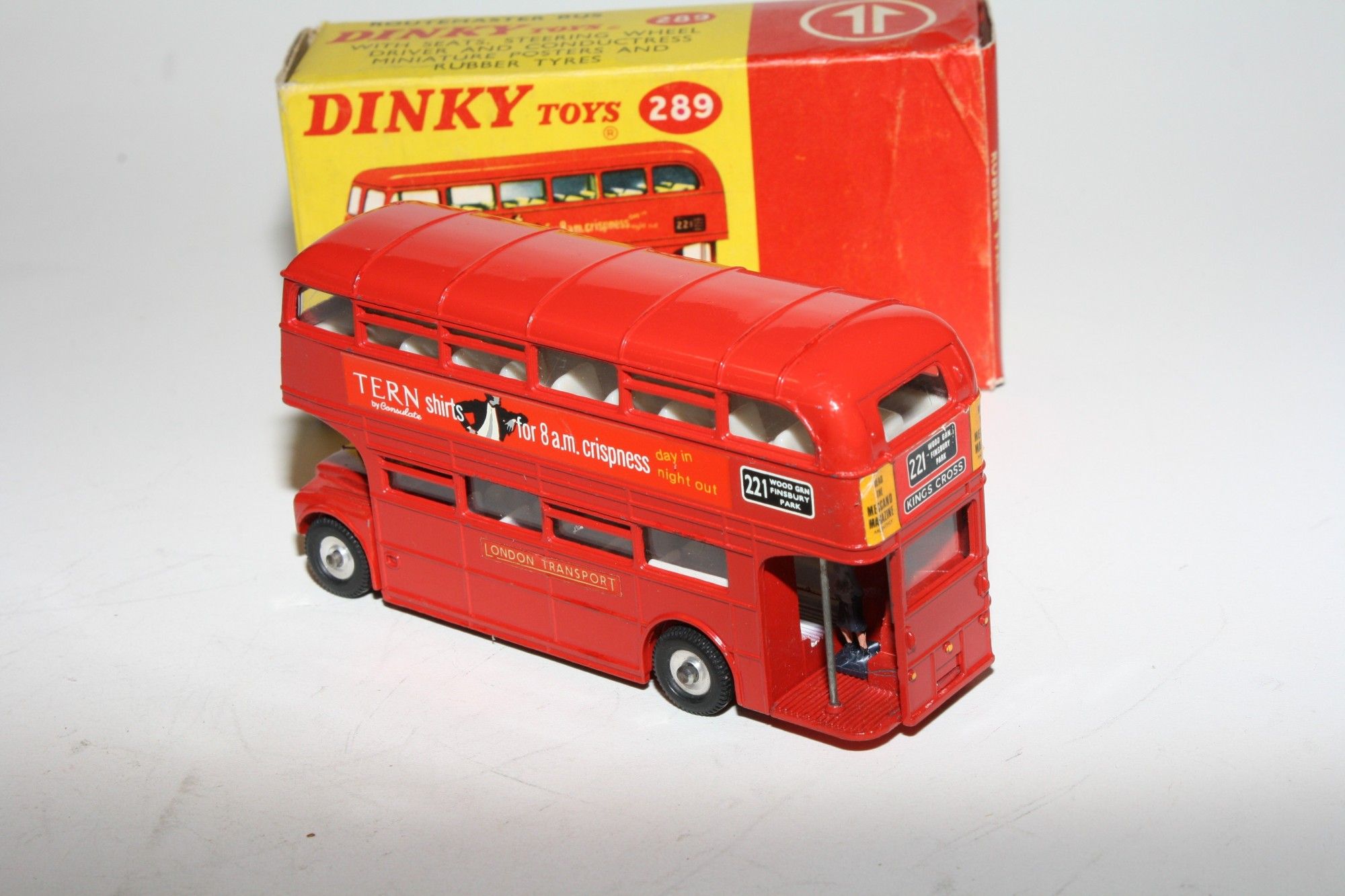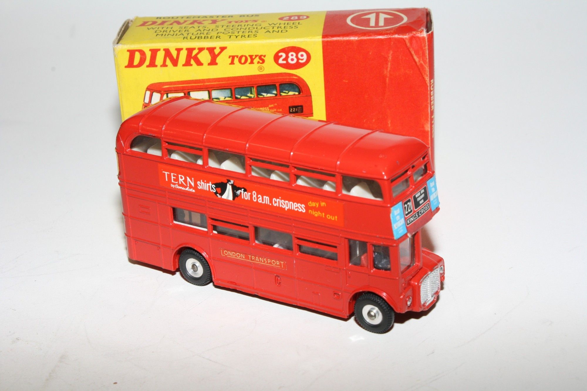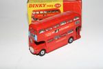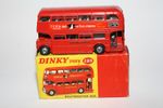 A superb example of this early edition Dinky bus with the Schweppes livery. Gleaming original red paintwork is virtually mint, please study the photos for exact condition. Perfect tyres on spun hubs, clippy and driver figures, Tern Shirts & 221 Kings Cross stickers/decals all fine, underside excellent.