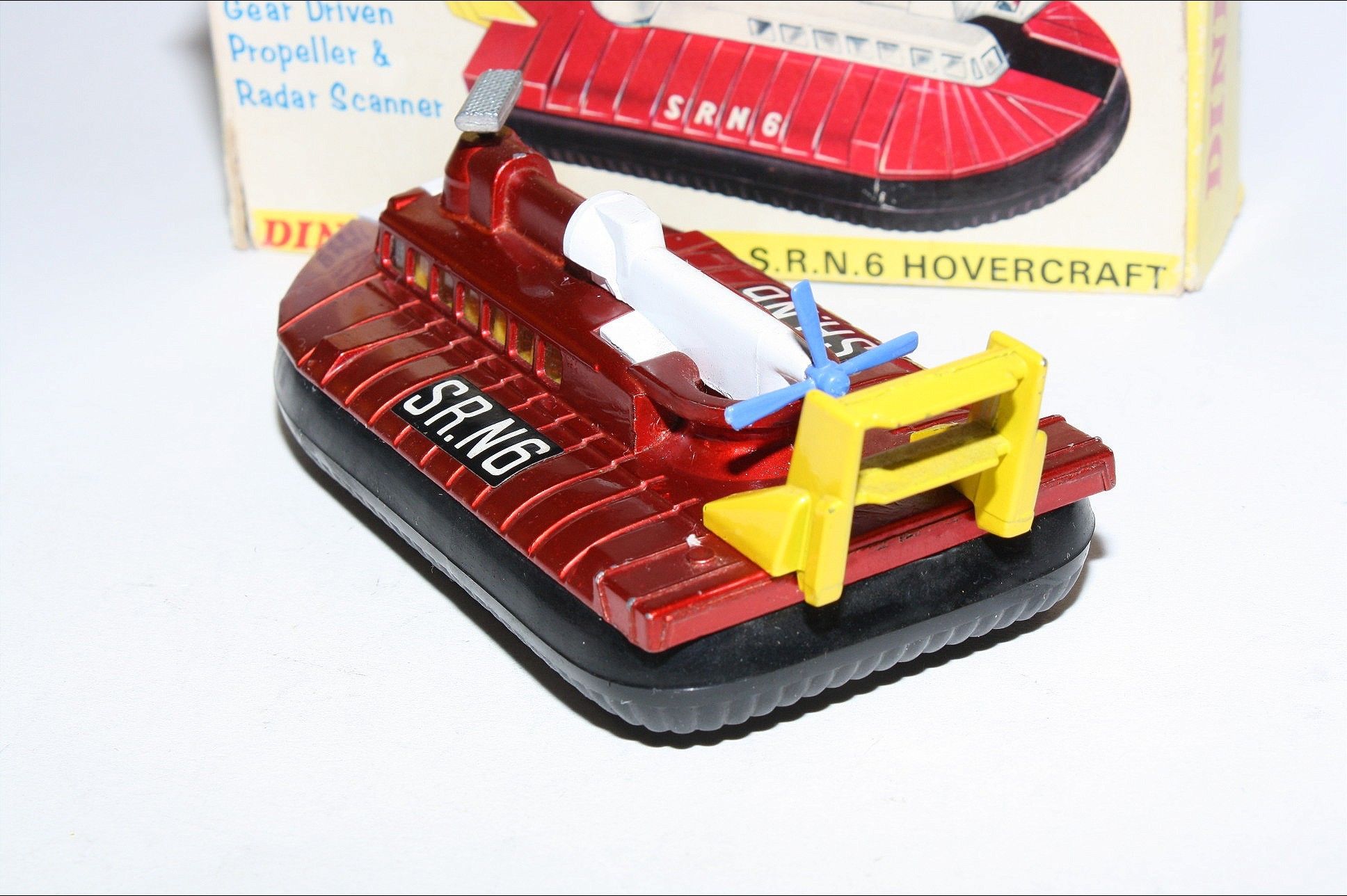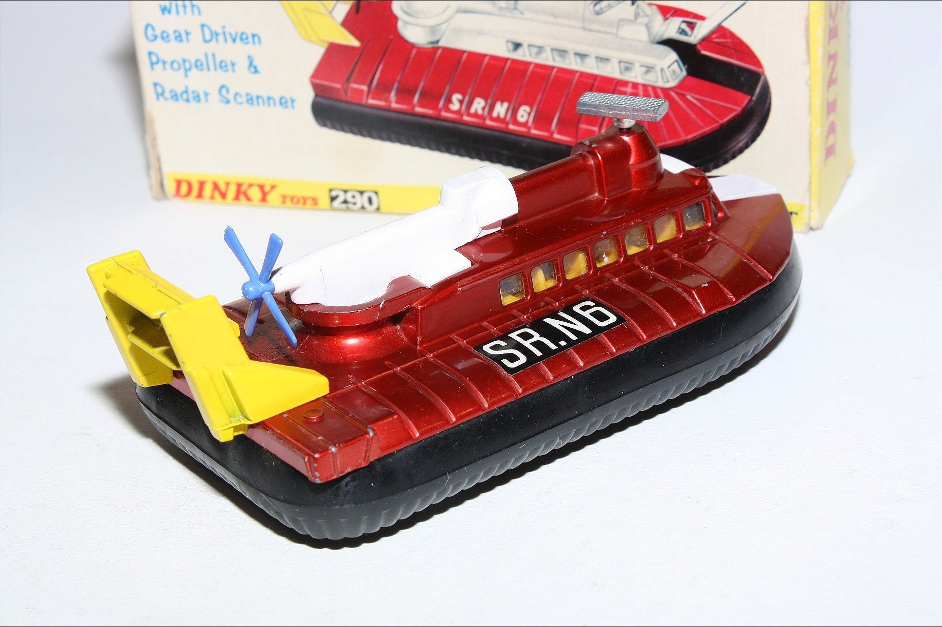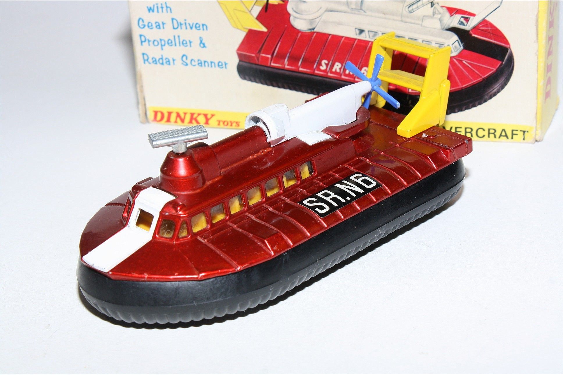 A nice example of this early Dinky model. Gleaming original metallic red paintwork is excellent with a few of tiny nicks, please study the photos for exact condition. Good original tyres on silver cast hubs all in good condition, working propeller and rotating radar, straight axles, crystal clear windows, orange interior, perfect stickers, mint underside.