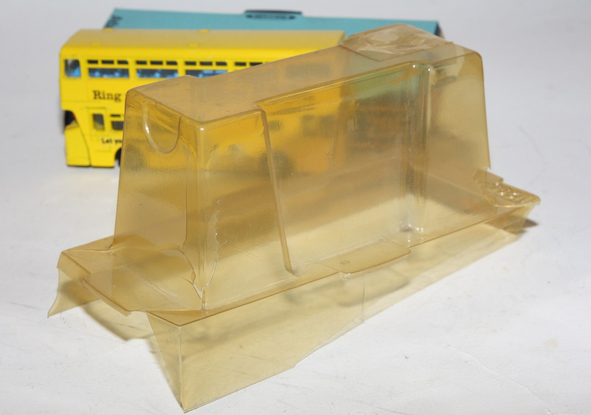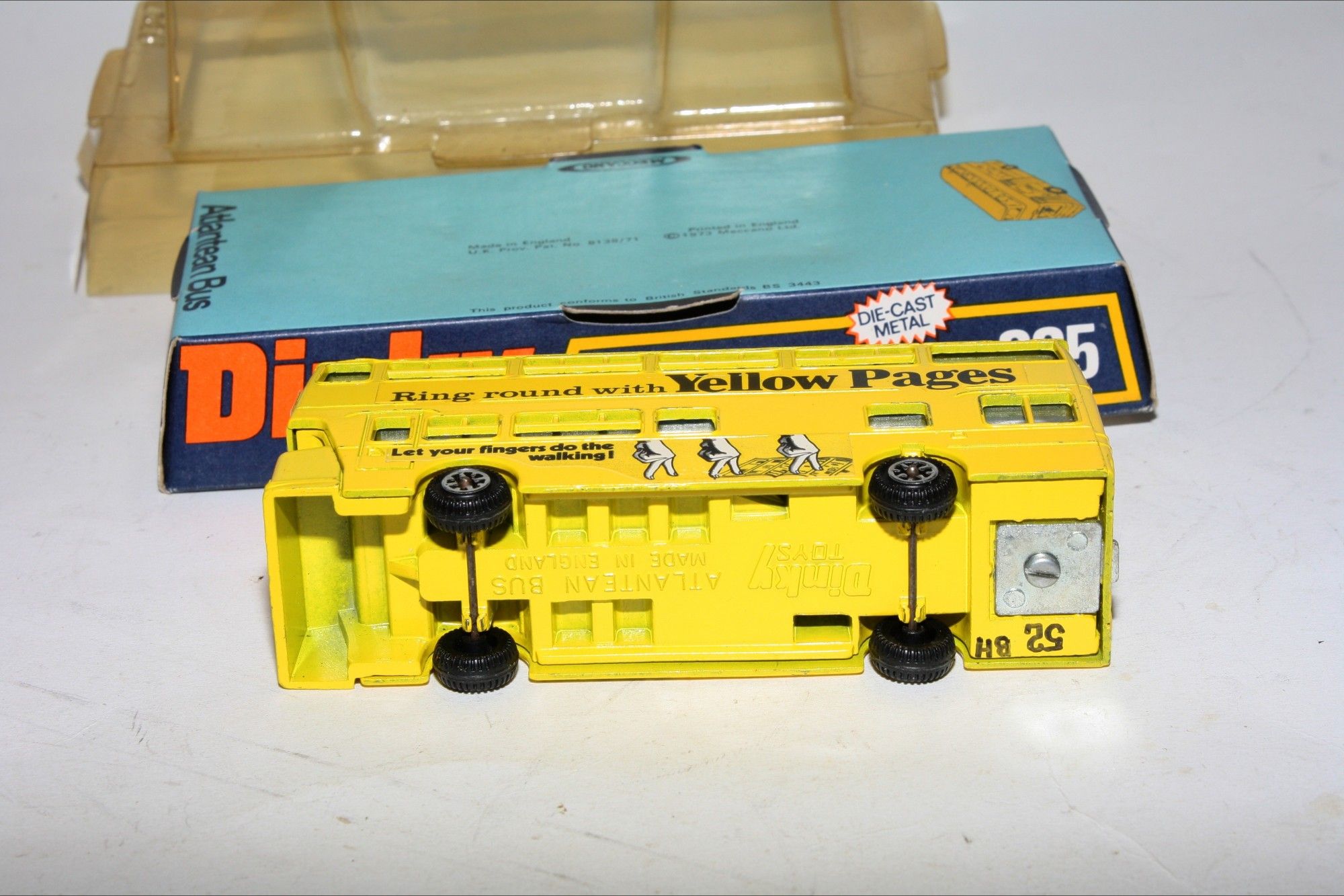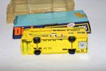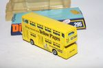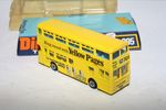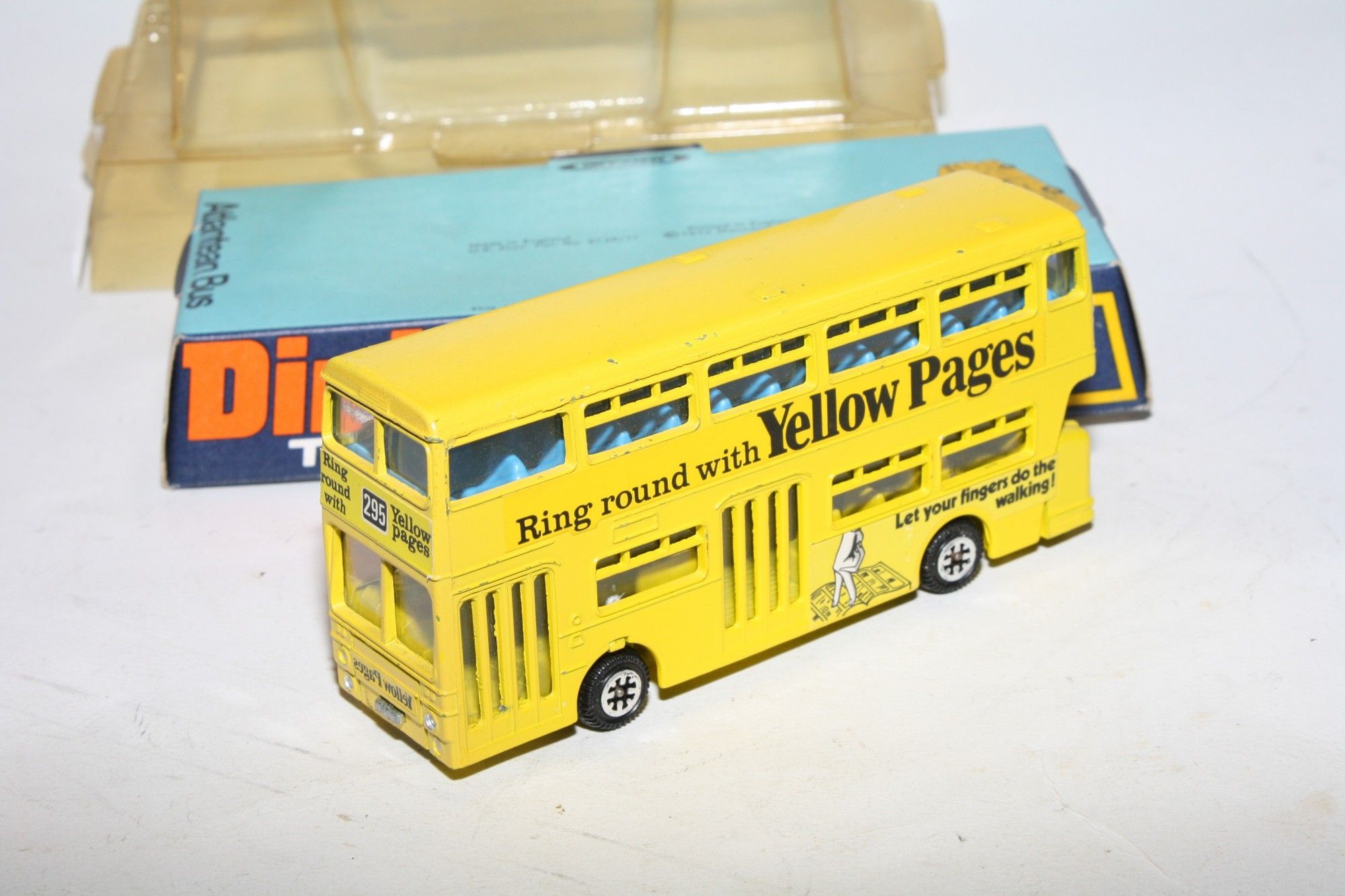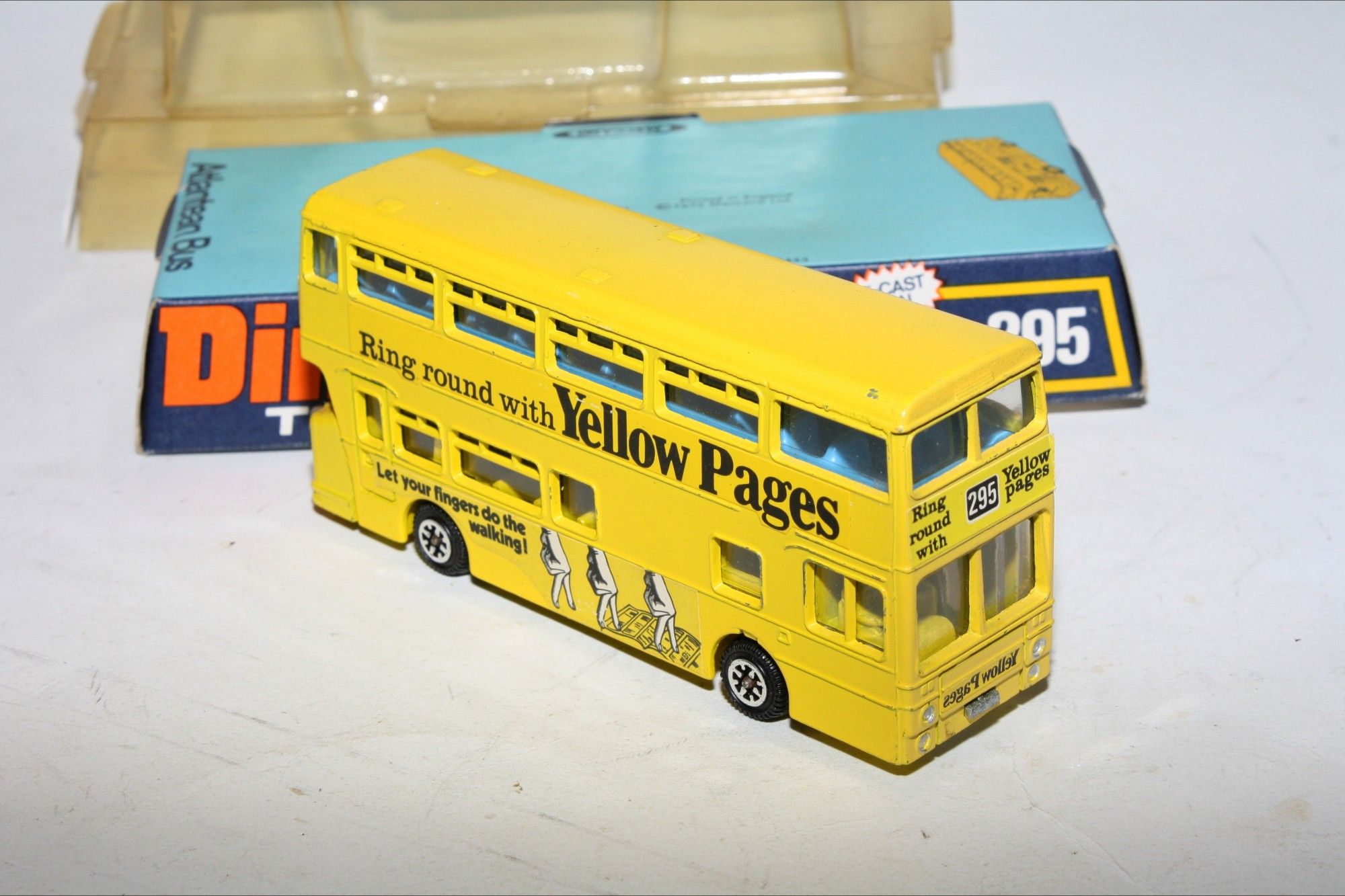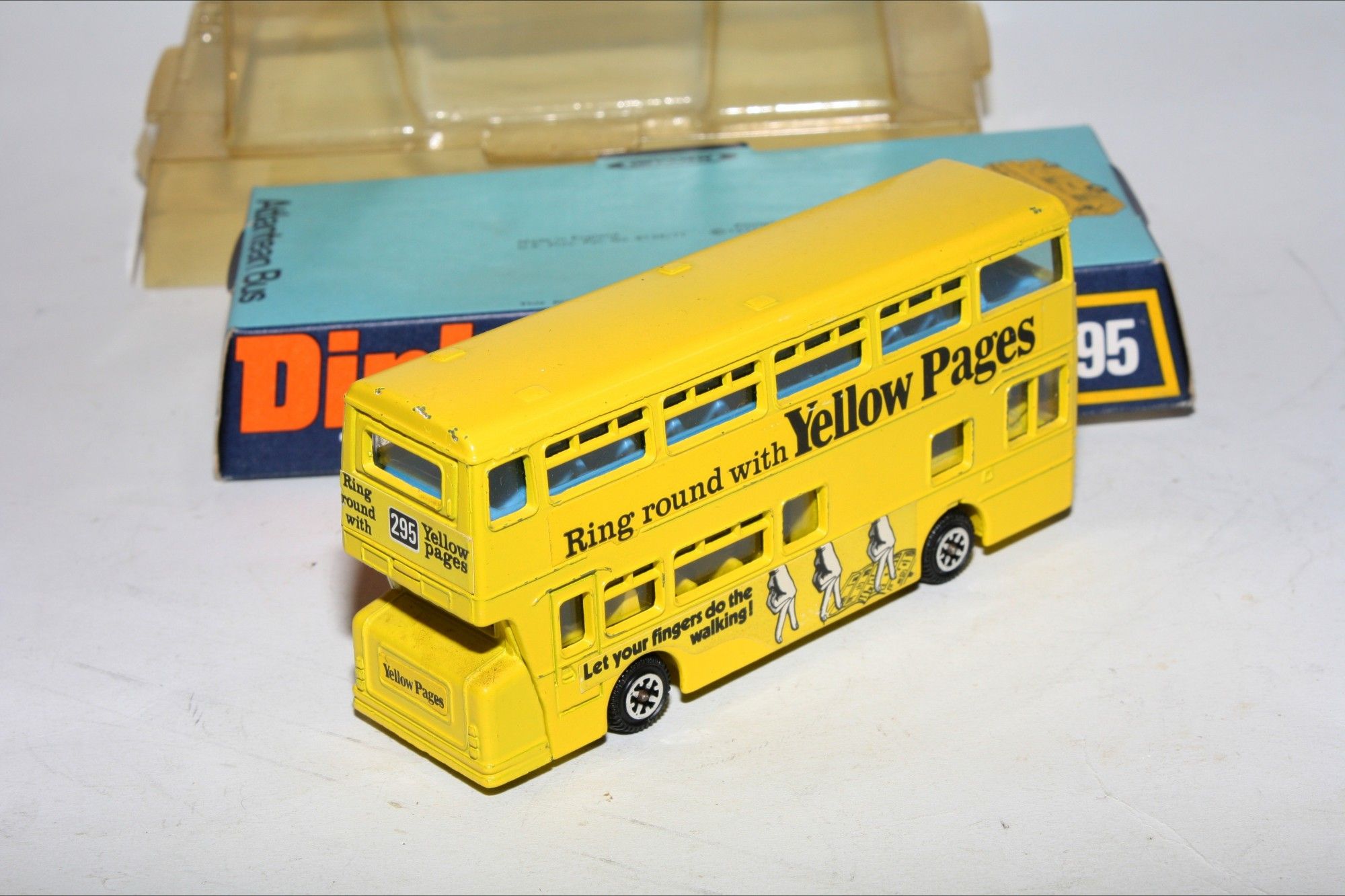A good example of this Dinky City bus. Original paintwork very good with a few small nicks, mainly to roof edges, please study the photos for exact condition. Perfect Speedwheels, crystal clear windows, factory error blue top interior and yellow lower, perfect Yellow Pages livery decals and 295 front and rear. Yellow engine cover and perfect baseplate