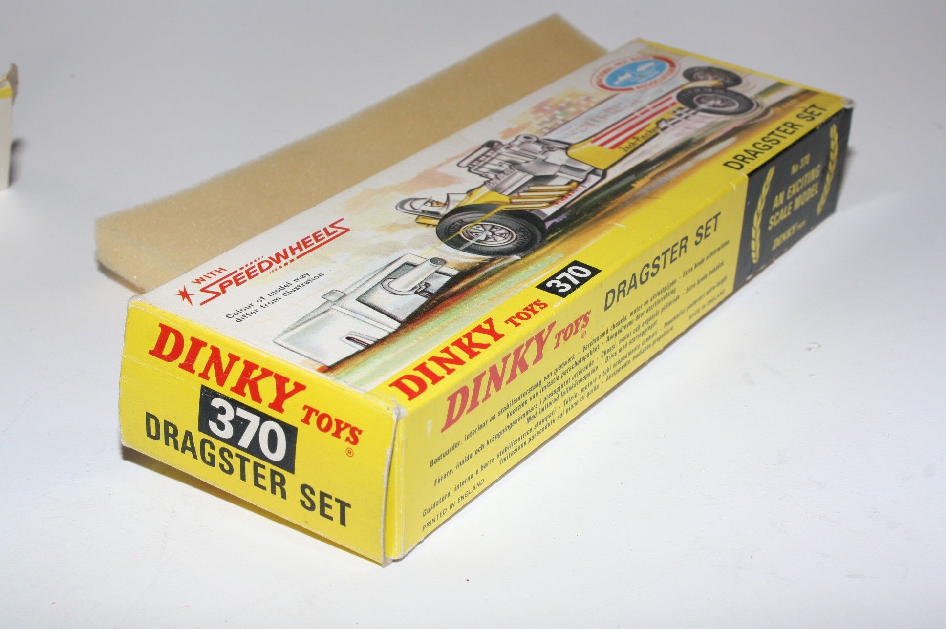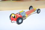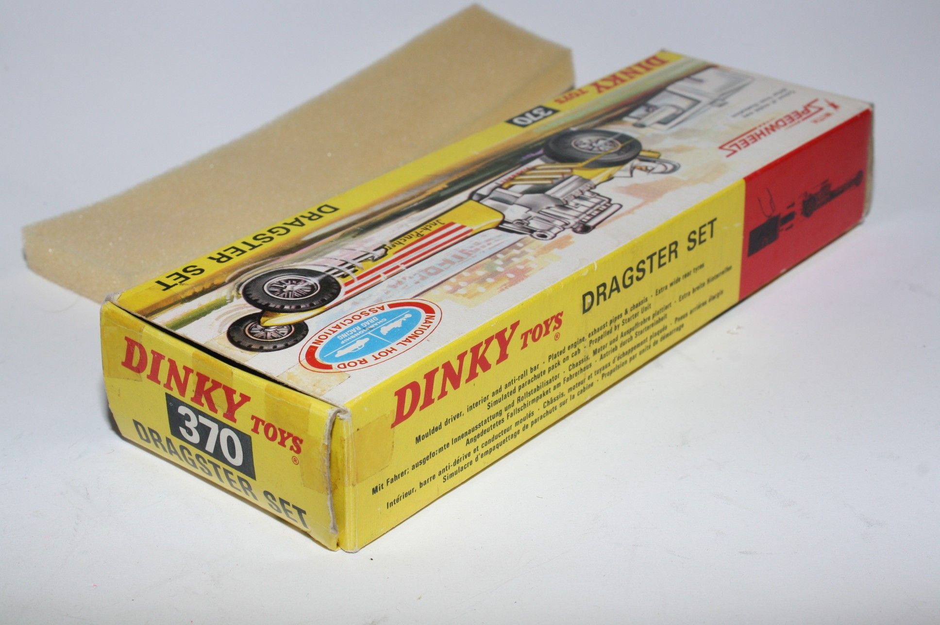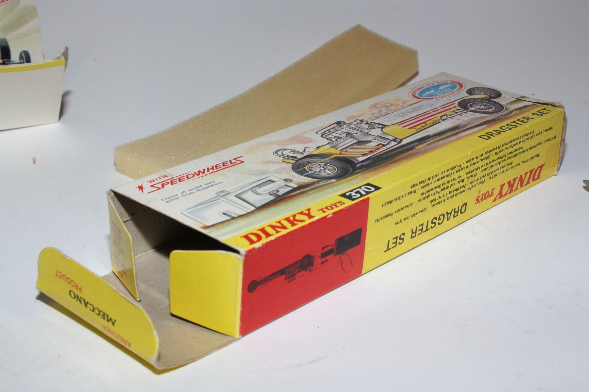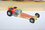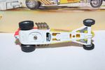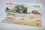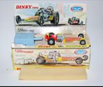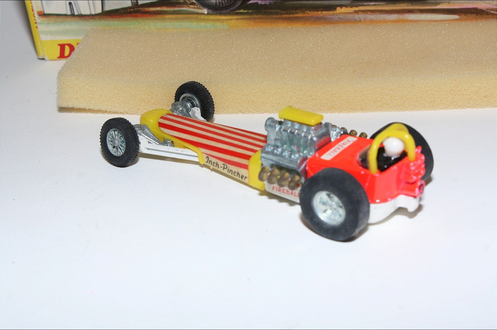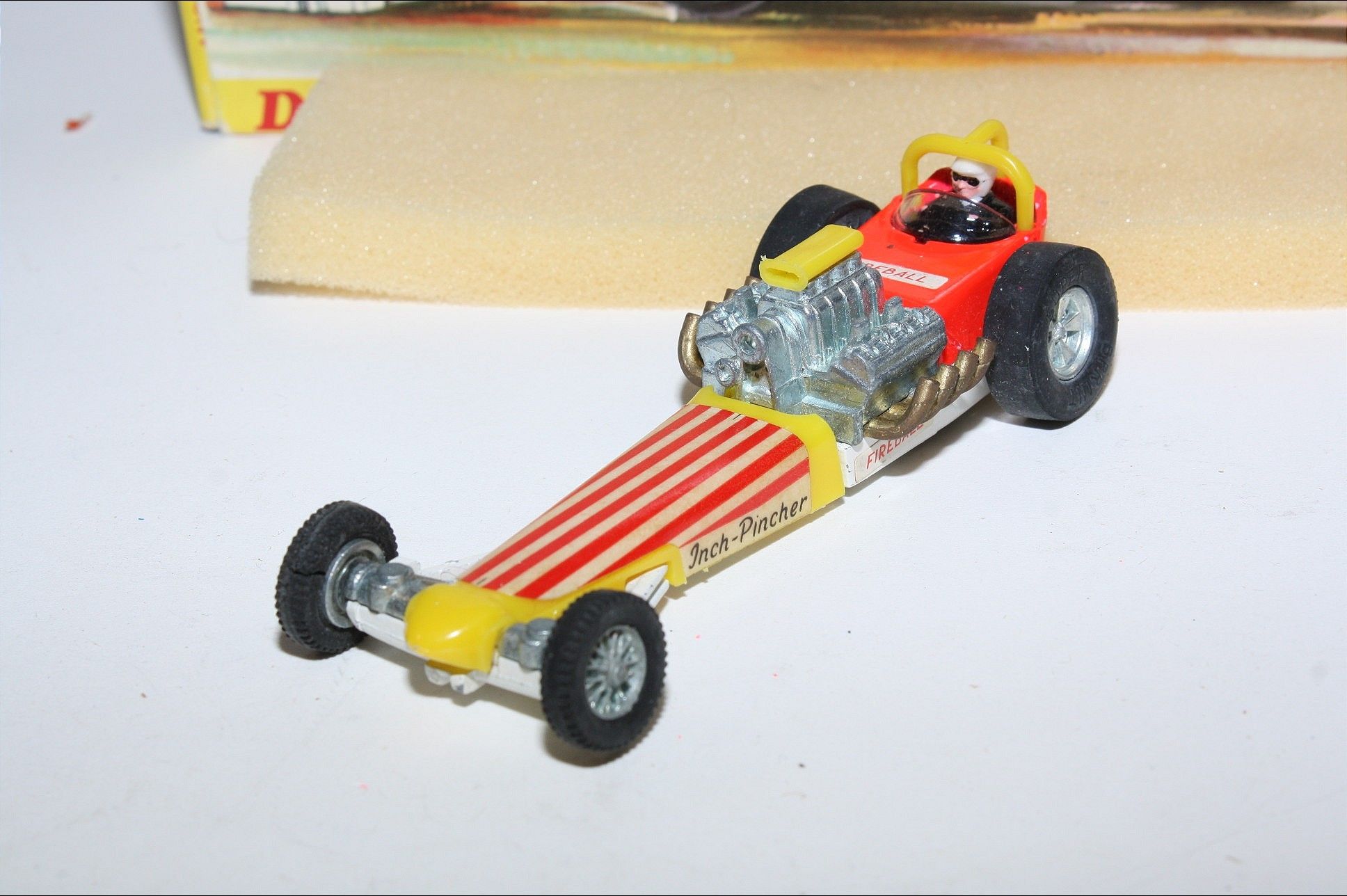 A superb example of this nice Dinky set. Original dayglow orange cockpit, lemon yellow plastic nose, lemon yellow engine air intake and roll cage, Fireball and Inch Pincher stickers good, white chassis, cast hubs, light blue starter unit - Excellent, (some paint nicks to starter connection point), driver figure.