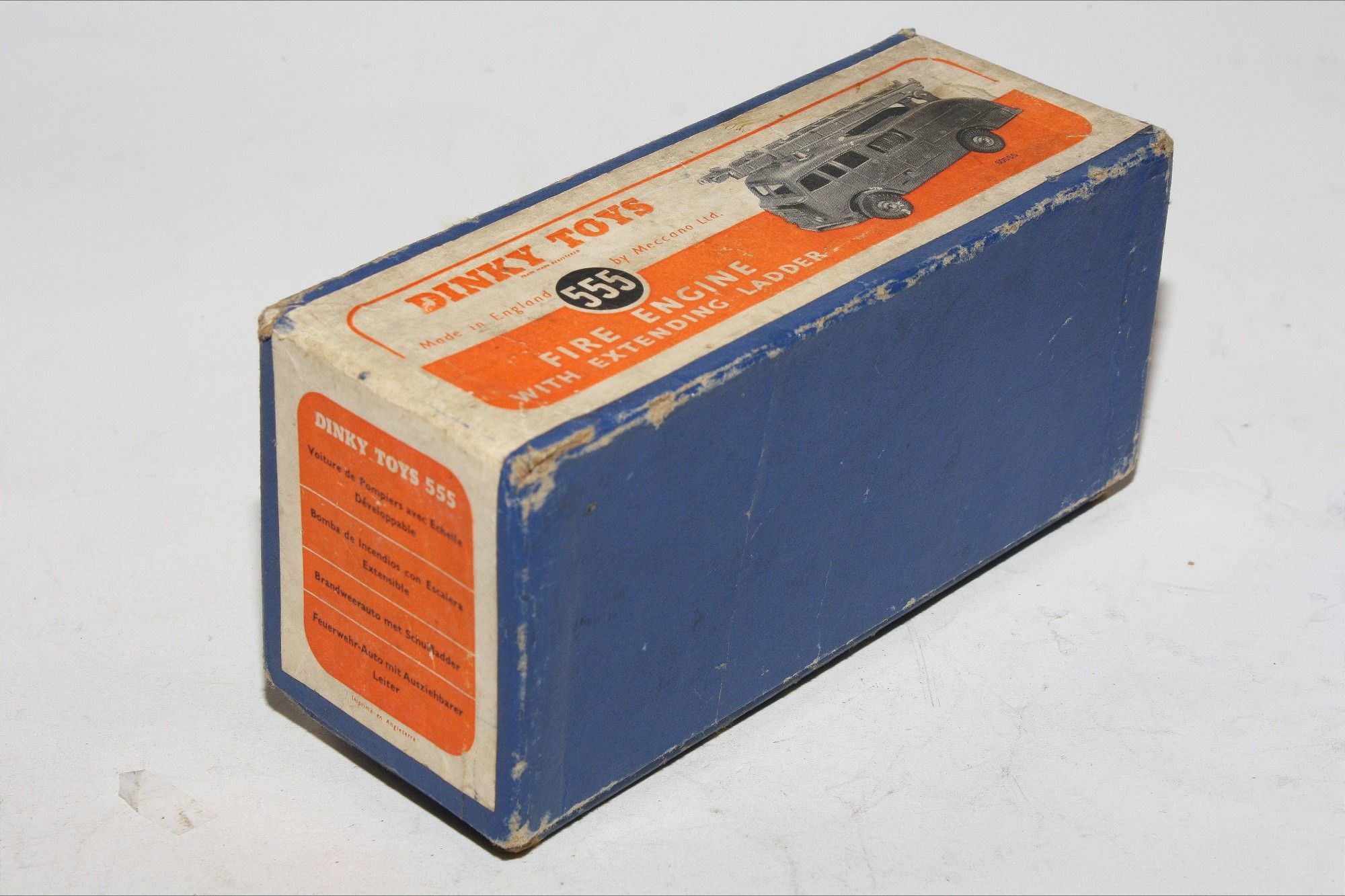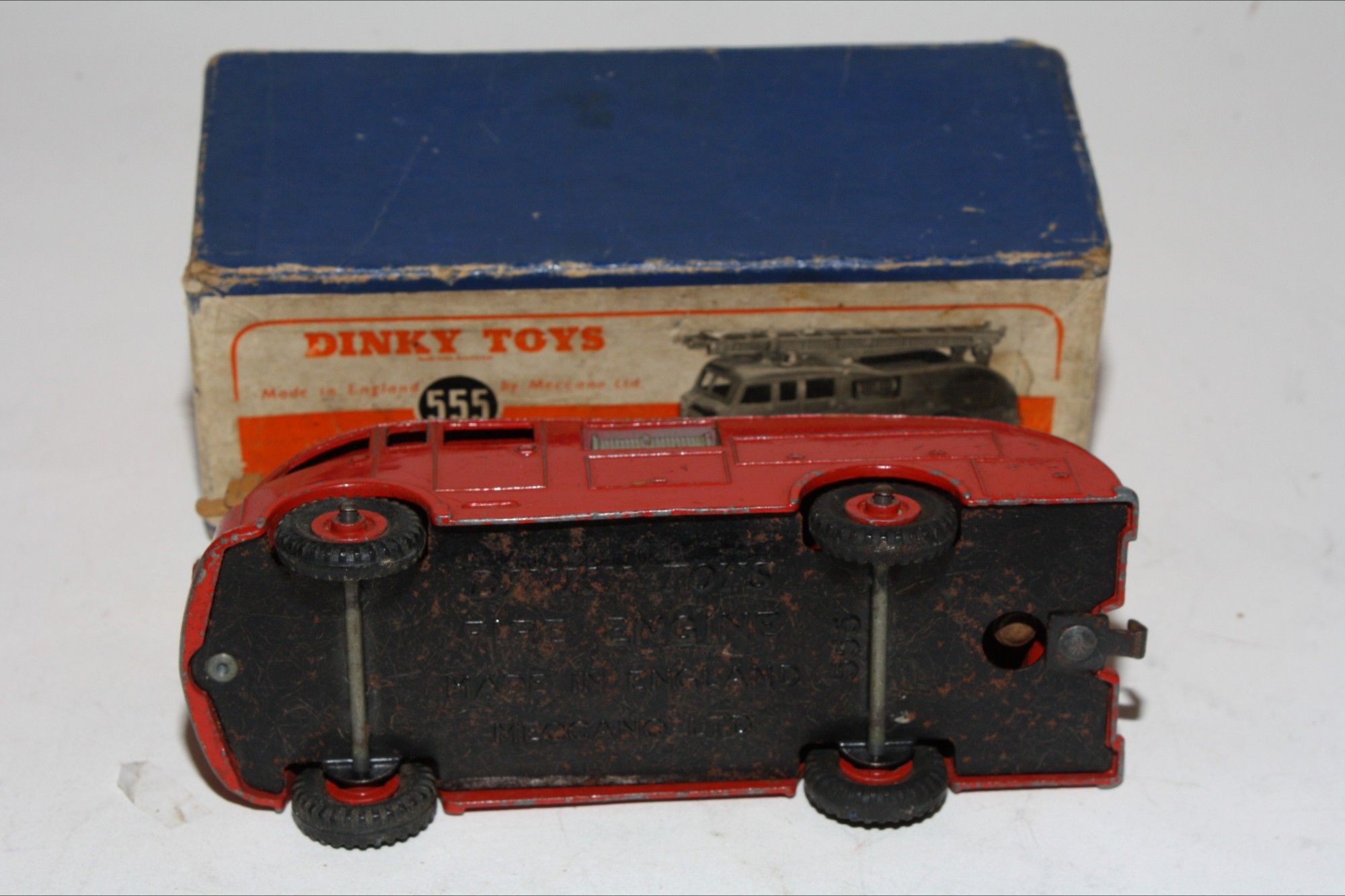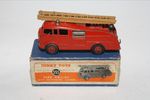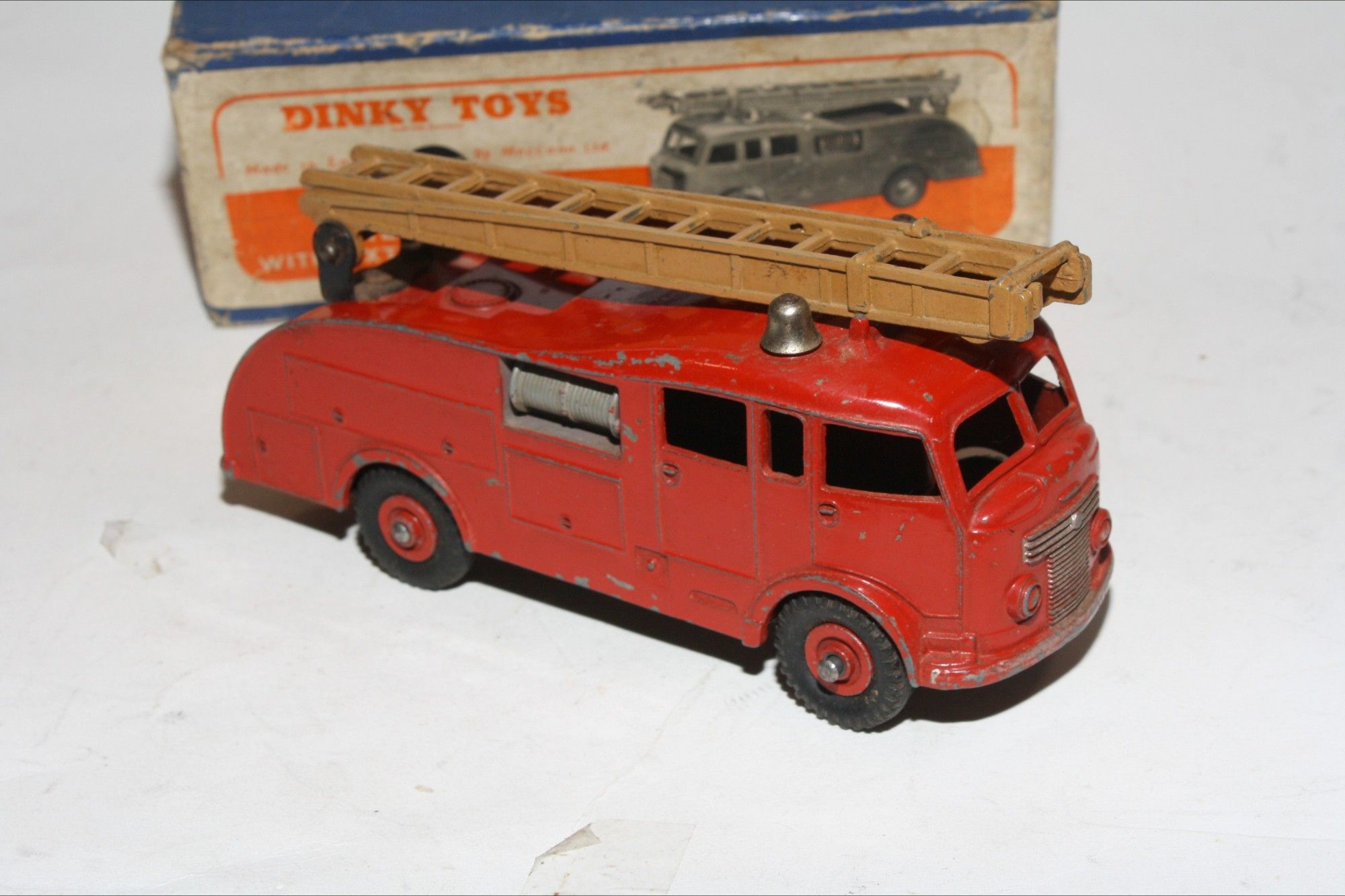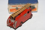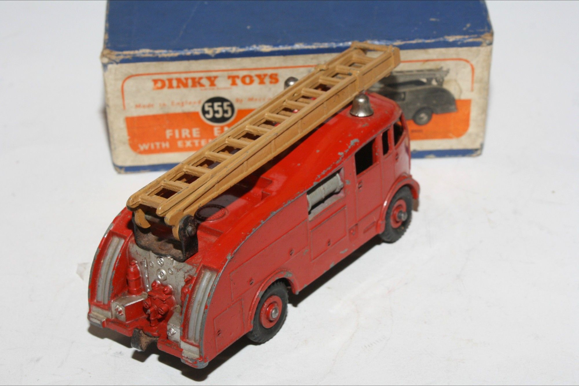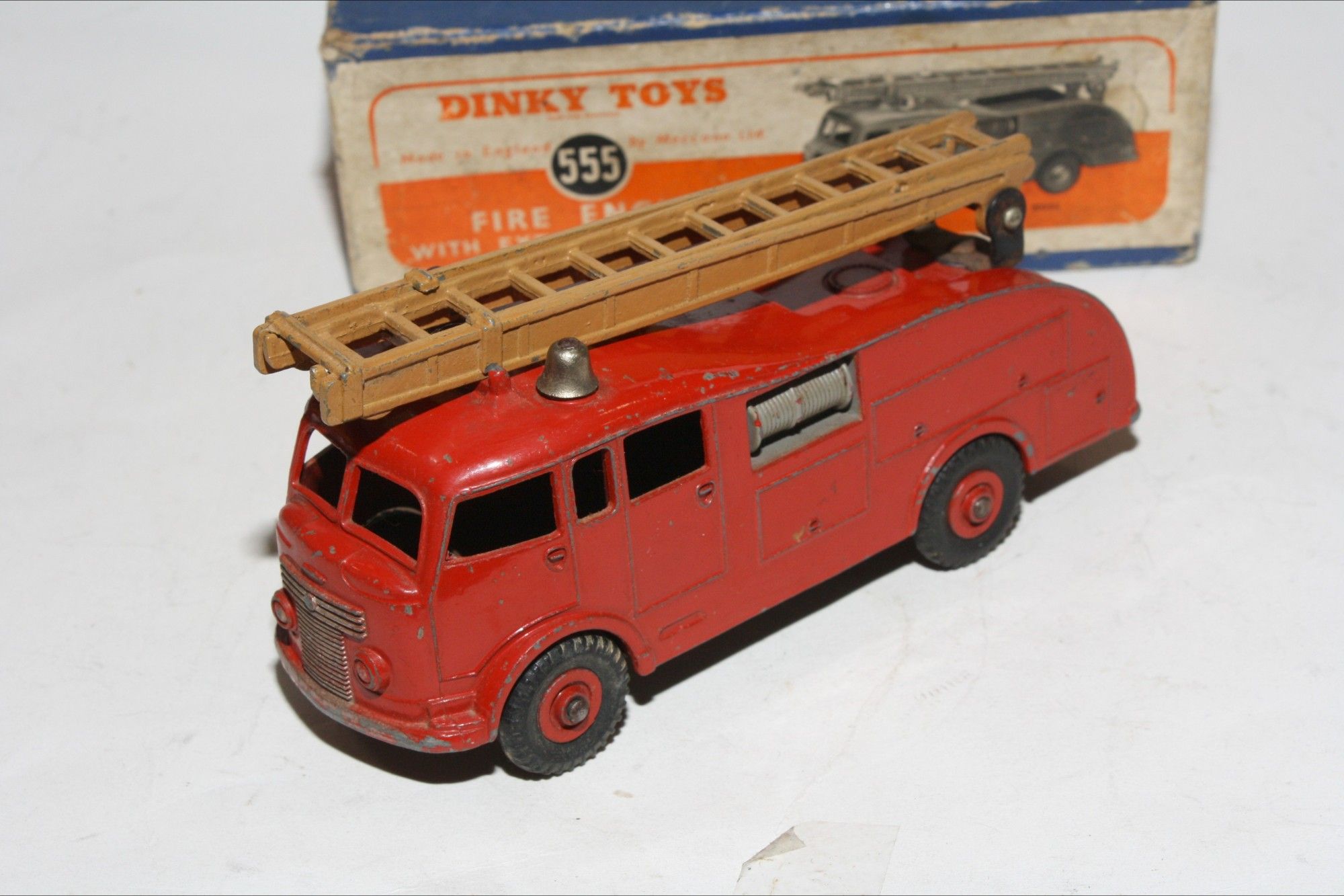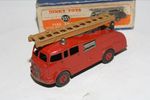 A superb example of this early 1950's issue Dinky model.This is the very rare version with a brown metal extending ladder only produced for three months (November 1952 – January 1953) and probably shorter, because in that period a change of ladder colour took place from brown to silver. Model 555 with the brown ladder is VERY scarce. Original red paintwork is good with some chips/rubs, please study the photos for exact condition. Original tyres on metal hubs, free rolling axles, extension ladder section present and perfect tin baseplate.