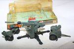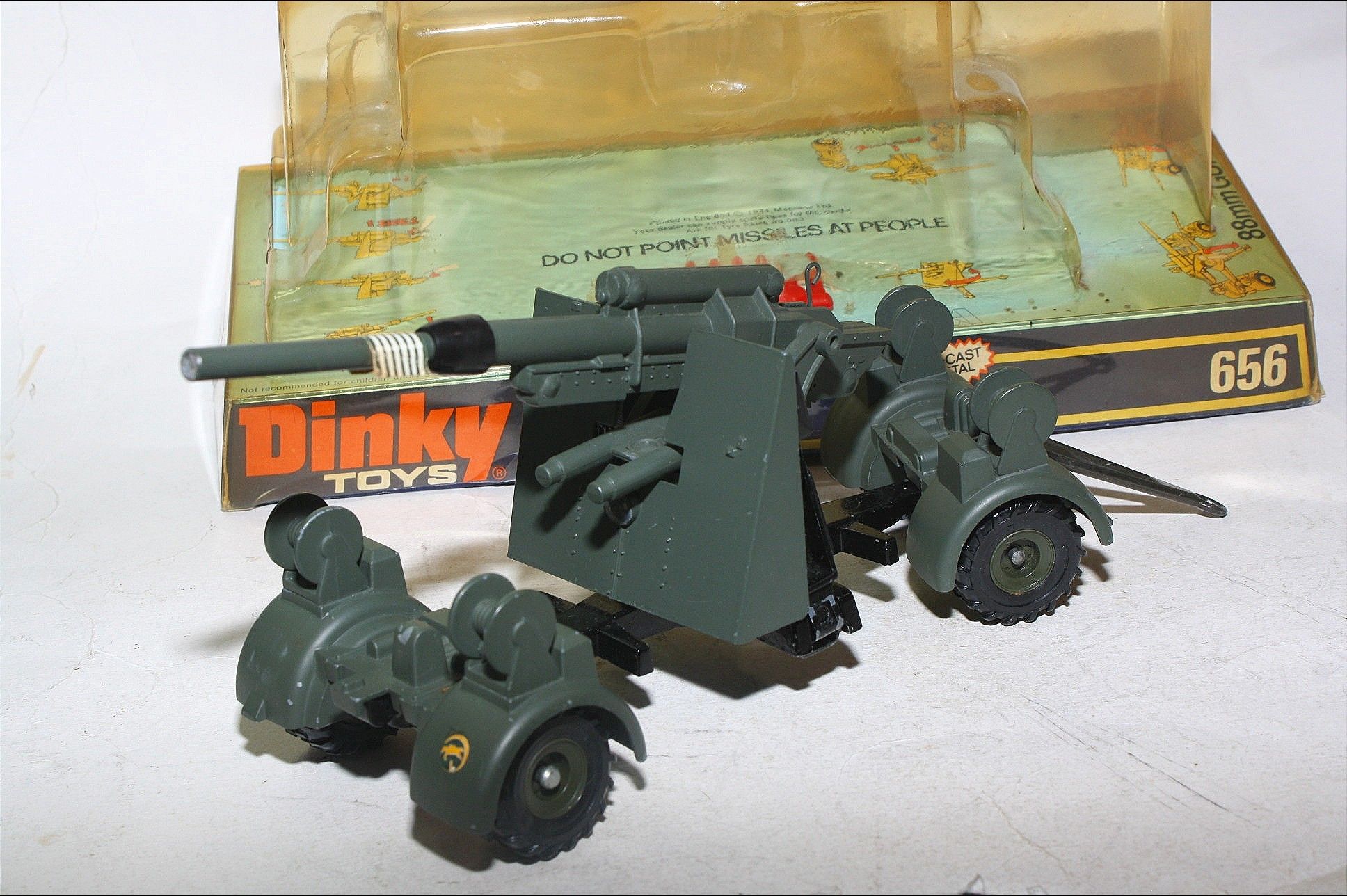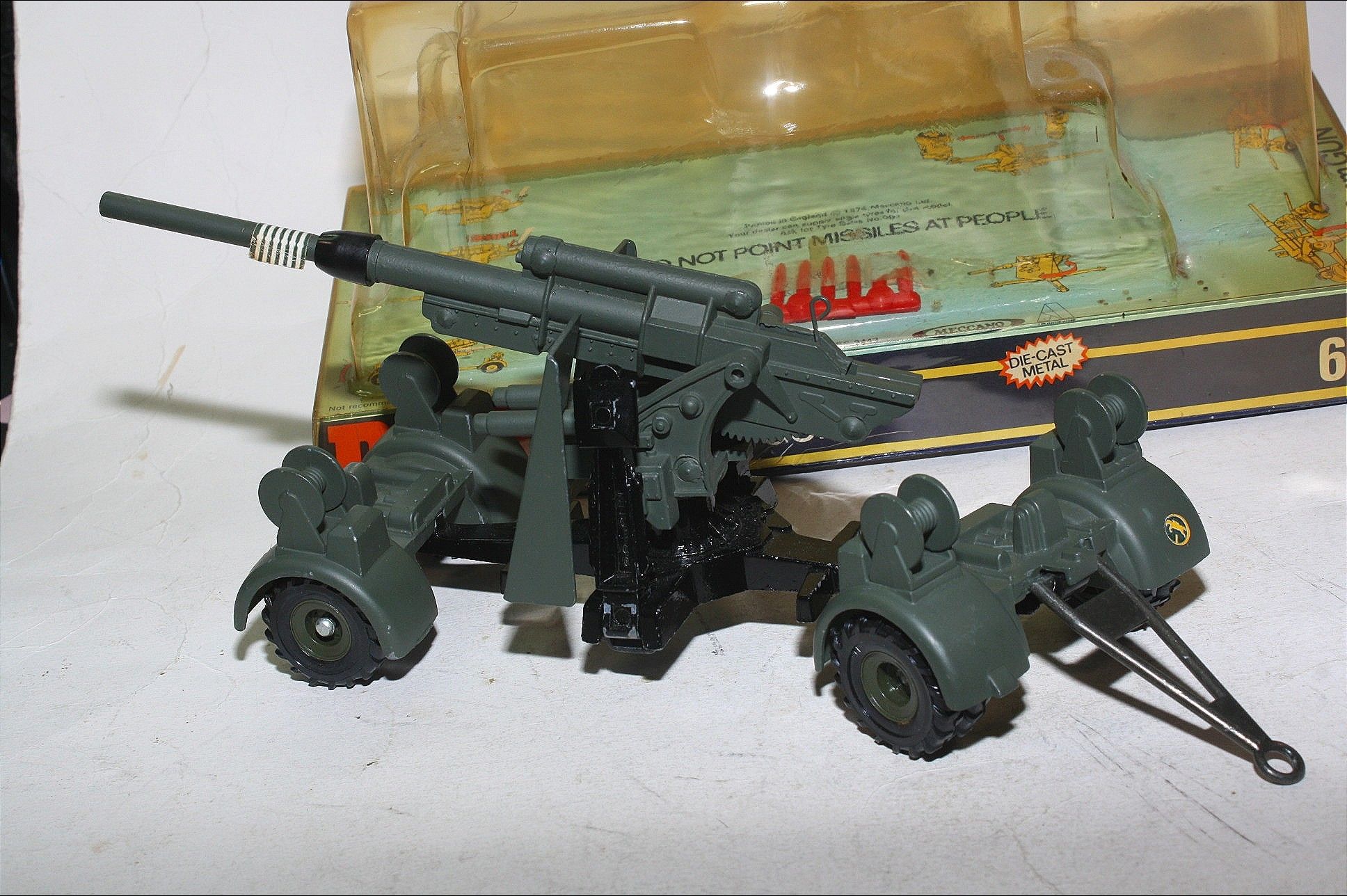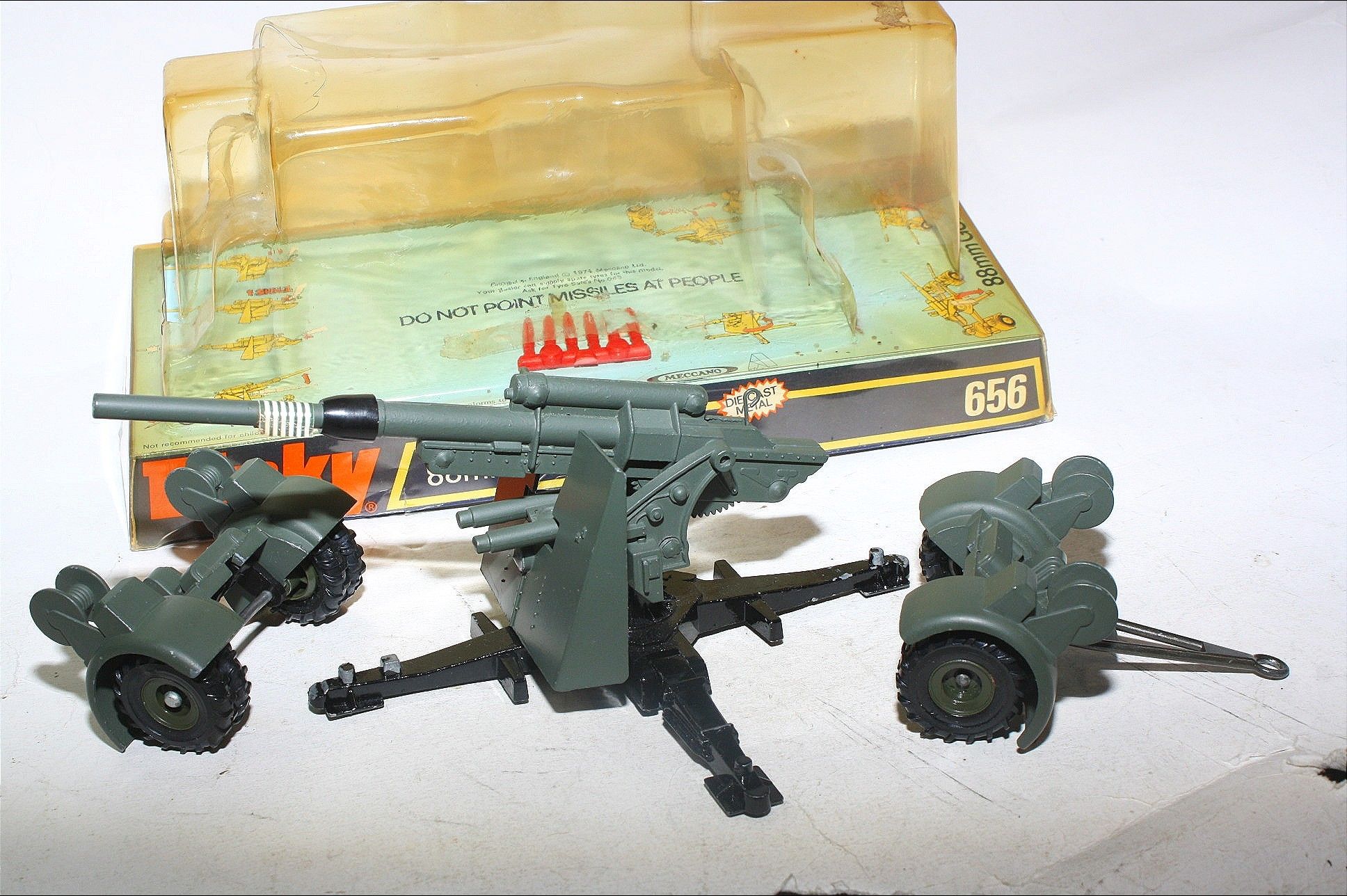 A superb example of this great military model. Original olive drab paintwork is excellent but with a few tiny chips and some wear where dollys have been removed, please study the photos for exact condition. Mint wheels and tyres, removable dollys, elevating gun, fold down legs, original missiles on sprue, mint underside.