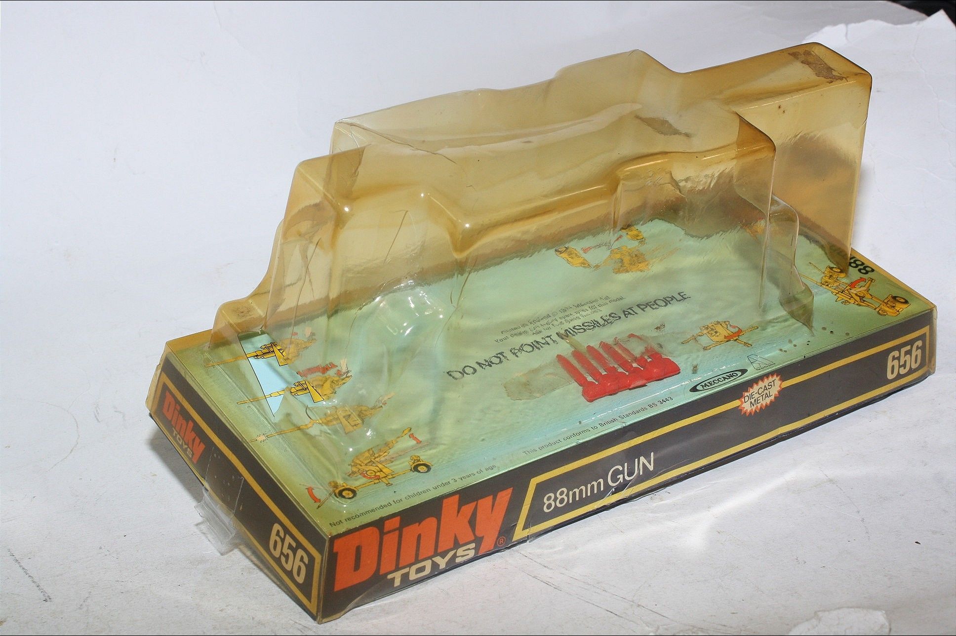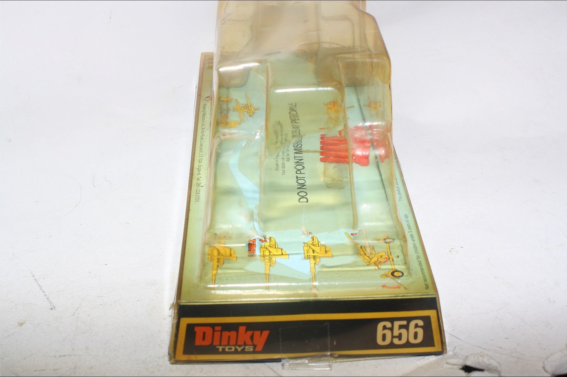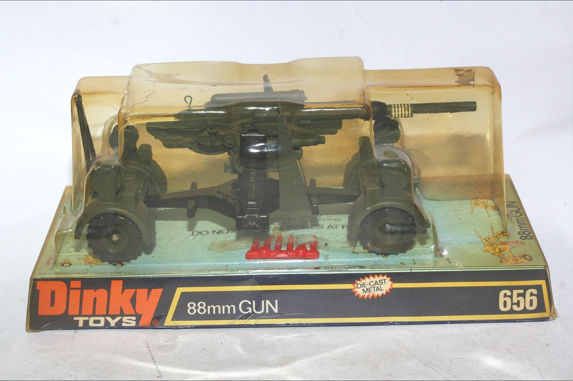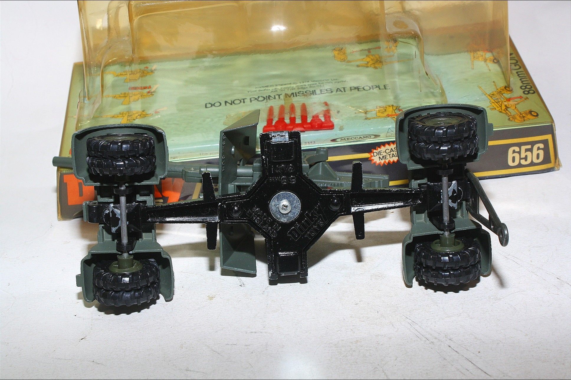 A superb example of this great military model. Original olive drab paintwork is excellent but with a few tiny chips and some wear where dollys have been removed, please study the photos for exact condition. Mint wheels and tyres, removable dollys, elevating gun, fold down legs, original missiles on sprue, mint underside.