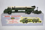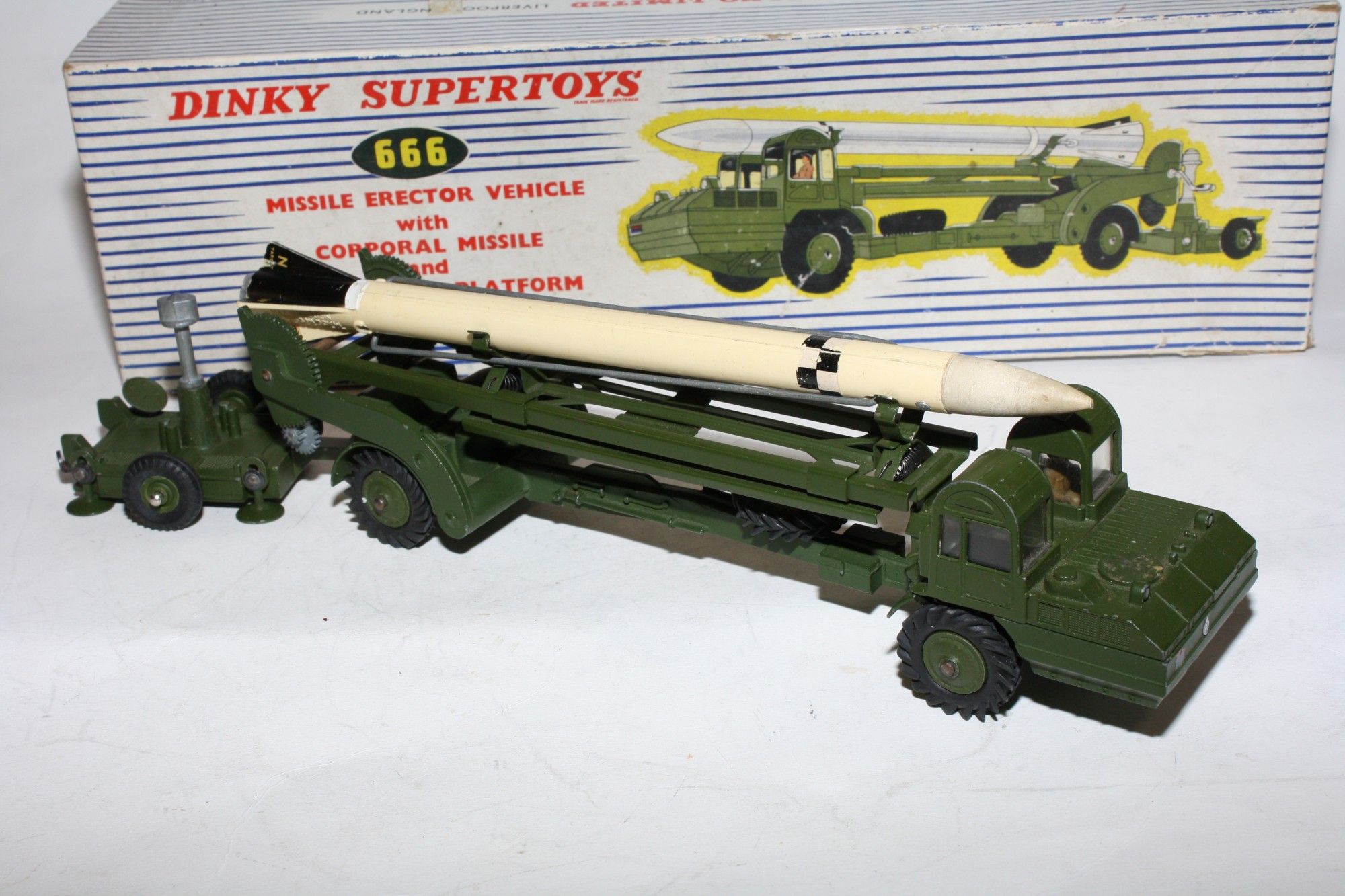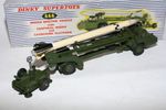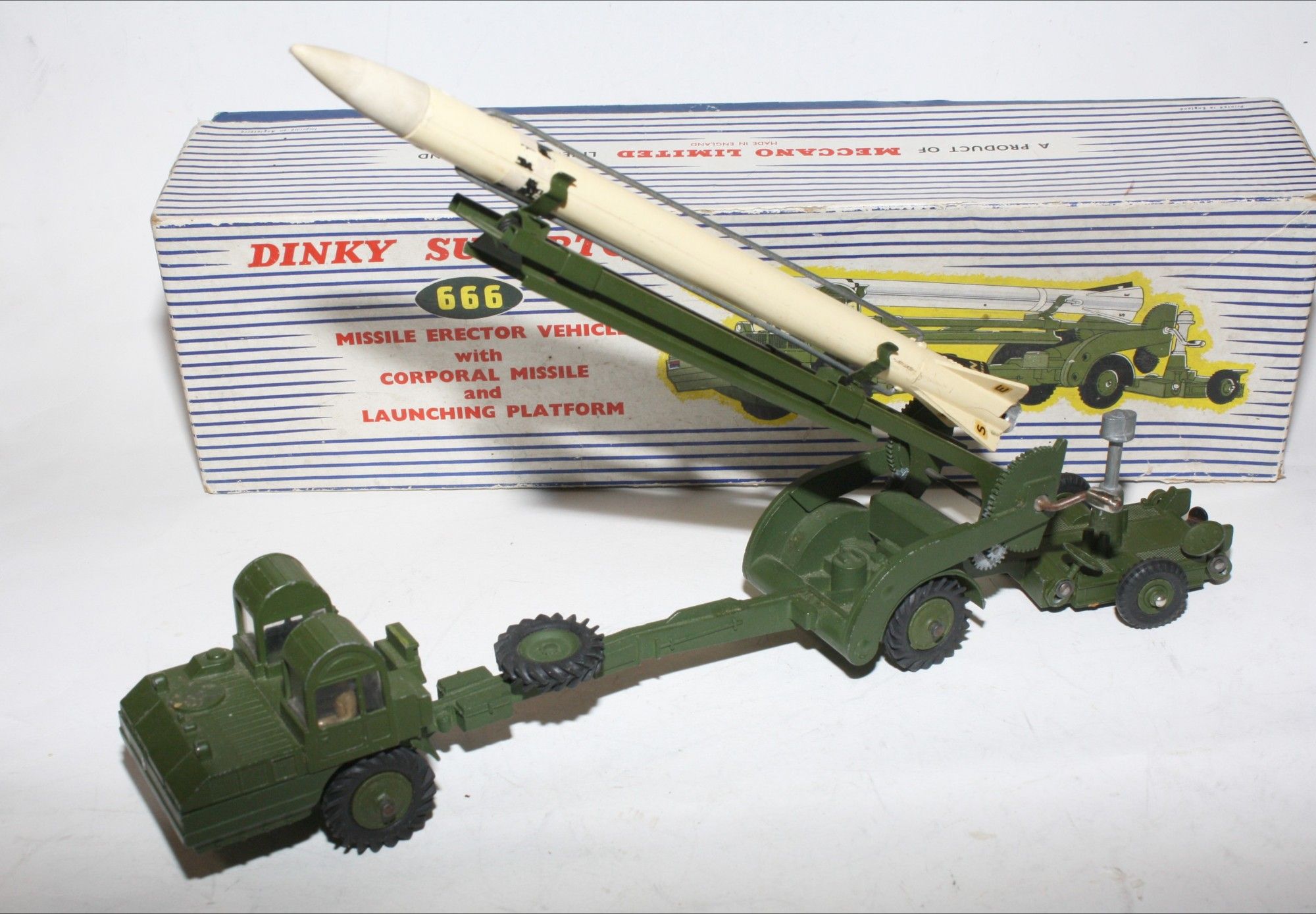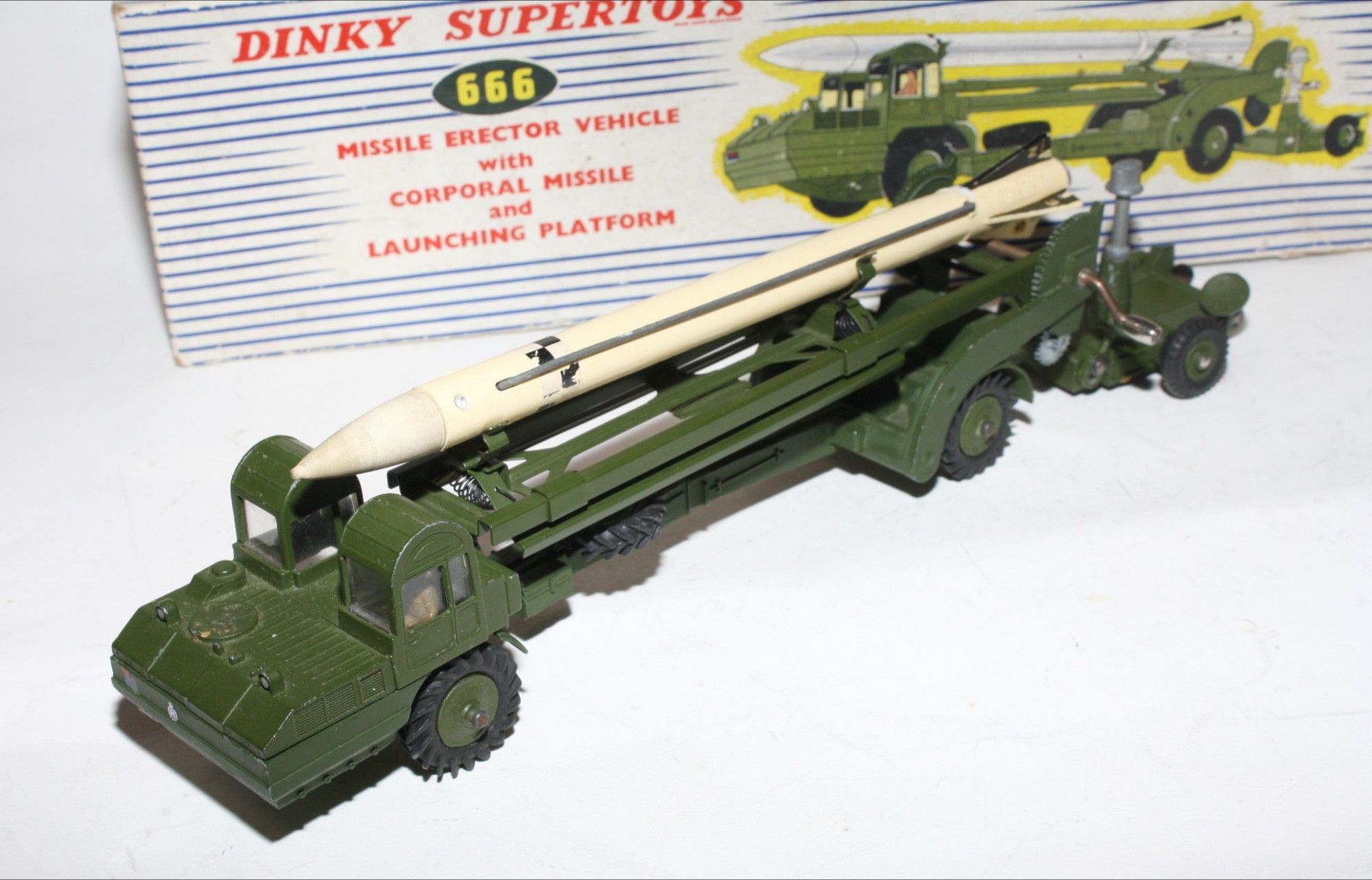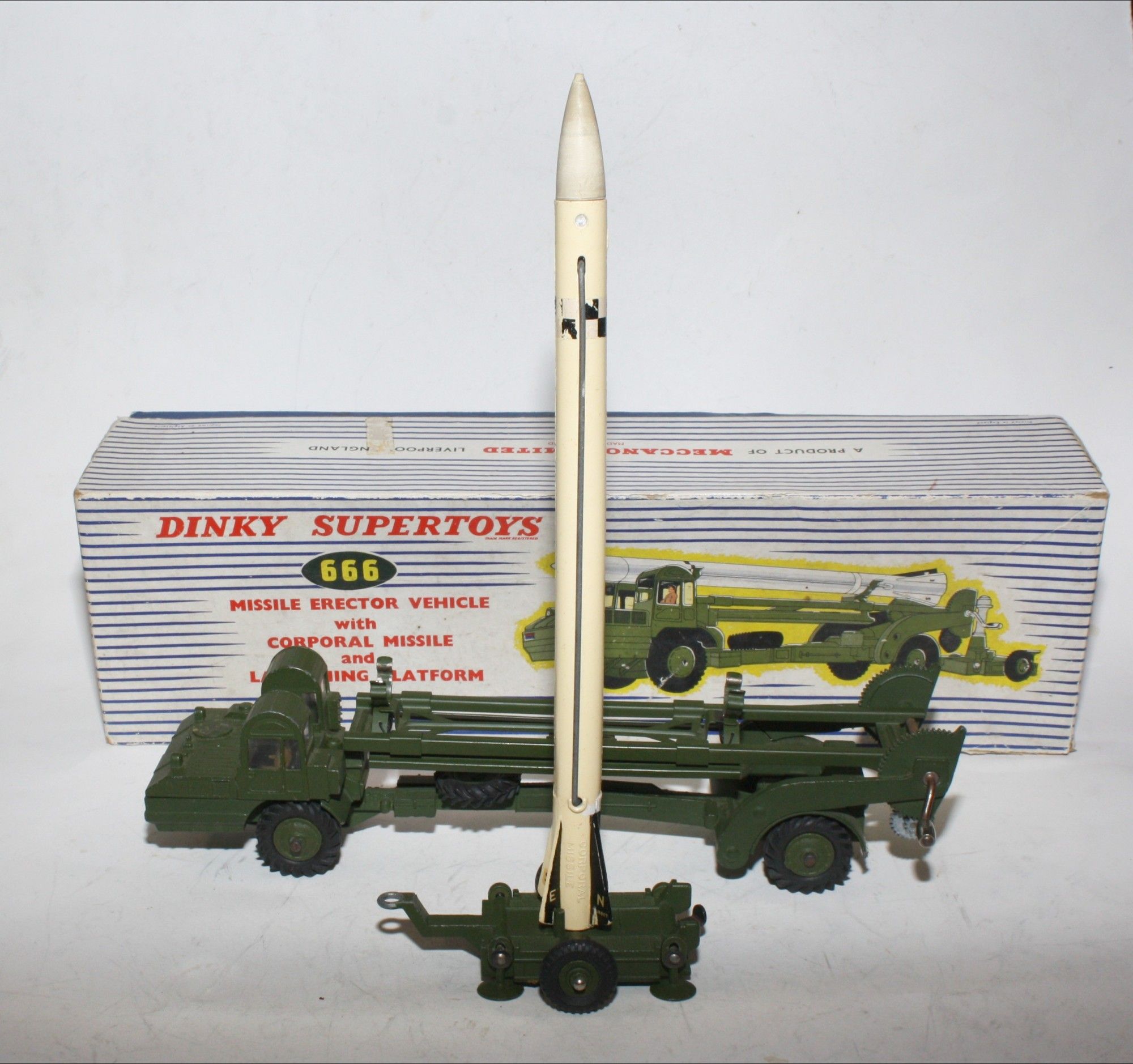 A superb example of this 1960's vintage military model. Original olive drab paintwork is virtually mint, please study the photos for exact condition. Excellent original tyres on metal hubs, straight axles, windows perfect with driver figure, launcher lifting mechanism smooth as silk, fully working, launch pad all all complete with 4 stablisers, missile in excellent condition with original nose cone . Mint underside.
