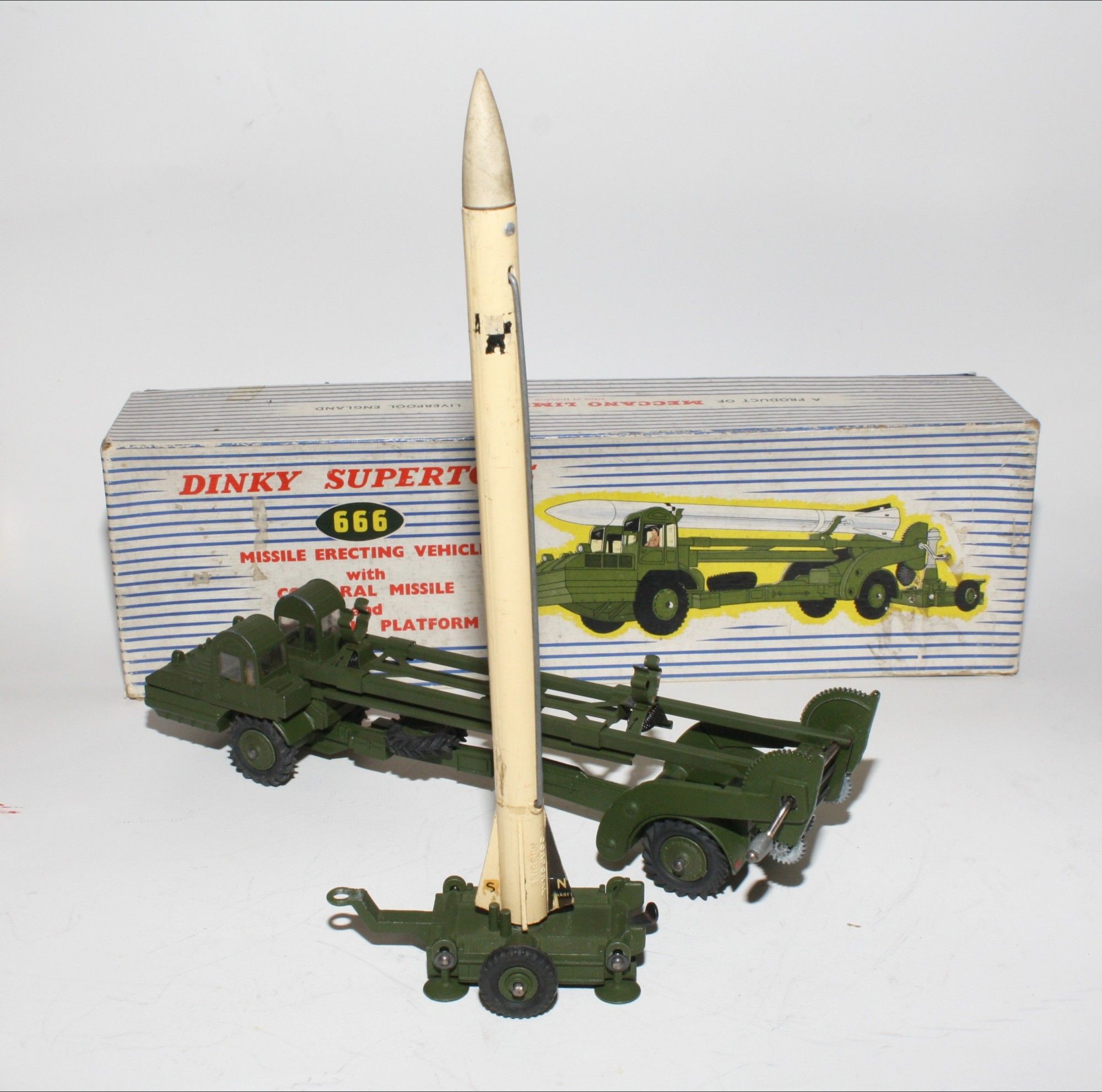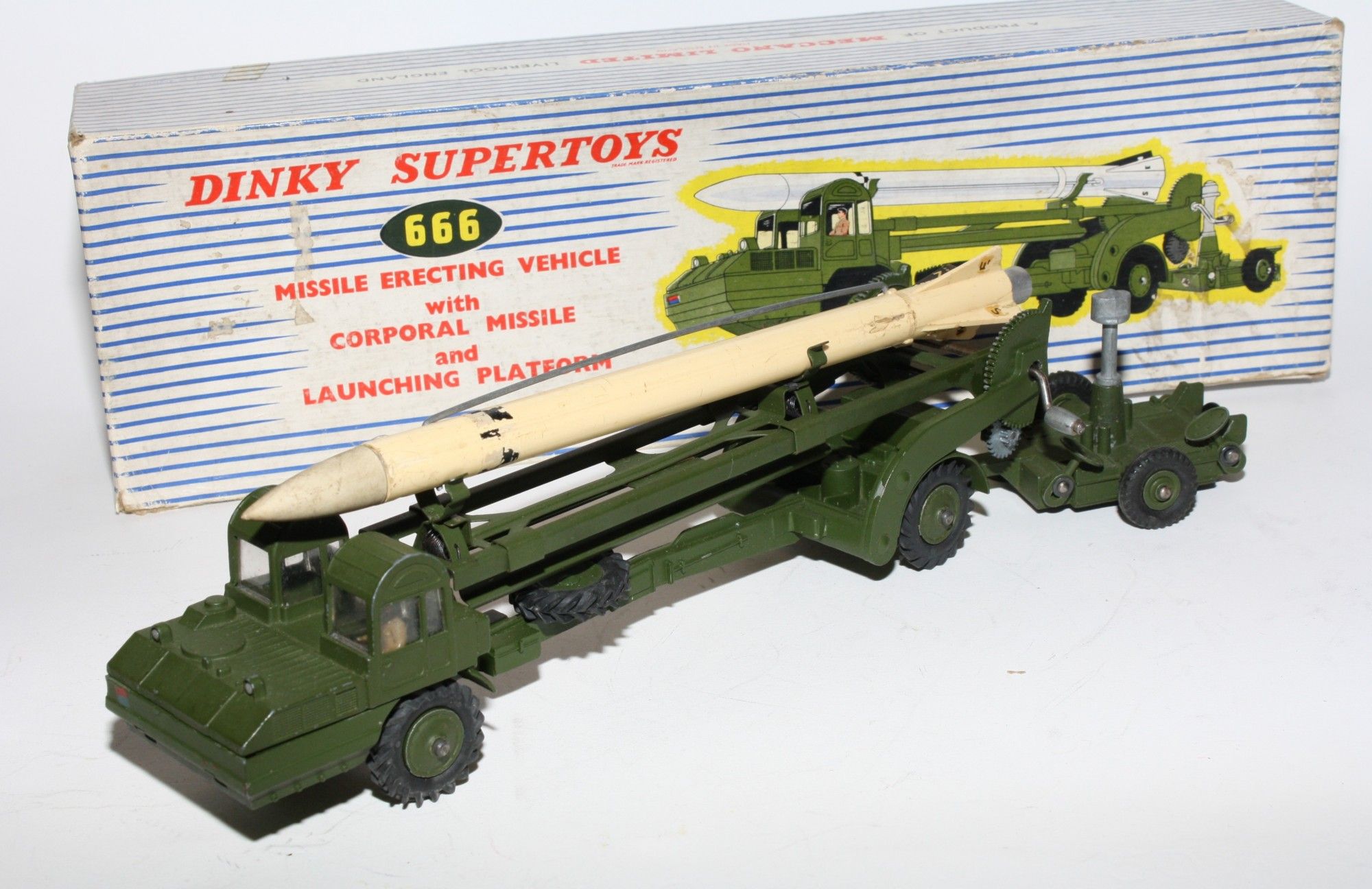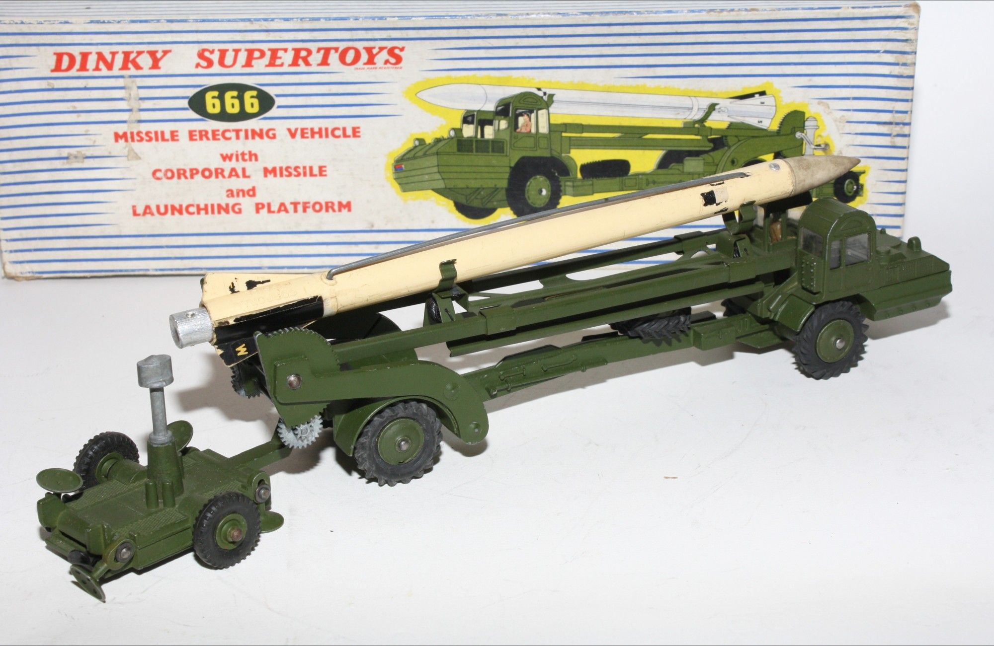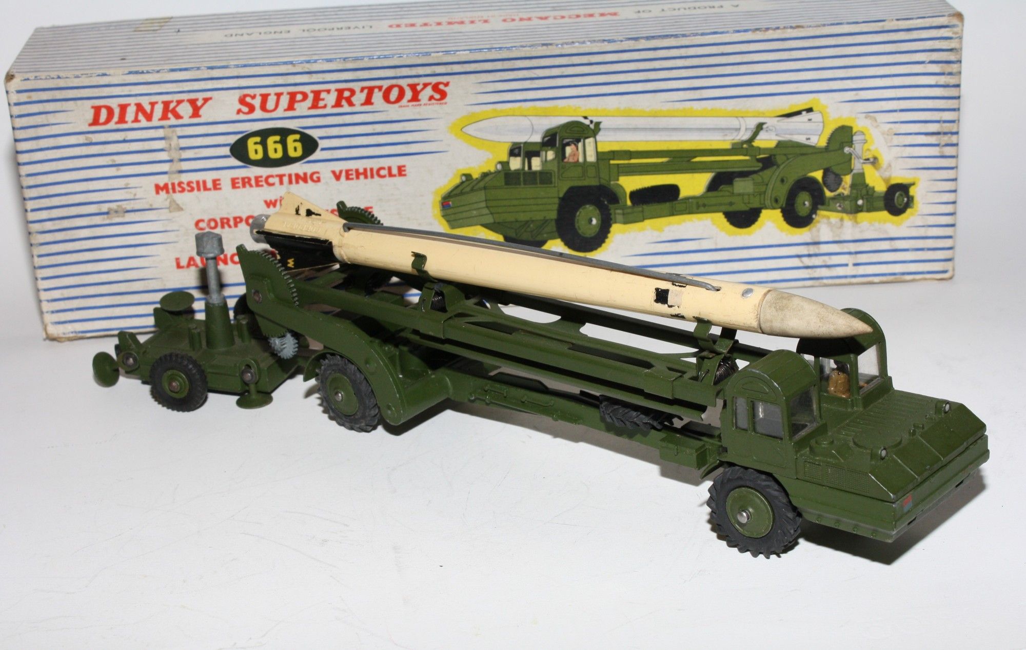 A nice example of this 1960's vintage military model. Original olive drab paintwork is near mint with a few small nicks/rubs, please study the photos for exact condition. Excellent original tyres on metal hubs, straight axles, windows perfect with driver figure, launcher lifting mechanism fully working, launch pad all all complete with 4 stabilisers, missile in good condition but one wire is missing from the missile side but I have tested using the spring loaded lockdown which works fine. Original nose cone which is present. Mint underside.
