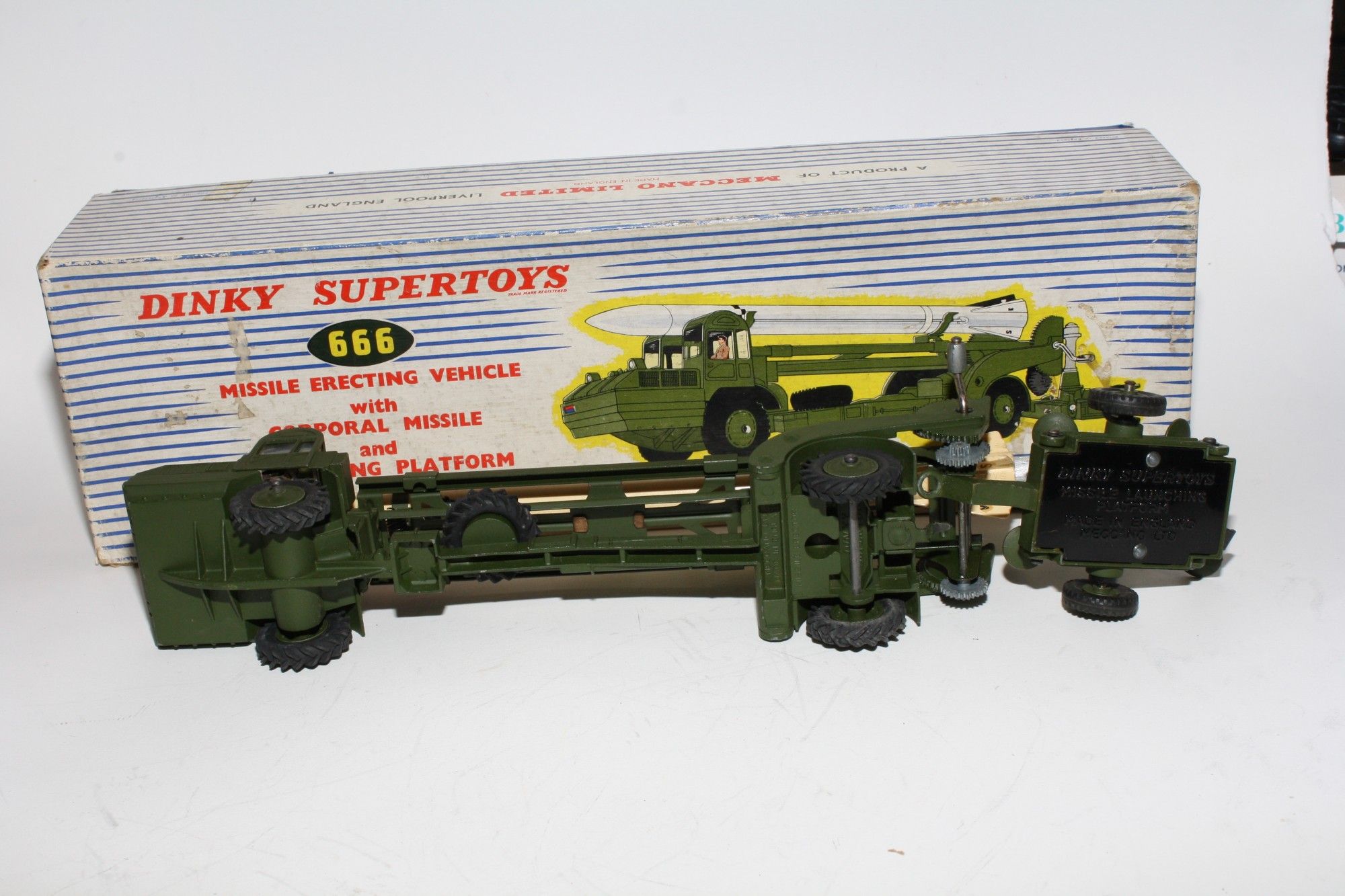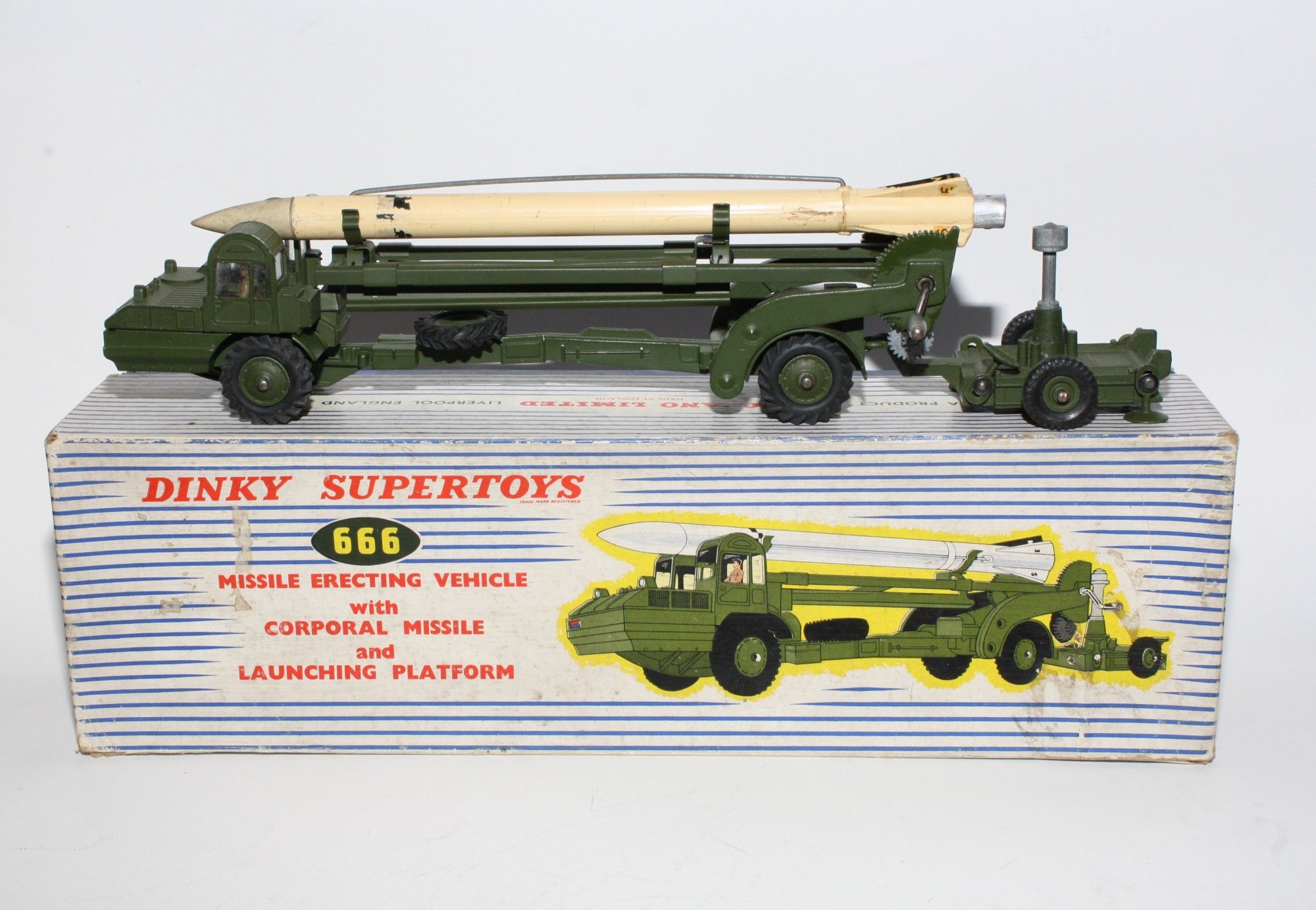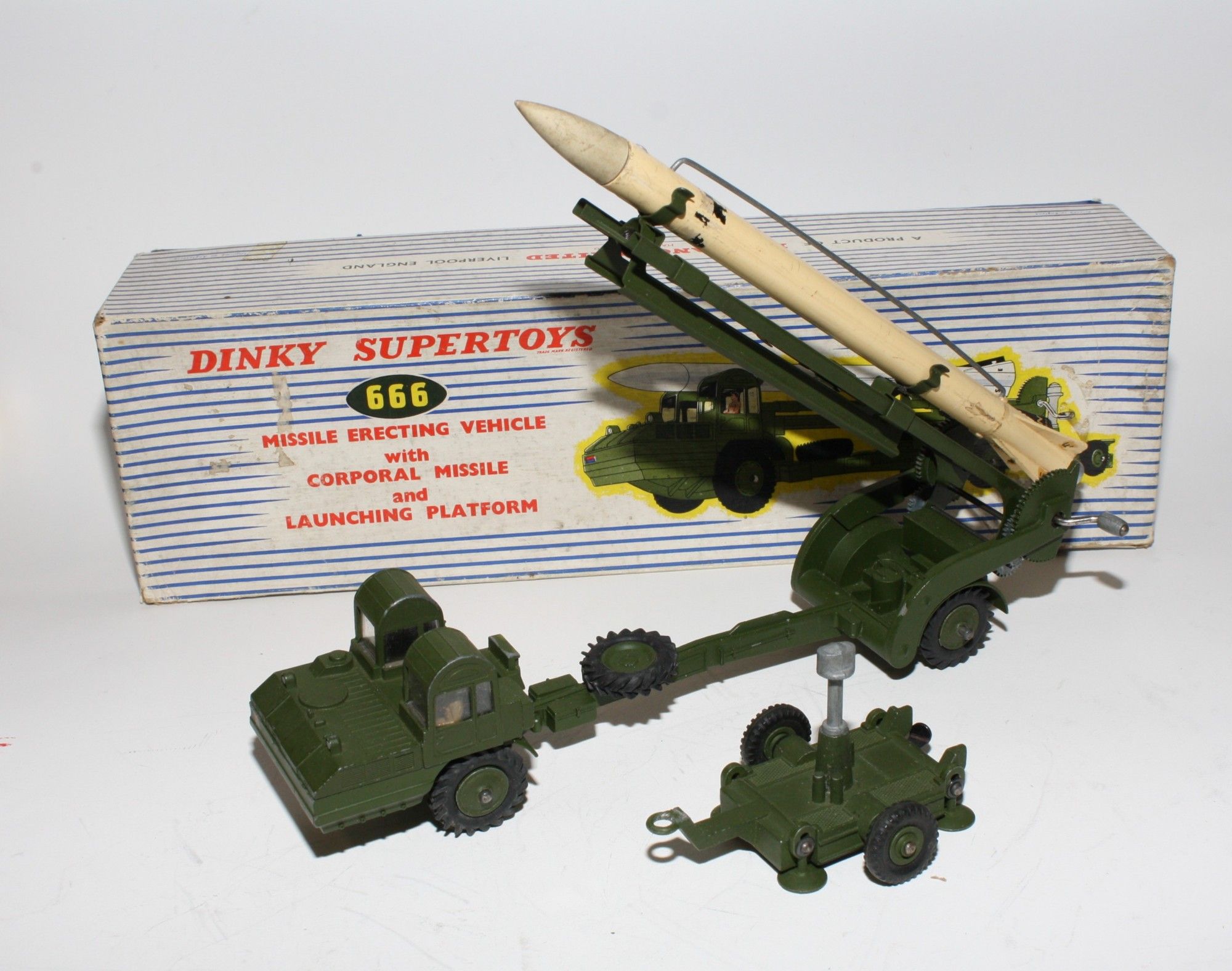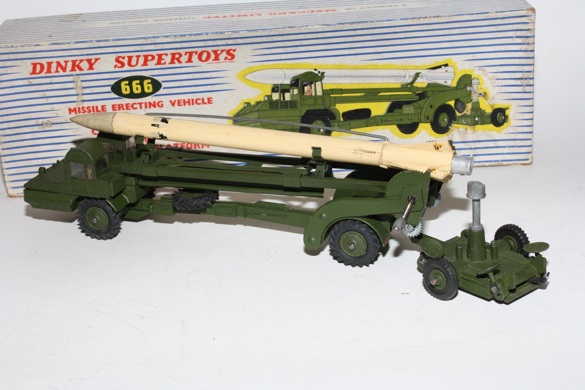 A nice example of this 1960's vintage military model. Original olive drab paintwork is near mint with a few small nicks/rubs, please study the photos for exact condition. Excellent original tyres on metal hubs, straight axles, windows perfect with driver figure, launcher lifting mechanism fully working, launch pad all all complete with 4 stabilisers, missile in good condition but one wire is missing from the missile side but I have tested using the spring loaded lockdown which works fine. Original nose cone which is present. Mint underside.