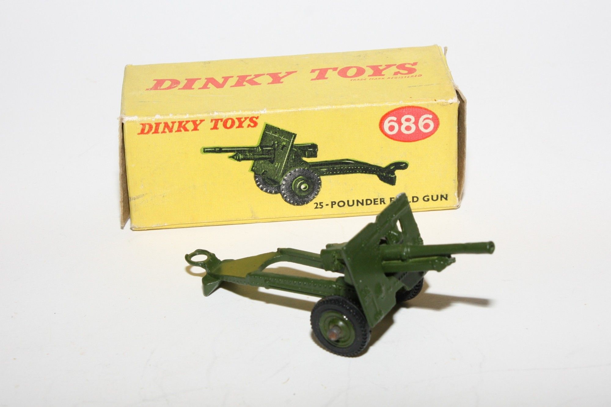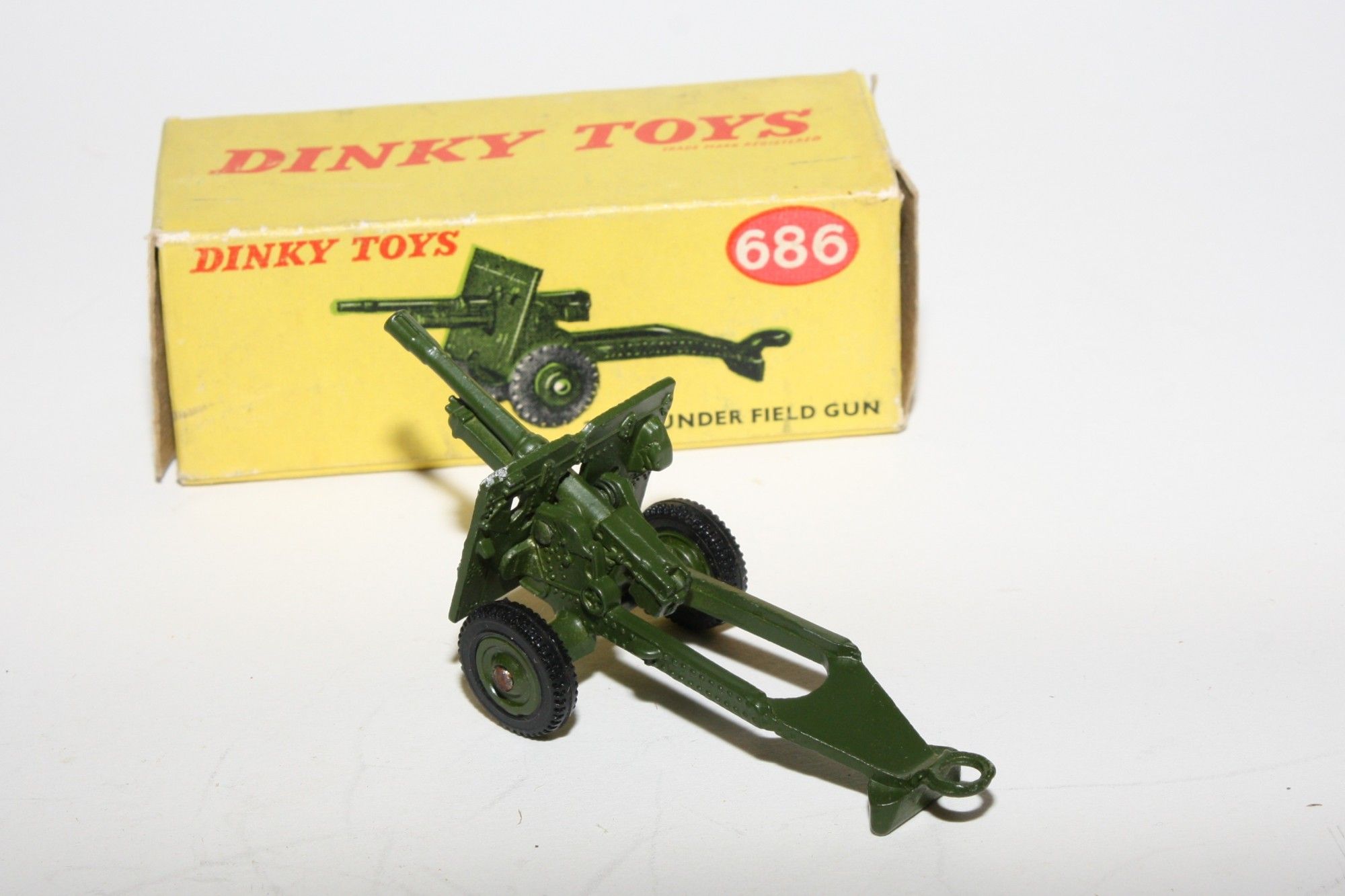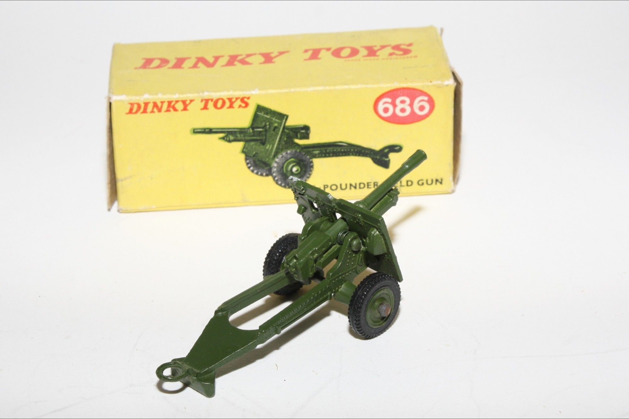 A superb example of this vintage Dinky military model. Original paintwork is virtually mint, please study the photos for exact condition. Good original tyres on later plastic hubs, elevating gun and good towing eye. Underside excellent.