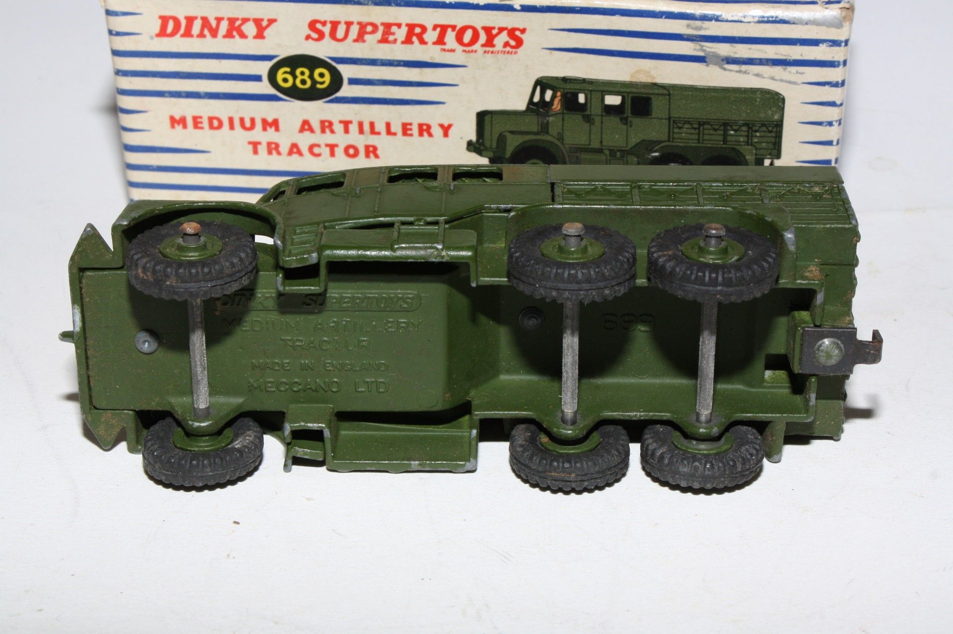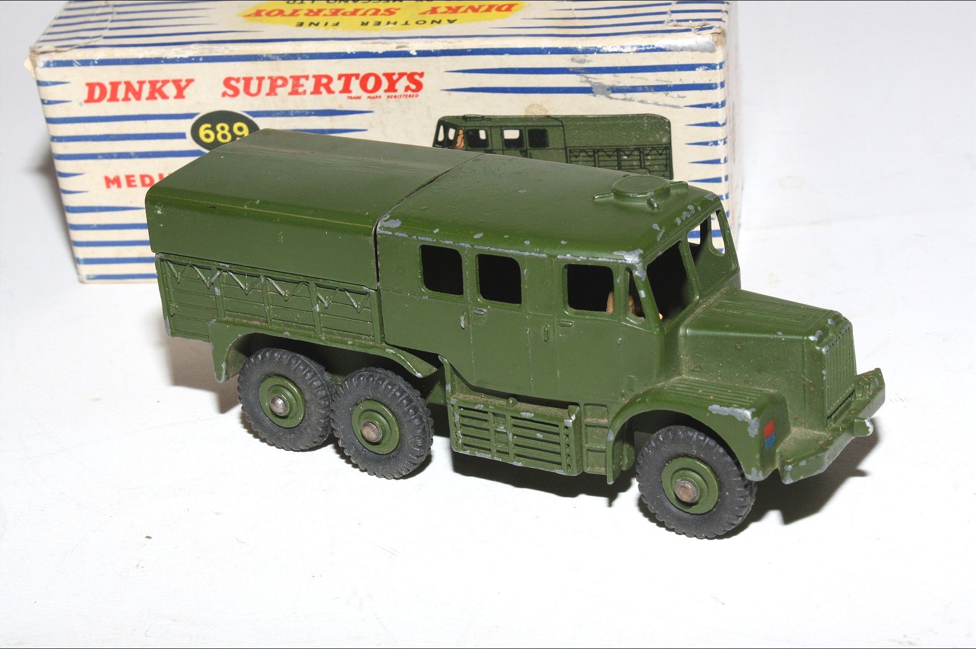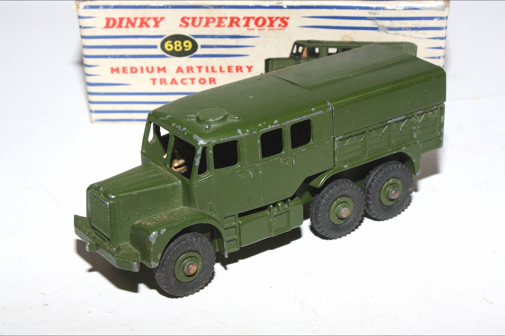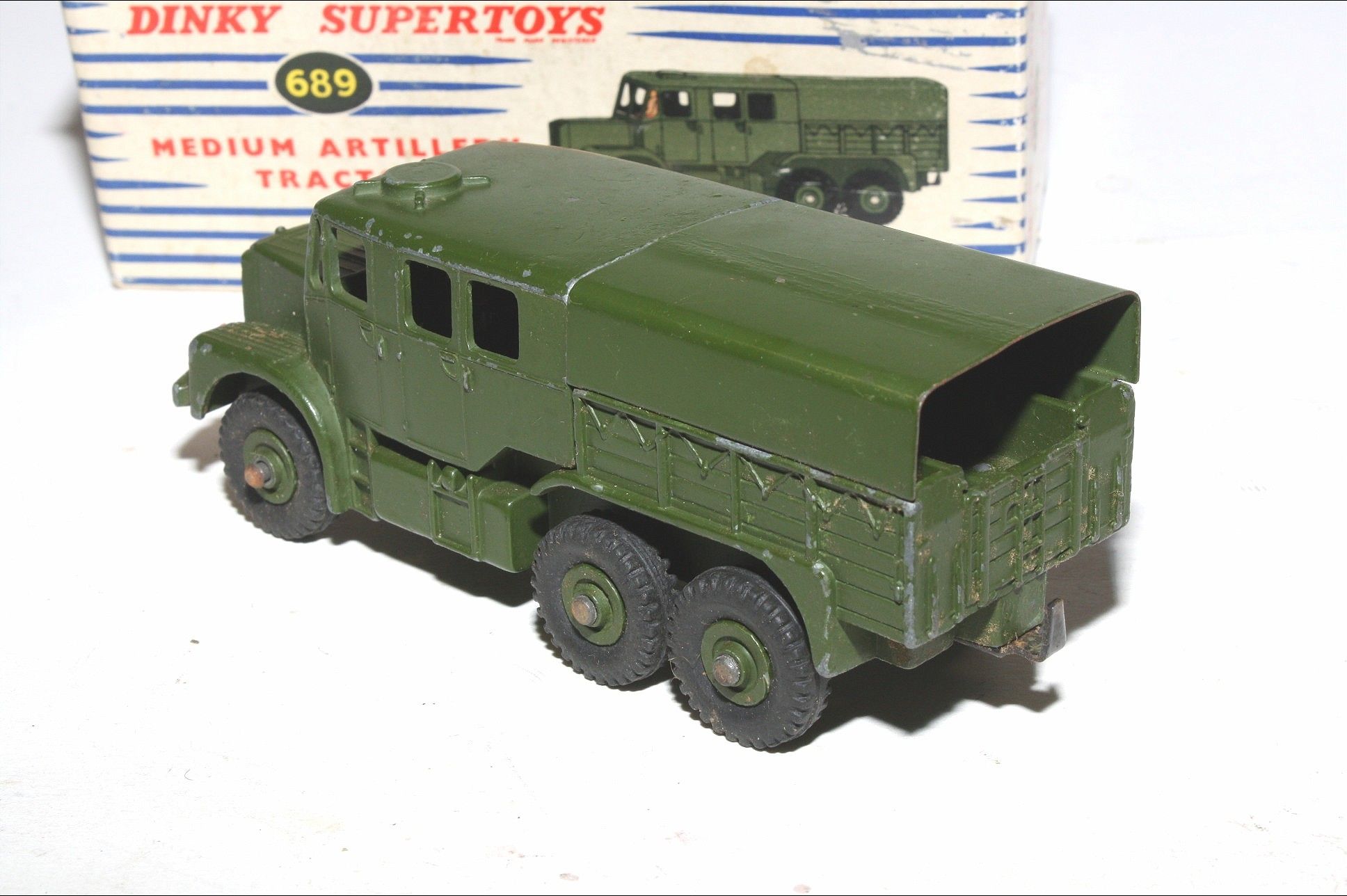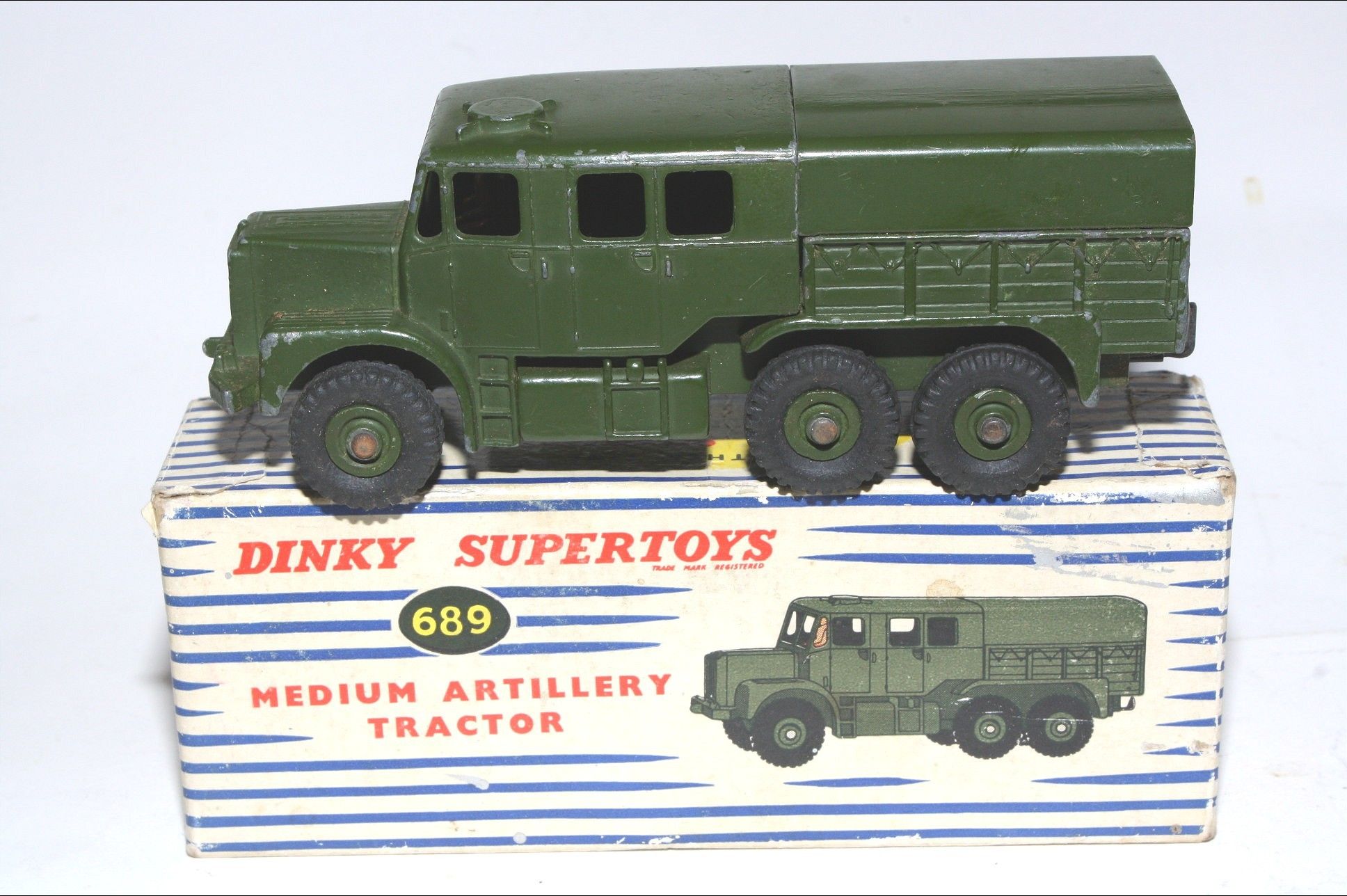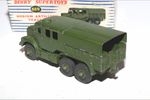 A nice example of this vintage military model. Original olive drab paintwork is good with a few chips, please study the photos for exact condition. Excellent original tyres on metal hubs, straight axles, driver figure present, tow hook and decal, good tin tilt, underside is good.