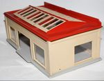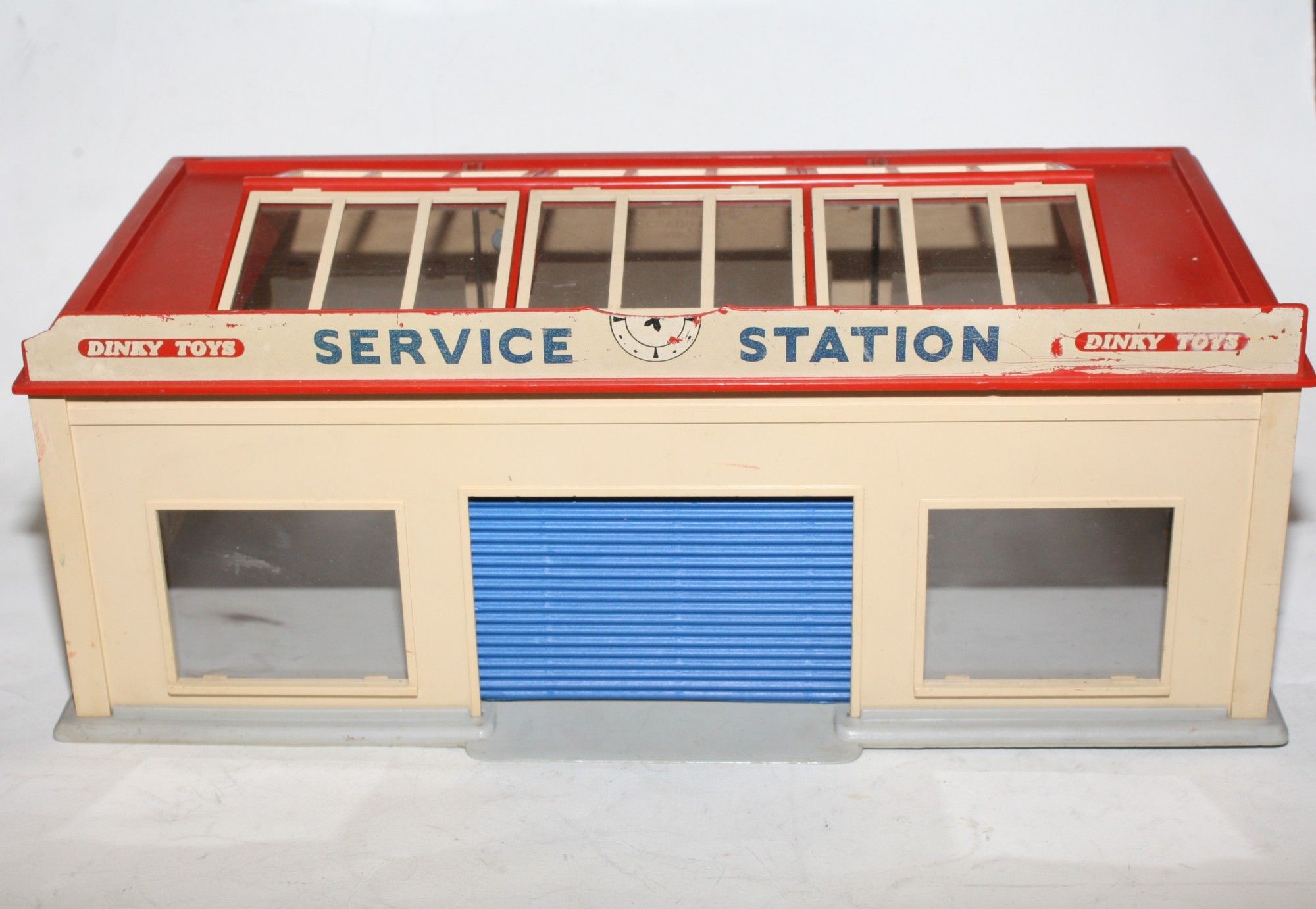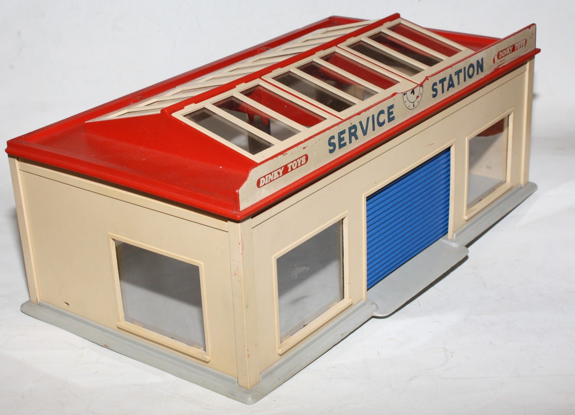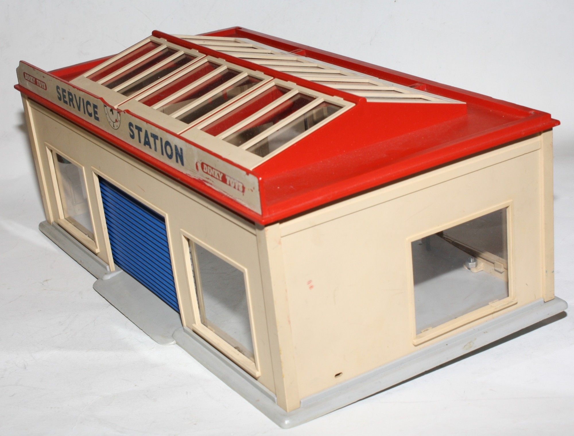 A vintage plastic Dinky service station. Originally supplied in kit form, this example is complete and fully assembled and in generally very good condition, some damage to roof sign and comes with one reproduction blue door