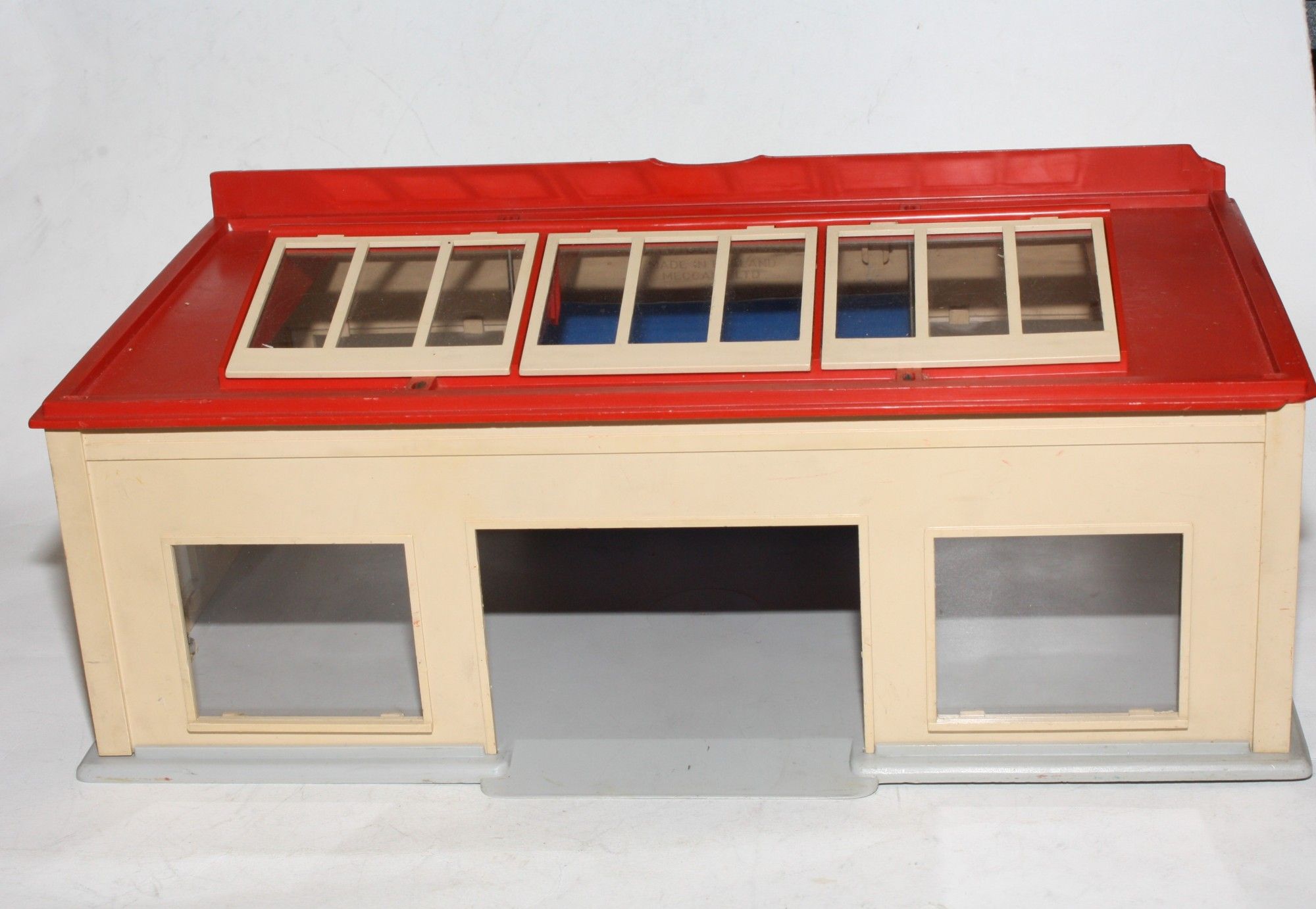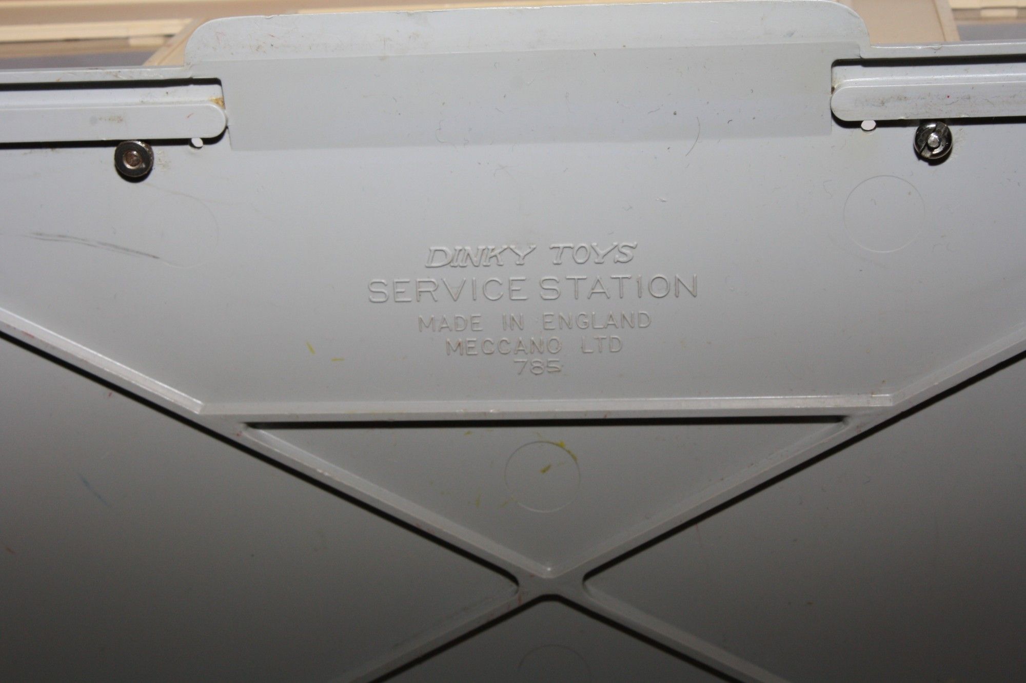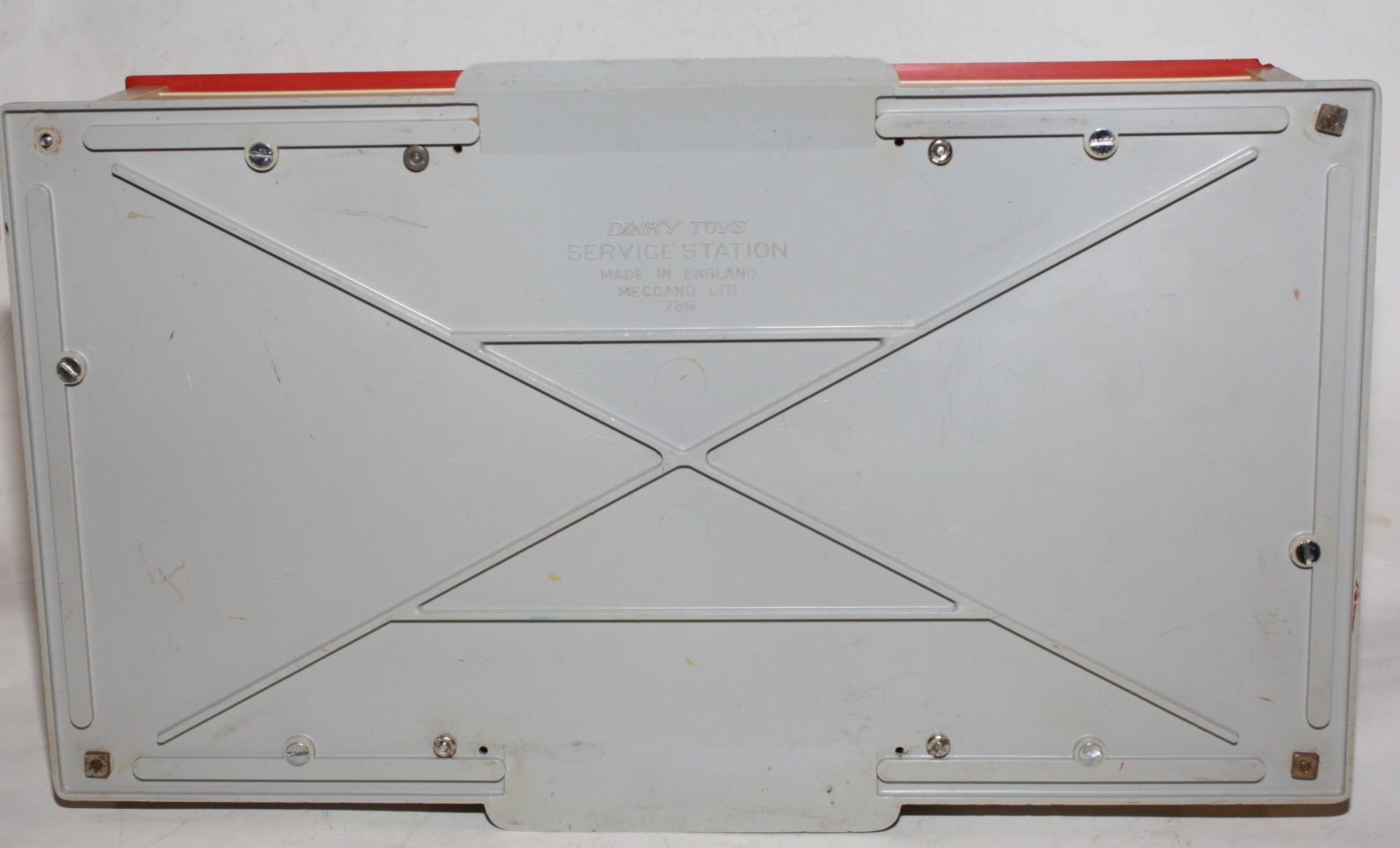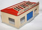 A vintage plastic Dinky service station. Originally supplied in kit form, this example is complete and fully assembled and in generally very good condition, some damage to roof sign and comes with one reproduction blue door