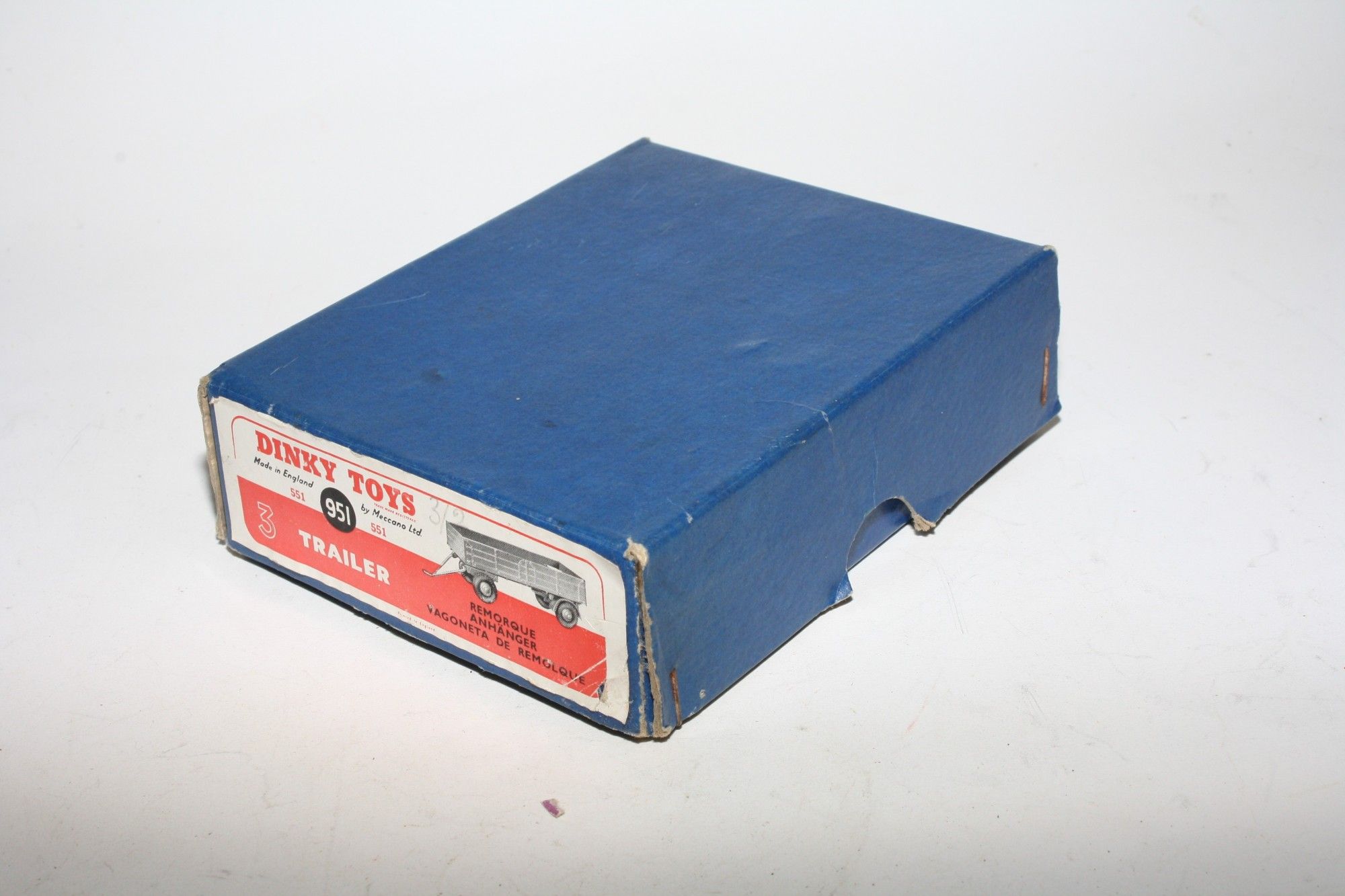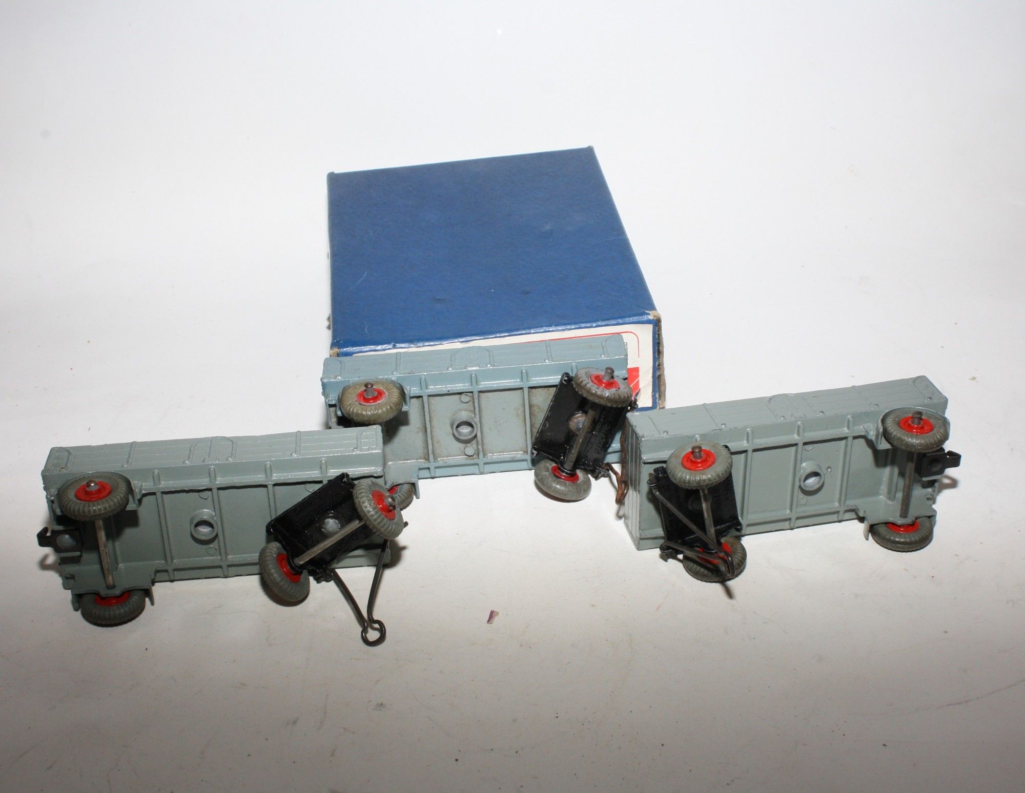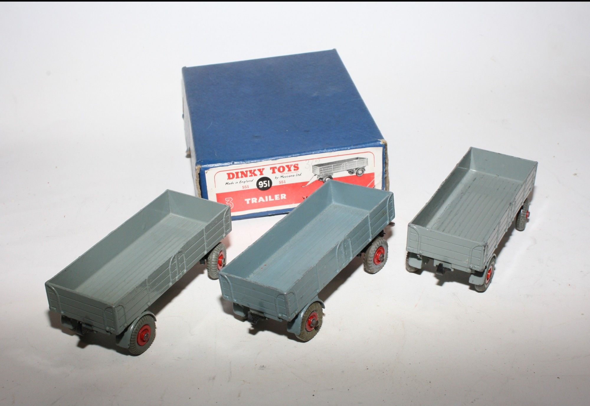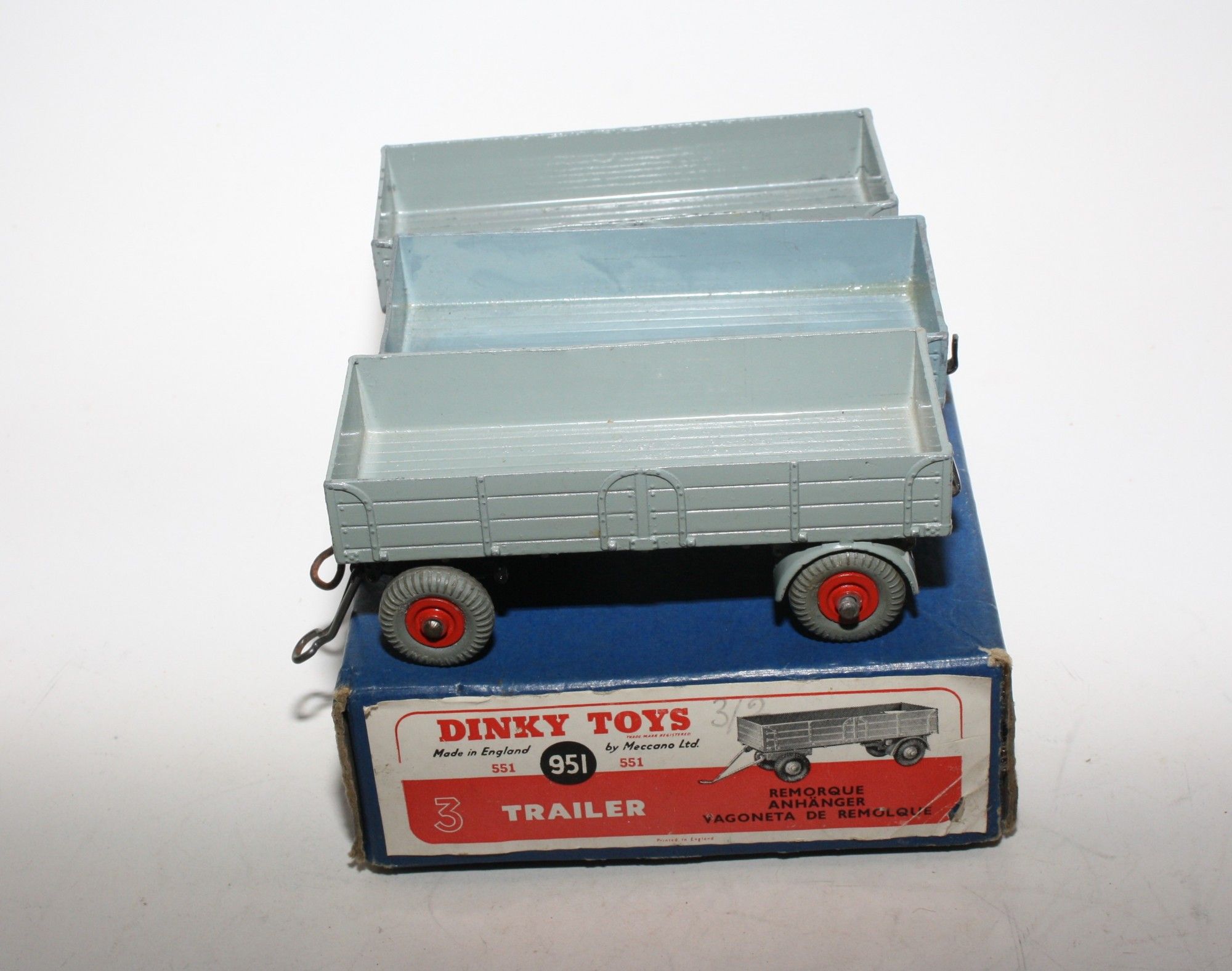 Dinky Toys early issue 951 in original trade box of 3 models in excellent condition although one appears to be a repaint, good metal wheels and free rolling axles, metal drawbar, in the original card trade box with lift-off lid in good condition, no dividers.