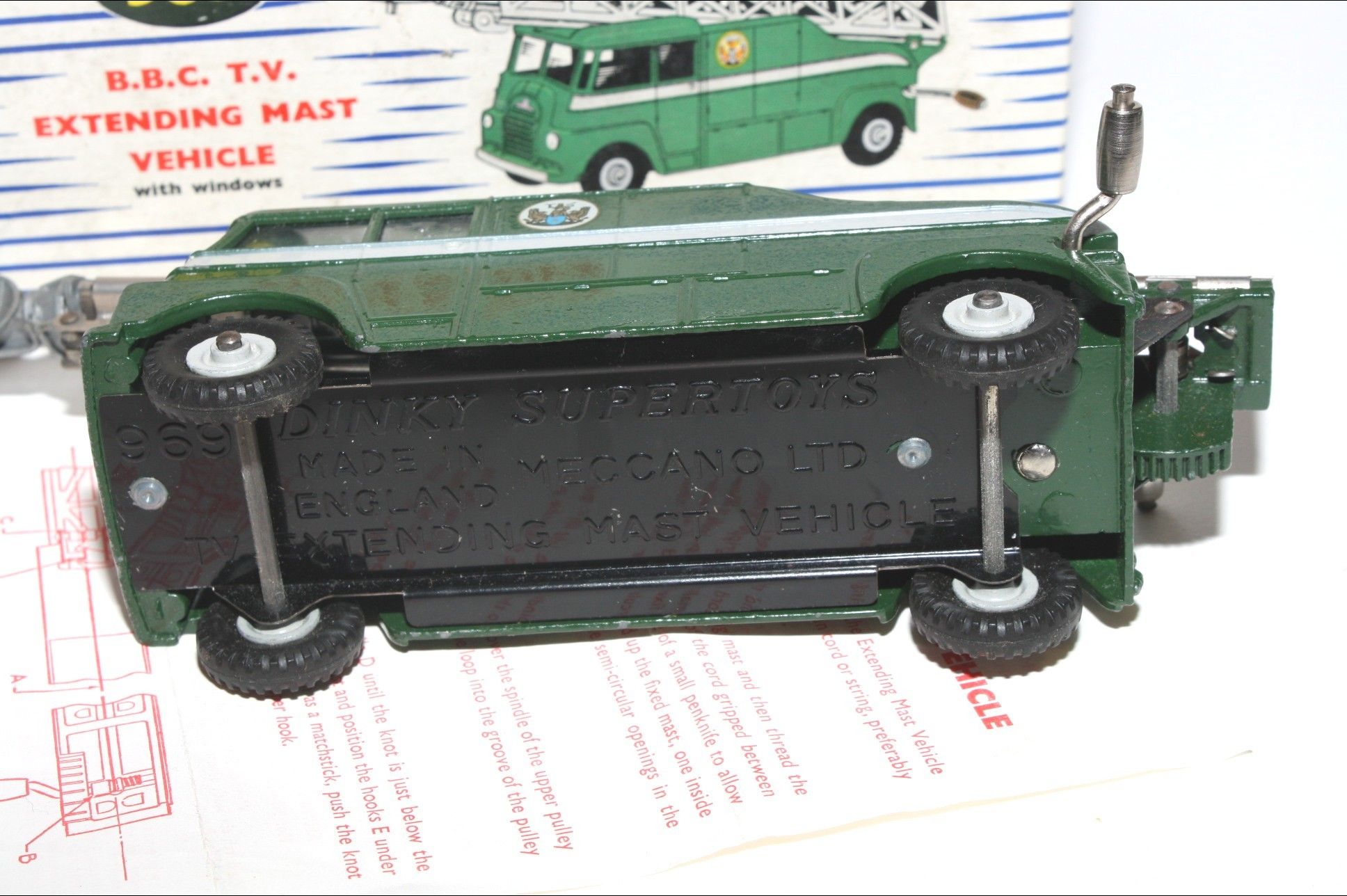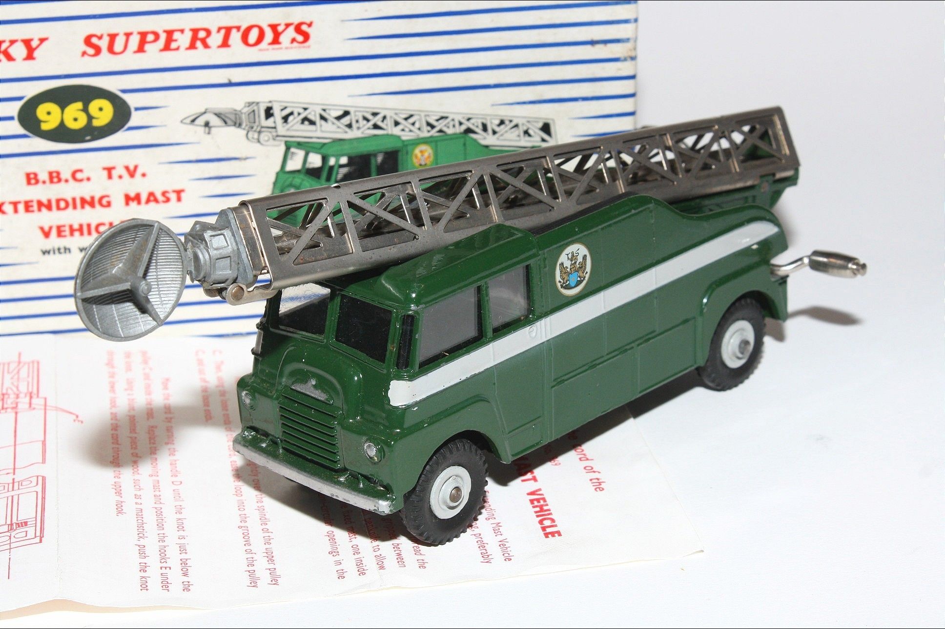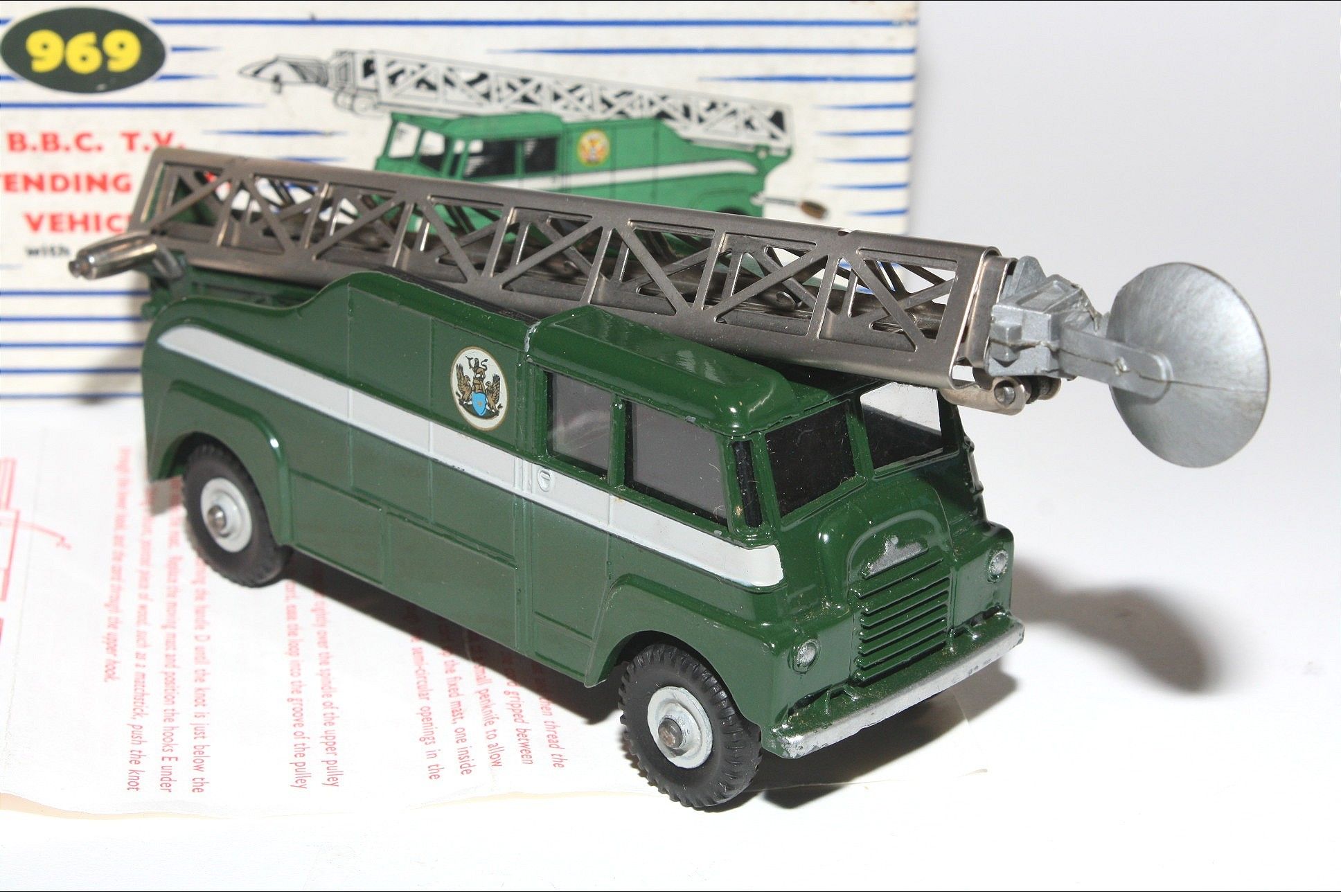 A superb example of this early issue Dinky model. Gleaming original paintwork is virtually mint, a fea bite or two only, please study the photos for exact condition. Perfect original tyres on metal hubs, free rolling axles,crystal clear windows fine, extending mast all complete with dish, cord in place but a bit lazy to extend, original cord replacement instructions present and in excellent condition and good tin baseplate.