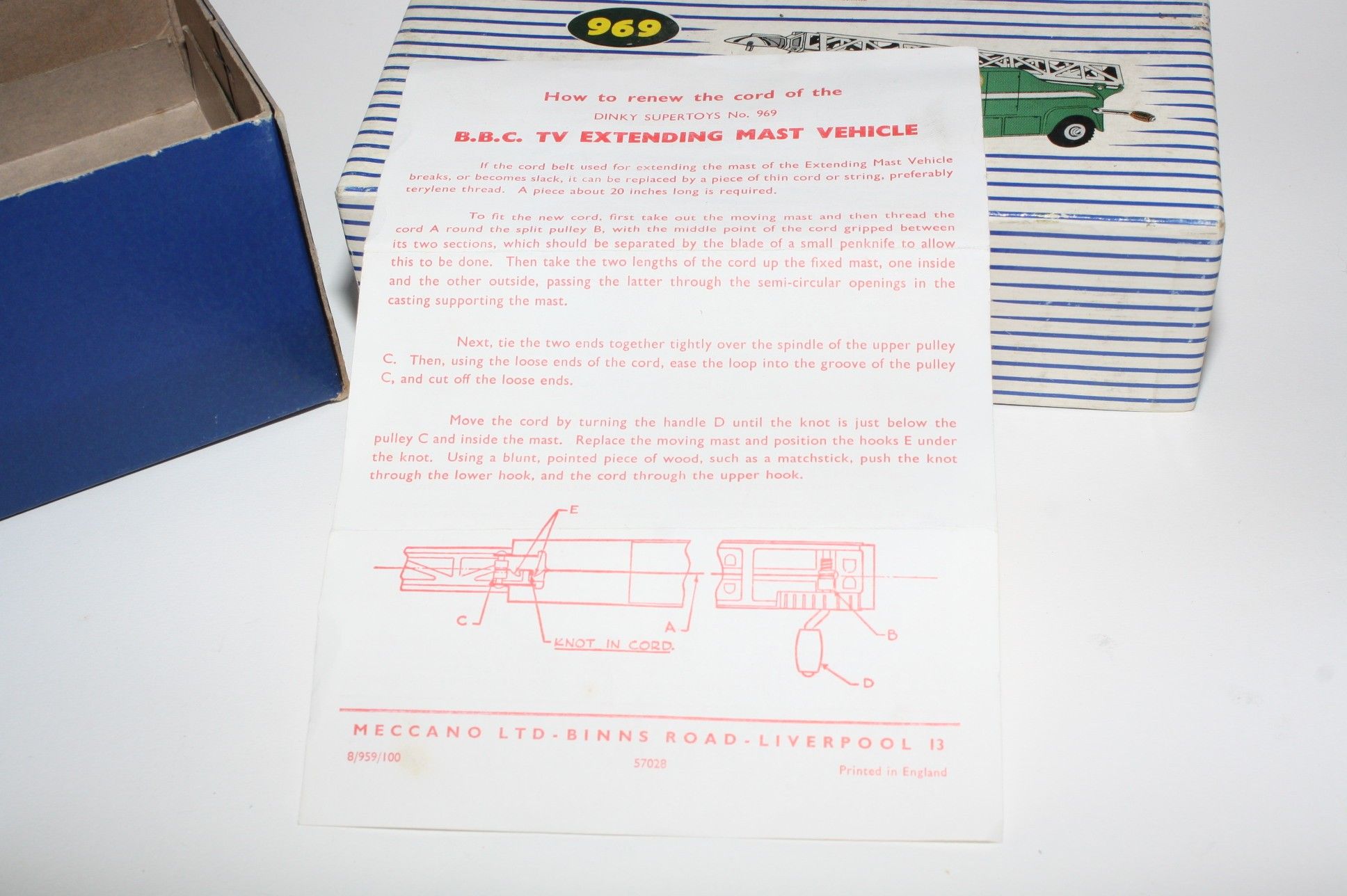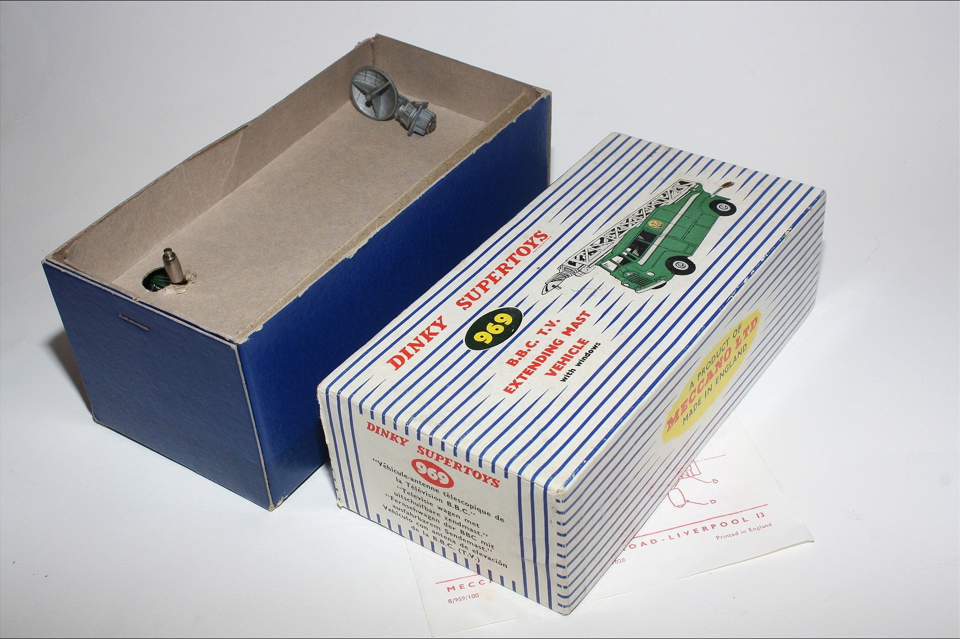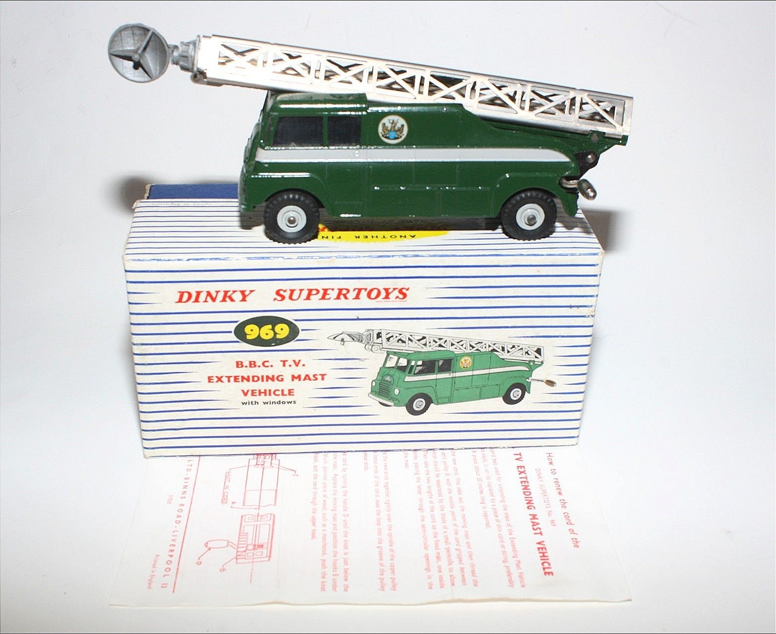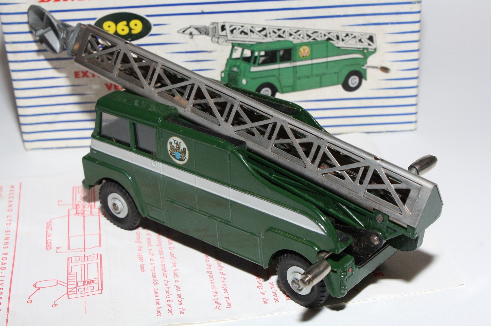 A superb example of this early issue Dinky model. Gleaming original paintwork is virtually mint, a fea bite or two only, please study the photos for exact condition. Perfect original tyres on metal hubs, free rolling axles,crystal clear windows fine, extending mast all complete with dish, cord in place but a bit lazy to extend, original cord replacement instructions present and in excellent condition and good tin baseplate.