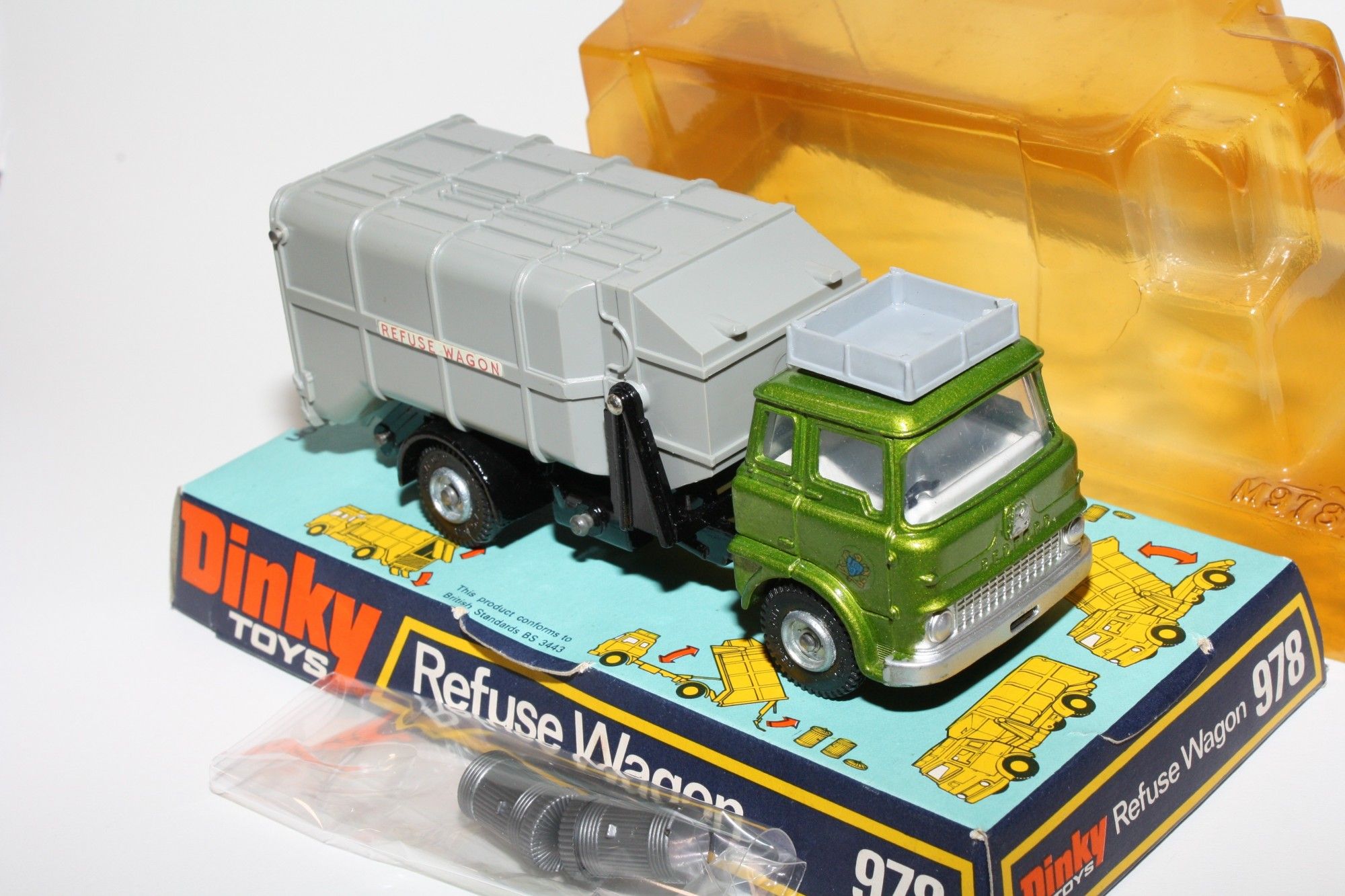 A superb example of this Dinky Refuse Wagon. Gleaming metallic green paintwork is mint, please study photos for exact condition. Good tyres and perfect cast hubs, straight axles, crystal clear windows, white interior and original sticker, footplates and hatches all present, hydraulic lift rear all in gwo. Chassis and underside all perfect.