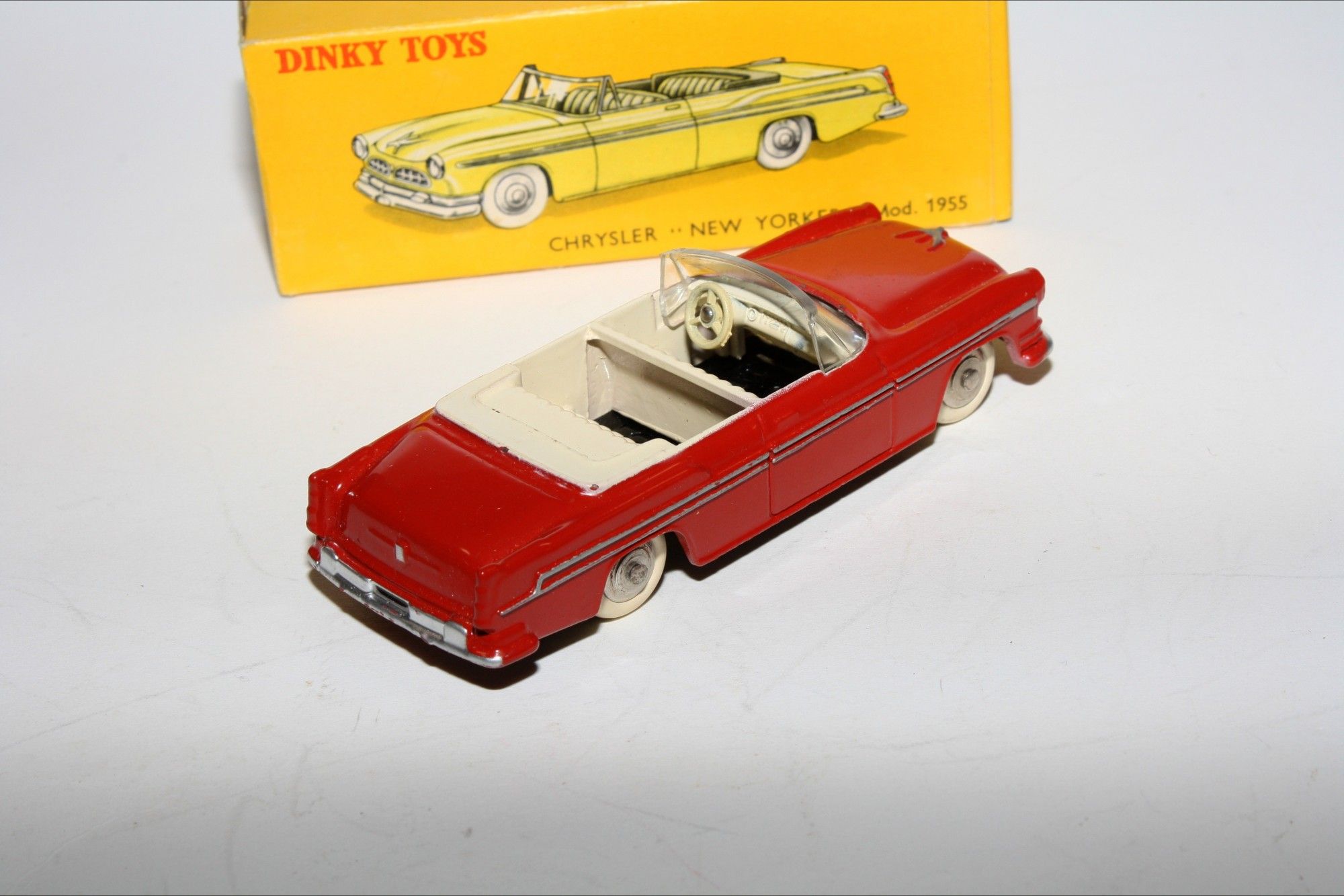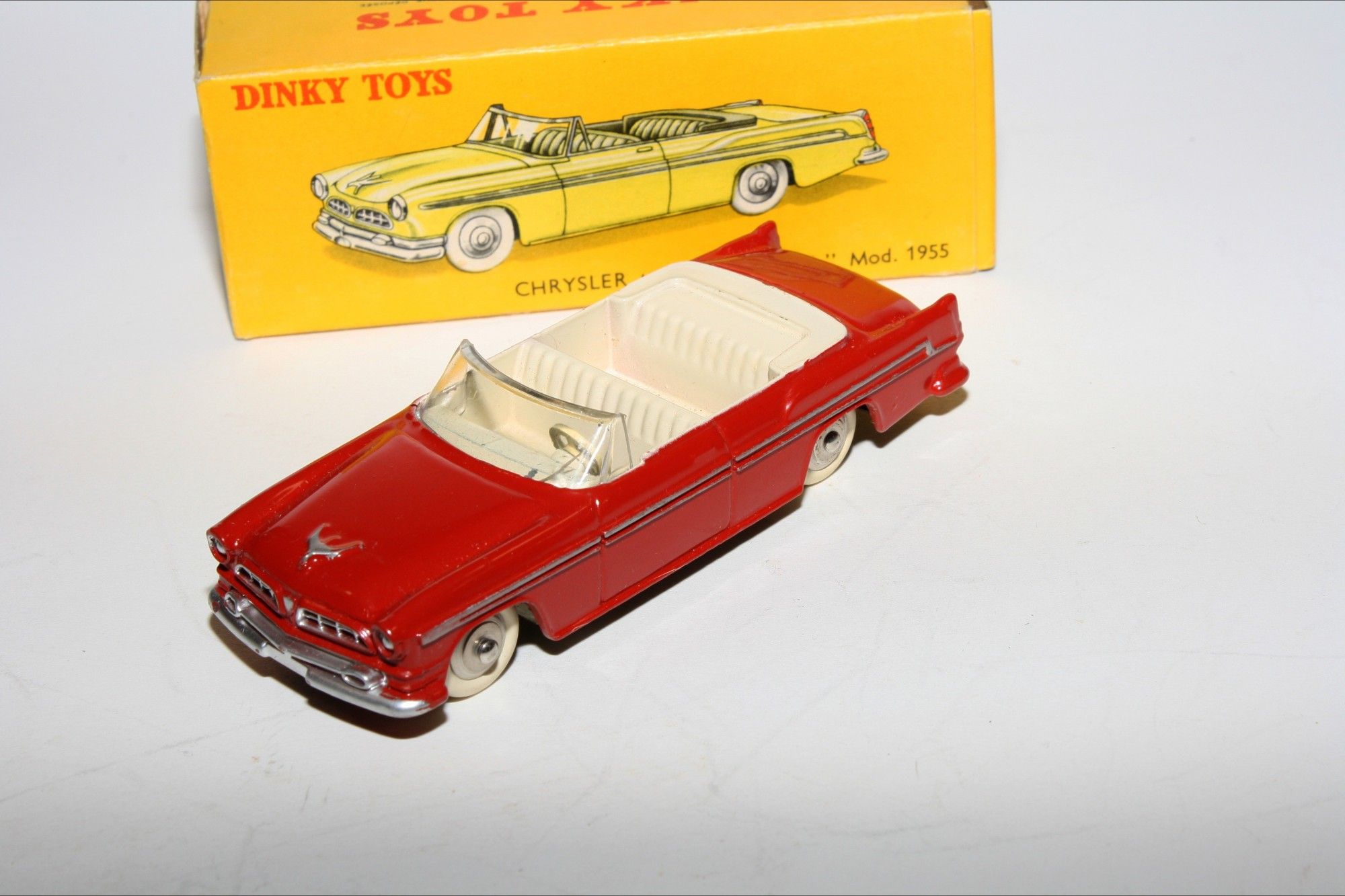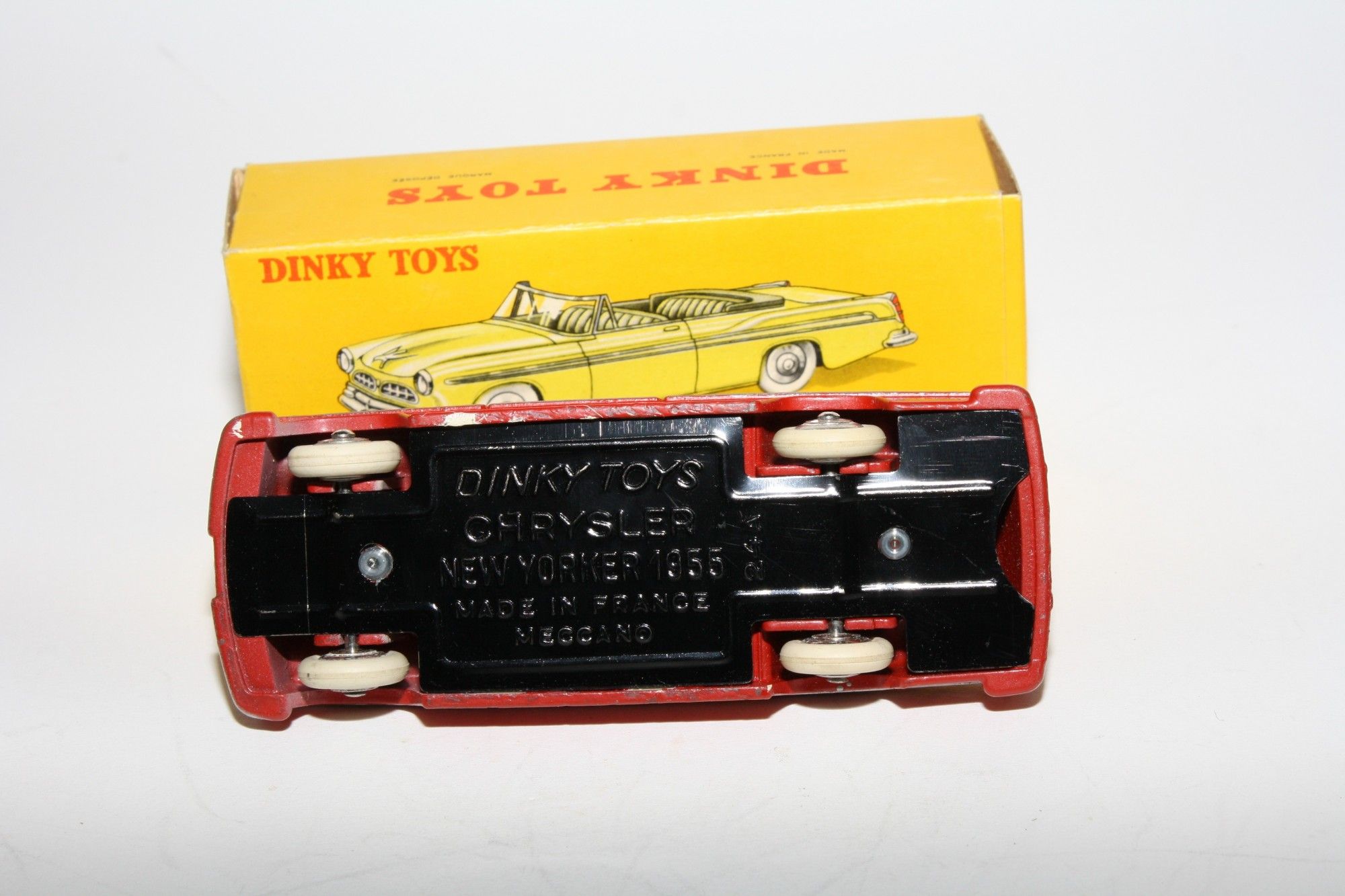A superb example of this lovely harder to find 1950's Dinky. Part of a lovely collection recently acquired from a client in Italy, Never used. Gleaming original red paintwork is virtually mint, a couple of fleabites to ivory interior, please study the high resolution photos for exact condition. Perfect original tyres on spun convex hubs, free rolling axles, original windscreen good but has small 1cm hairling crack on drivers far side, mint tin baseplate.
