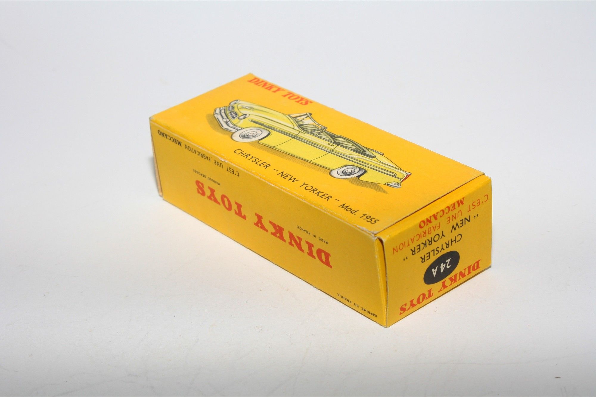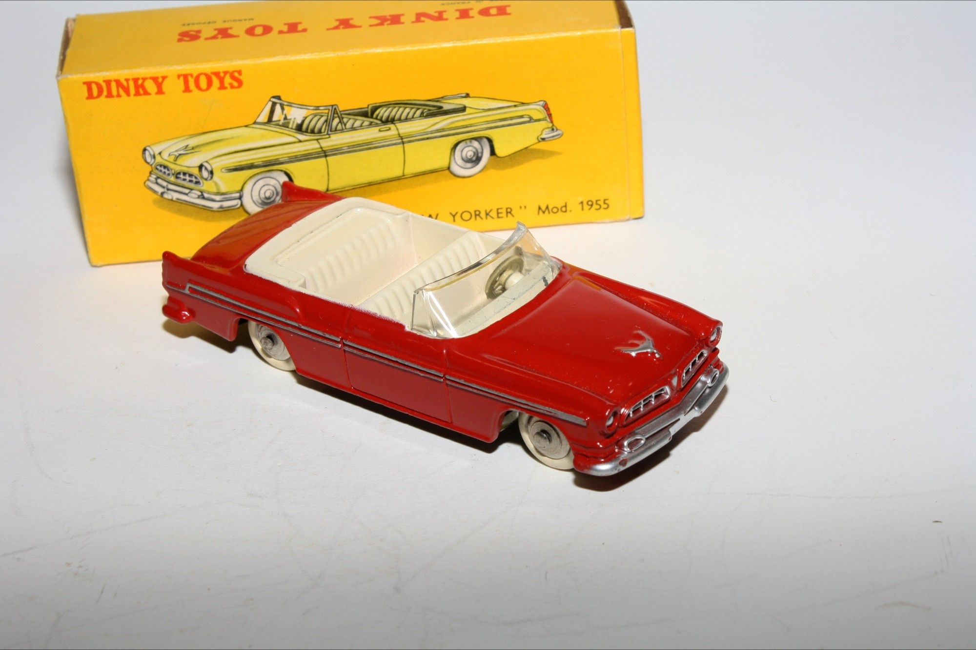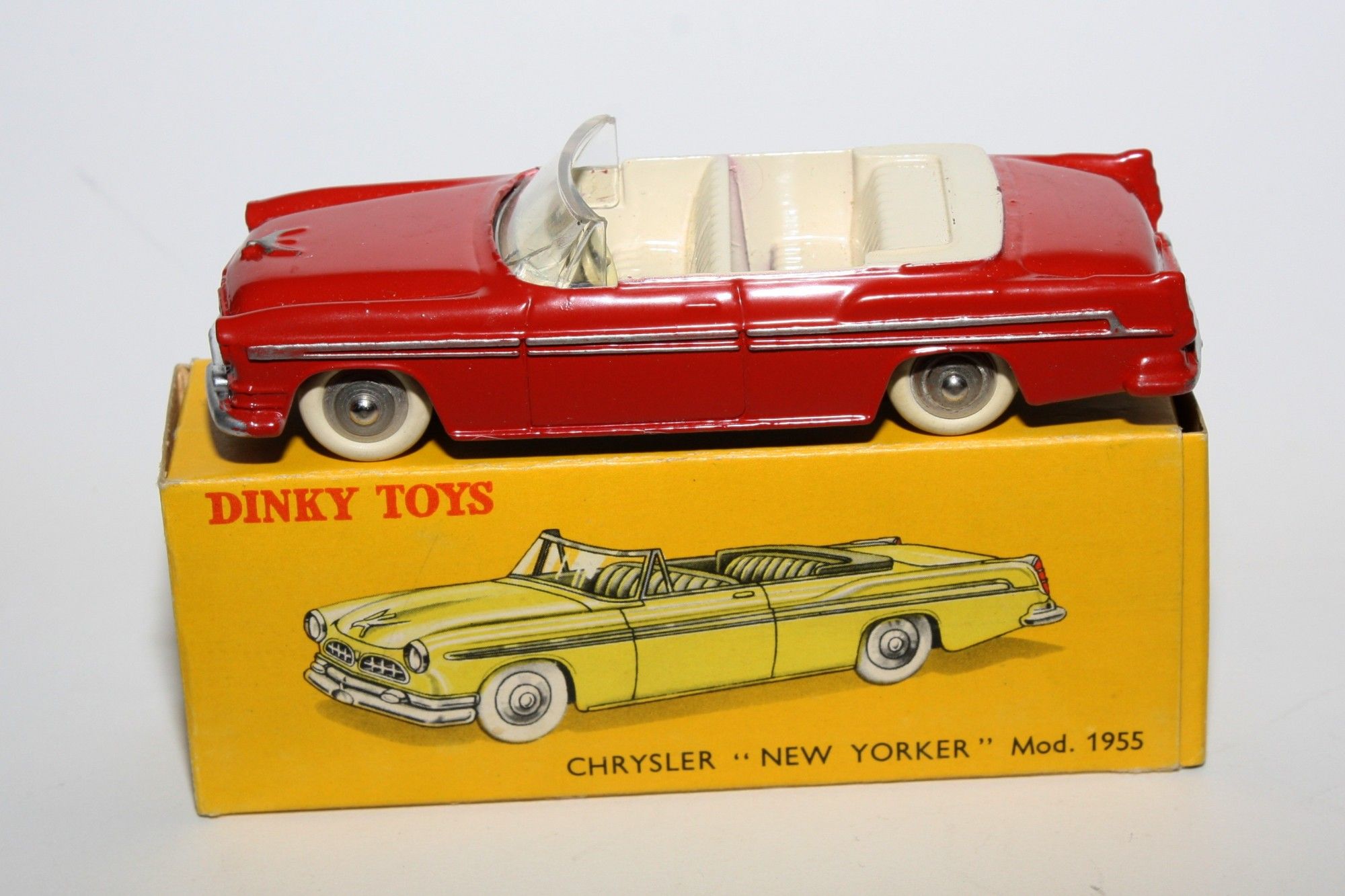 A superb example of this lovely harder to find 1950's Dinky. Part of a lovely collection recently acquired from a client in Italy, Never used. Gleaming original red paintwork is virtually mint, a couple of fleabites to ivory interior, please study the high resolution photos for exact condition. Perfect original tyres on spun convex hubs, free rolling axles, original windscreen good but has small 1cm hairling crack on drivers far side, mint tin baseplate.